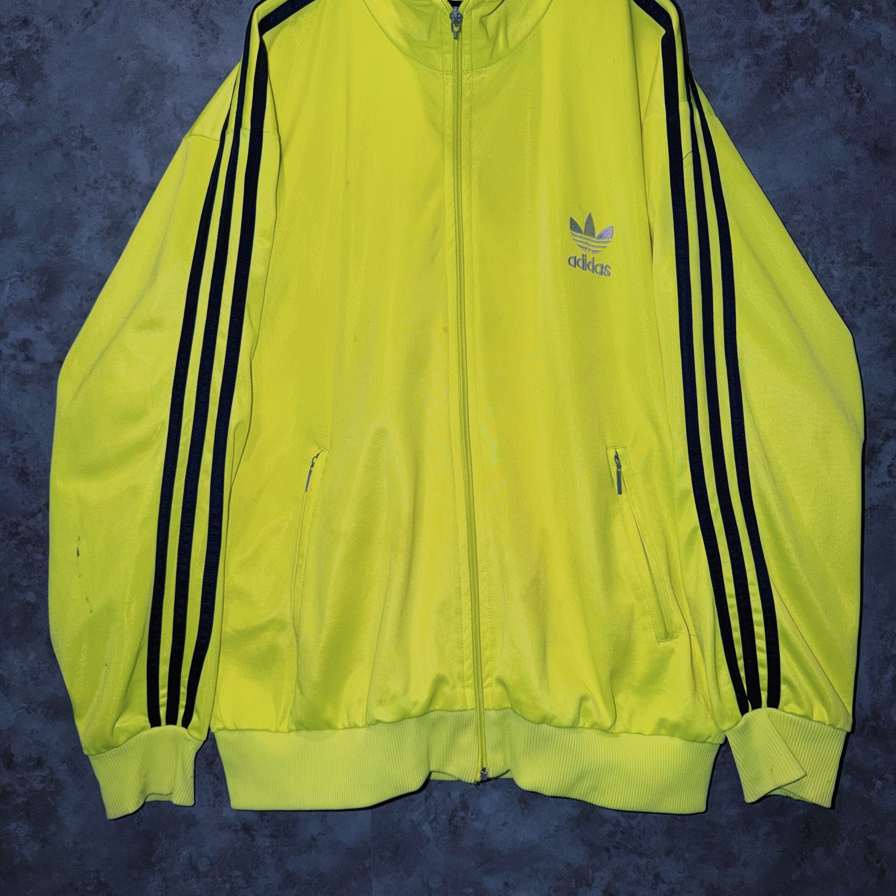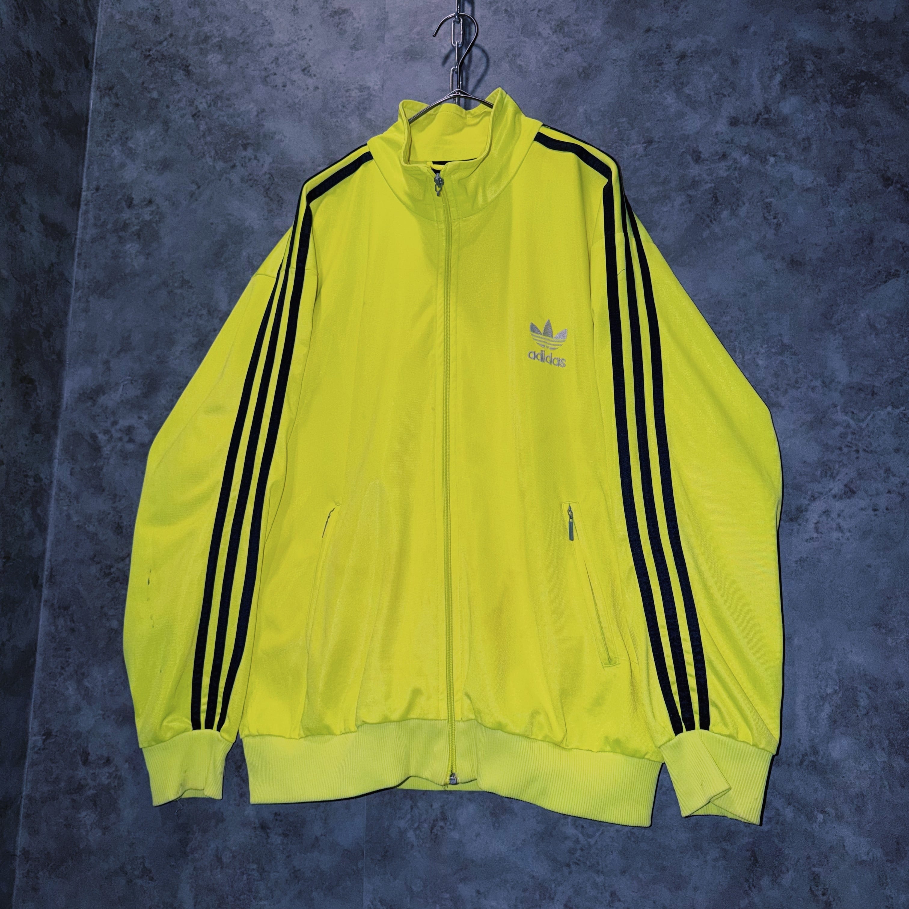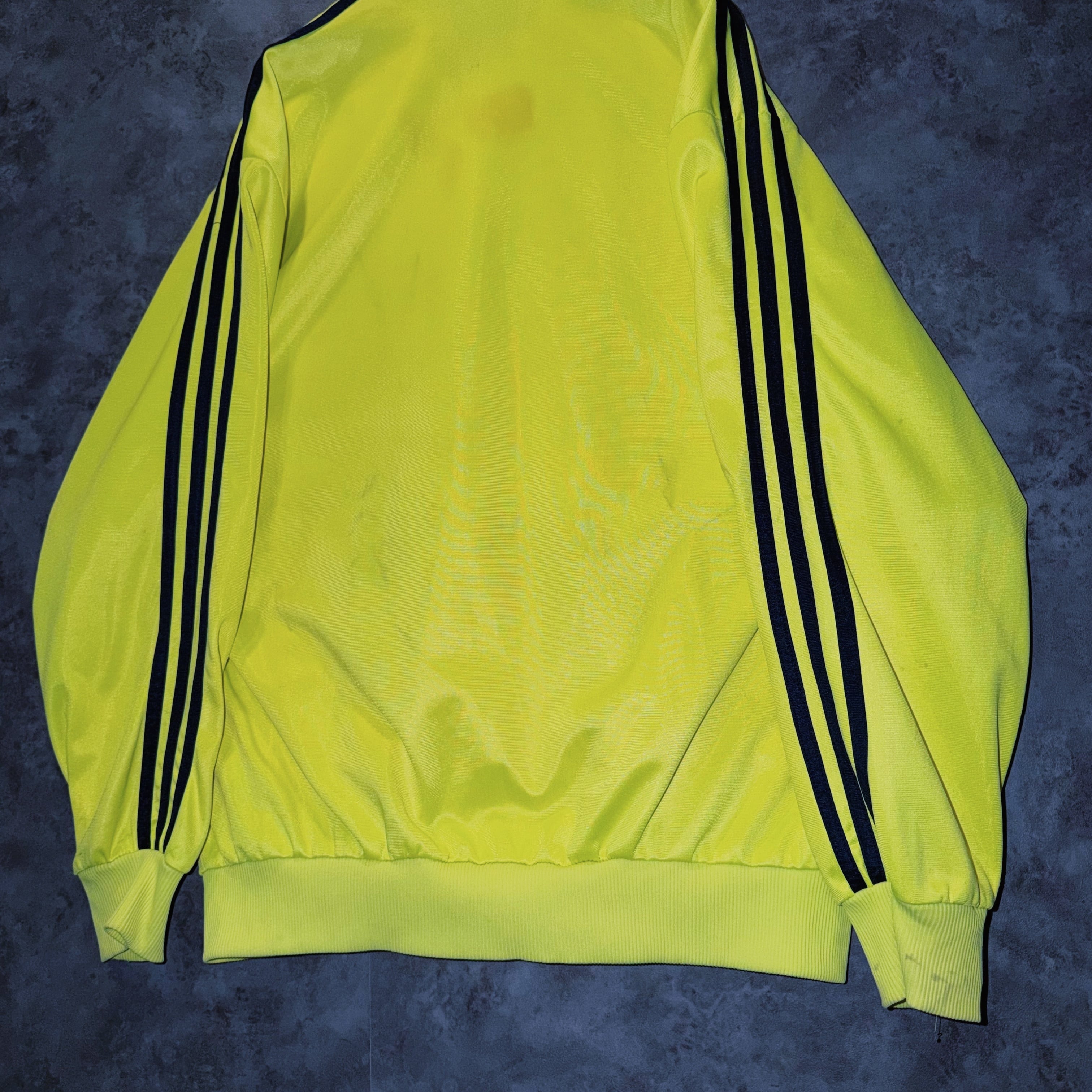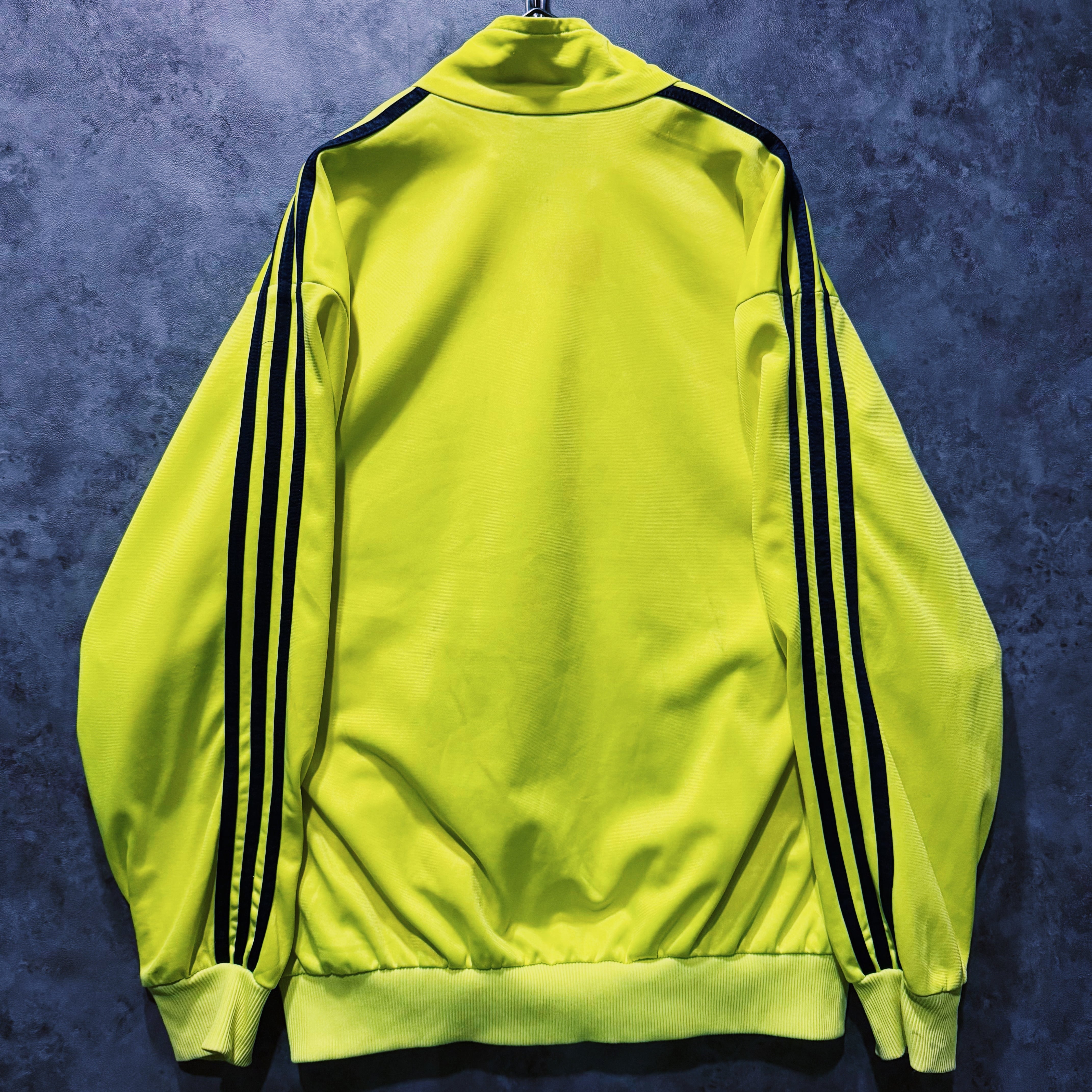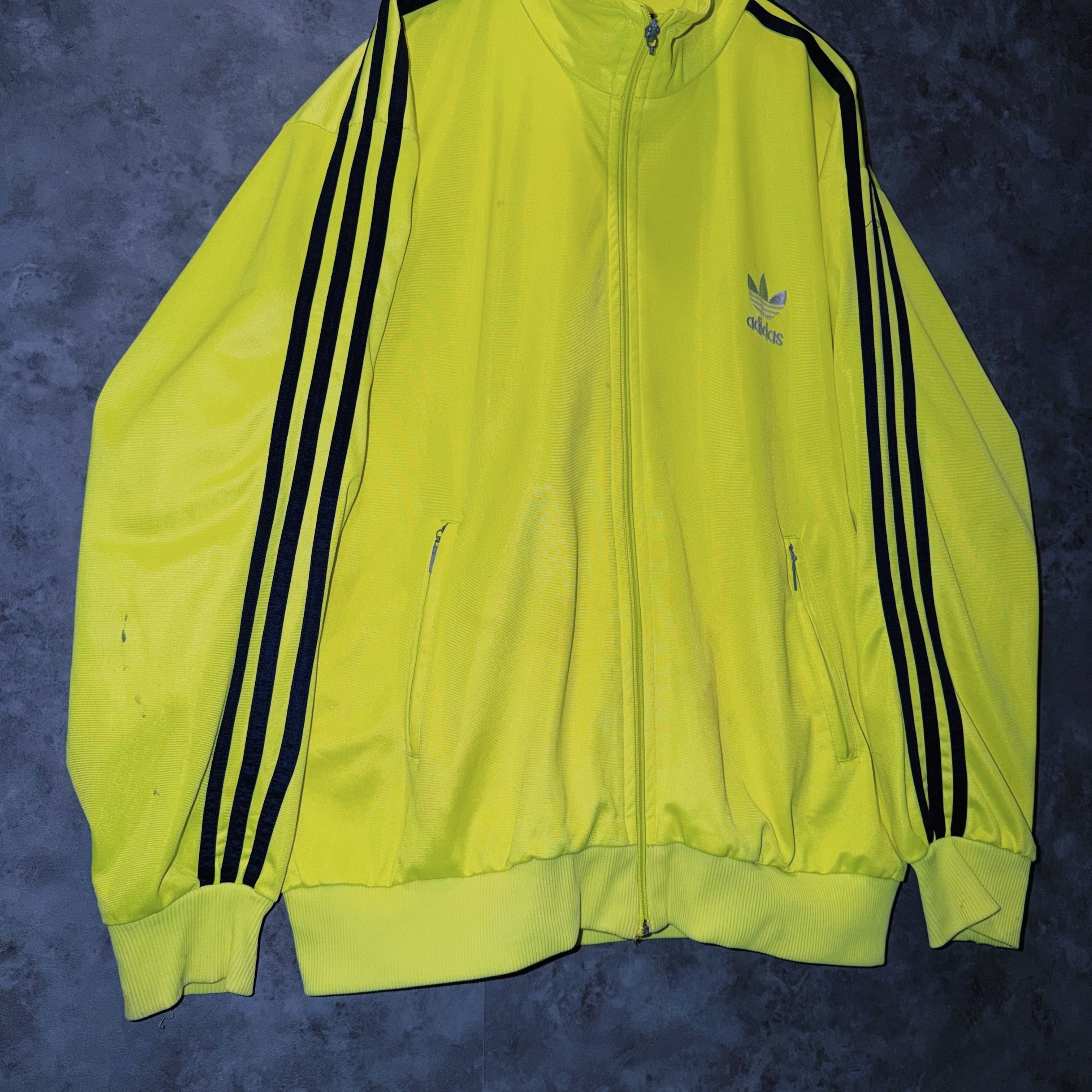 主張の強いイエローカラーの生地に、ブラックカラーでスリーストライプとトレフォイルロゴを施した一枚。