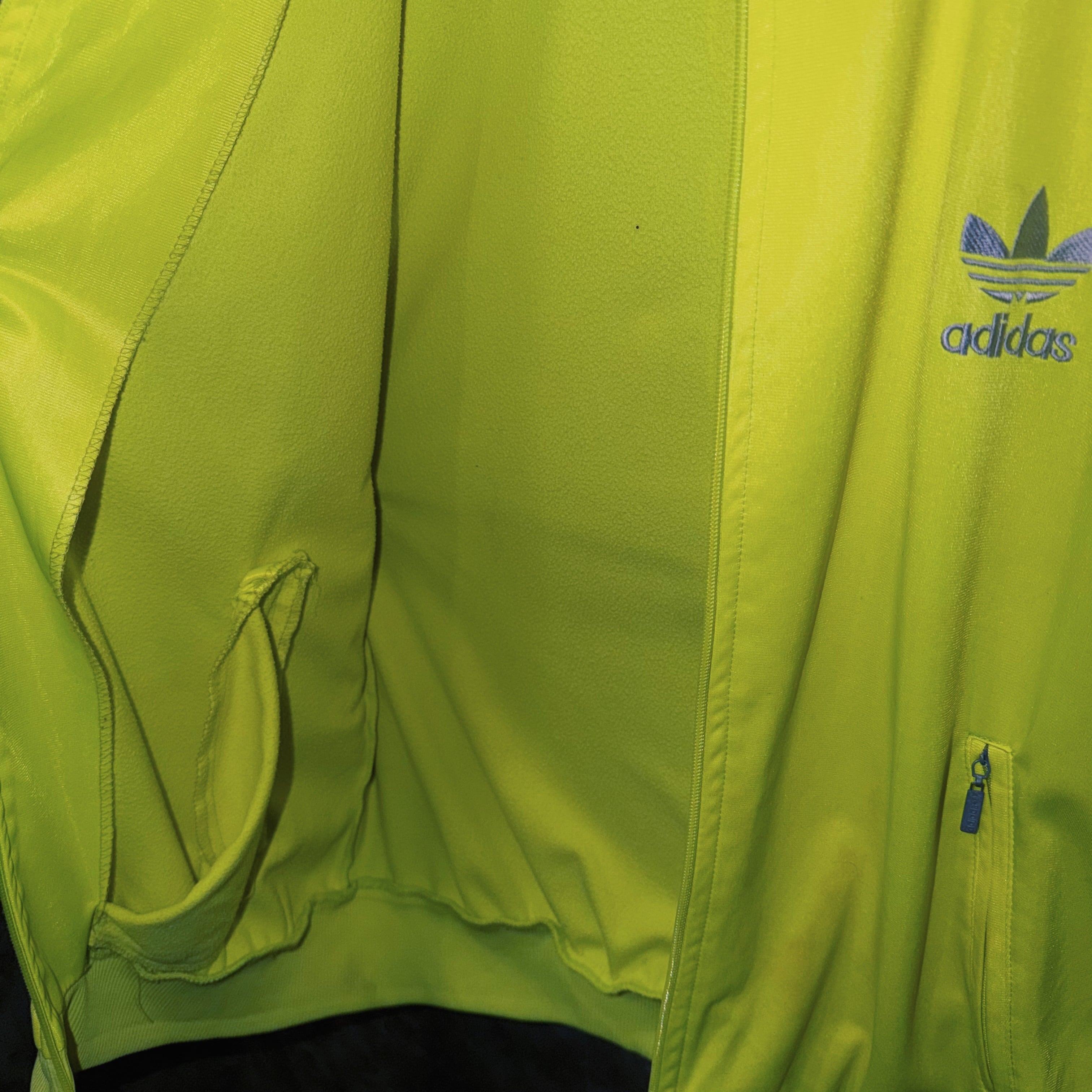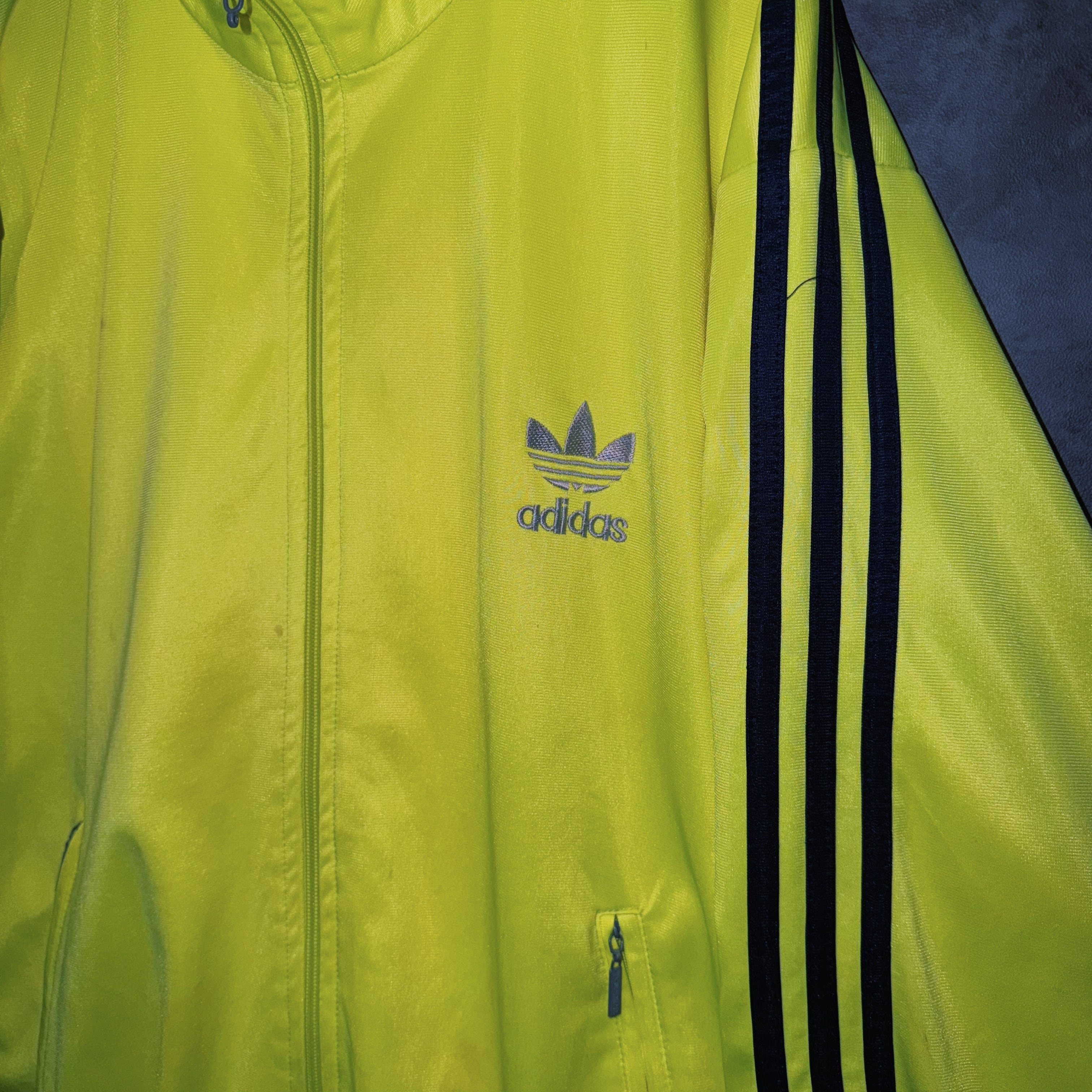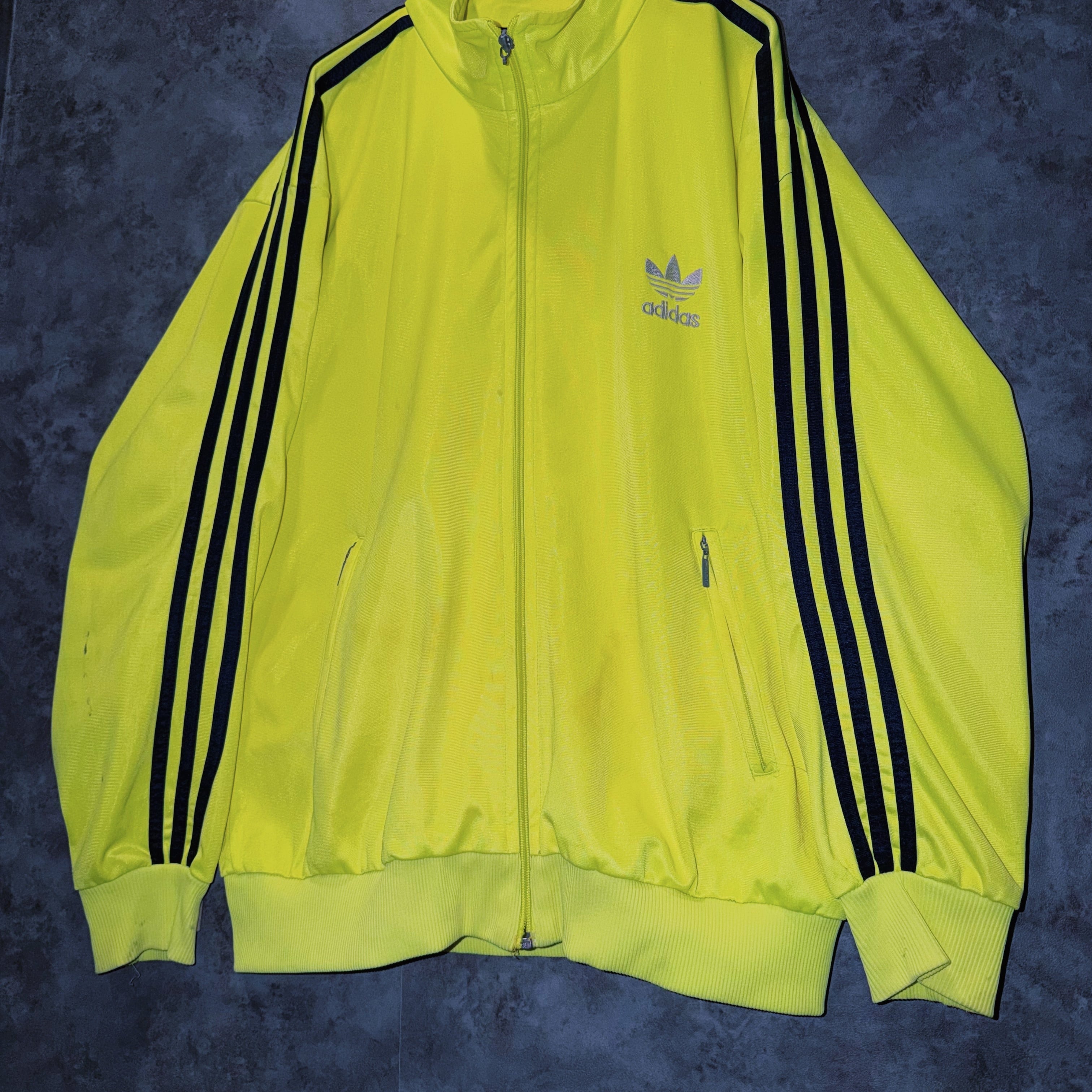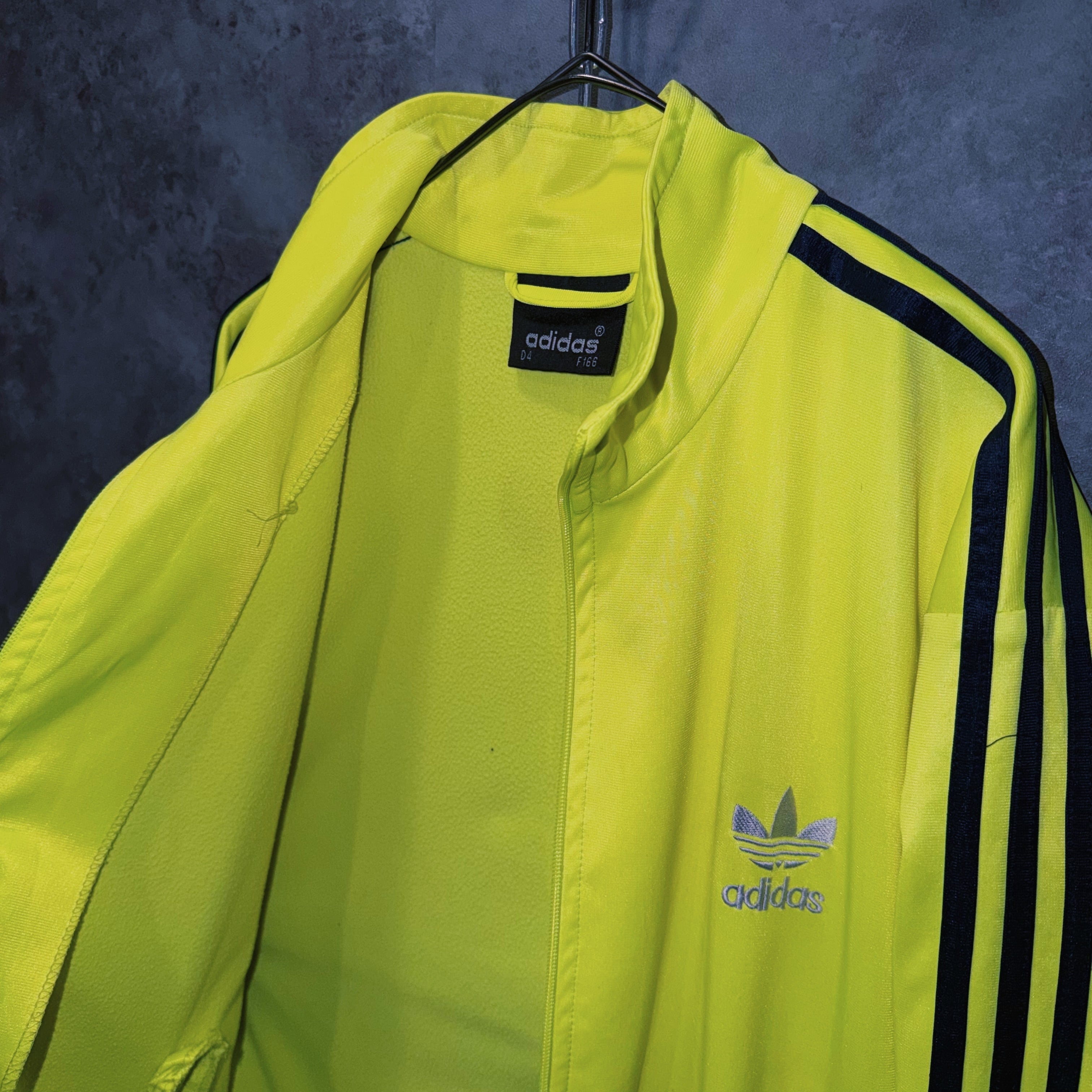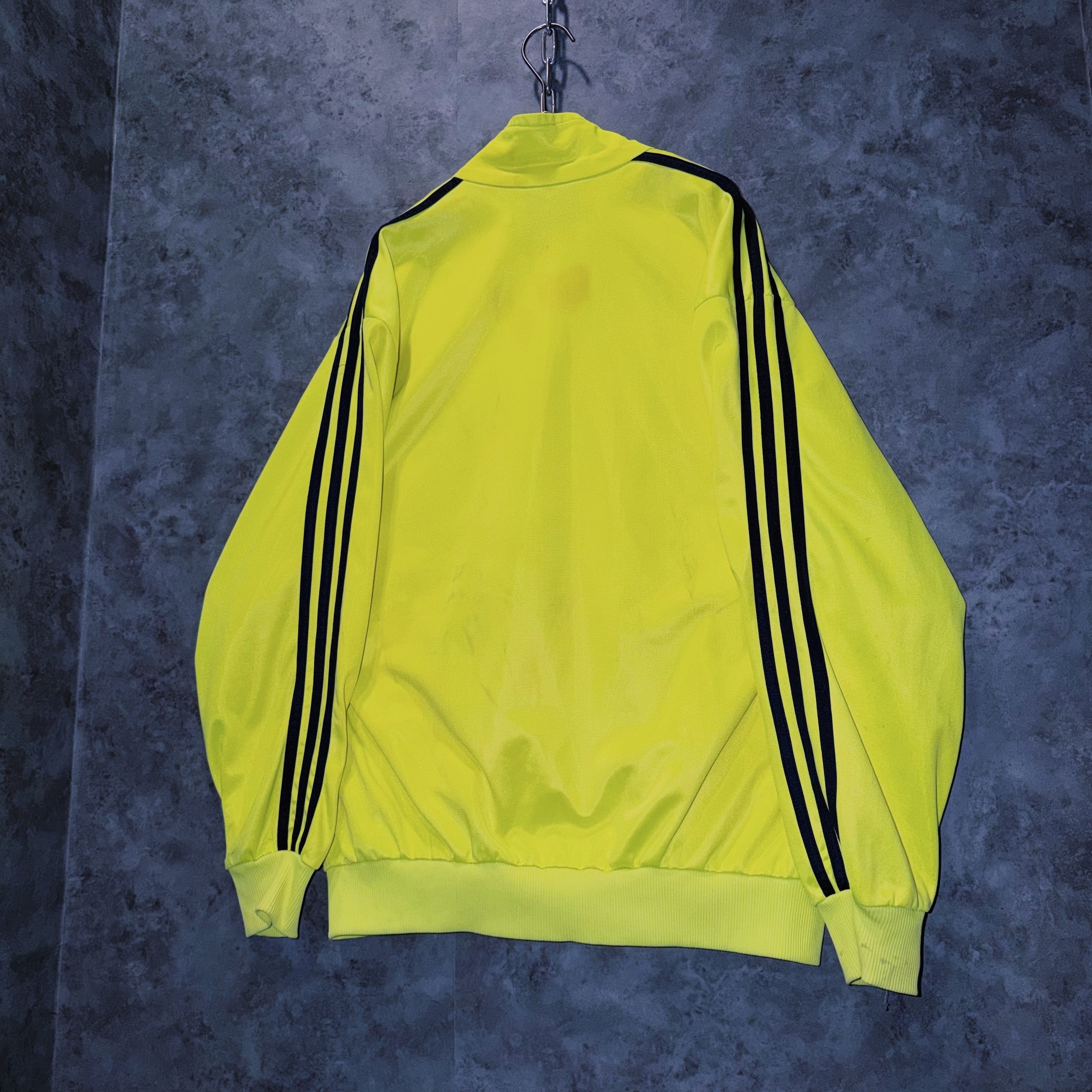 主張の強いイエローカラーの生地に、ブラックカラーでスリーストライプとトレフォイルロゴを施した一枚。
