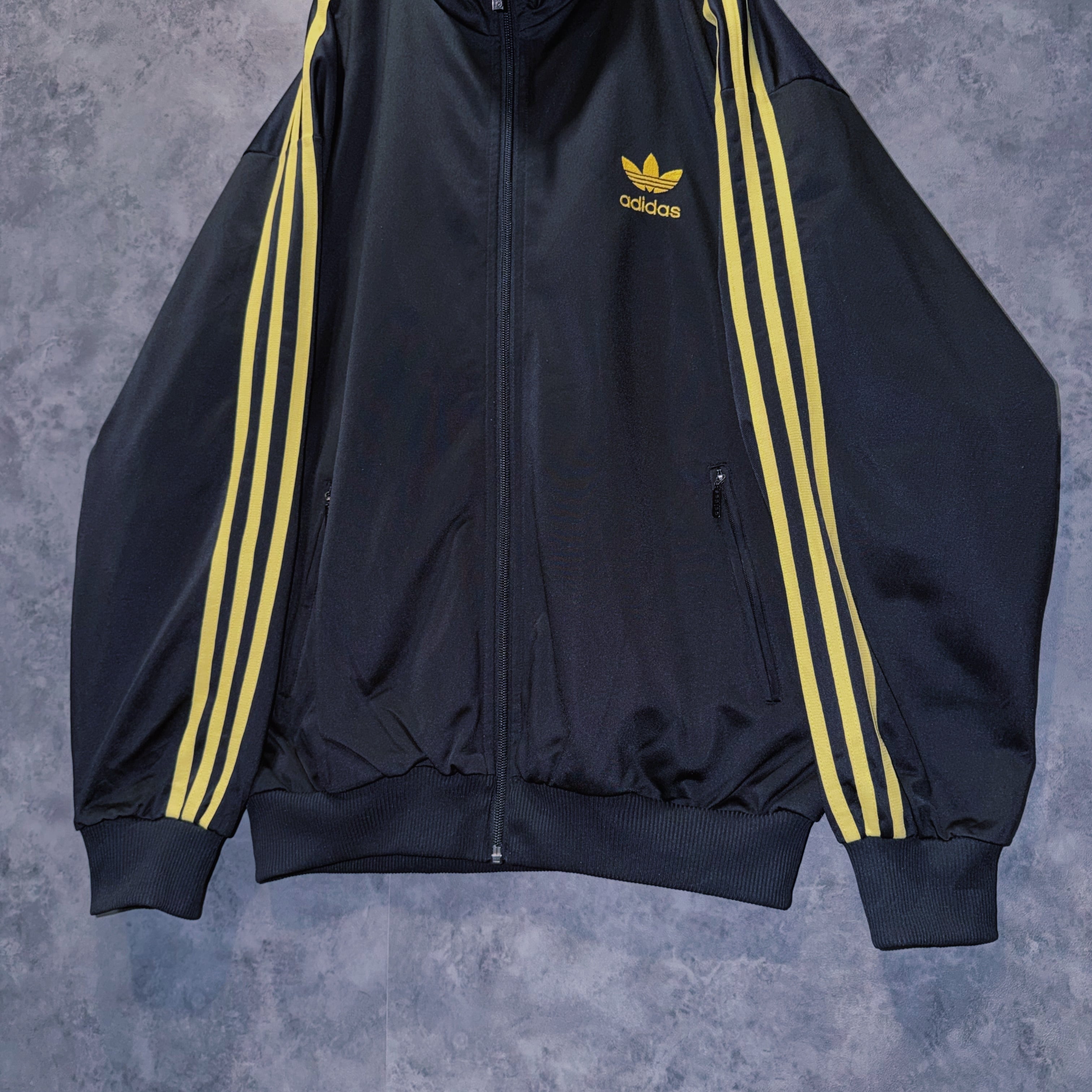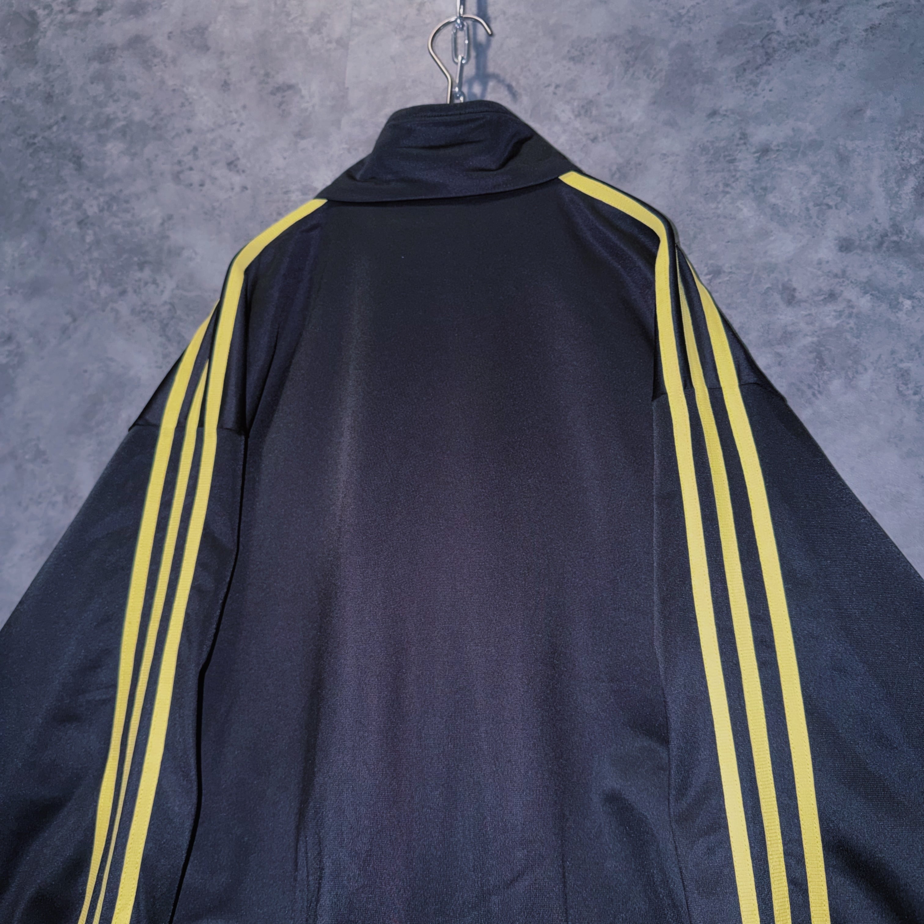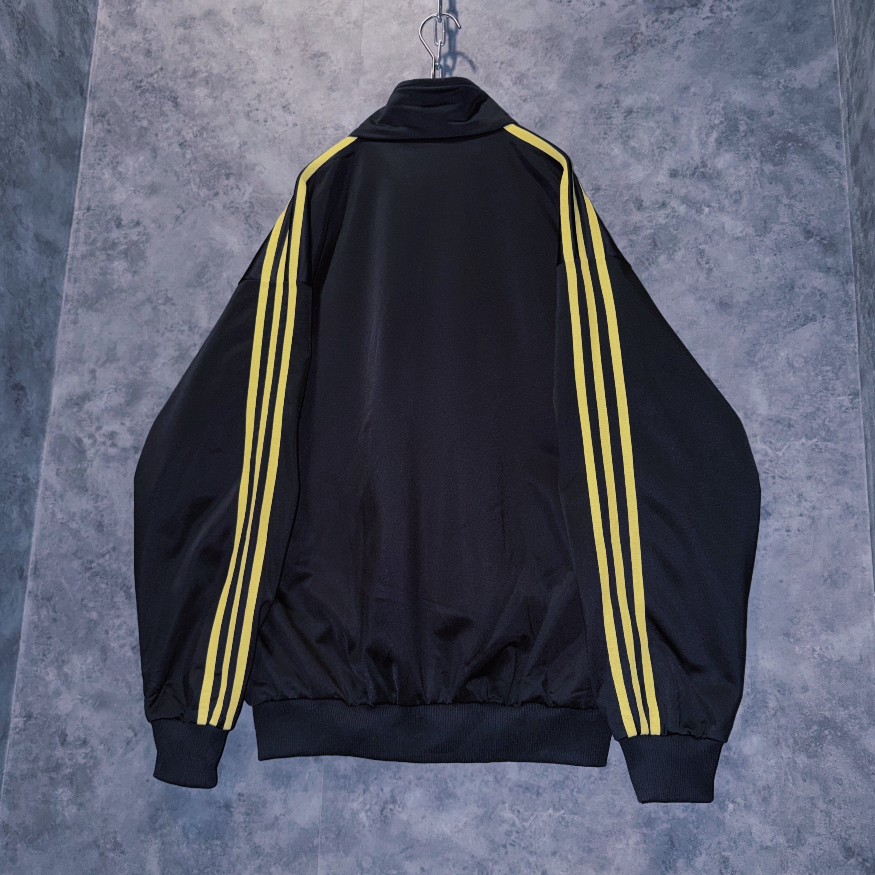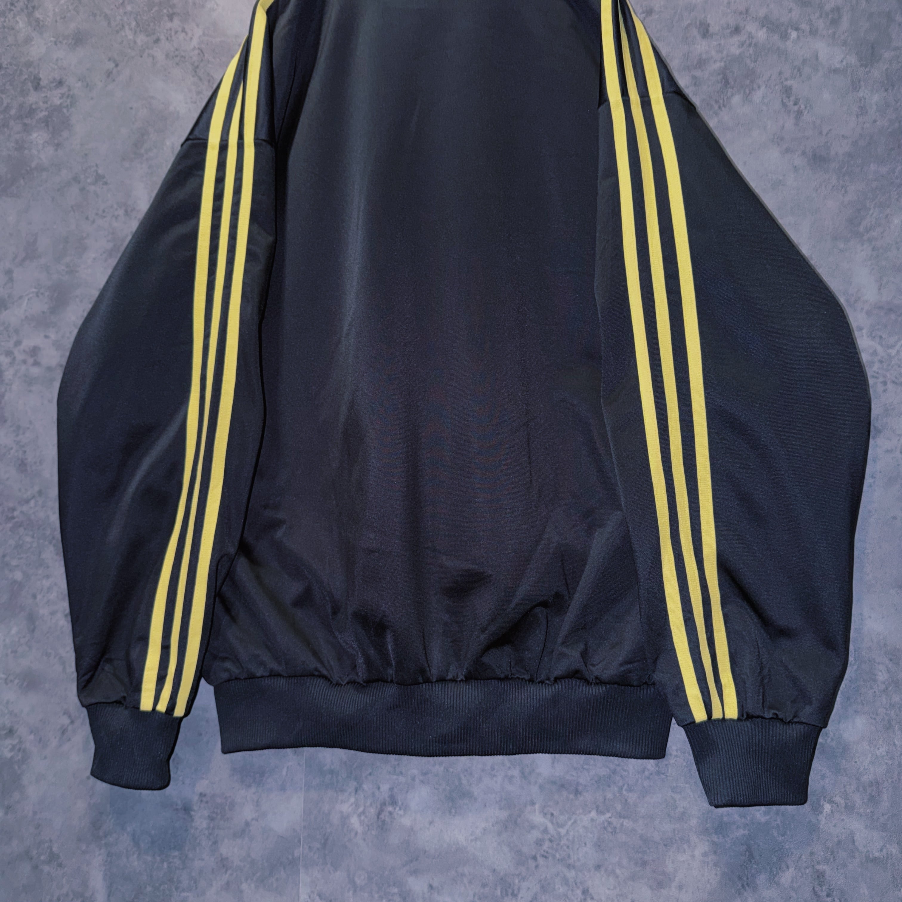 光沢あるブラックカラーの生地に、イエローカラーでスリーストライプとトレフォイルロゴを施した一枚。