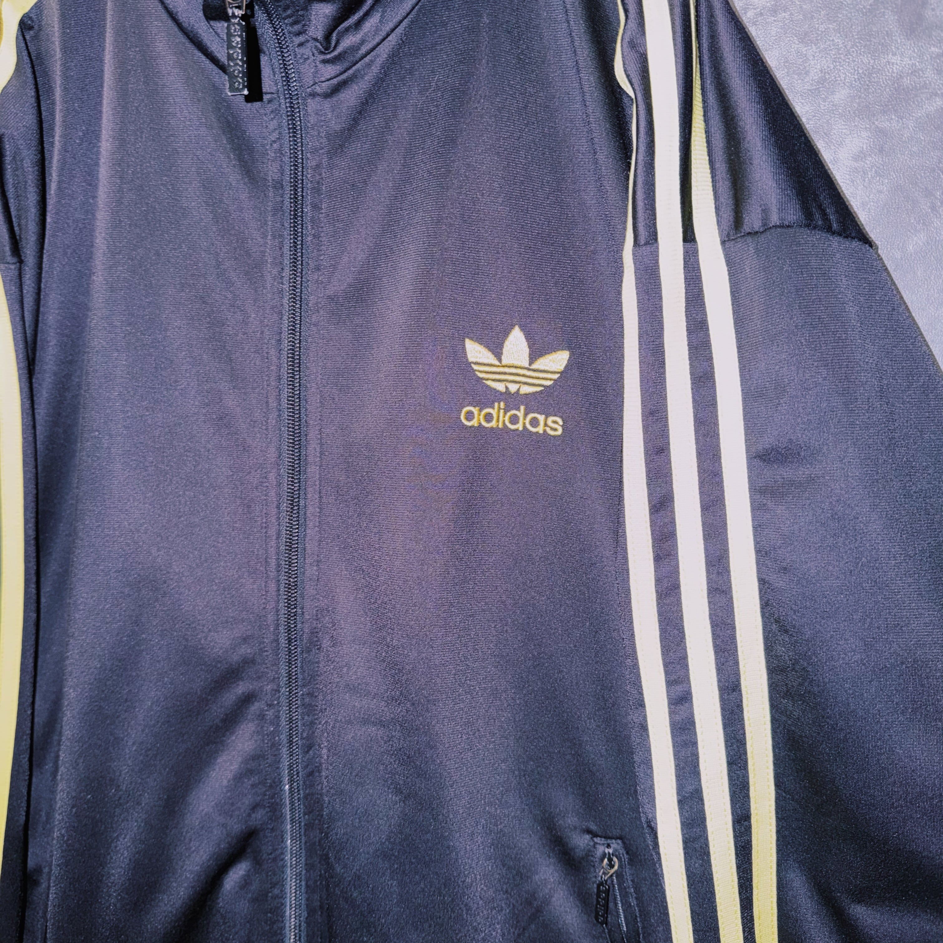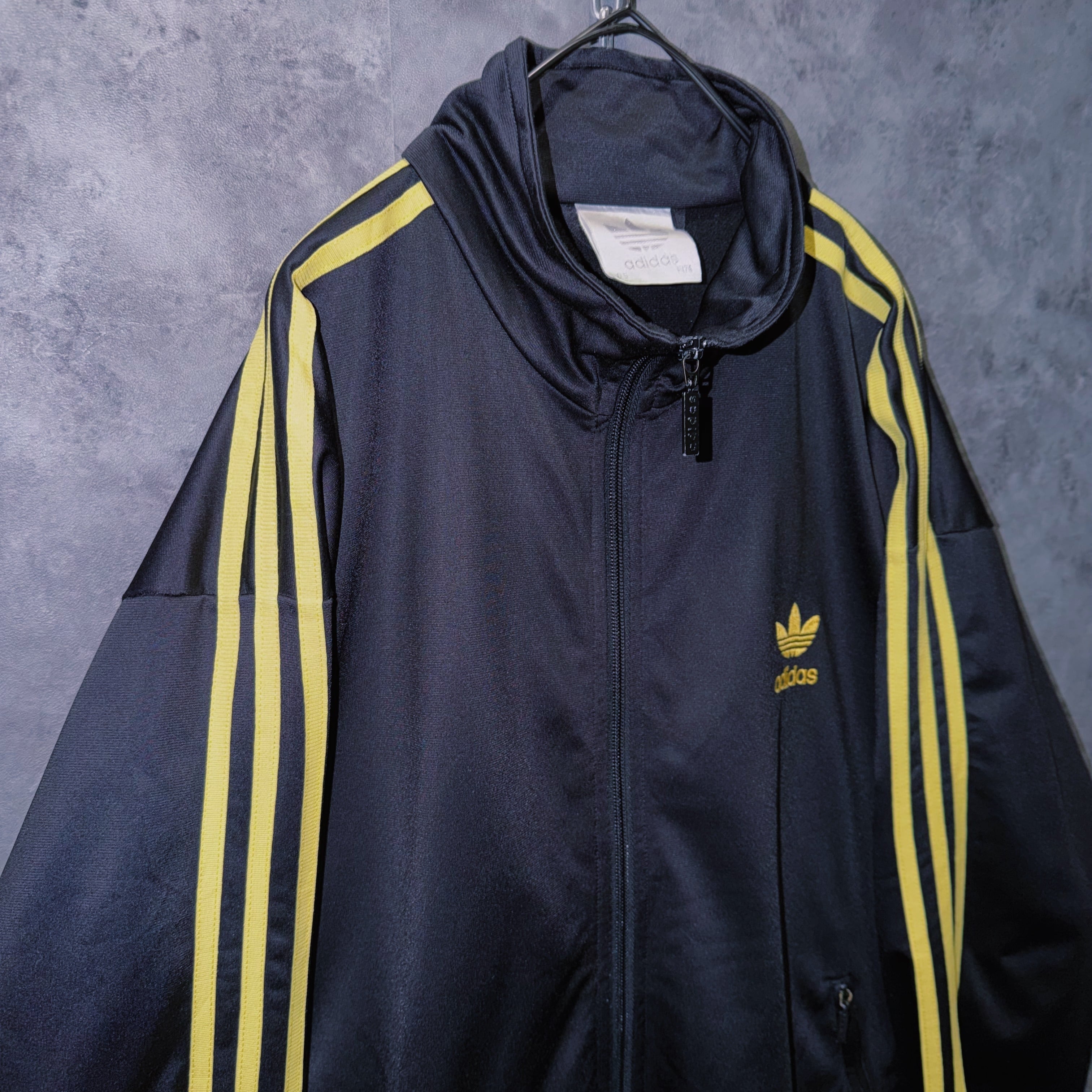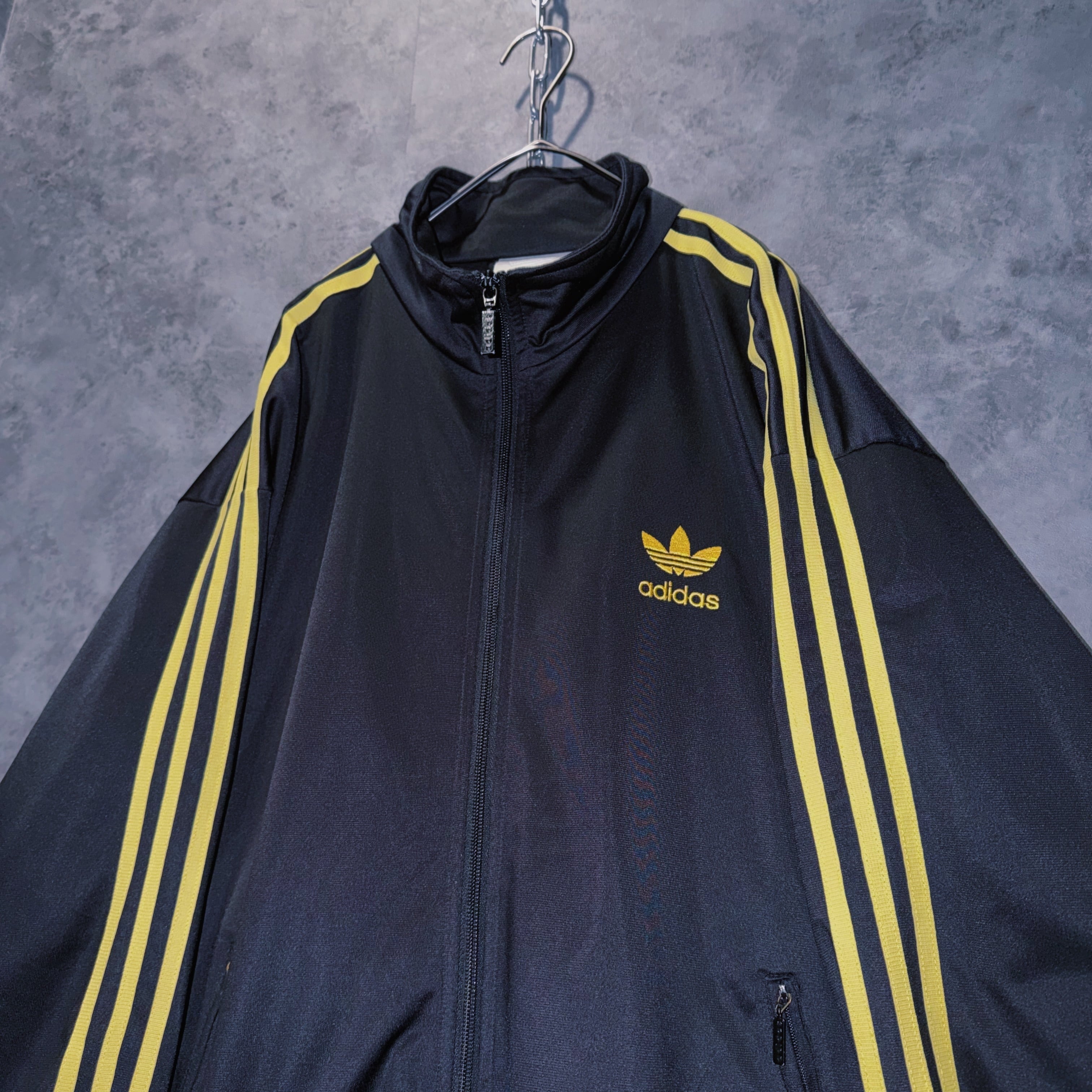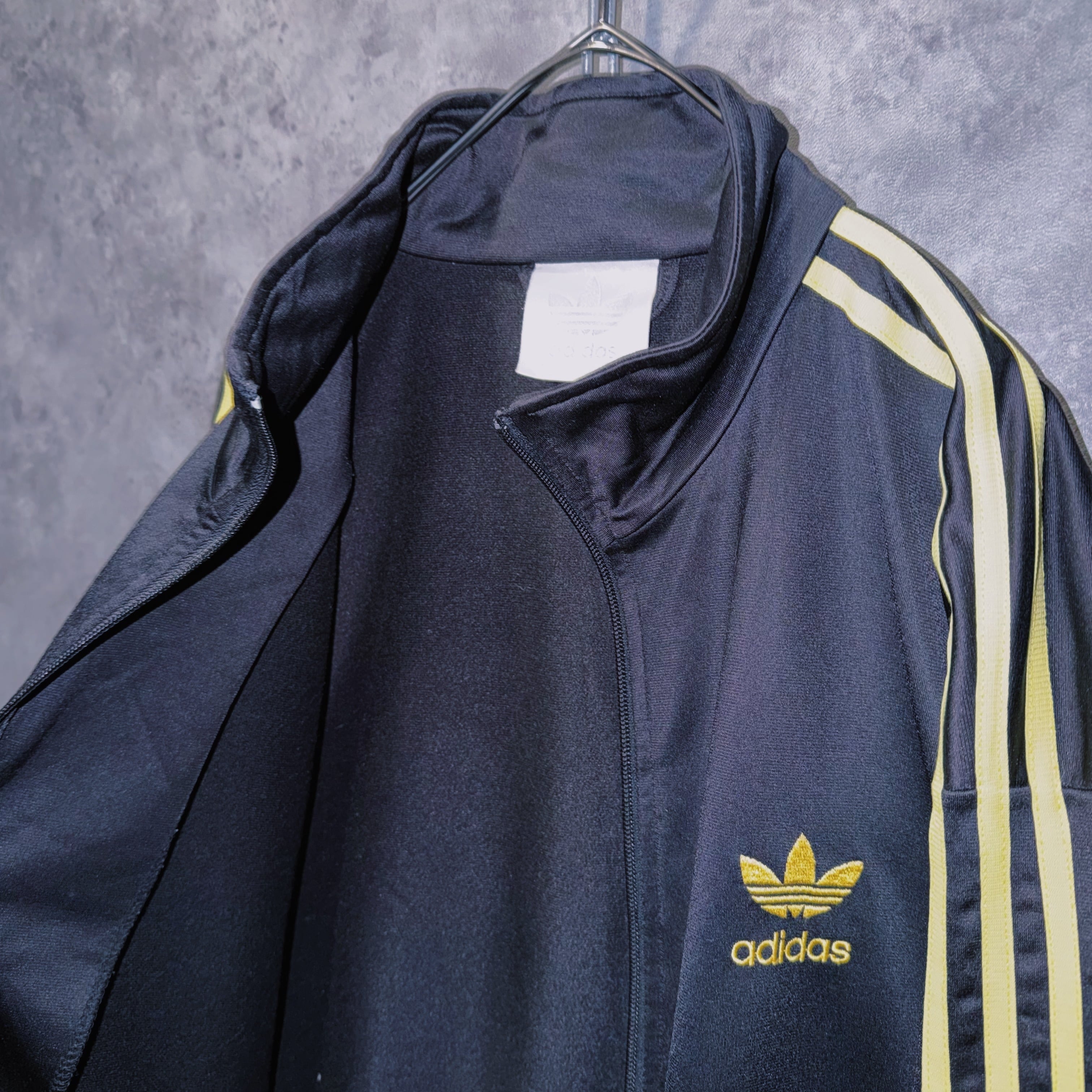 光沢あるブラックカラーの生地に、イエローカラーでスリーストライプとトレフォイルロゴを施した一枚。