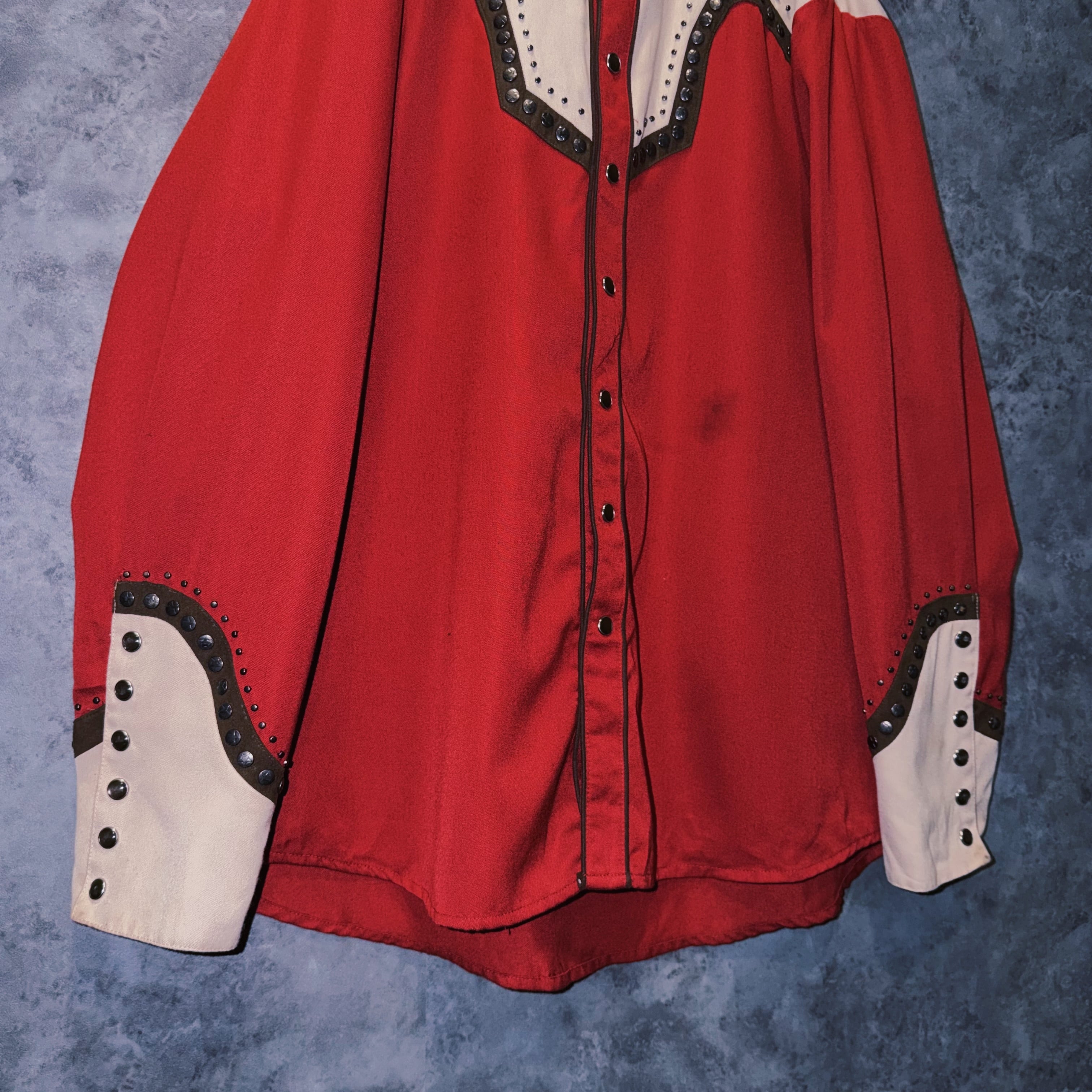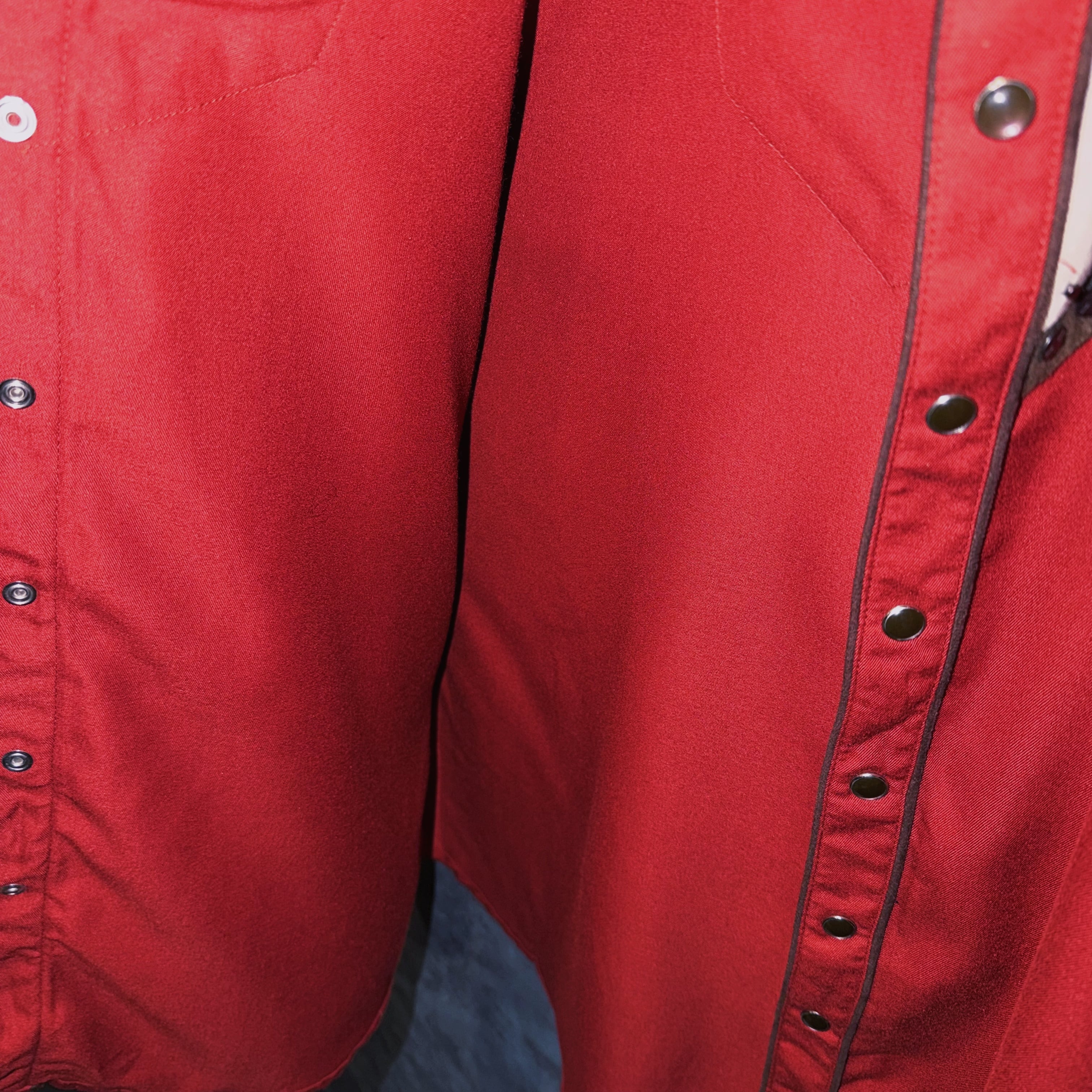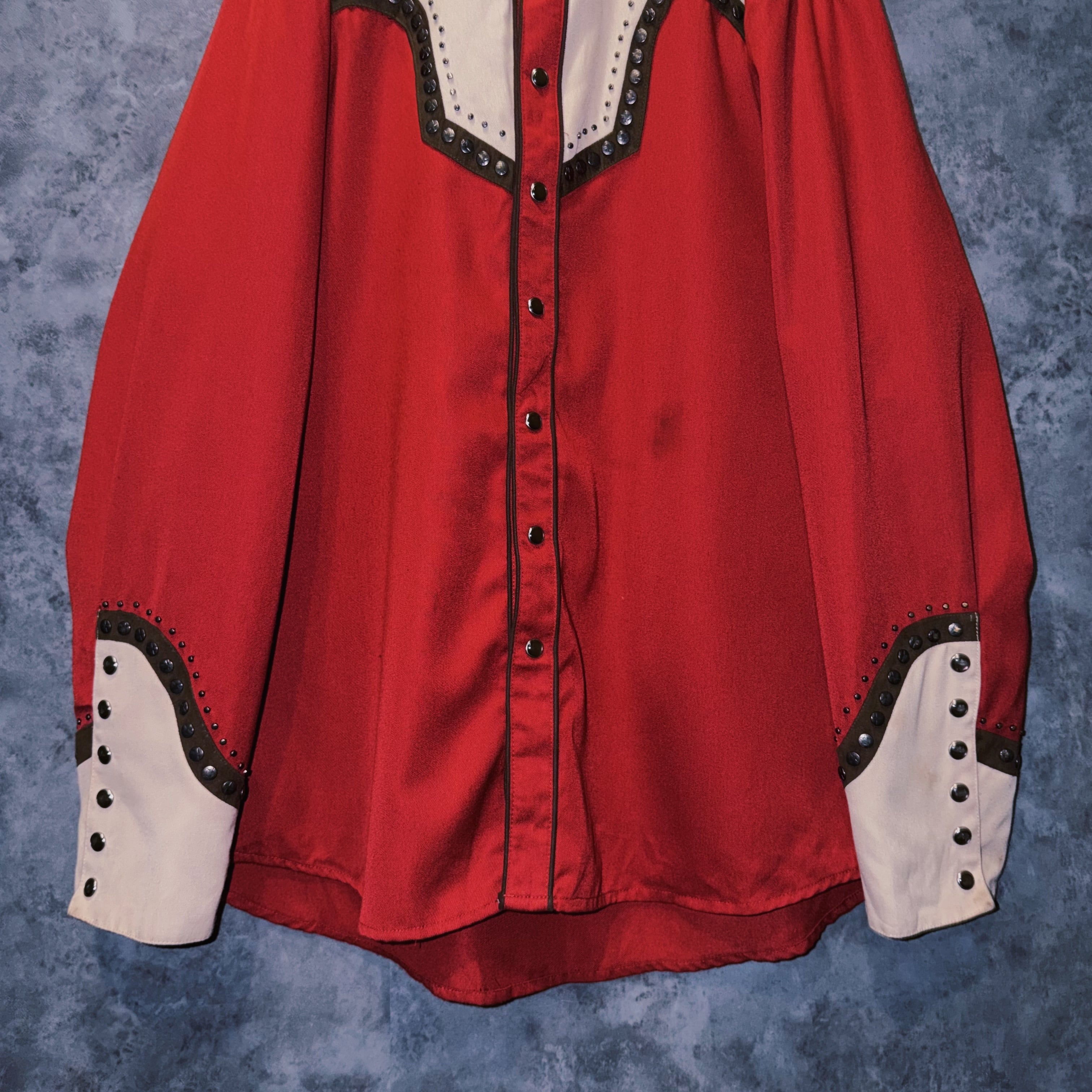 パッと放たれるレッドカラーがメインとなり、ラペルやヨーク、袖口にスタッズがつけられたロックテイストな一枚。