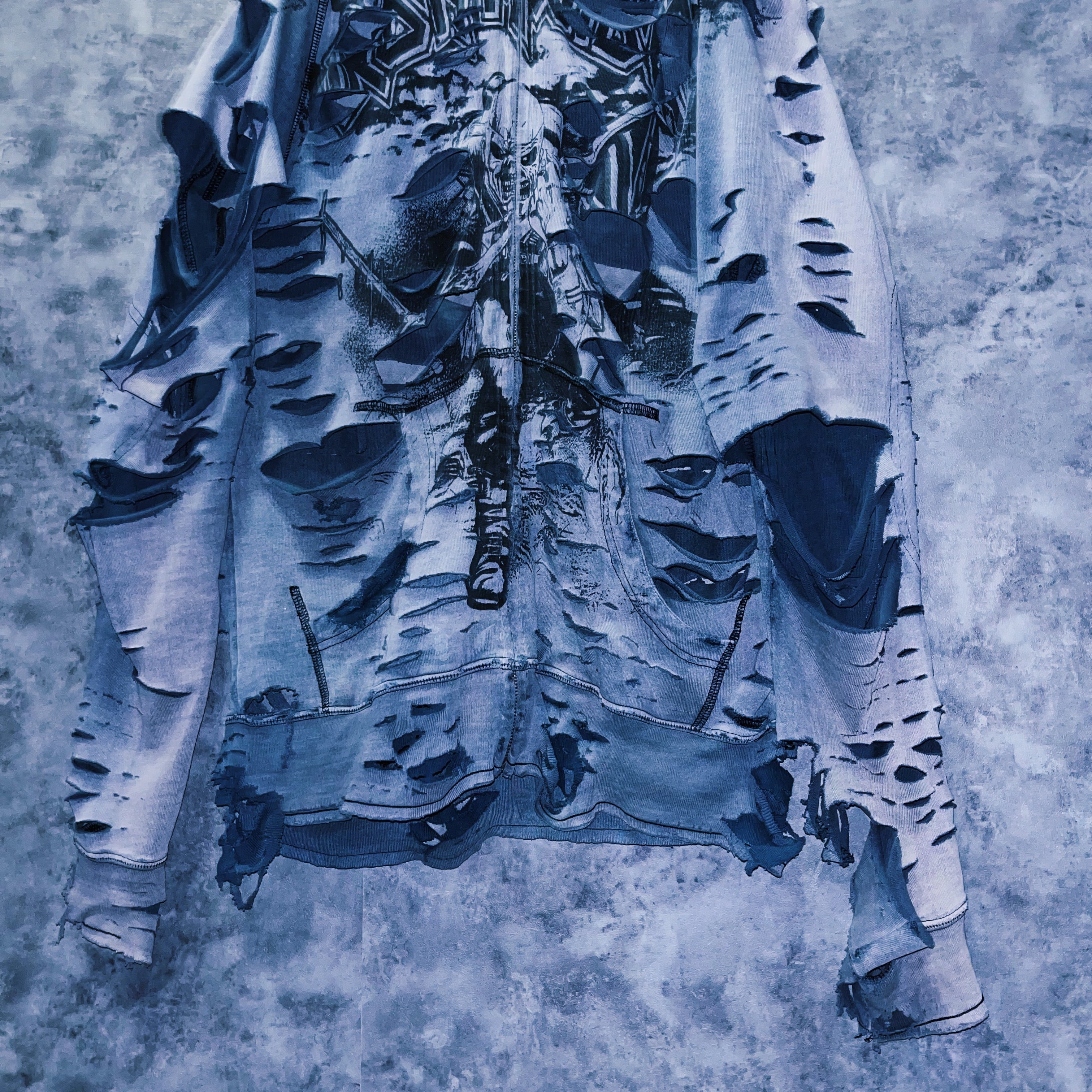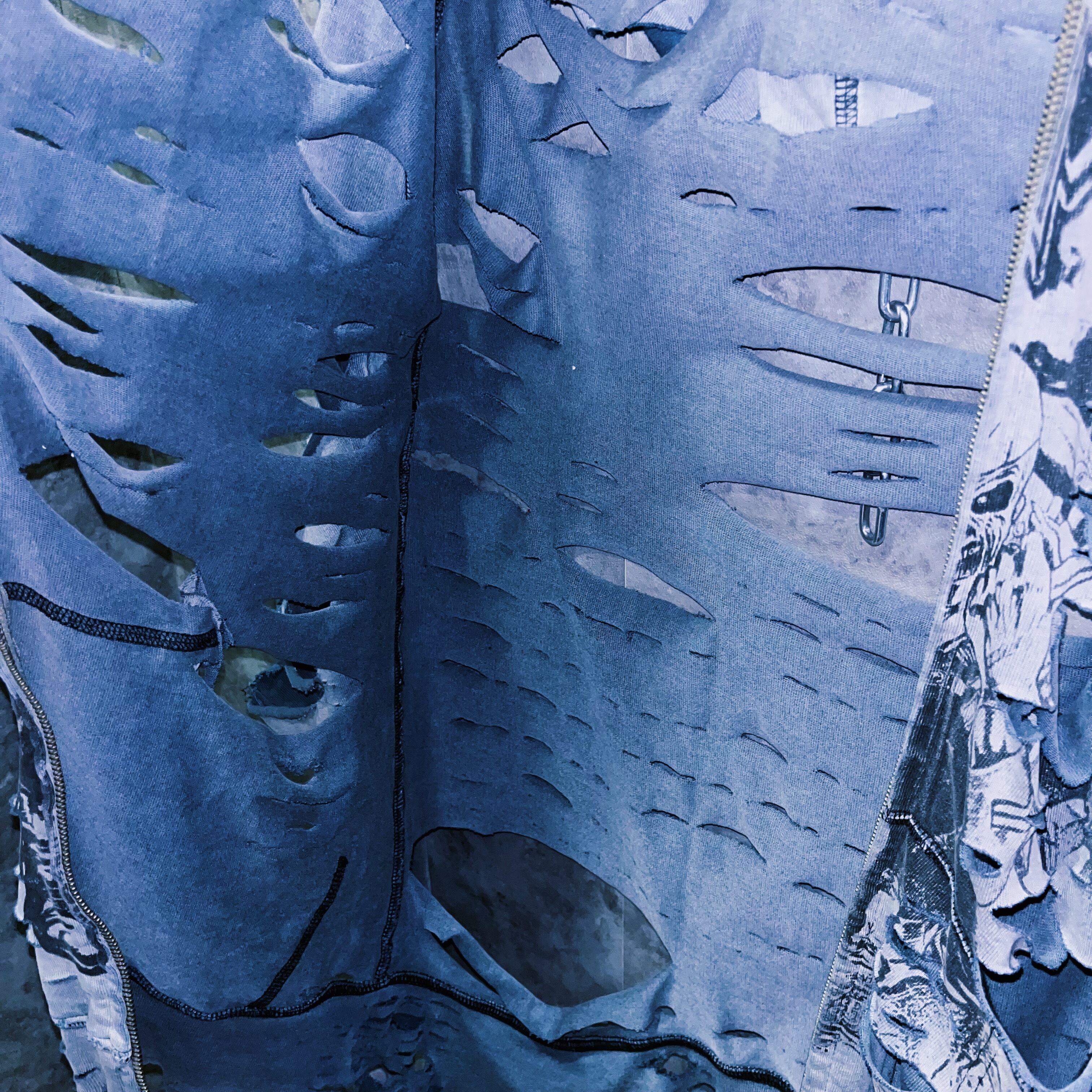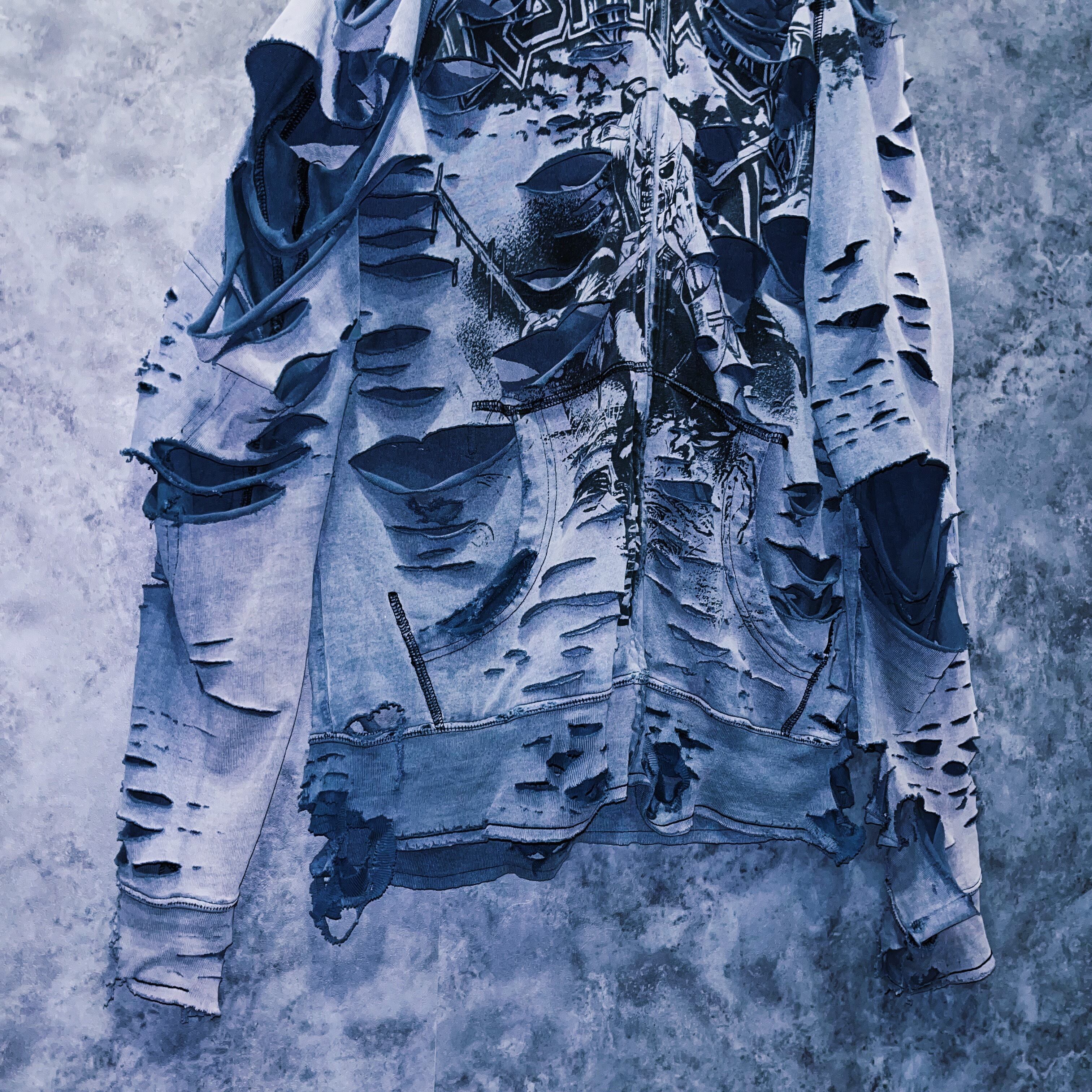 退廃的なグレーボディにアイアンメイデンのパンクなプリントデザインが施されており、さらには当店の十八番と言えるボロカスタムの究極系クラッシュデザインを施した一枚。