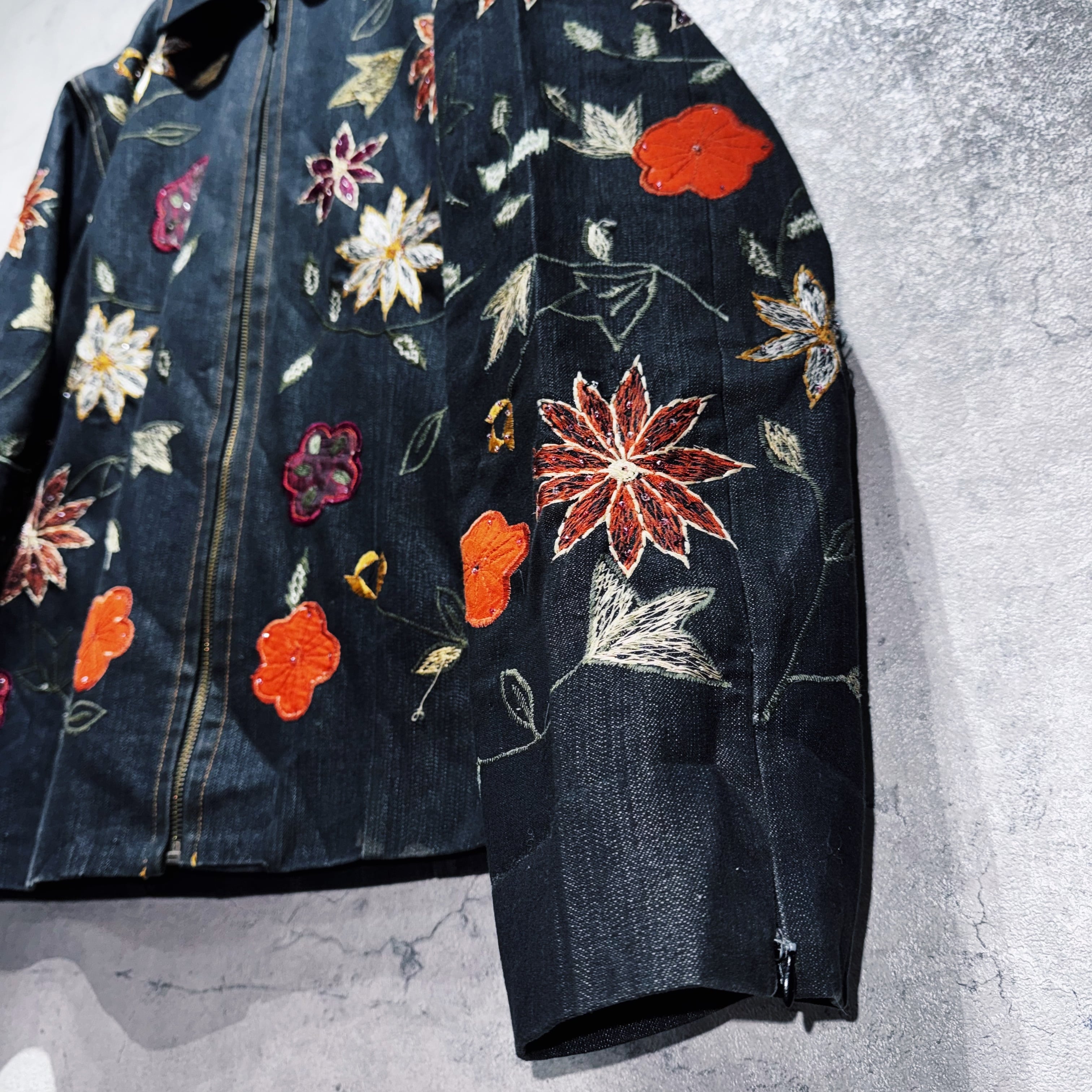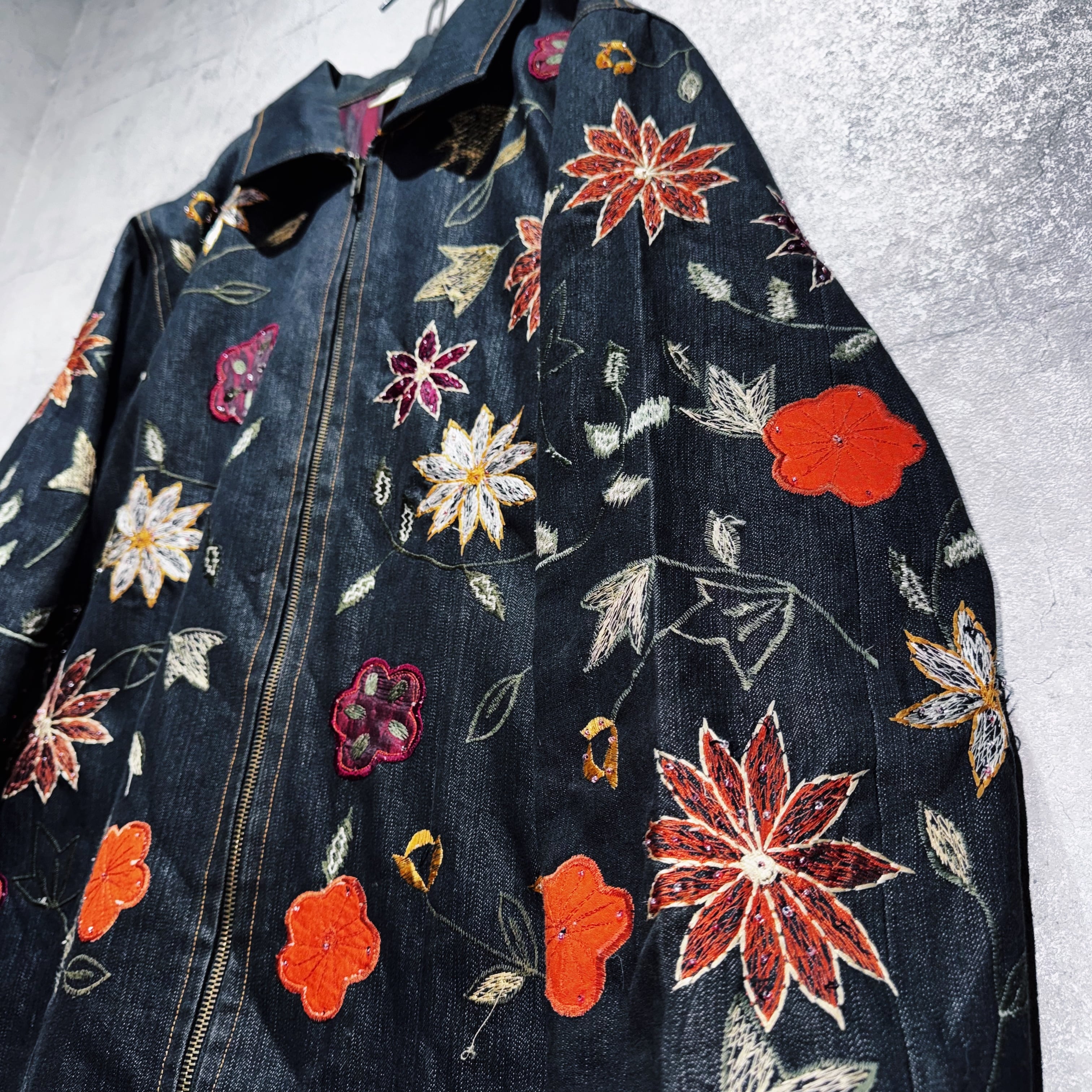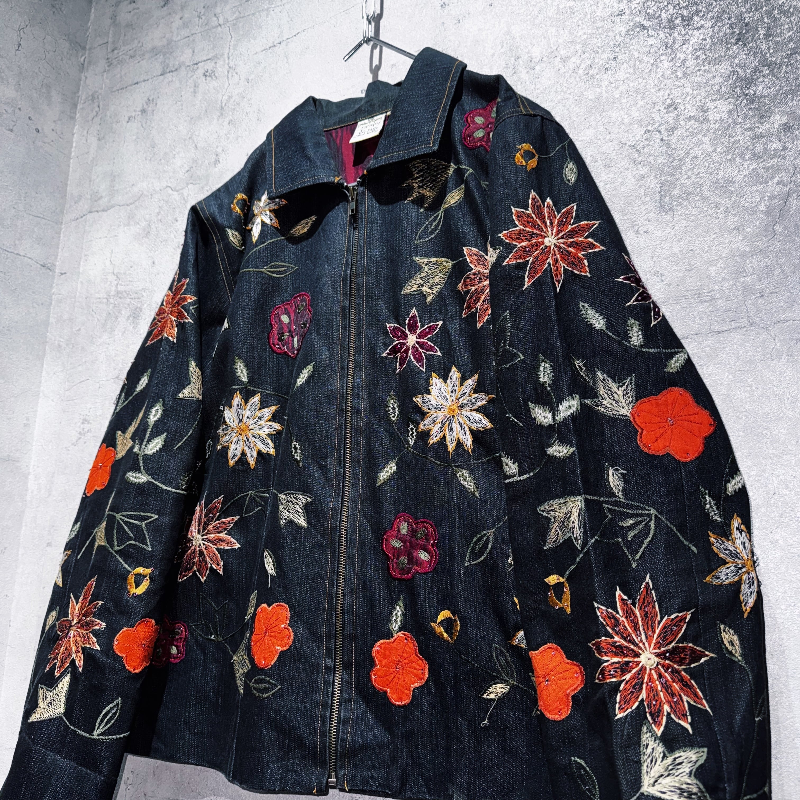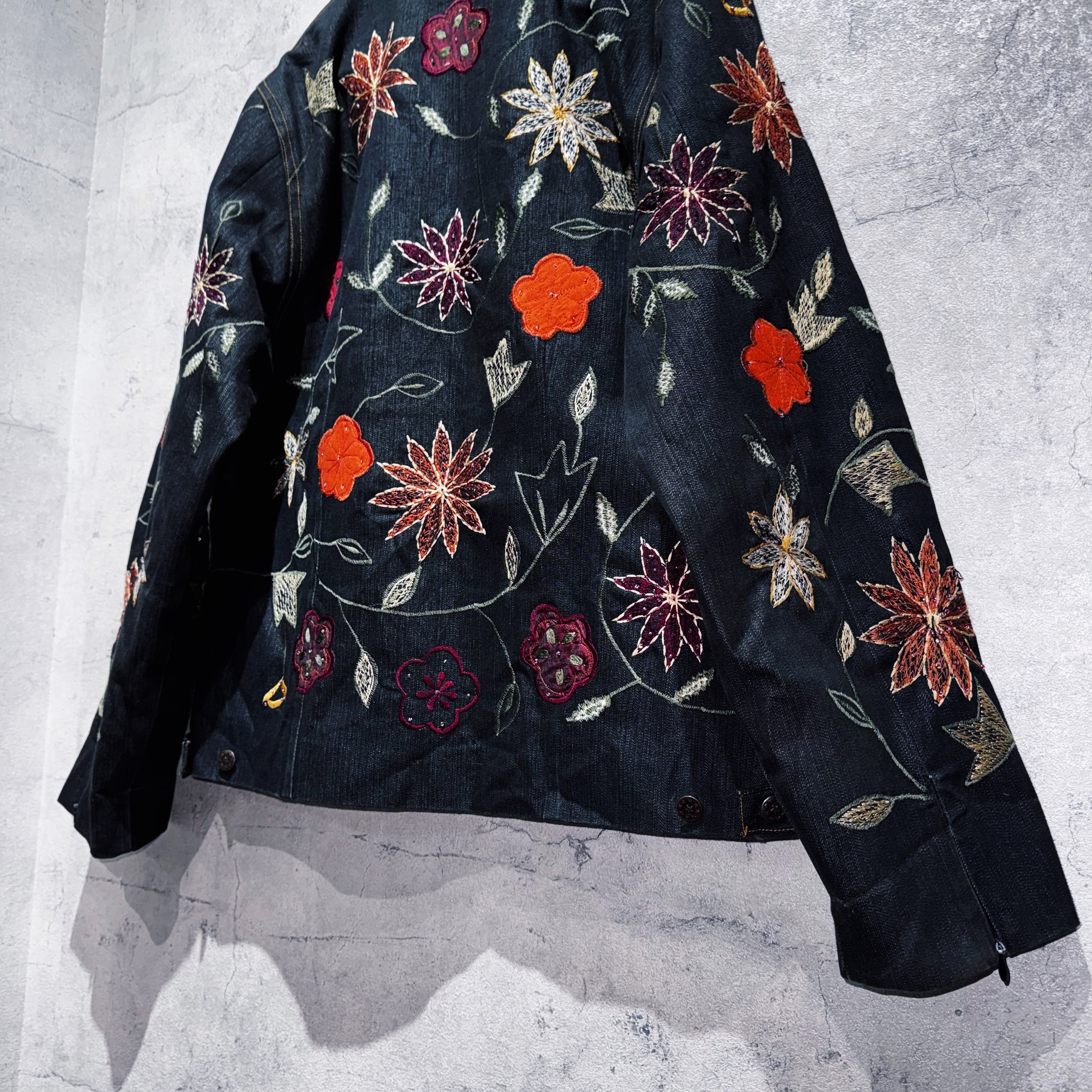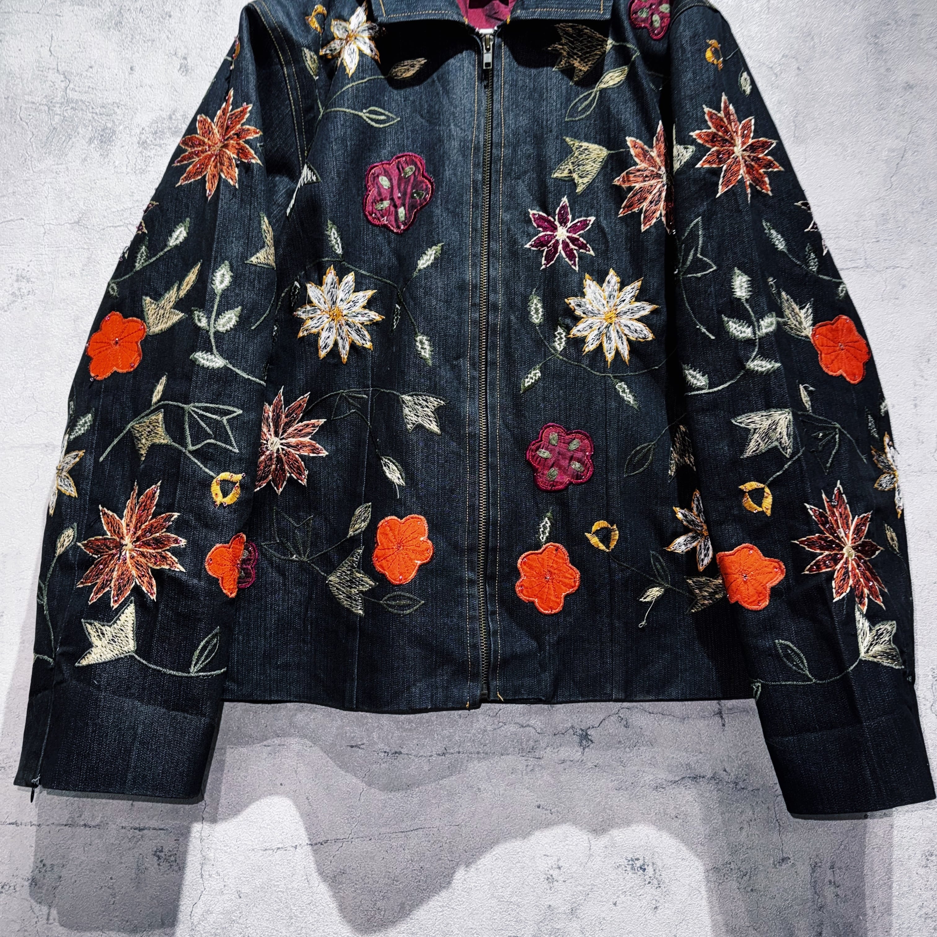 ヴィンテージフラワーエンブロイダリーデザインデニムジップジャケット