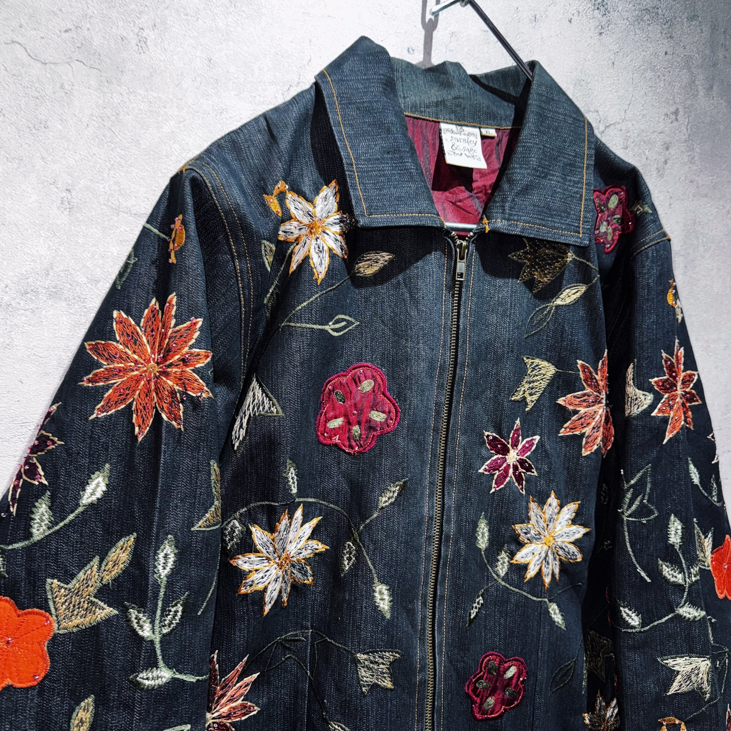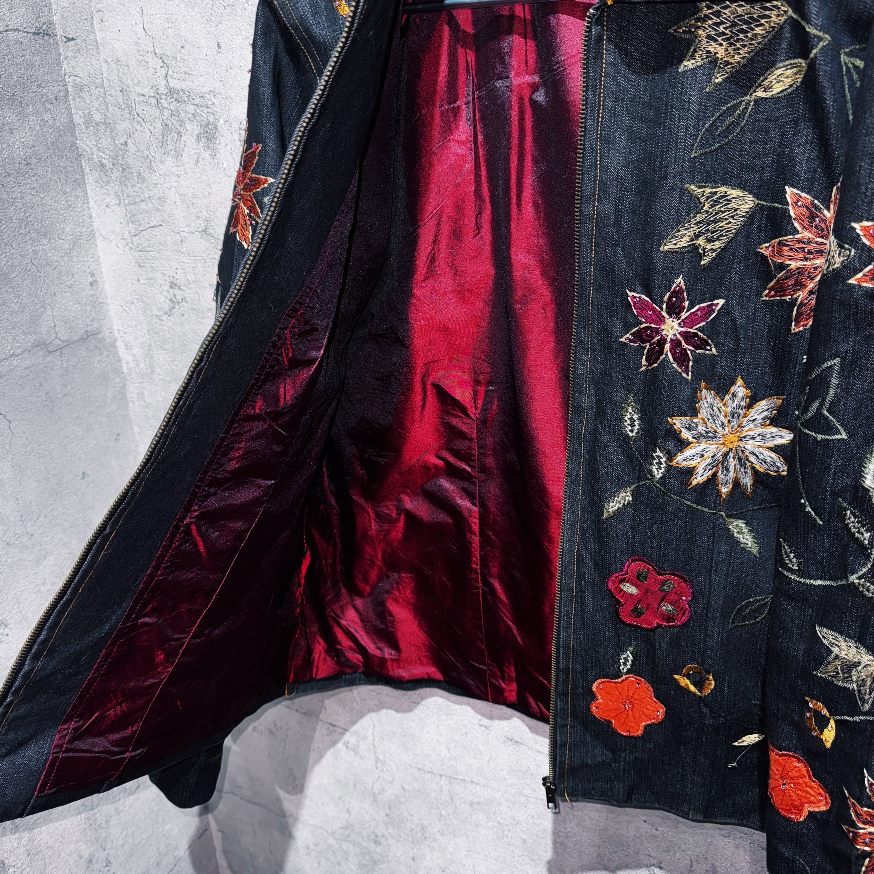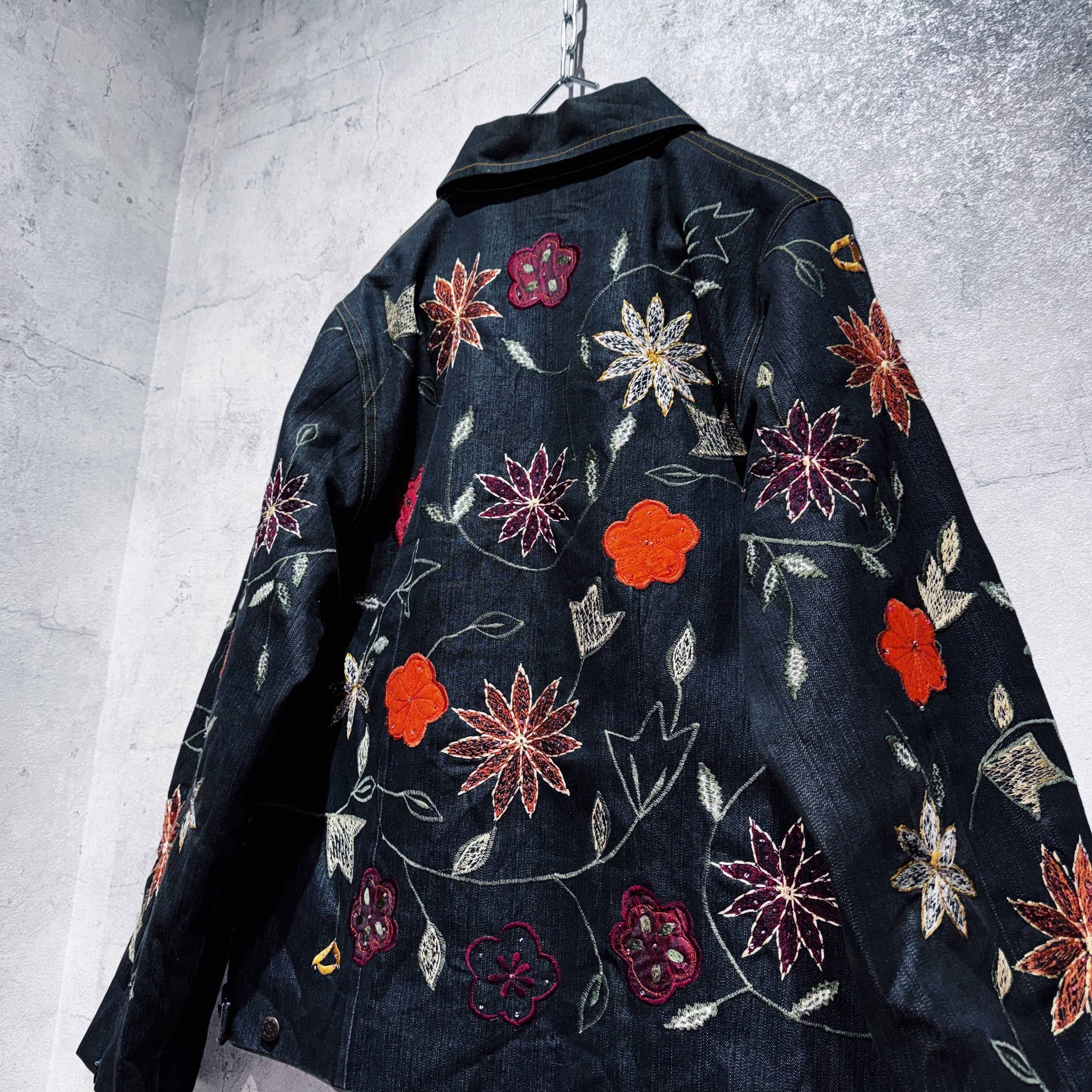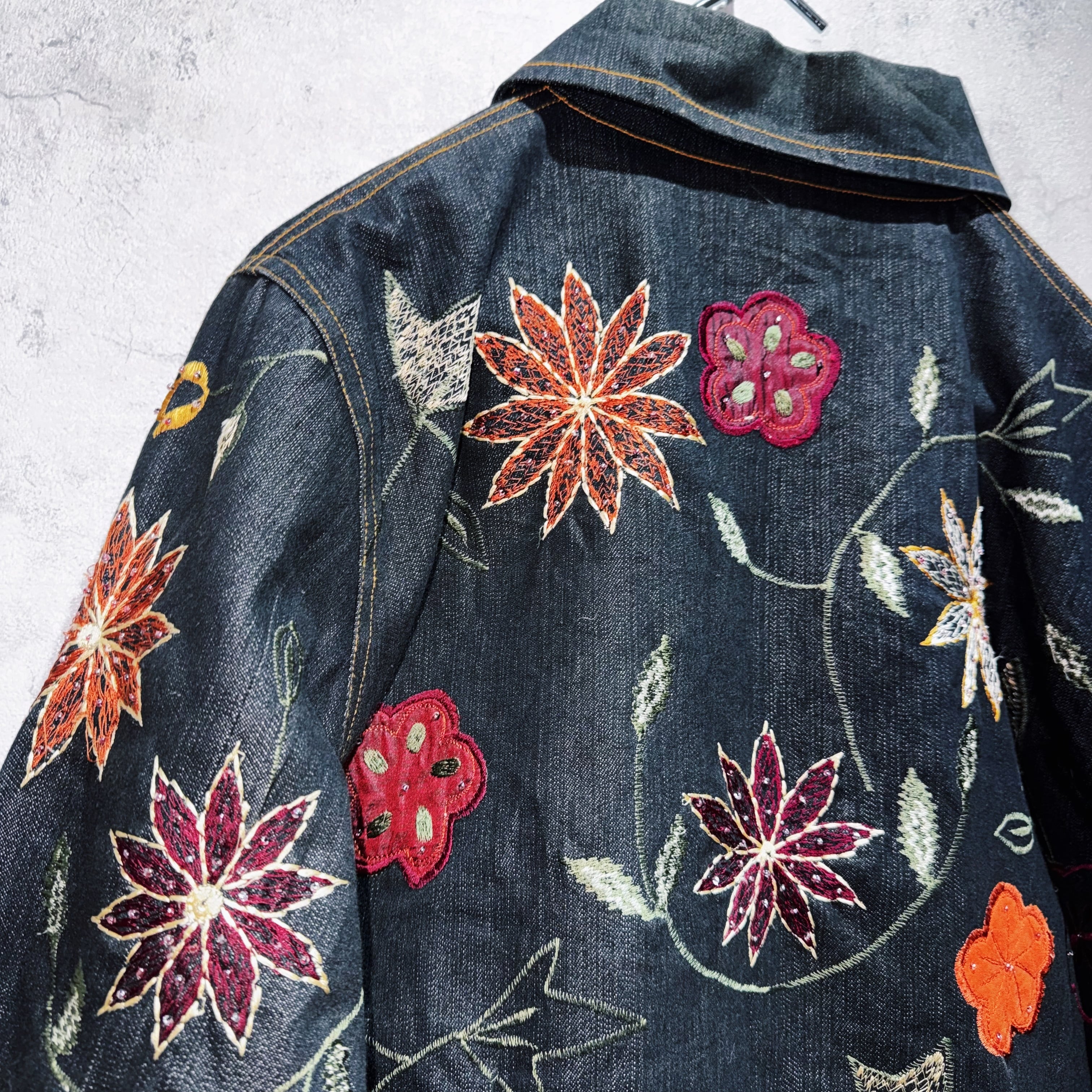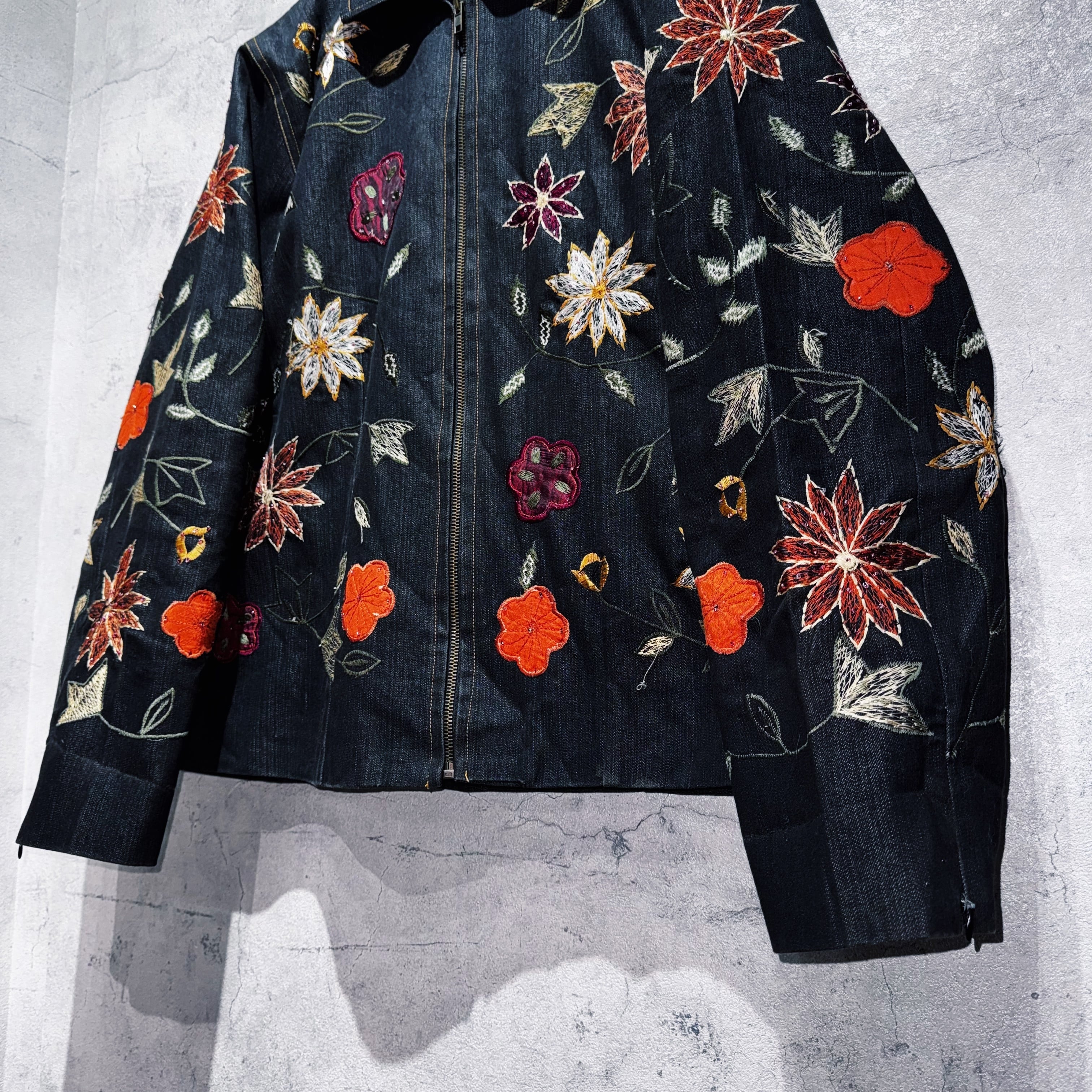 ヴィンテージフラワーエンブロイダリーデザインデニムジップジャケット