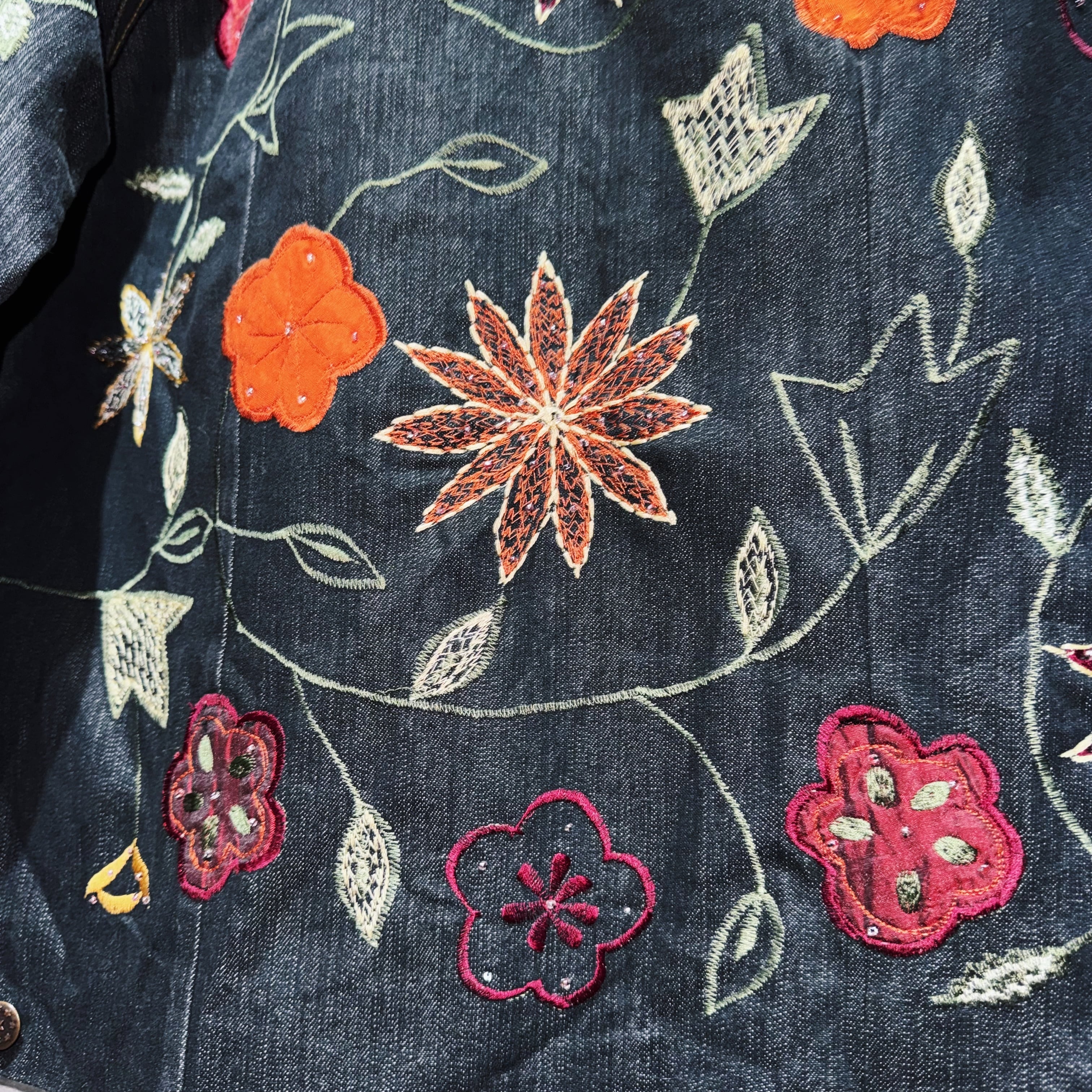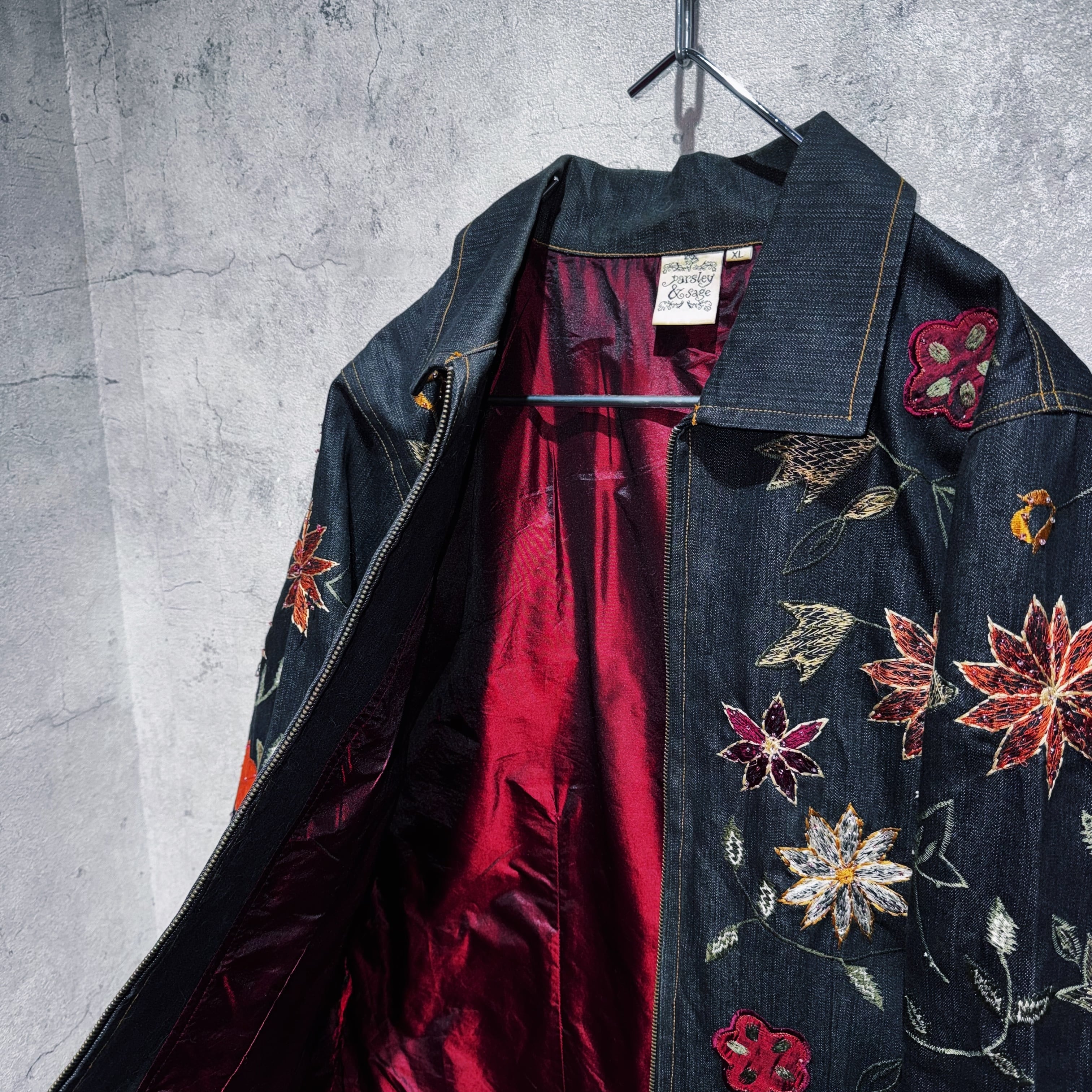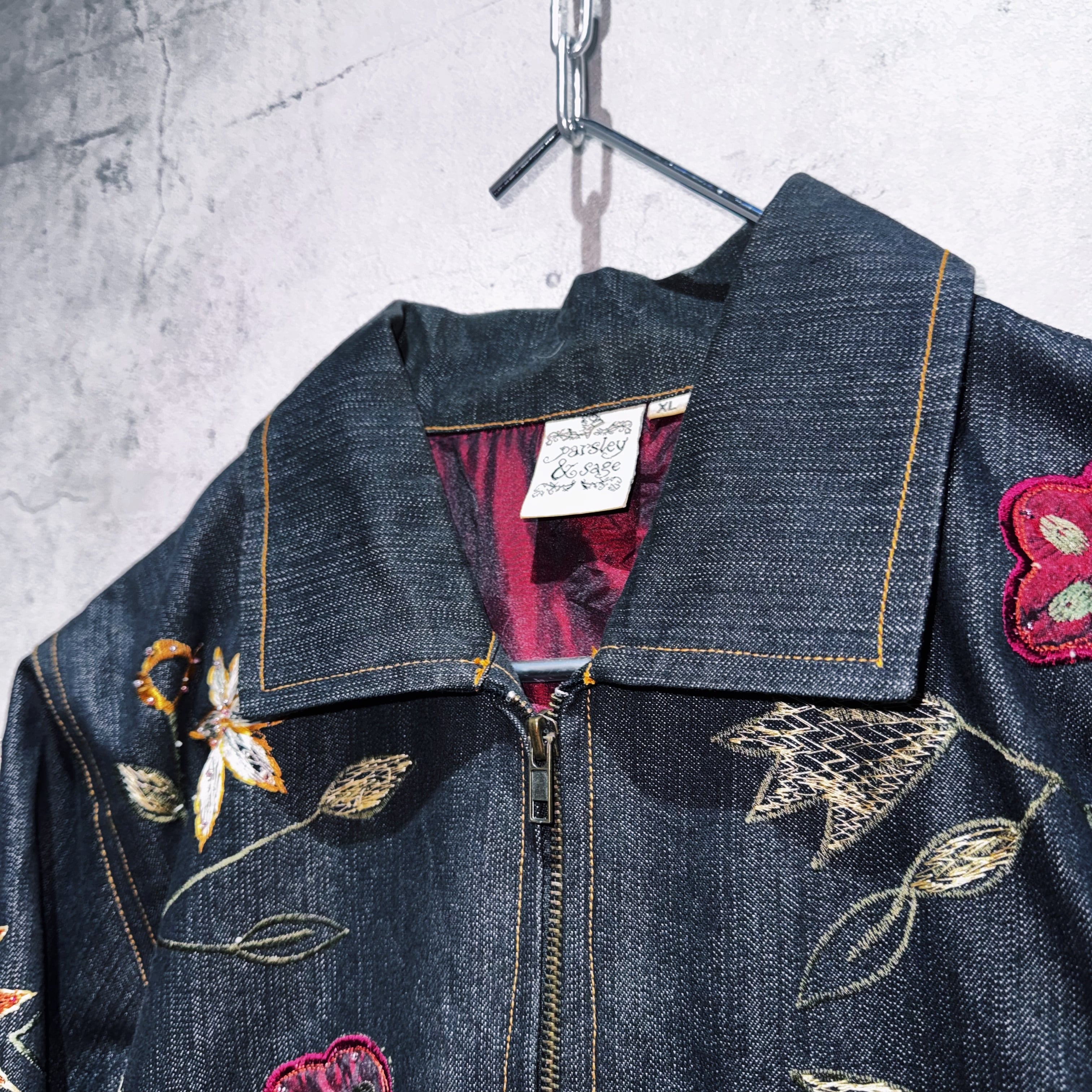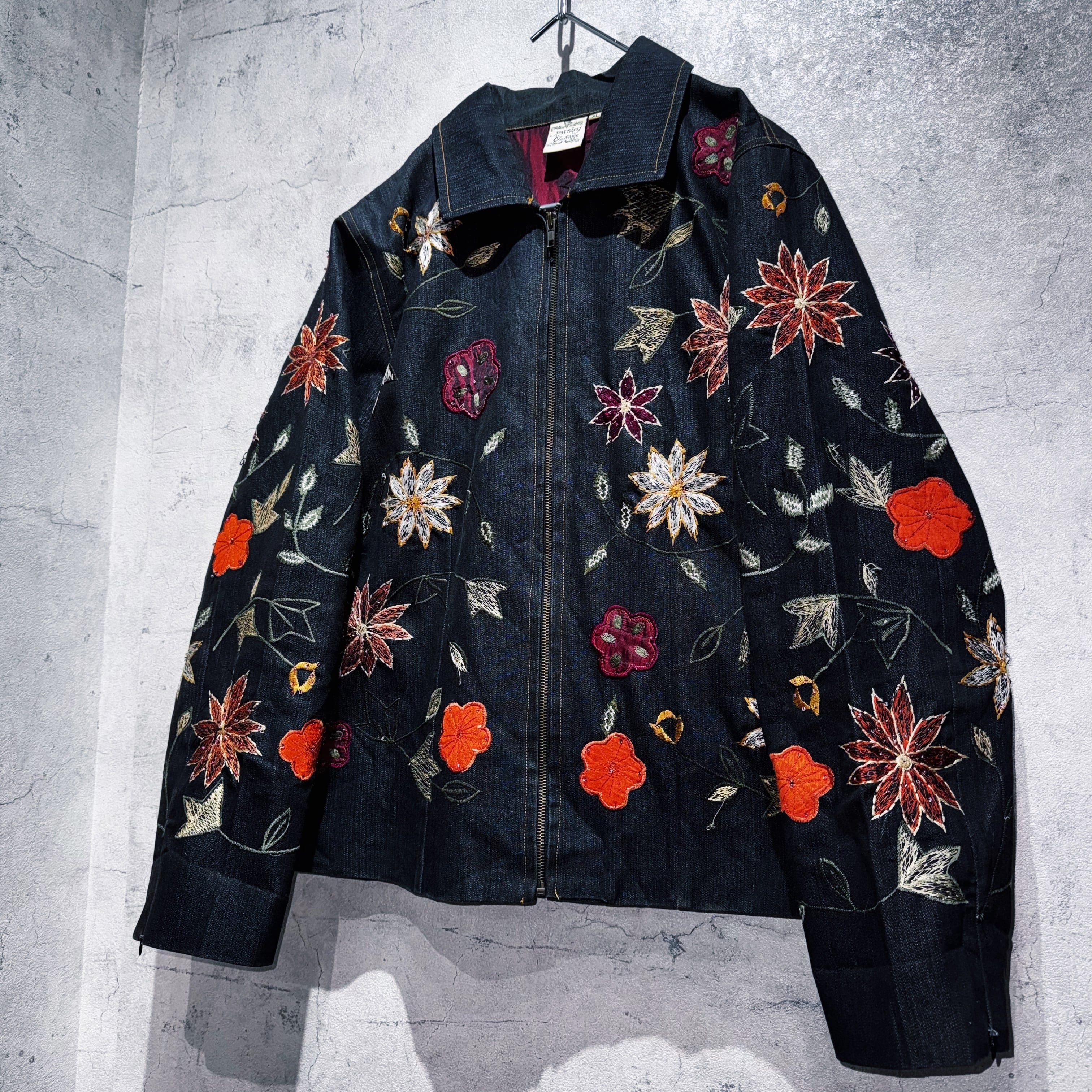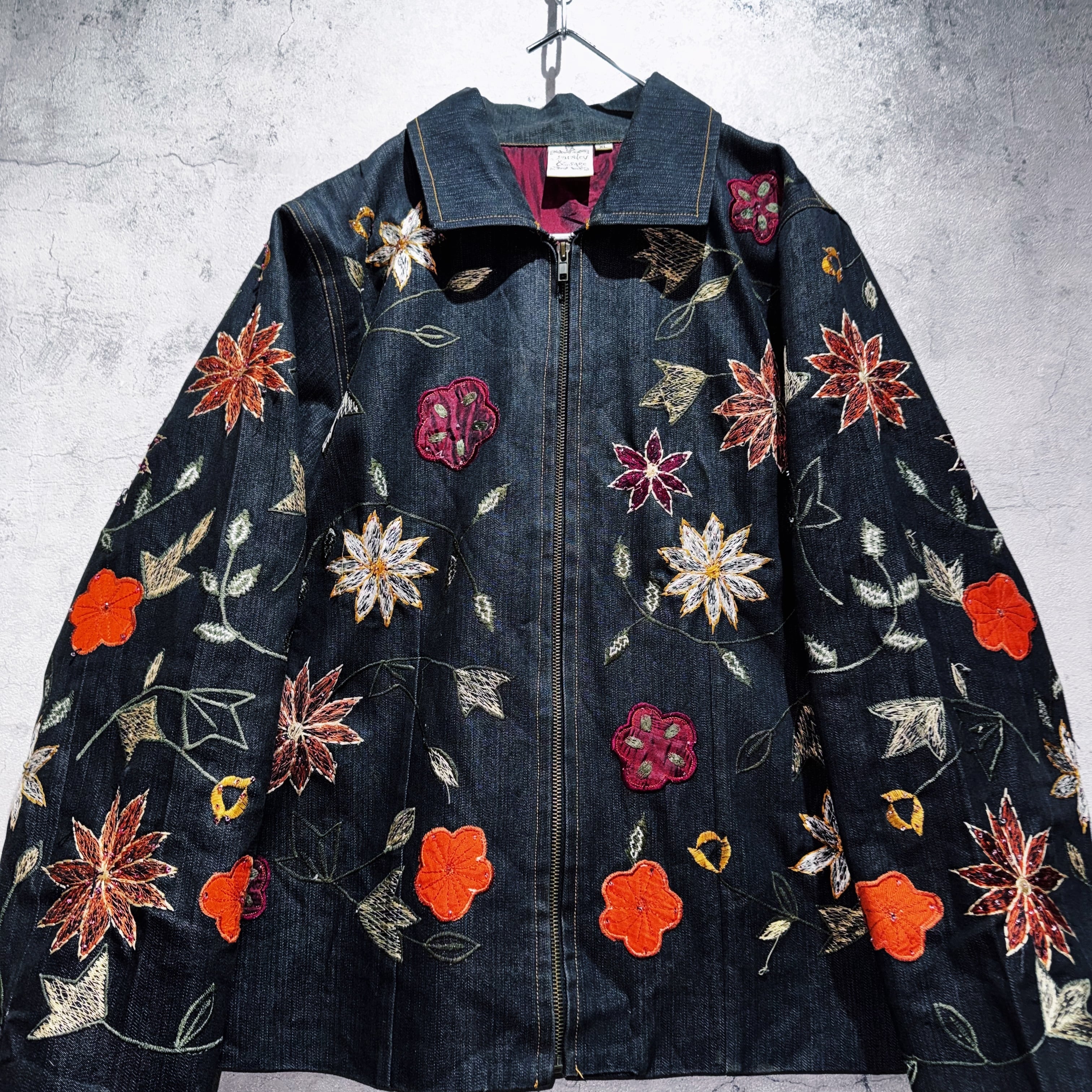 ヴィンテージフラワーエンブロイダリーデザインデニムジップジャケット