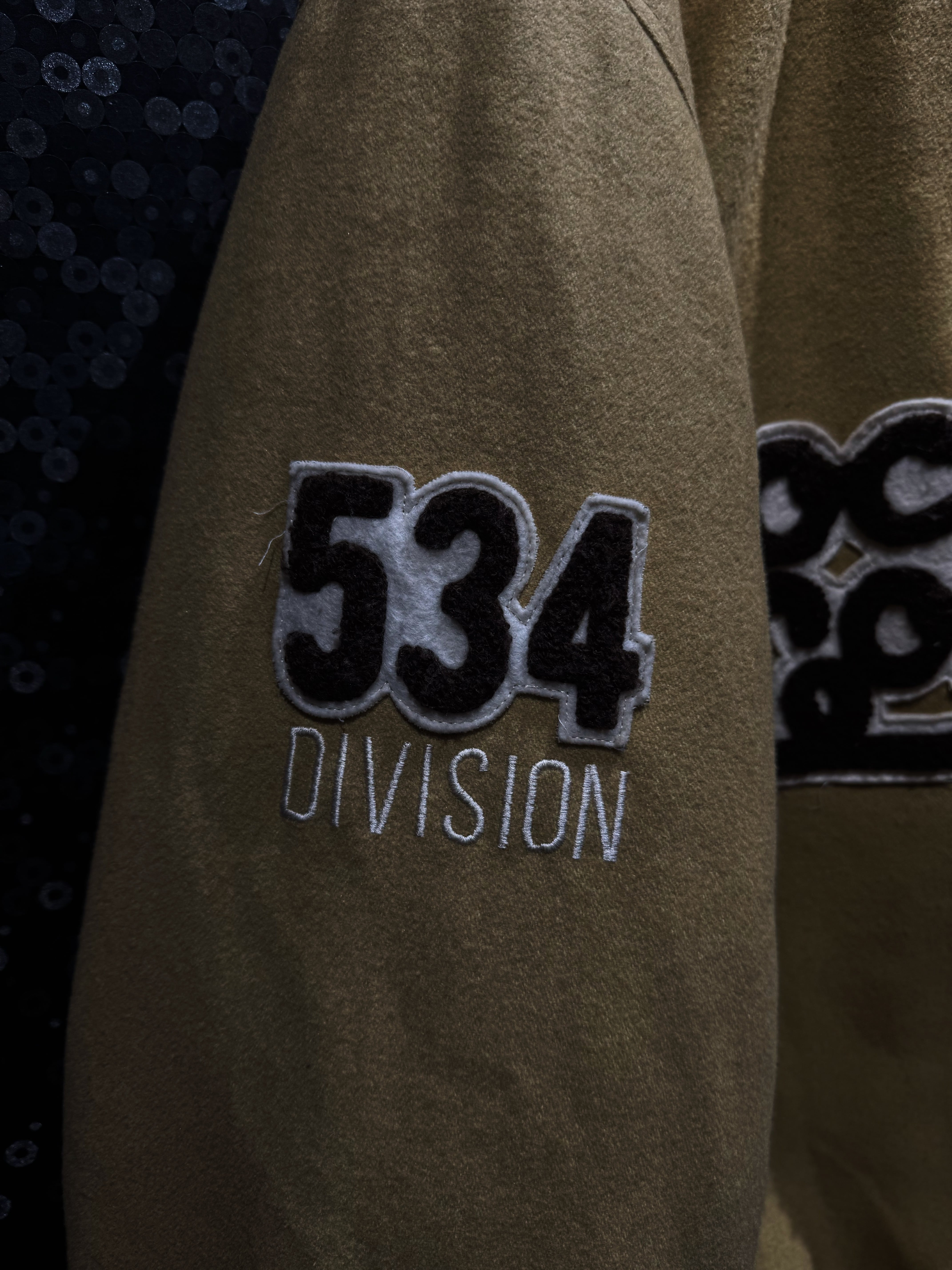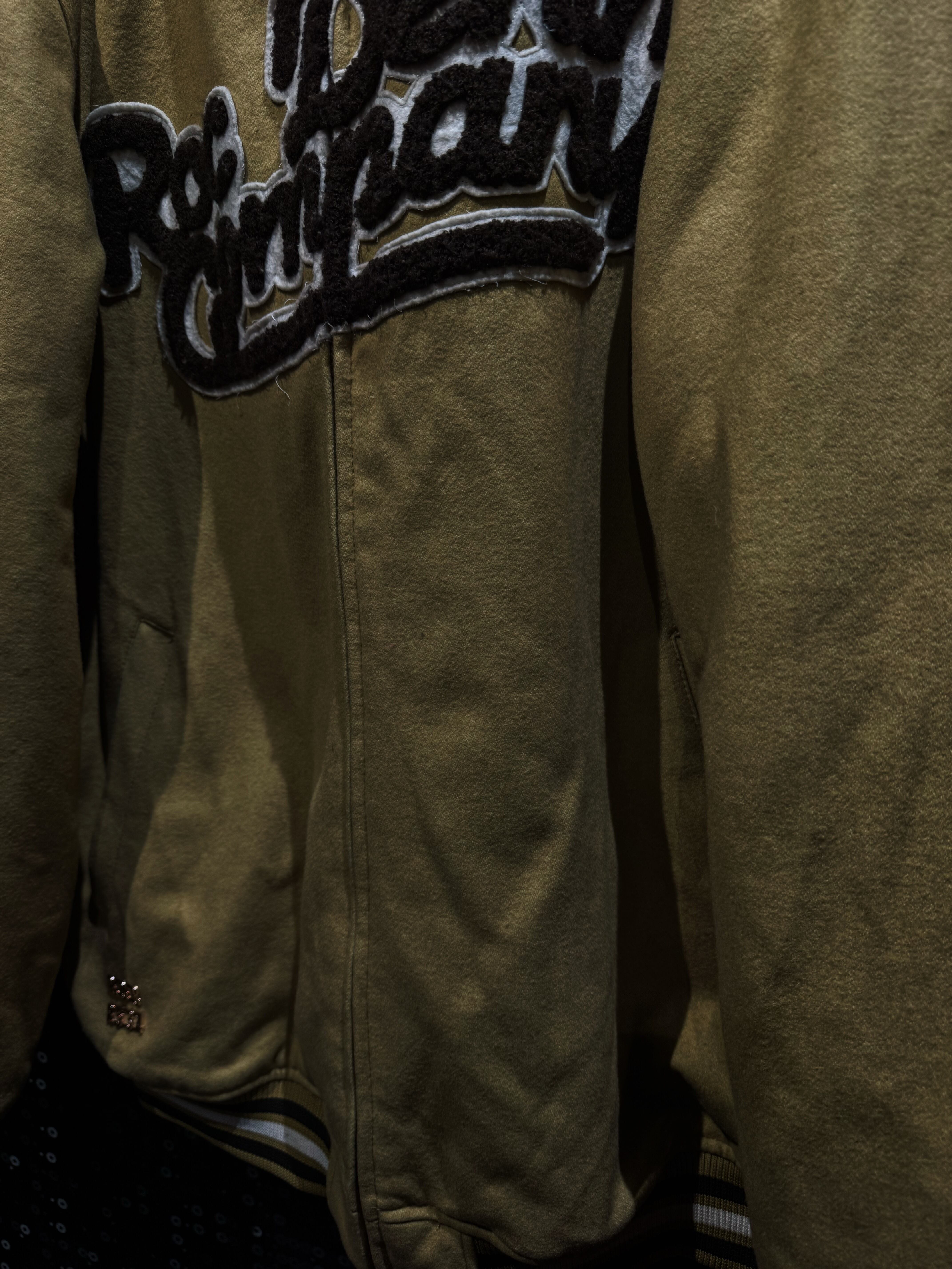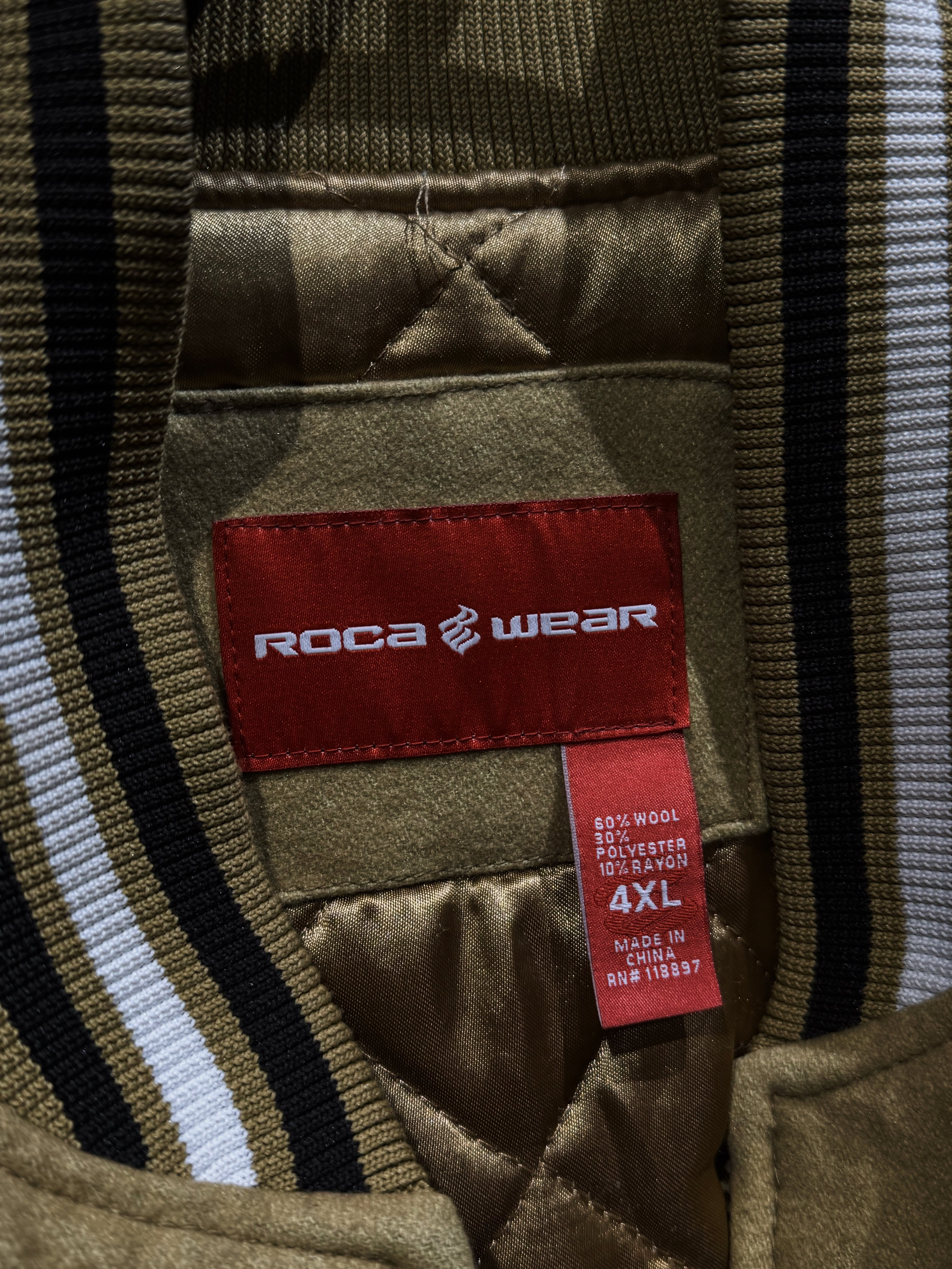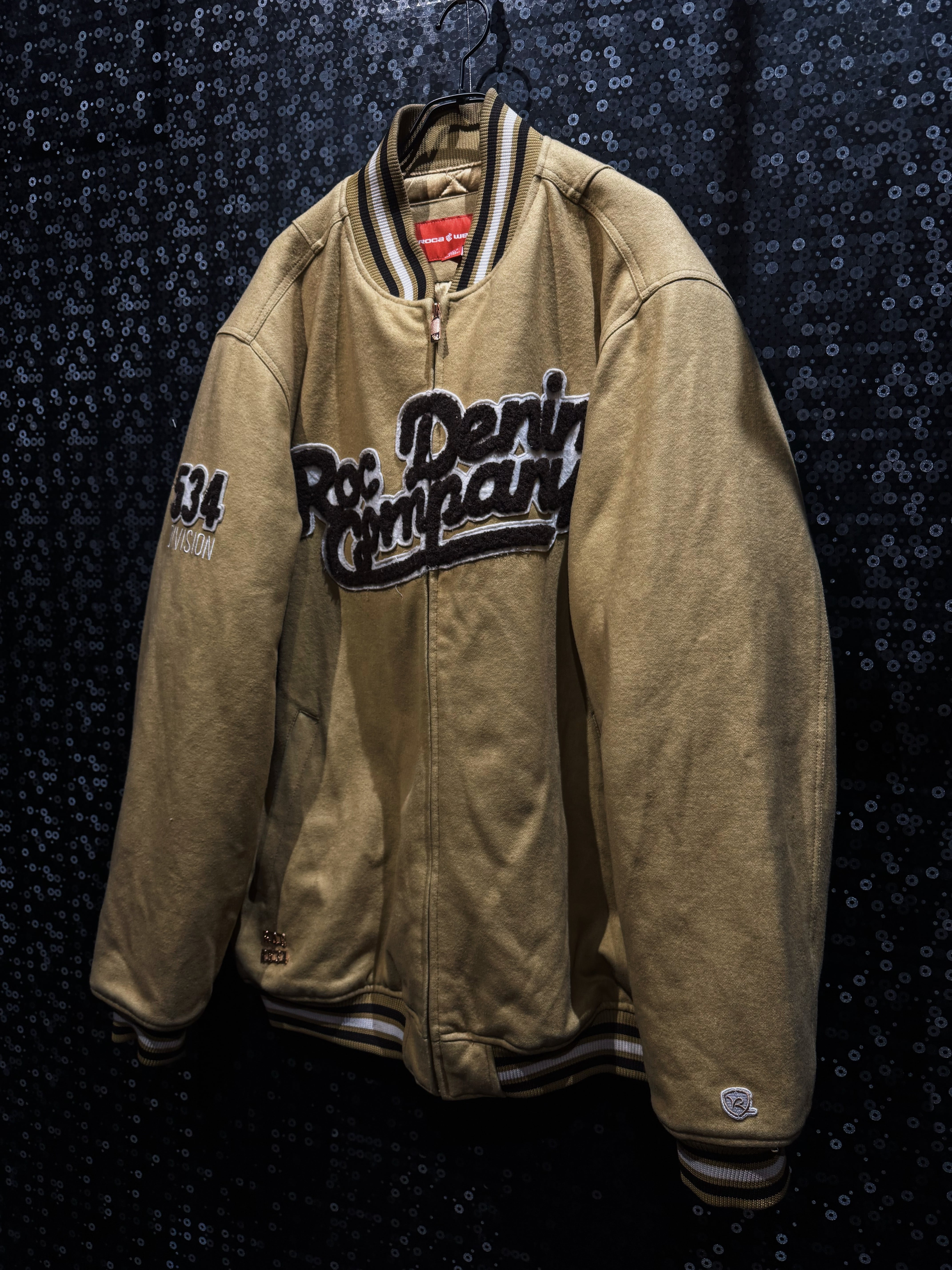 この個体はウールボディのスタジアムタイプ。オリーブ寄りのカーキカラーに、ブラック×ホワイトのサガラ刺繍で入る“Roc Denim Company”アーチロゴ。毛足のある立体ワッペンがしっかり主張する。左袖には“534 DIVISION”ナンバリング。クラシックなカレッジ調の構成だけど、サイズは4XL。ここが最大のポイント。