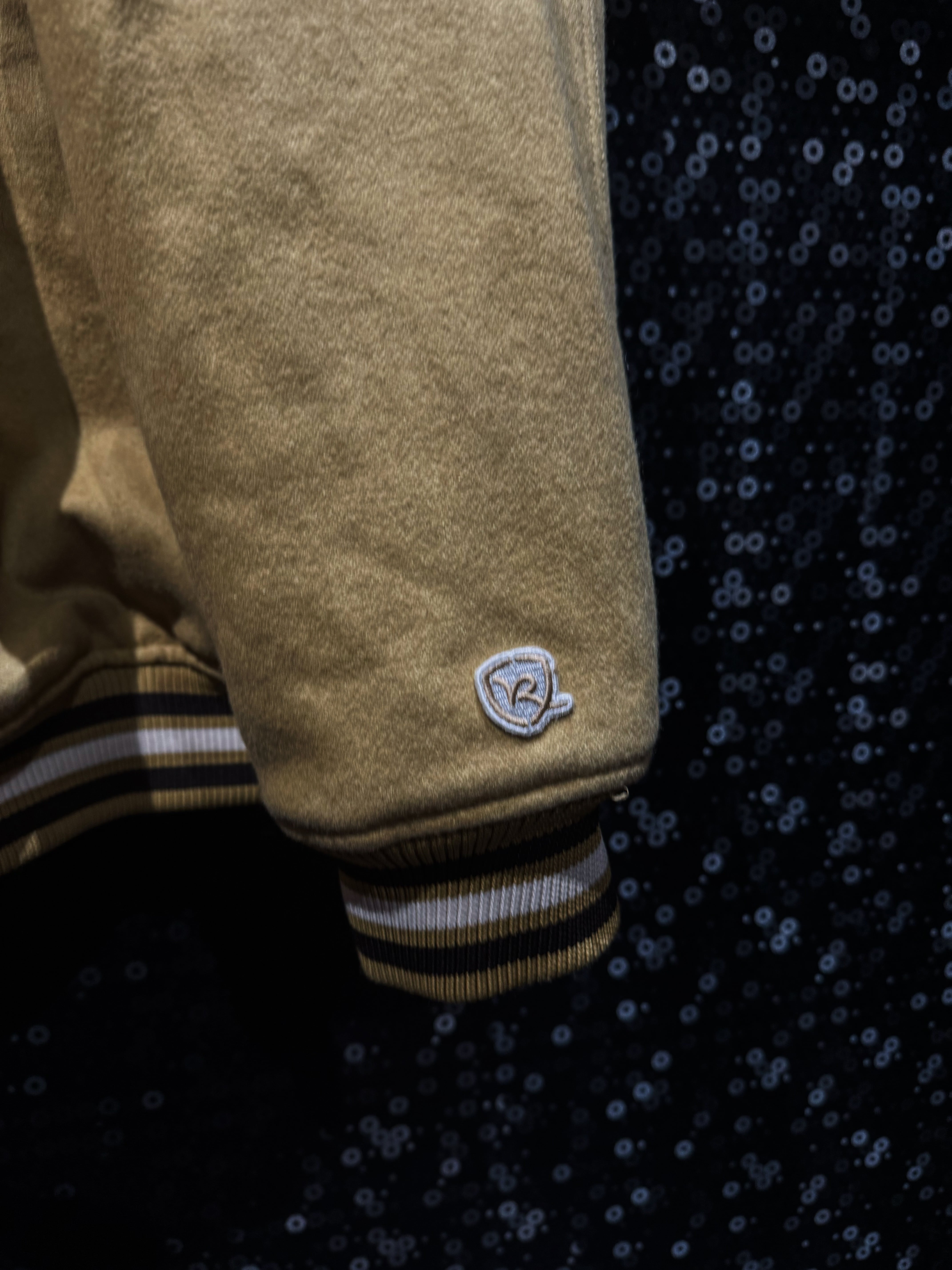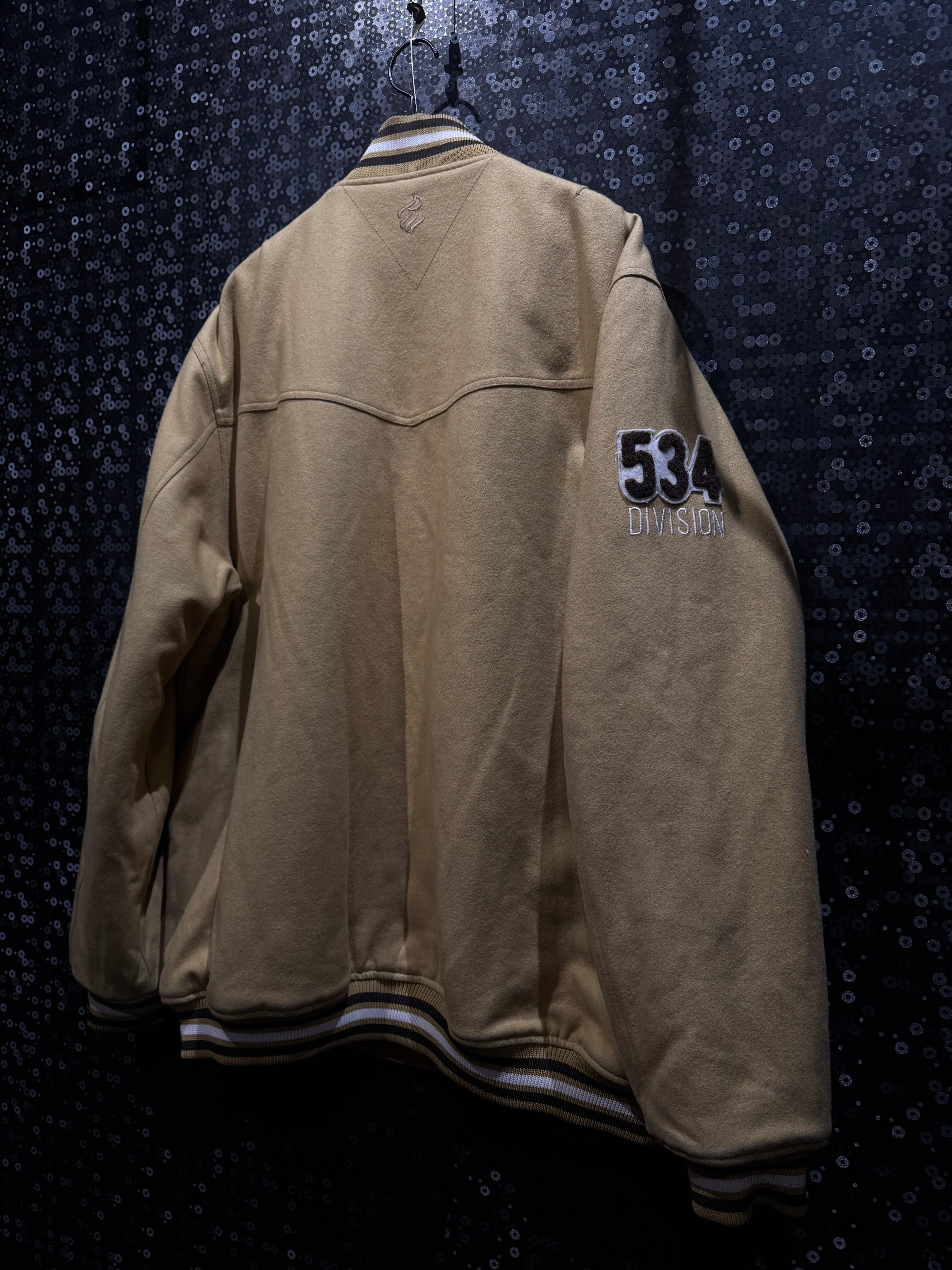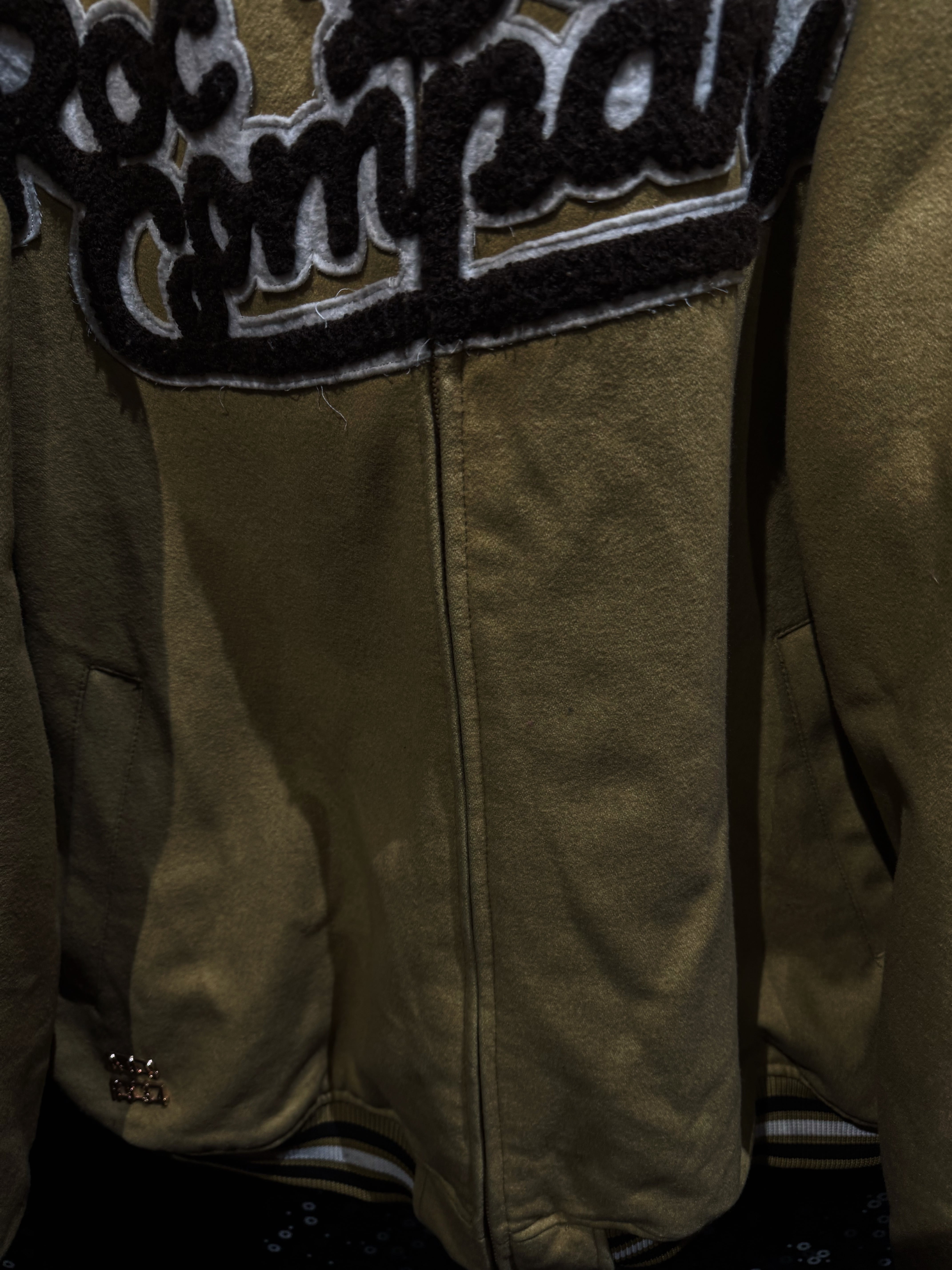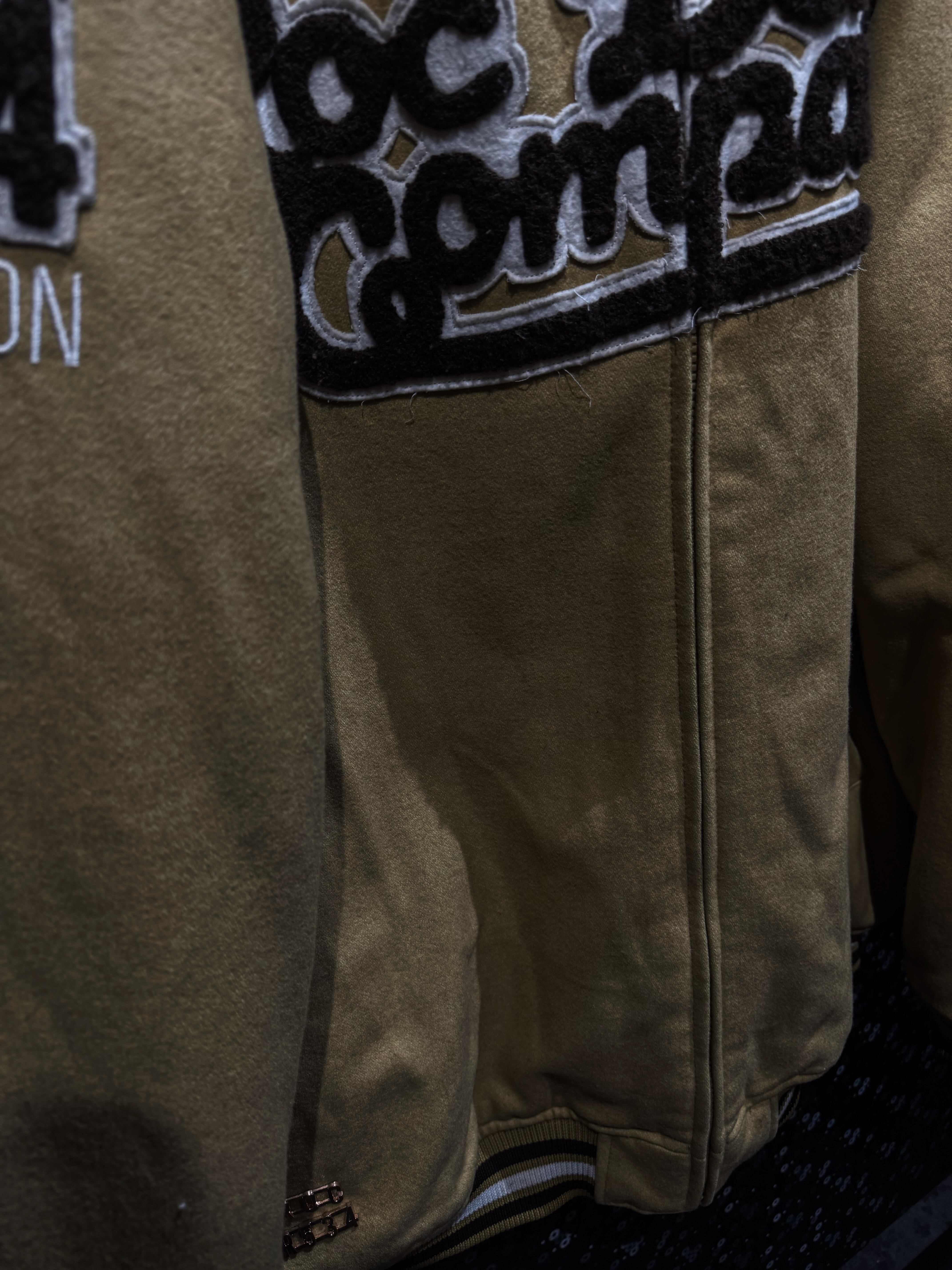 この個体はウールボディのスタジアムタイプ。オリーブ寄りのカーキカラーに、ブラック×ホワイトのサガラ刺繍で入る“Roc Denim Company”アーチロゴ。毛足のある立体ワッペンがしっかり主張する。左袖には“534 DIVISION”ナンバリング。クラシックなカレッジ調の構成だけど、サイズは4XL。ここが最大のポイント。