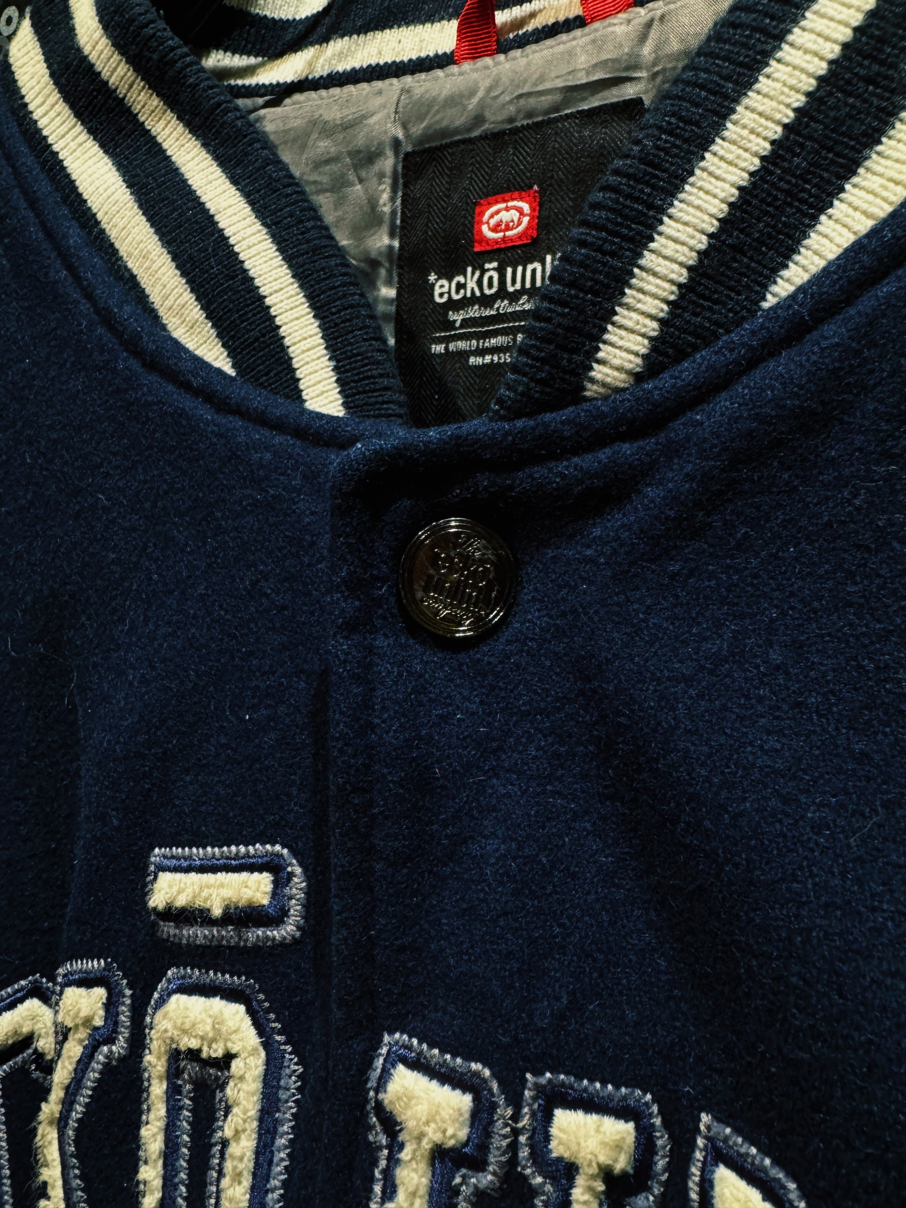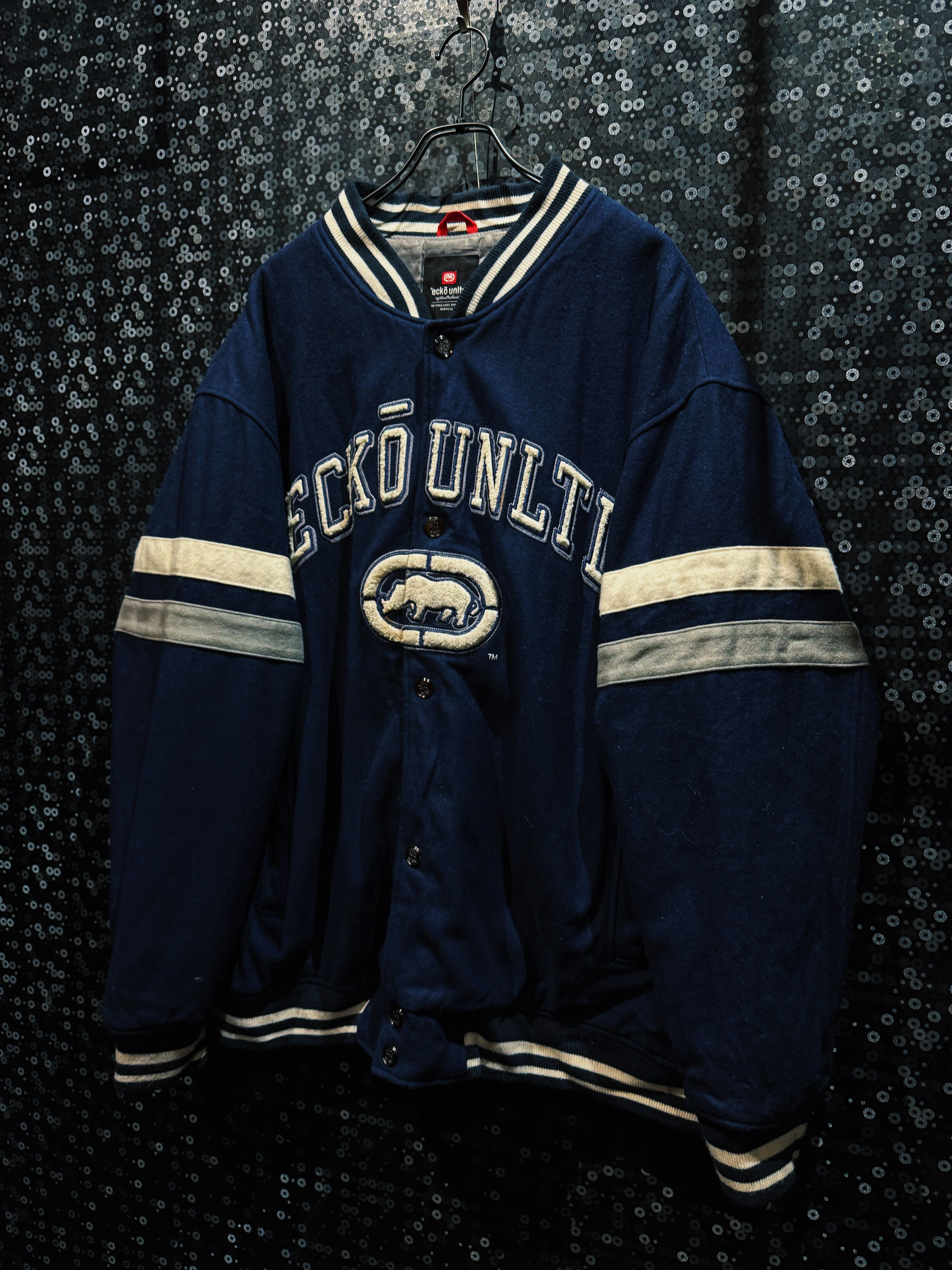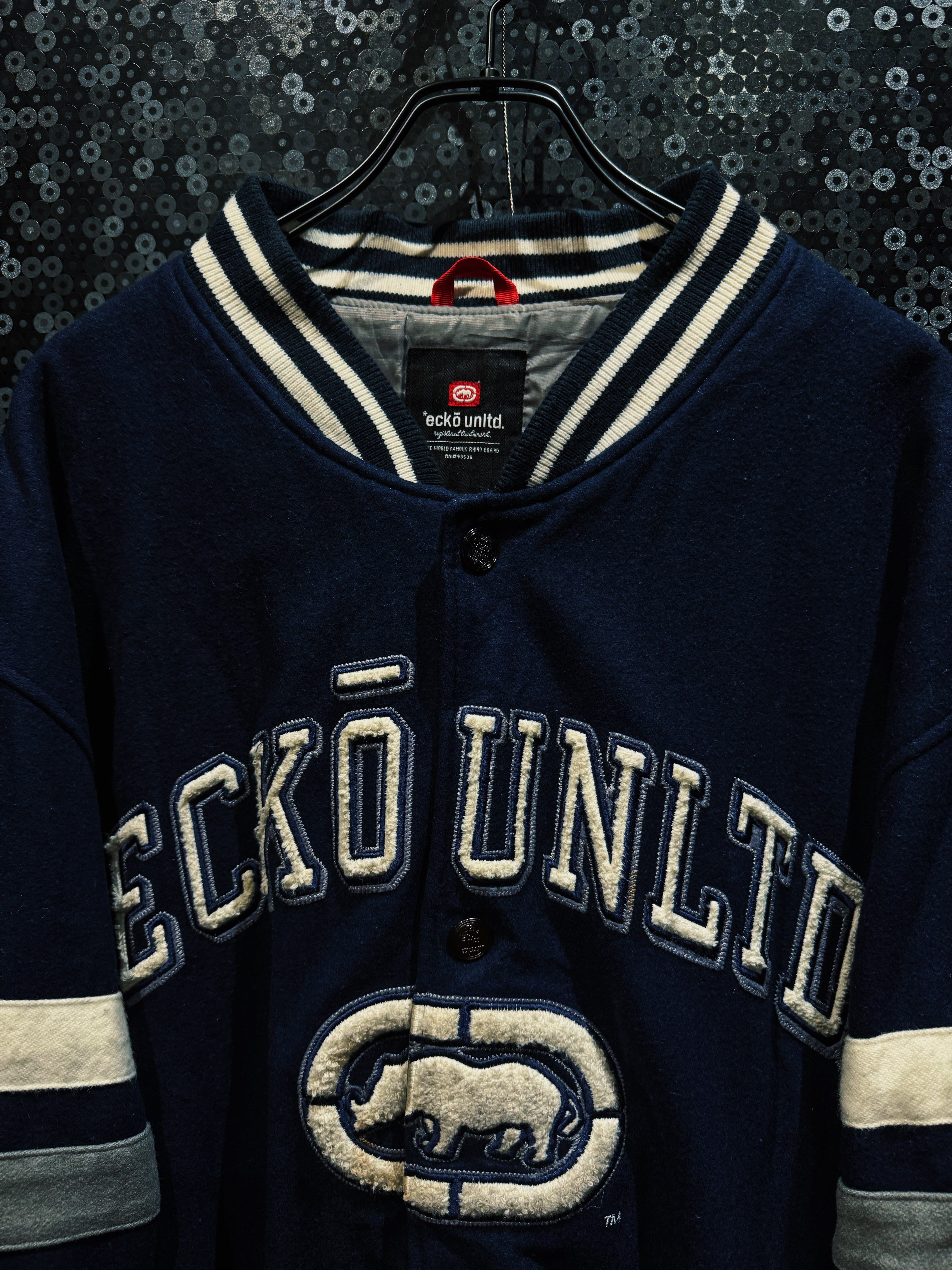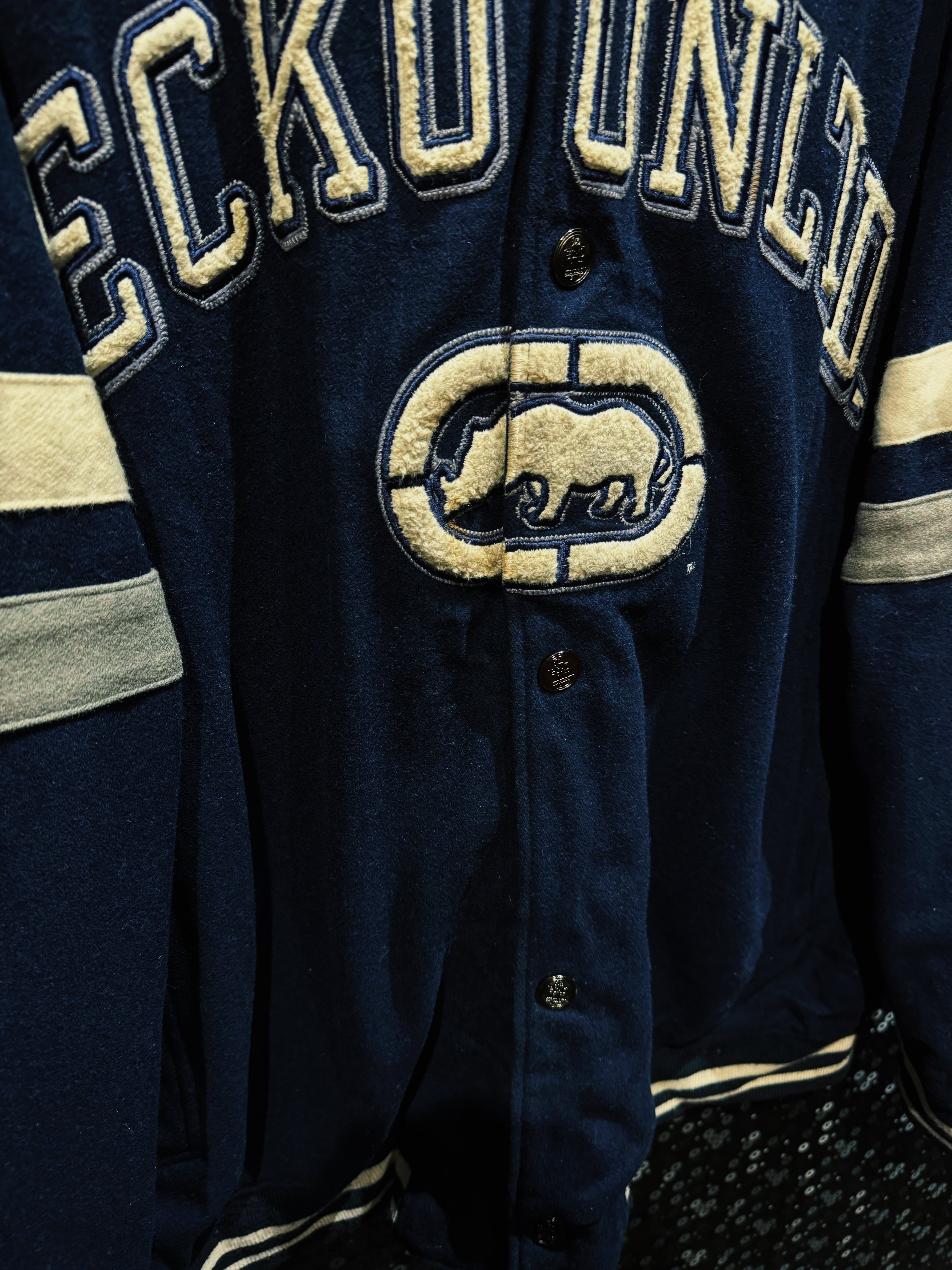 ネイビーウールボディにアイボリーのライン。王道のカレッジ配色に、胸元にはサガラ刺繍の“ECKO UNLTD”アーチロゴ。そして中央にはブランドの象徴、ランニングライノのビッグワッペン。これぞECKŌのど真ん中。