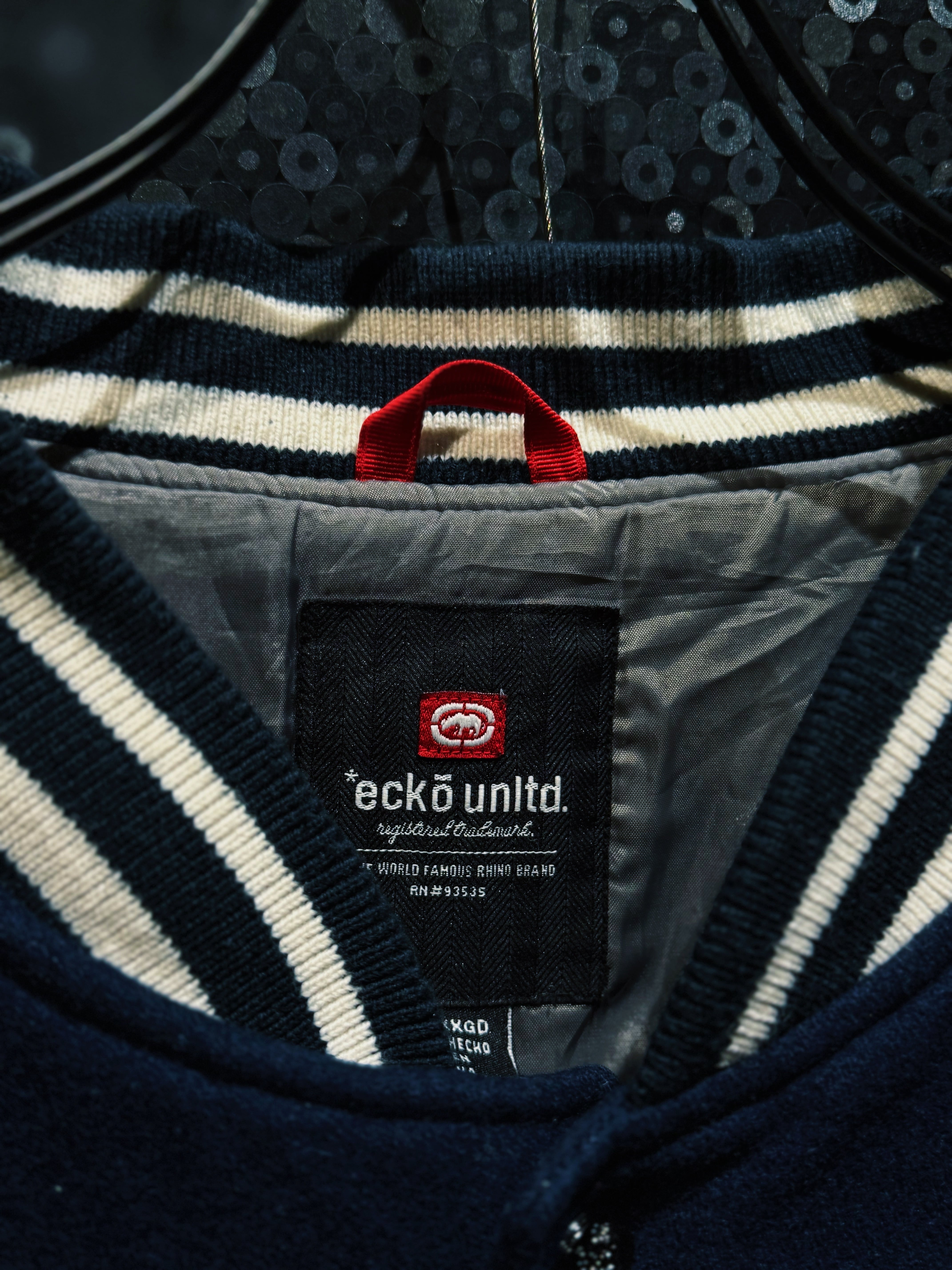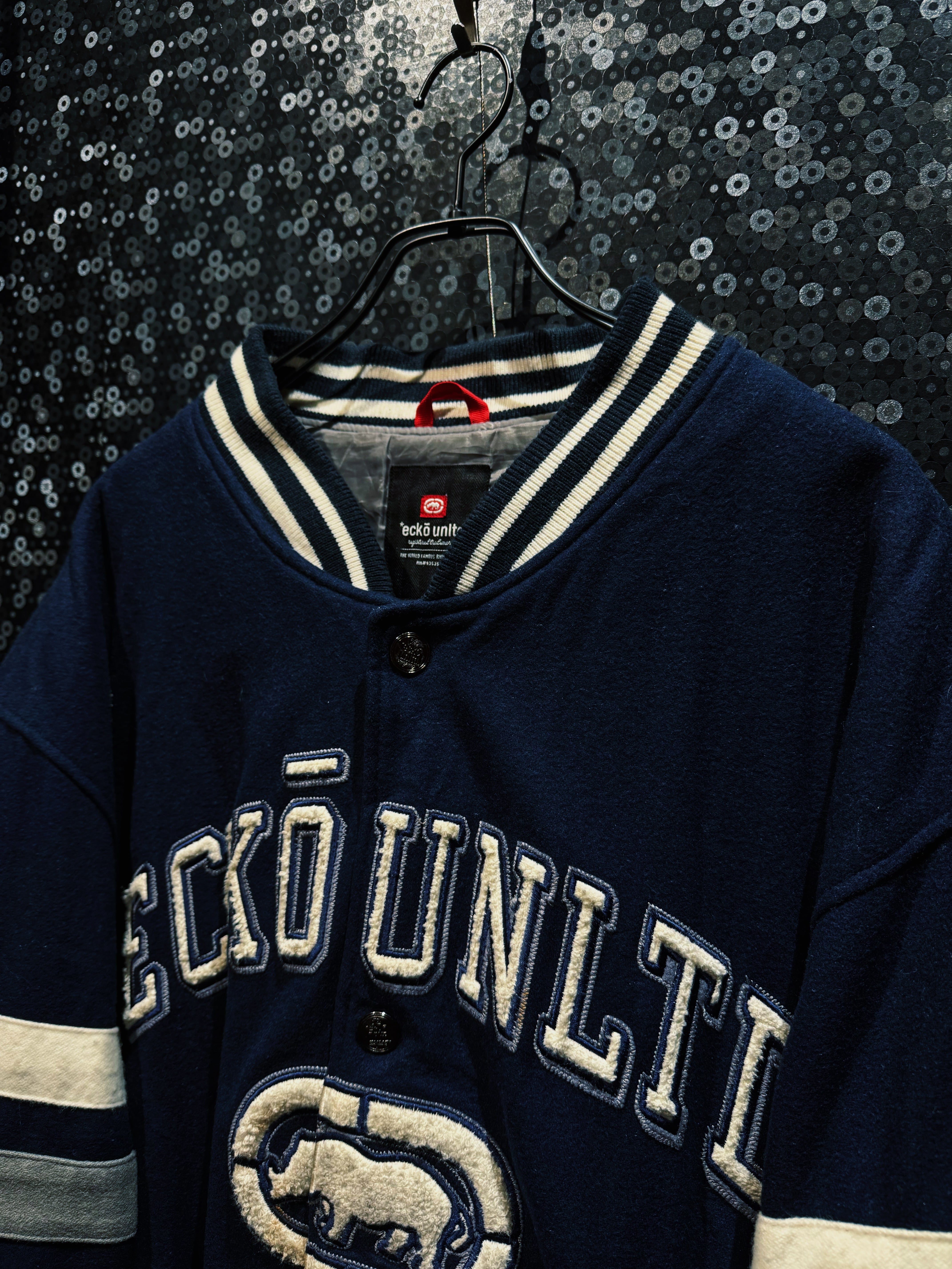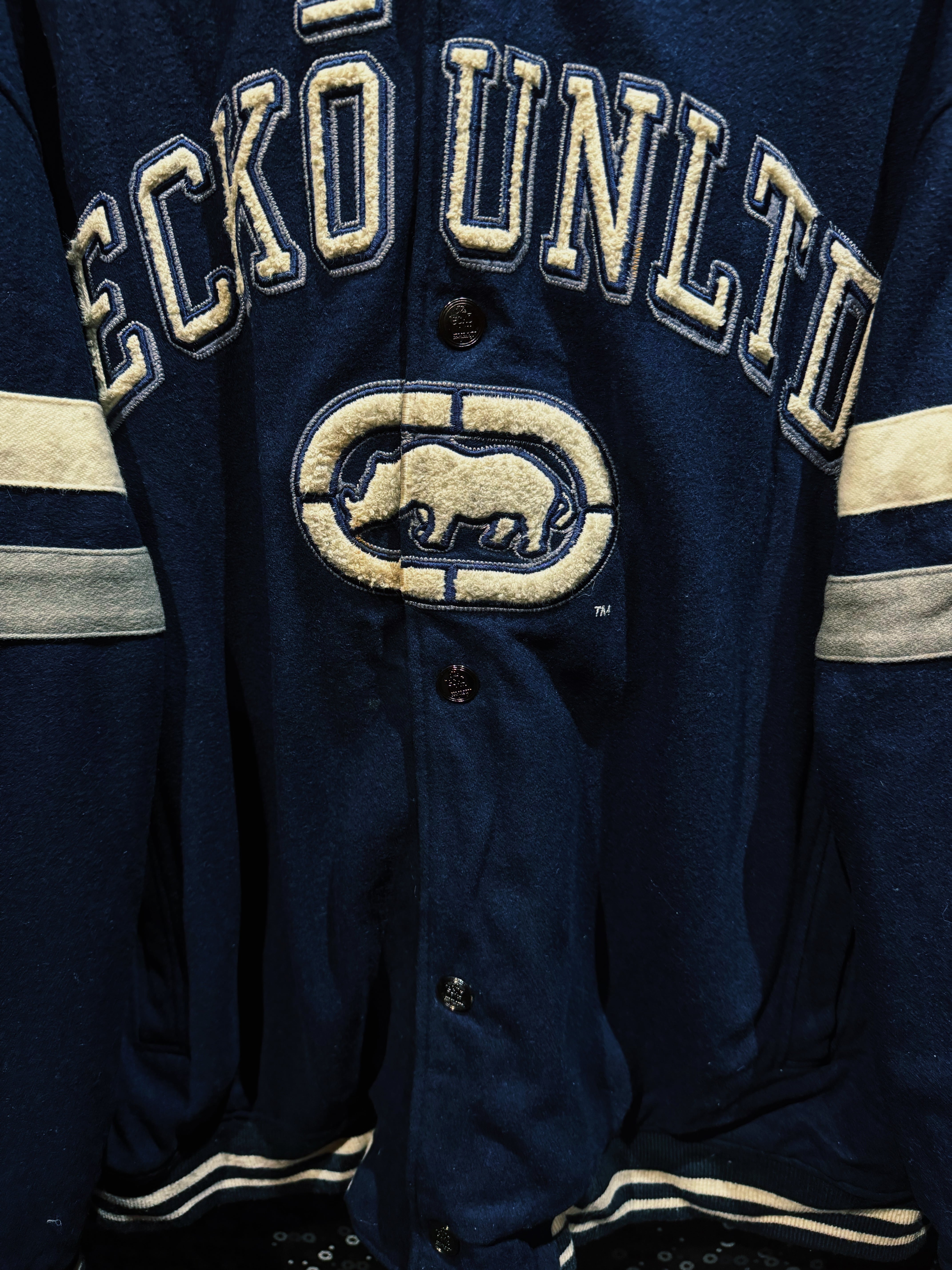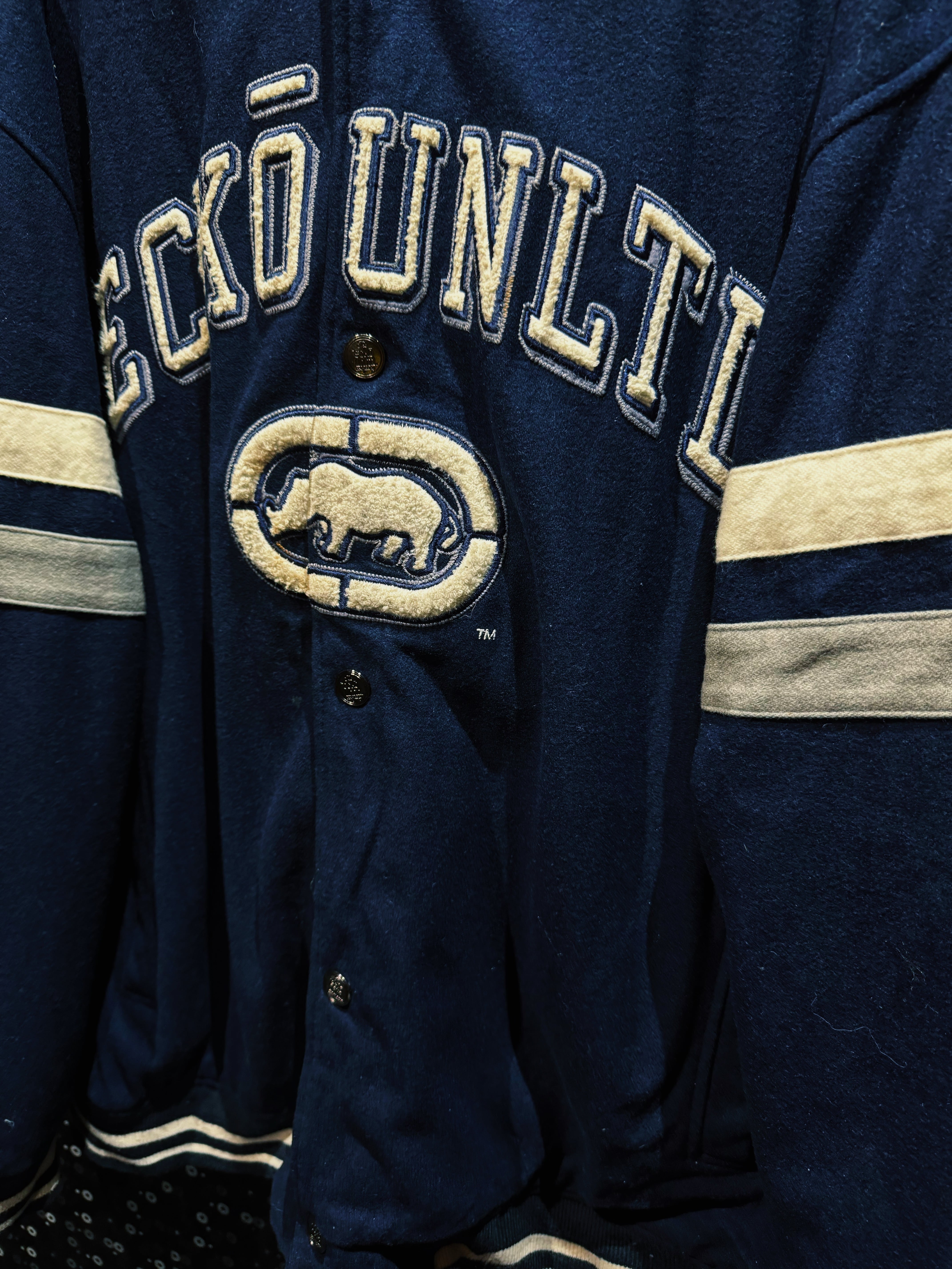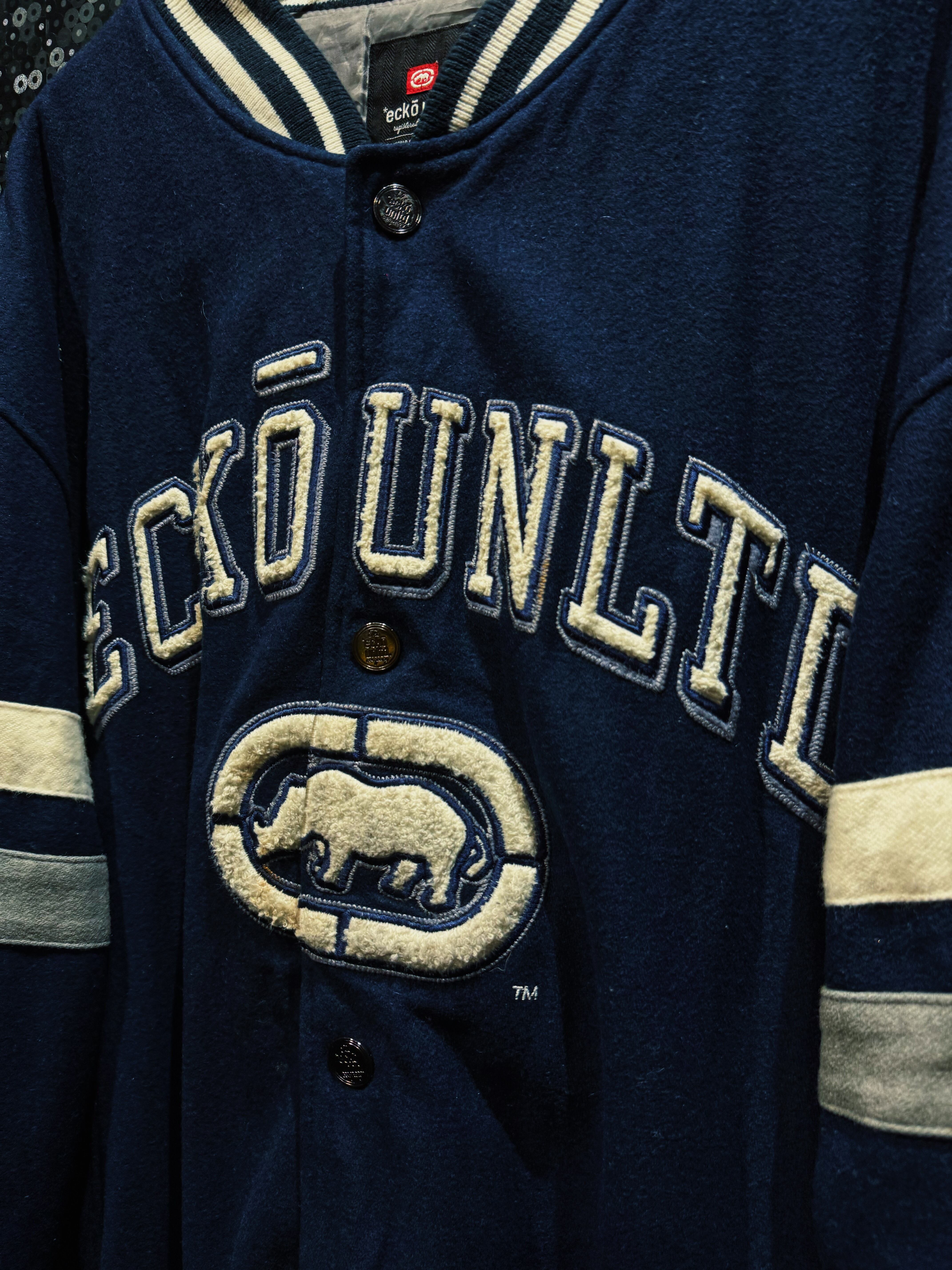 ネイビーウールボディにアイボリーのライン。王道のカレッジ配色に、胸元にはサガラ刺繍の“ECKO UNLTD”アーチロゴ。そして中央にはブランドの象徴、ランニングライノのビッグワッペン。これぞECKŌのど真ん中。