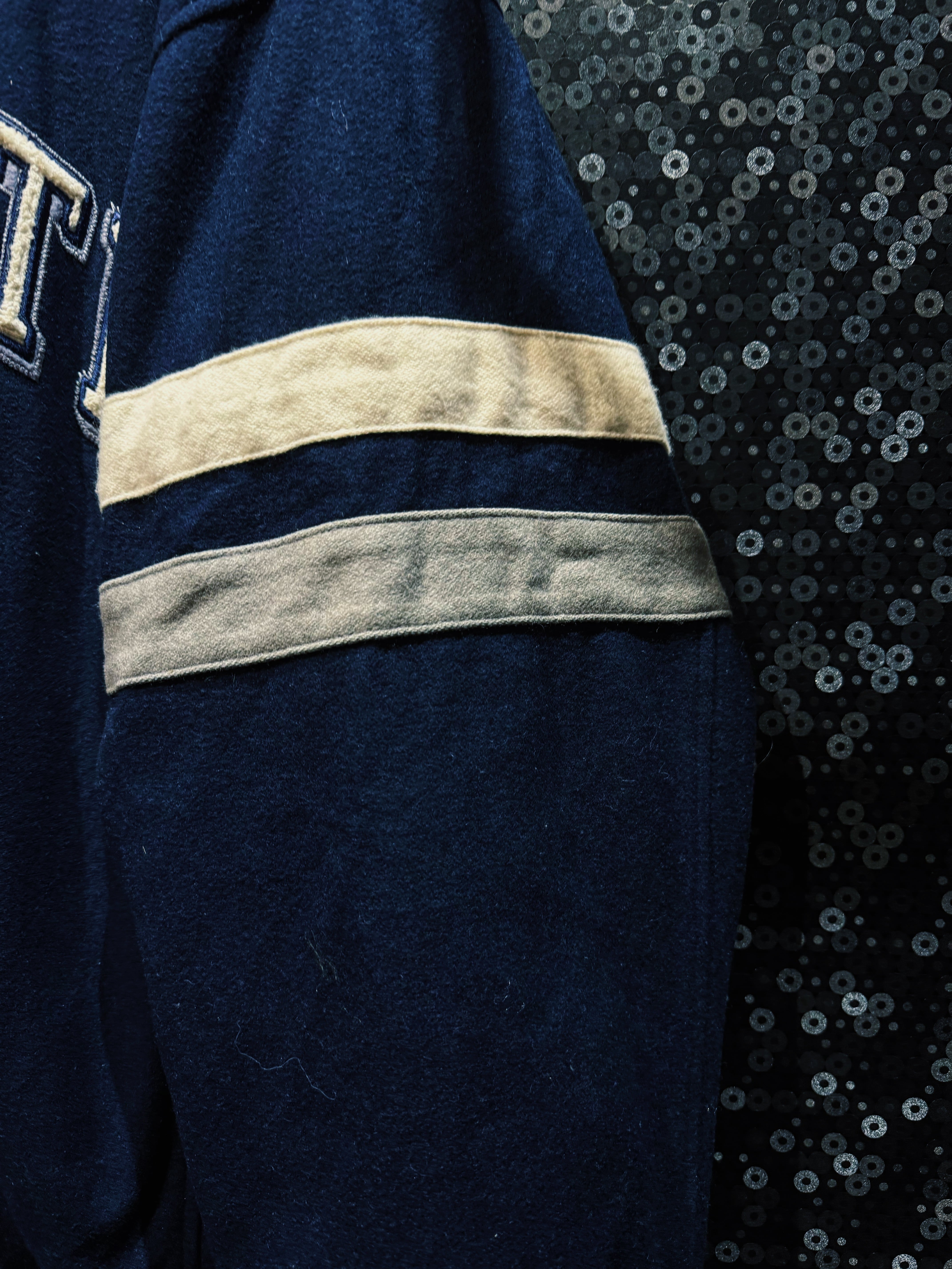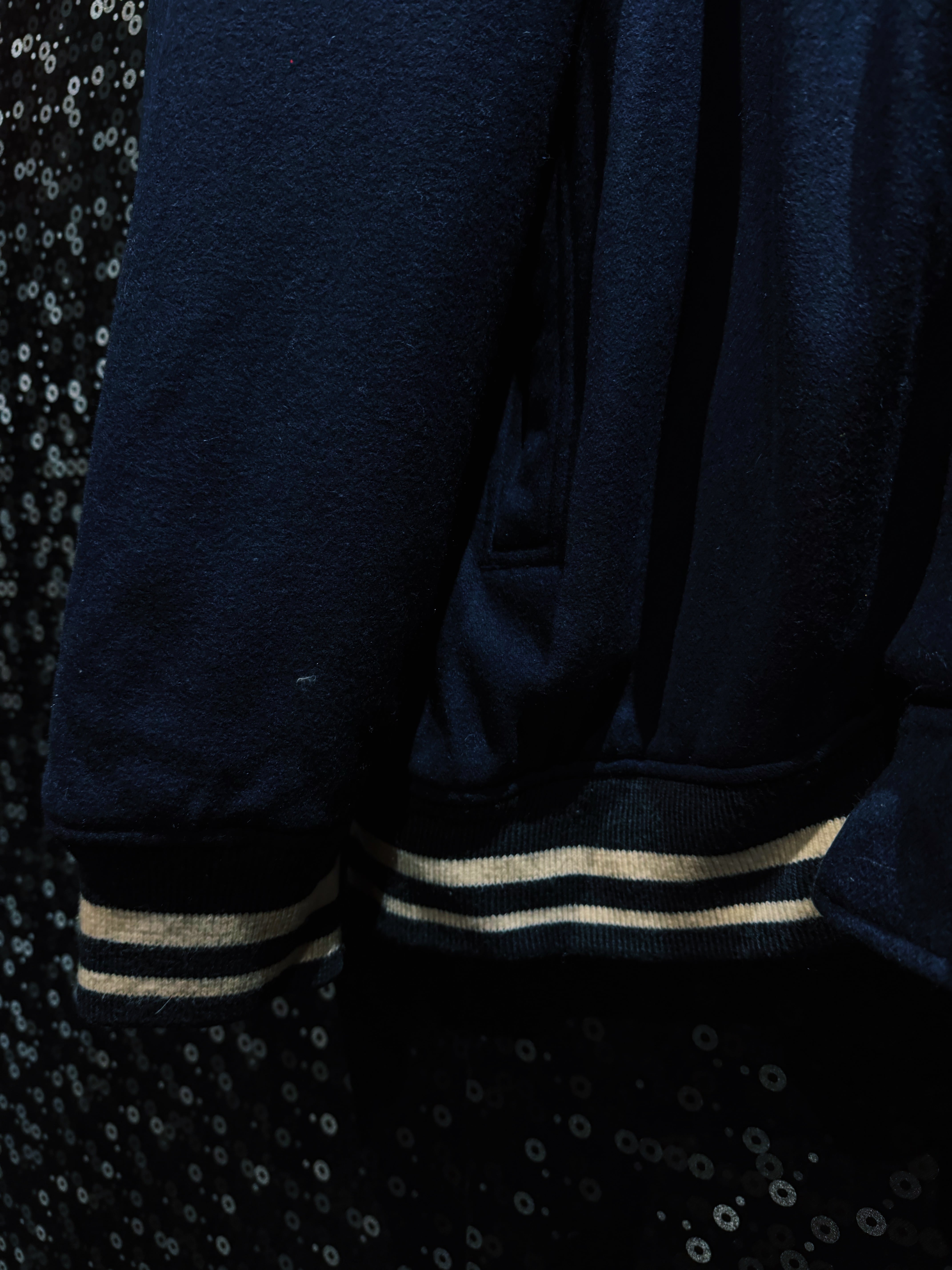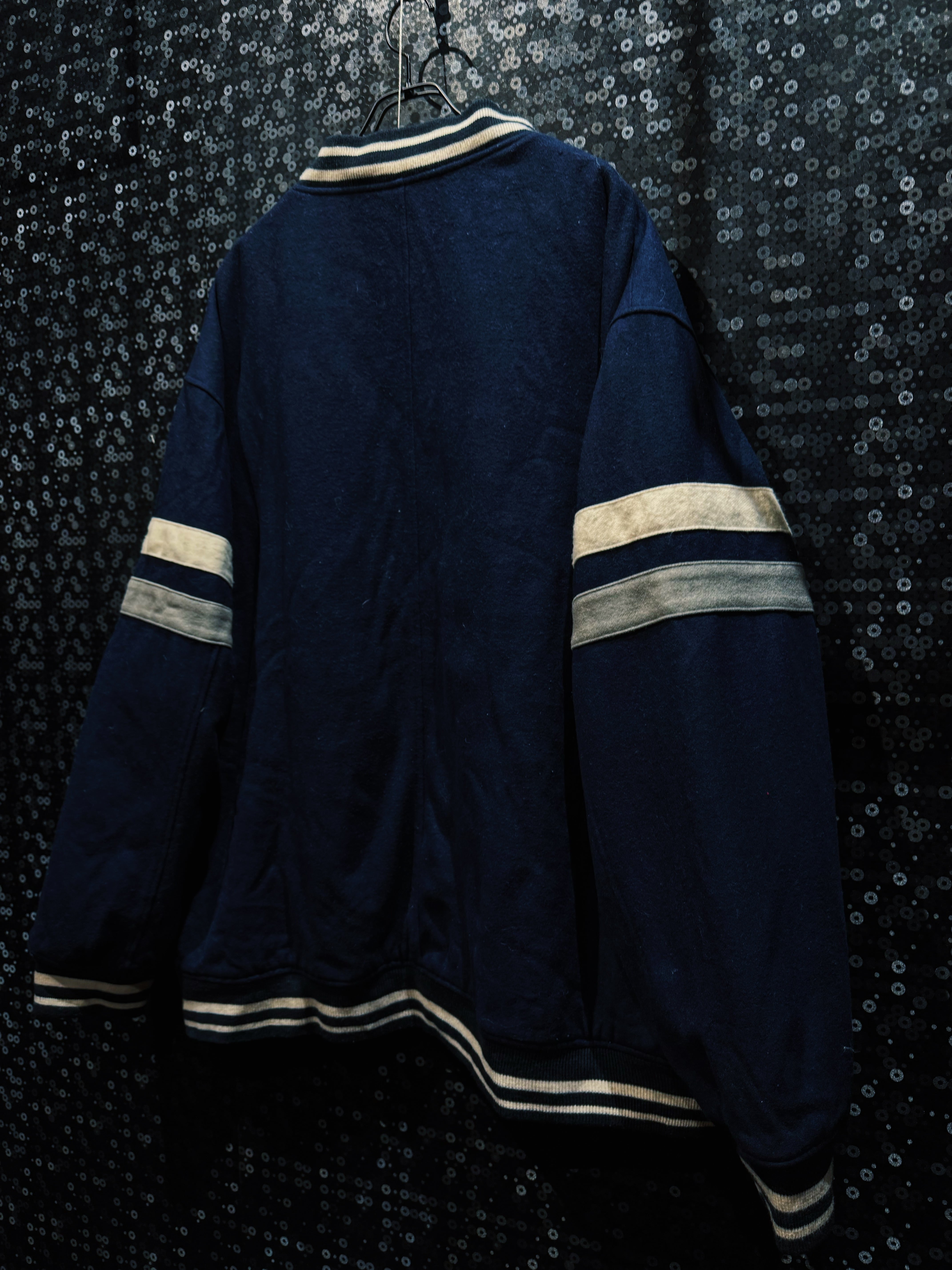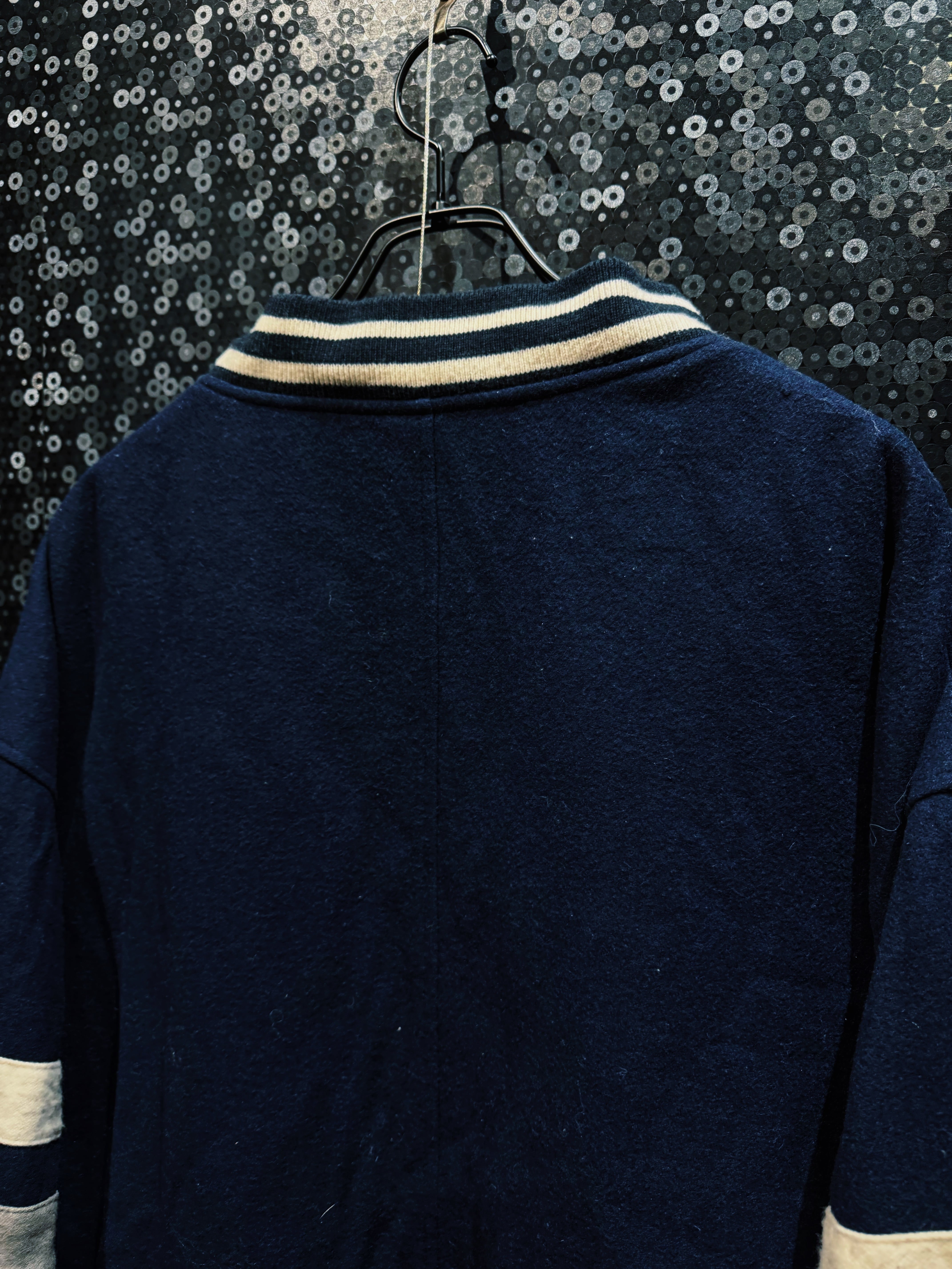 この個体はレザー切替ではなくウール主体のスタジアムタイプ。だからこそ着やすい。重すぎず、でもしっかり肉厚。サガラ刺繍の立体感がしっかり主張するから、シンプルなのに物足りなさがない。