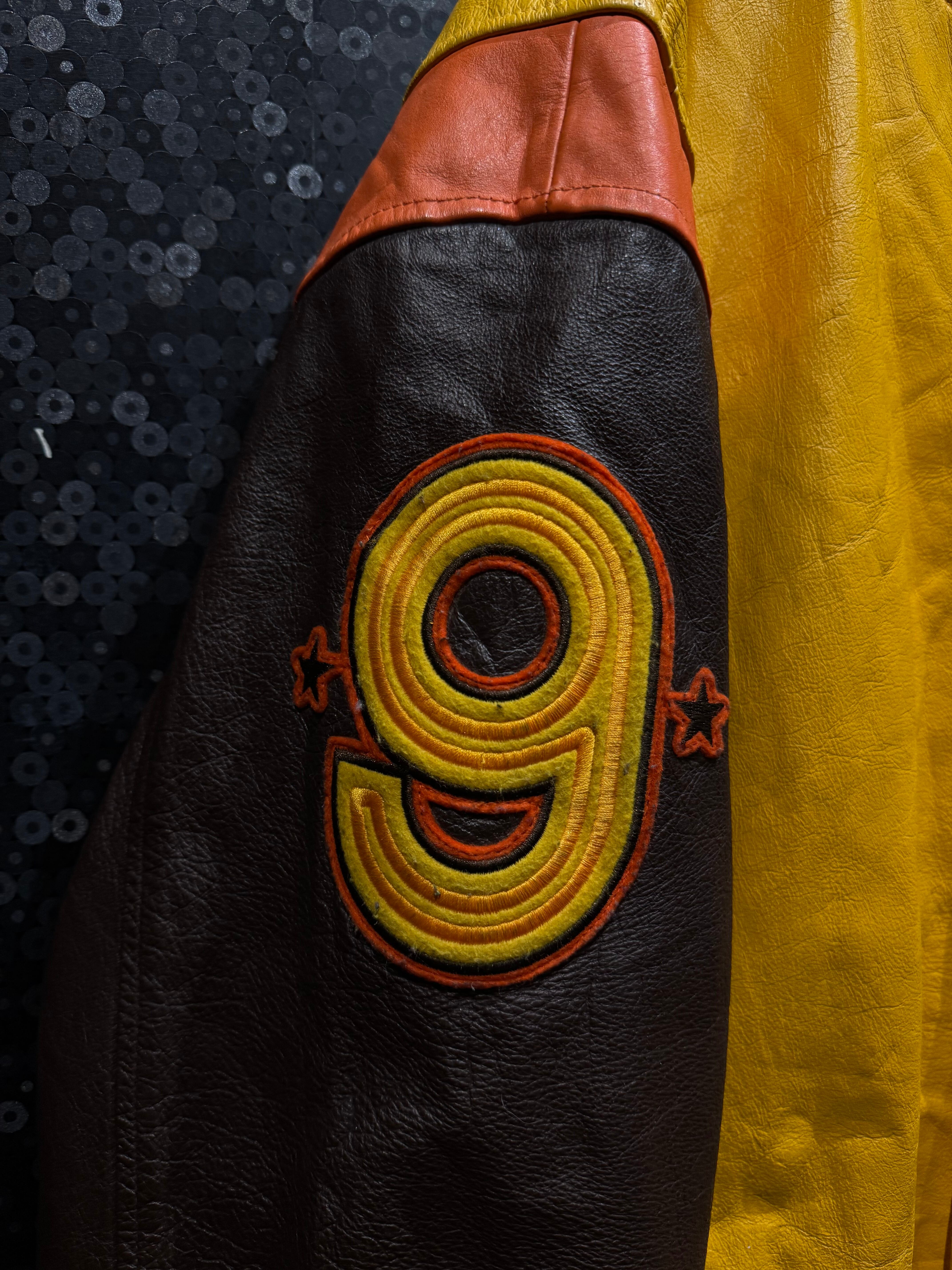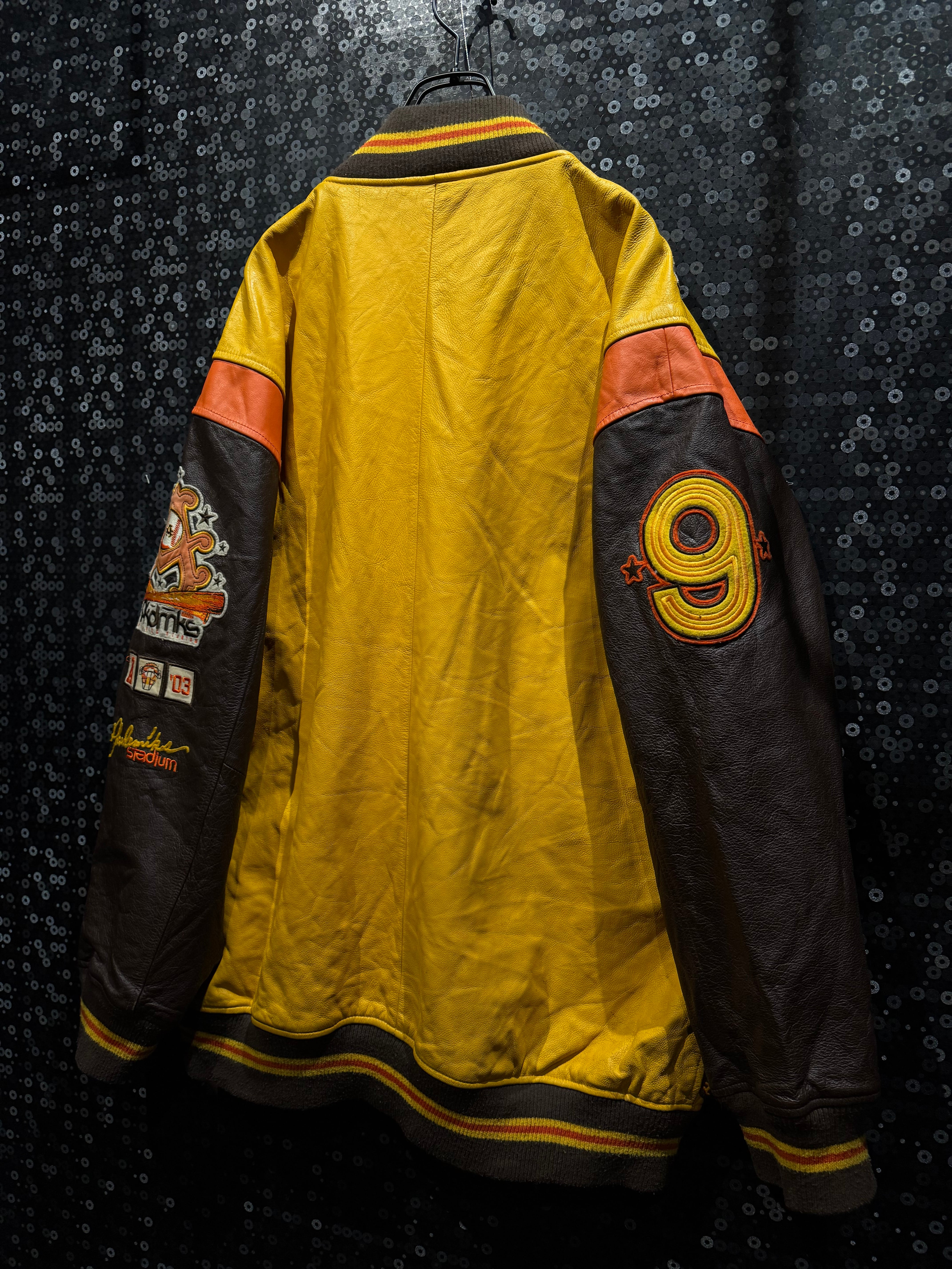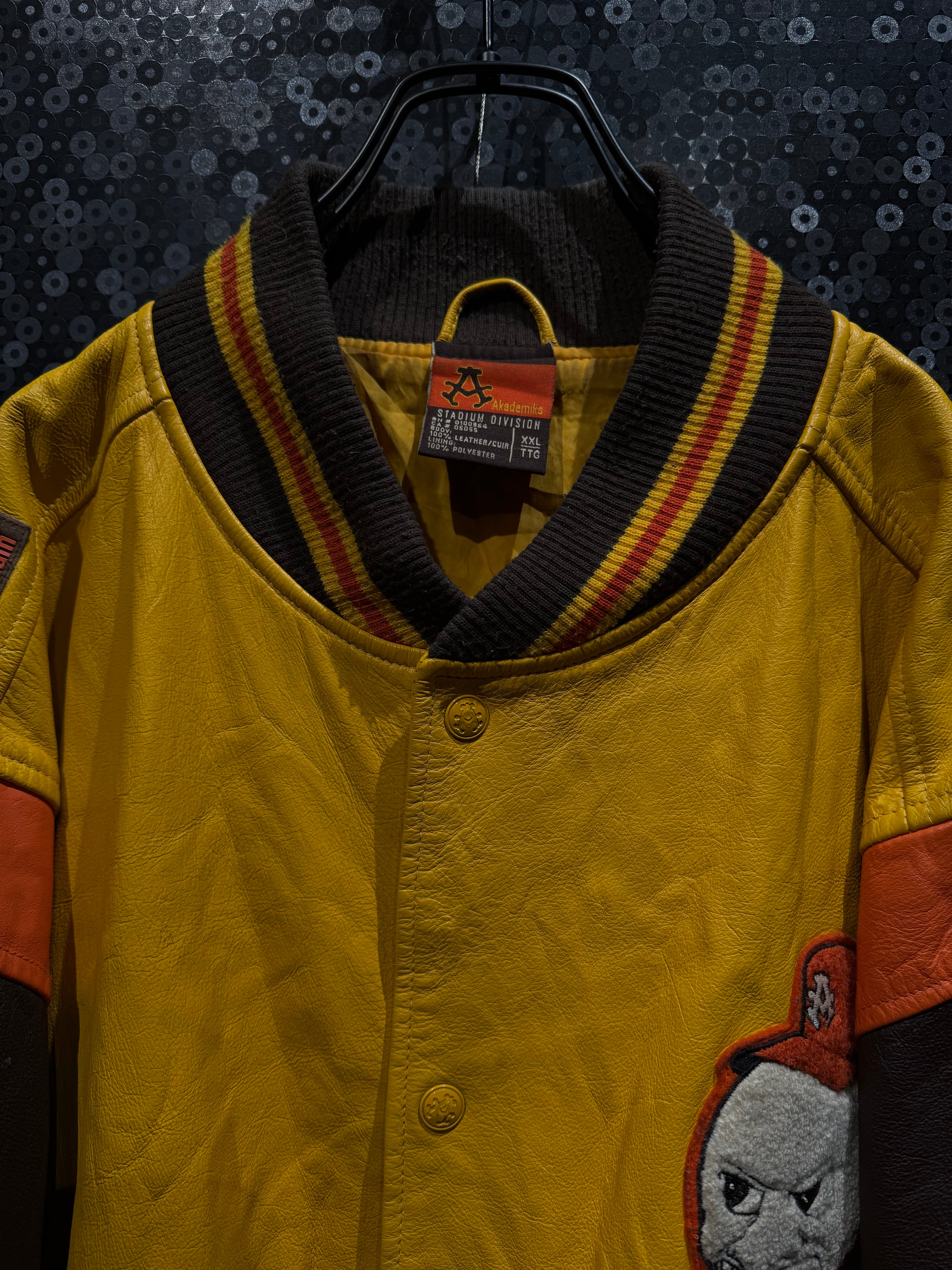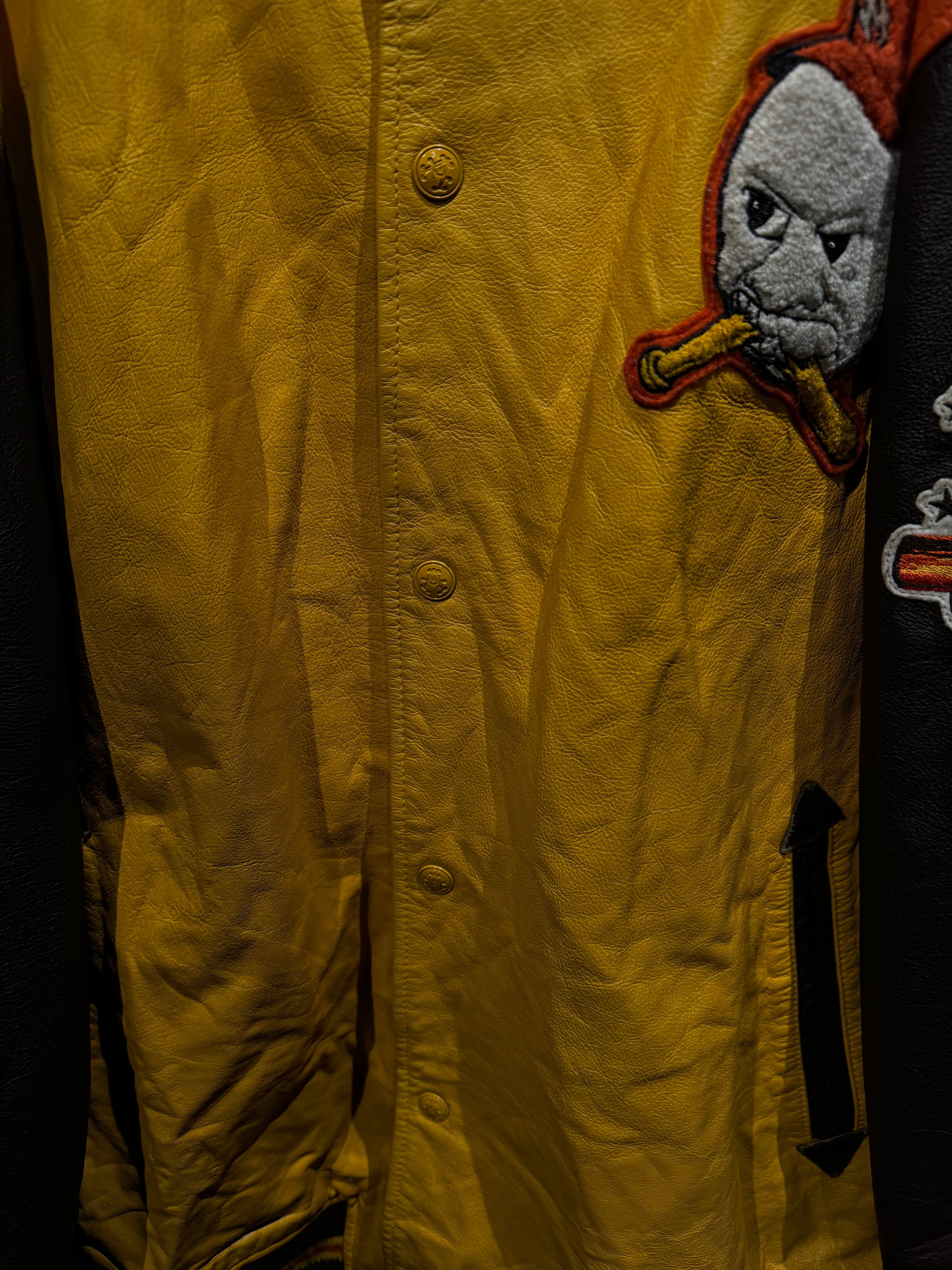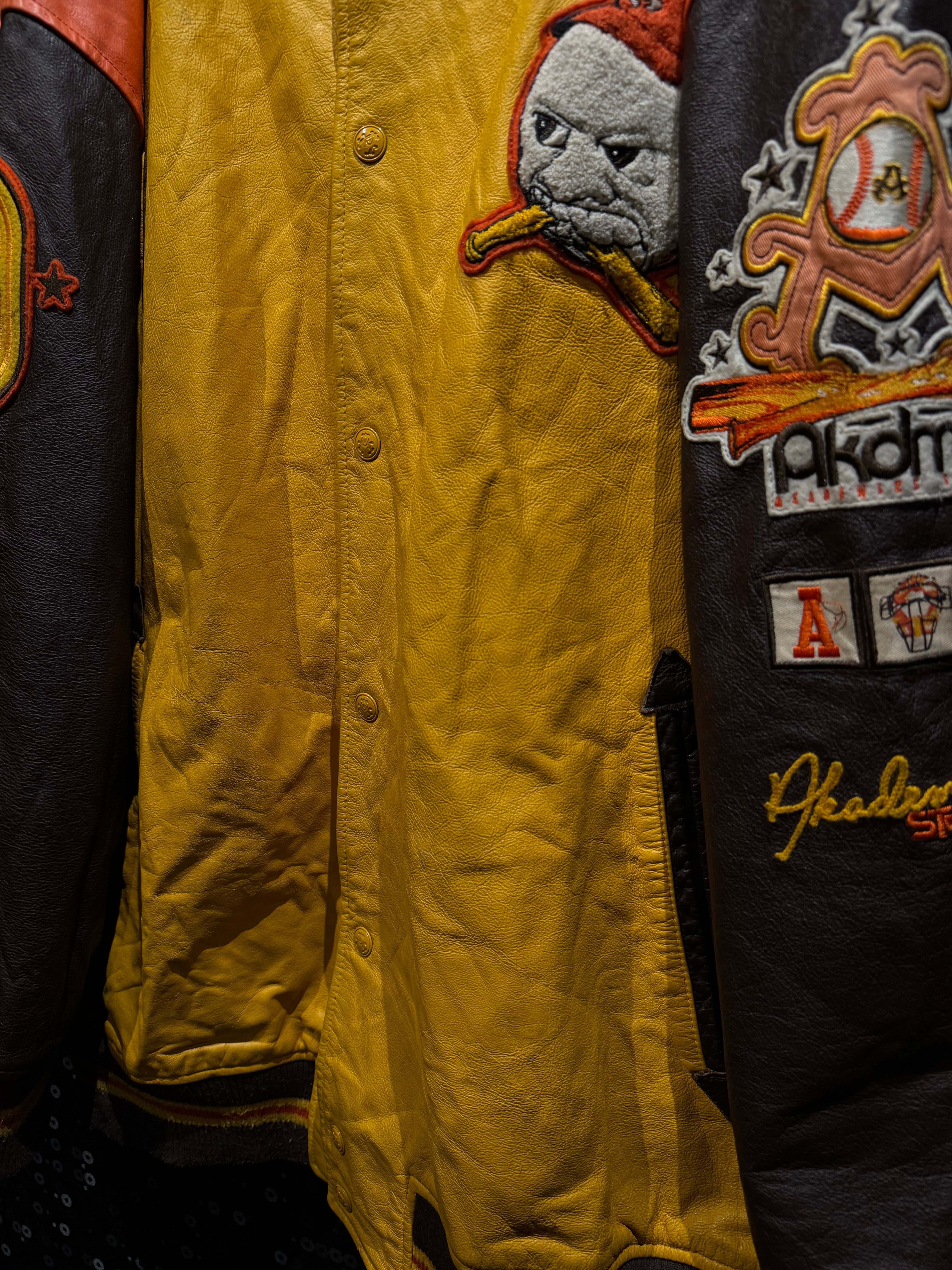 この個体は“STADIUM DIVISION”ライン。ボディは100%レザー仕様。イエローを基調に、ブラックレザーアーム、オレンジの切替。袖の“9”ナンバリングは立体的なサガラワッペン仕様。もう片袖には巨大なAKADEMIKSロゴパッチ。さらにフロントにはシガーを咥えたキャラクター刺繍。完全に00sヒップホップの空気を纏っている。