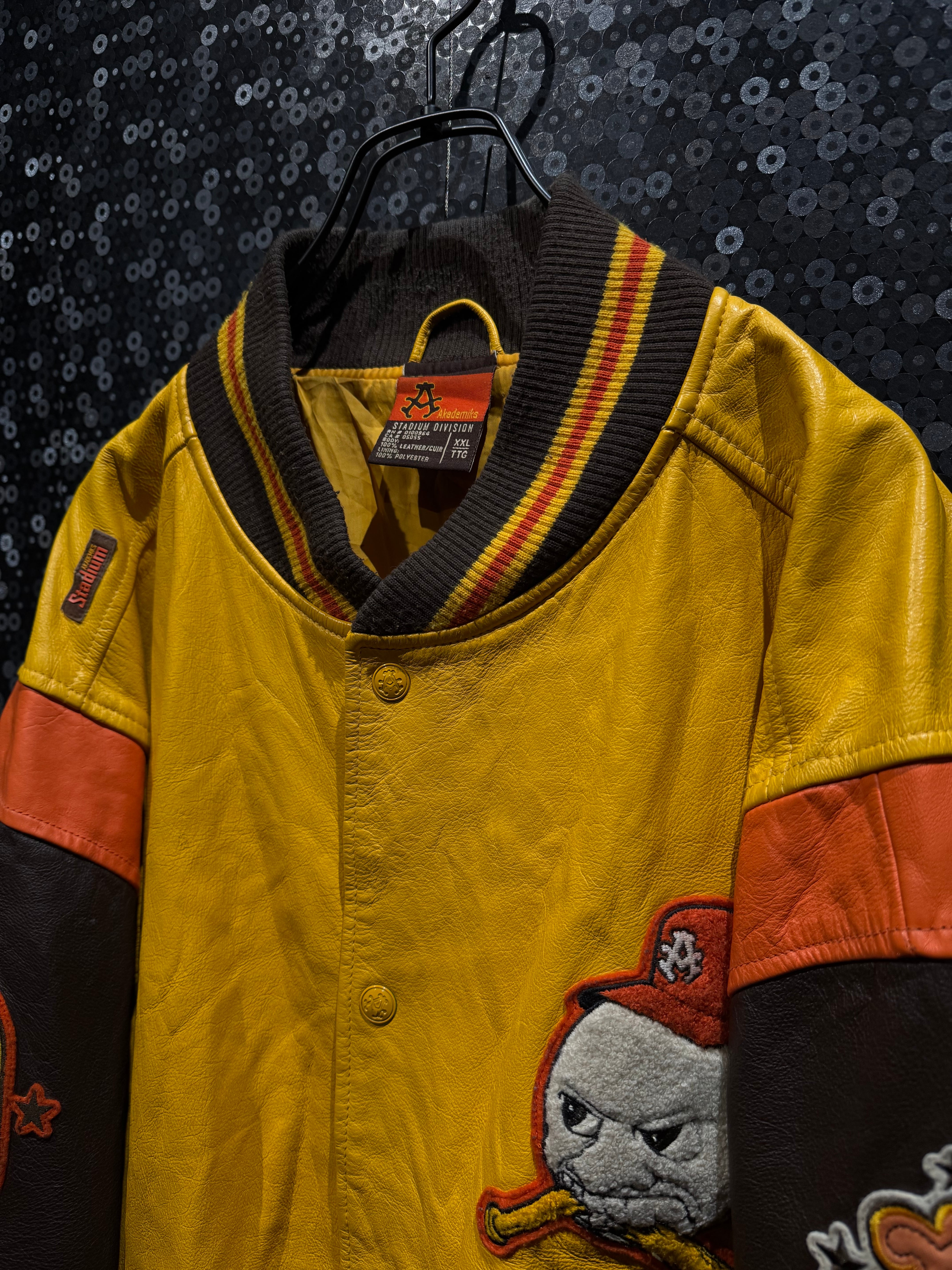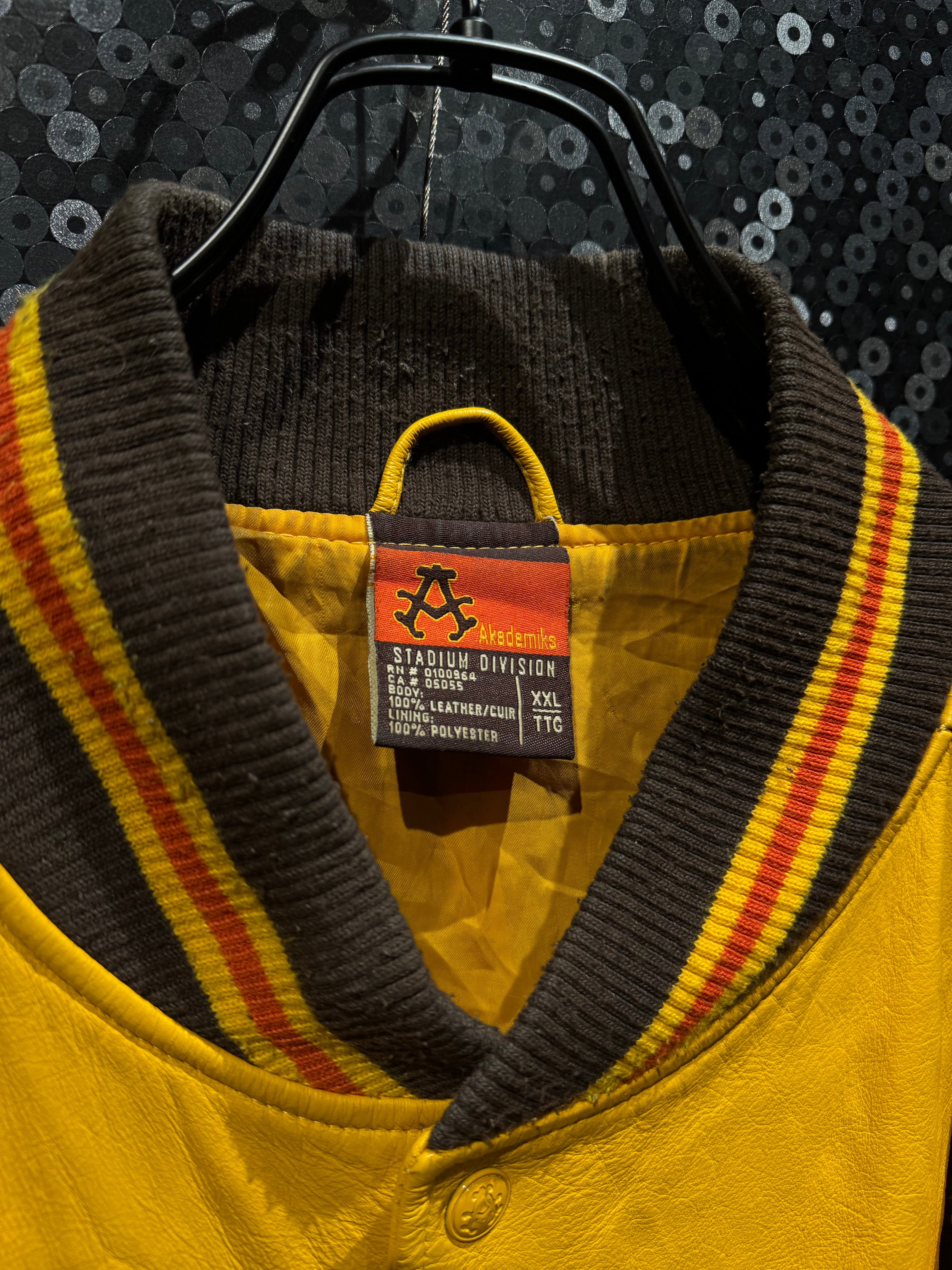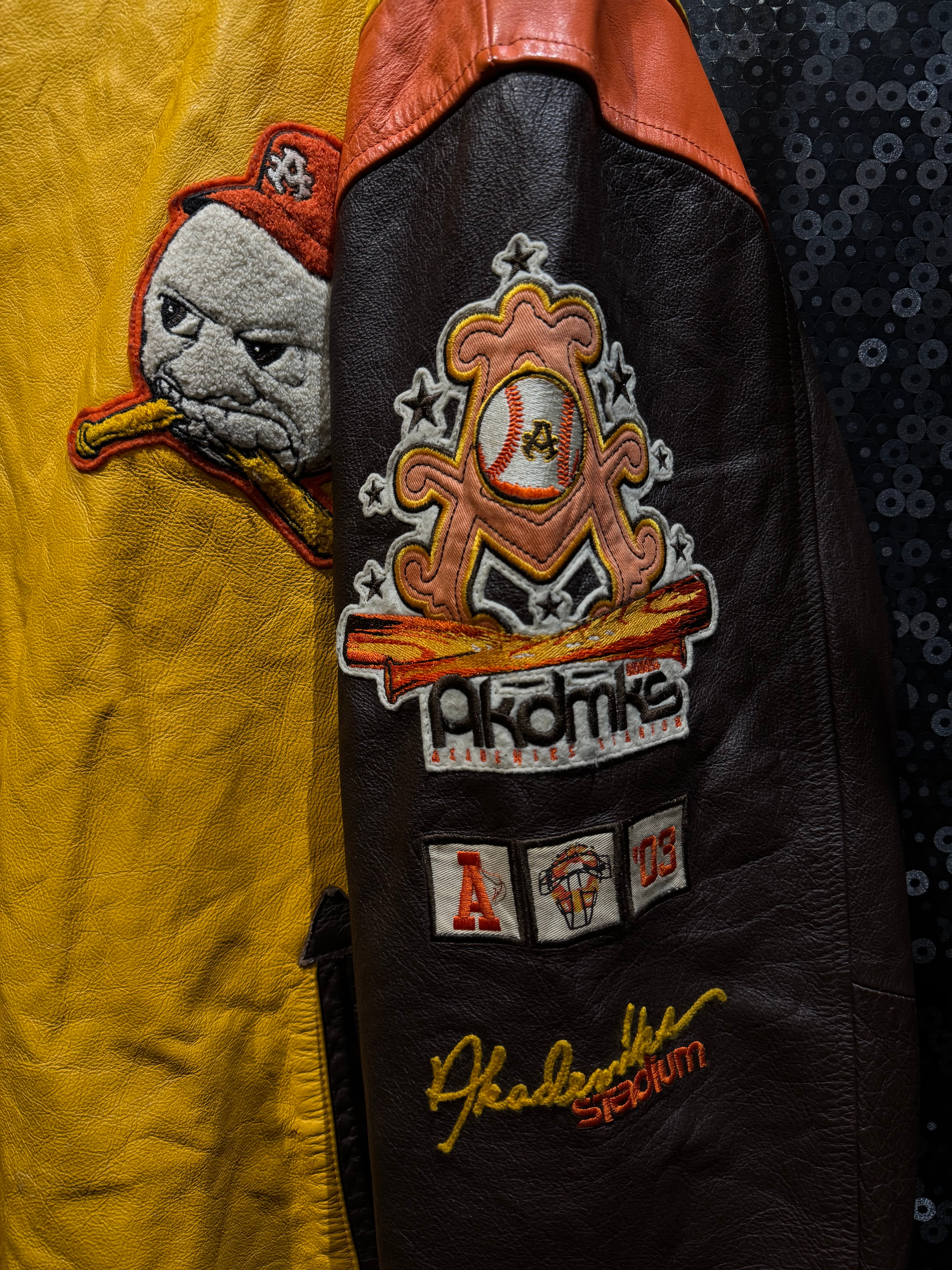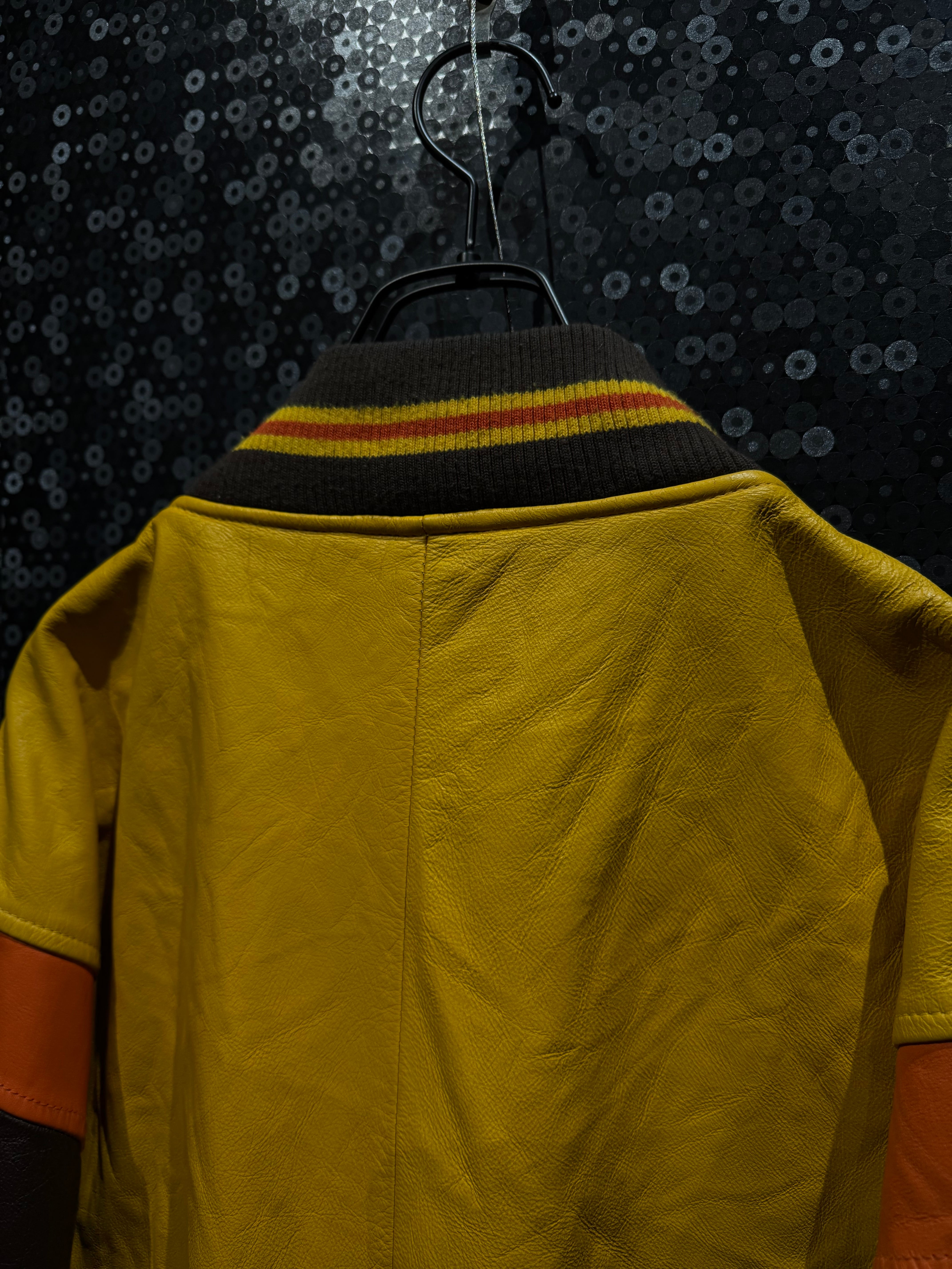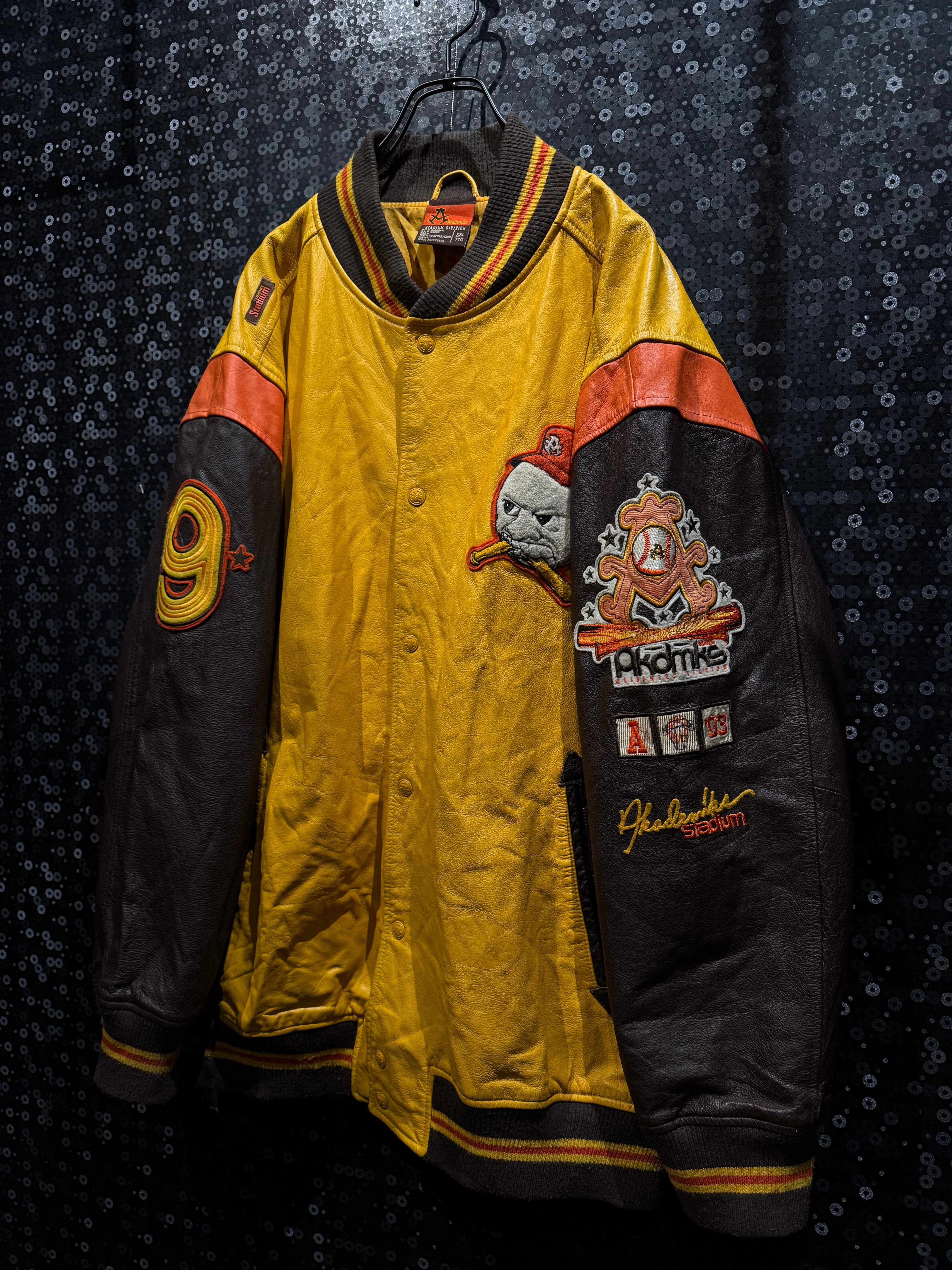 この個体は“STADIUM DIVISION”ライン。ボディは100%レザー仕様。イエローを基調に、ブラックレザーアーム、オレンジの切替。袖の“9”ナンバリングは立体的なサガラワッペン仕様。もう片袖には巨大なAKADEMIKSロゴパッチ。さらにフロントにはシガーを咥えたキャラクター刺繍。完全に00sヒップホップの空気を纏っている。