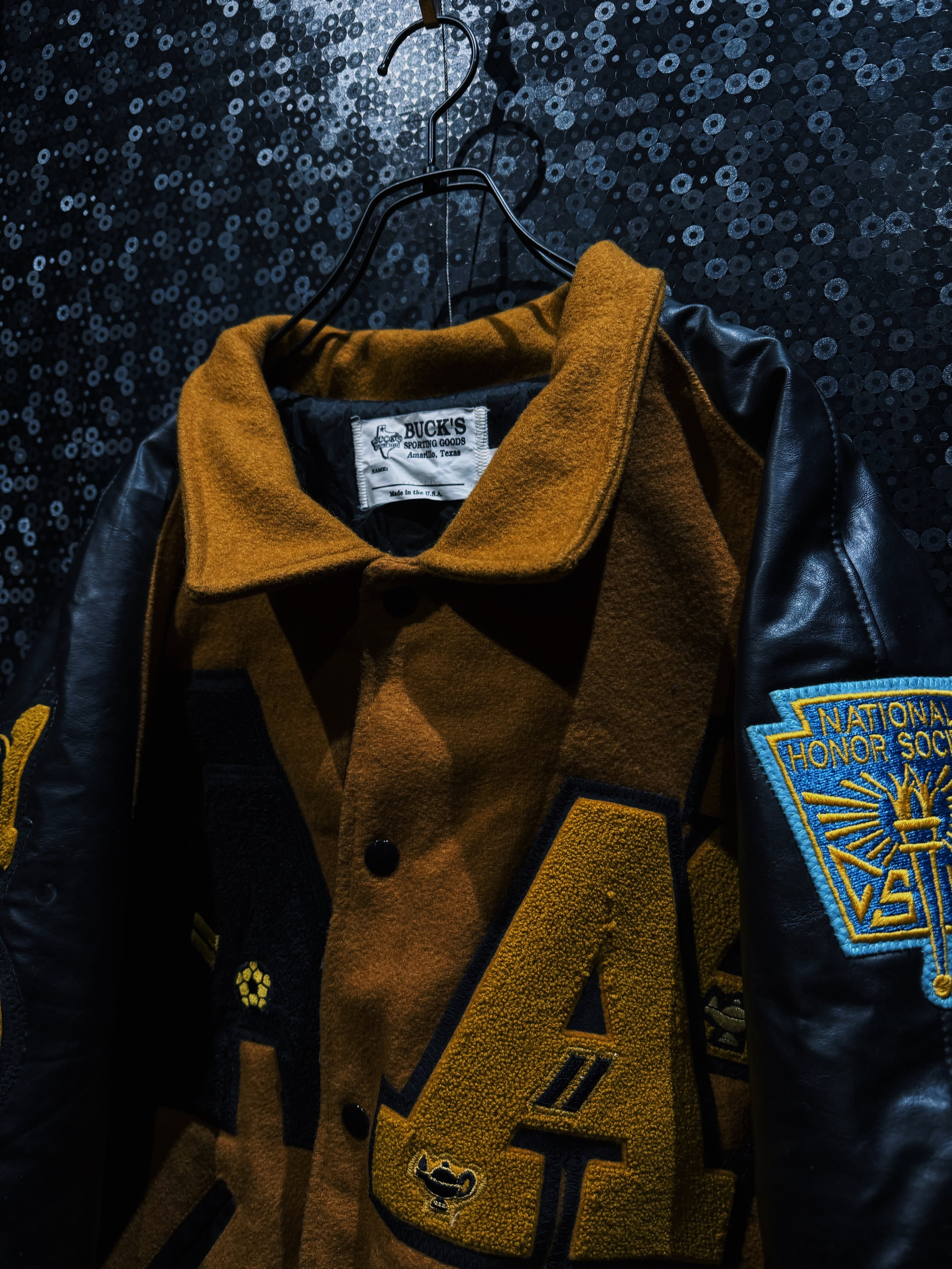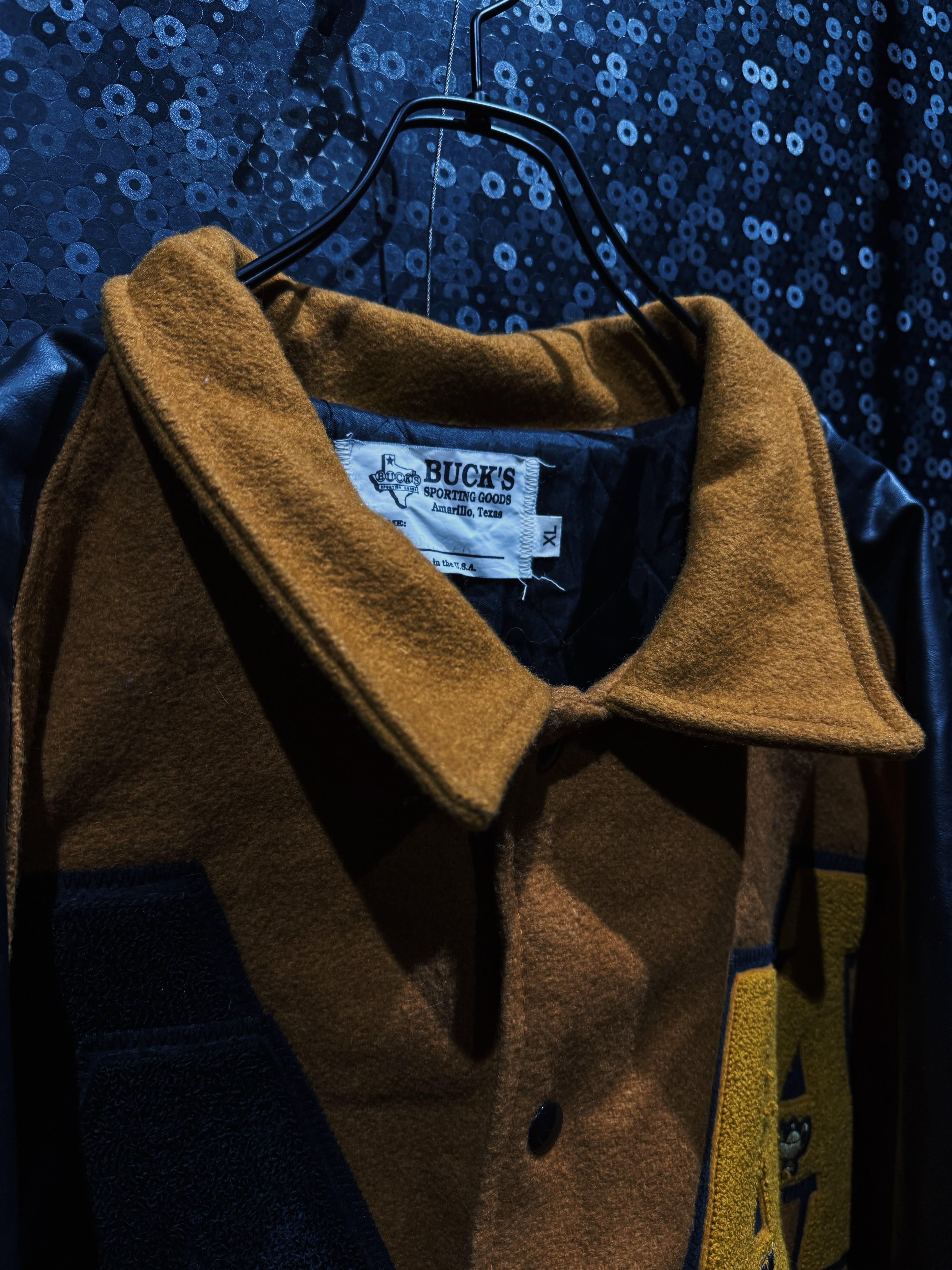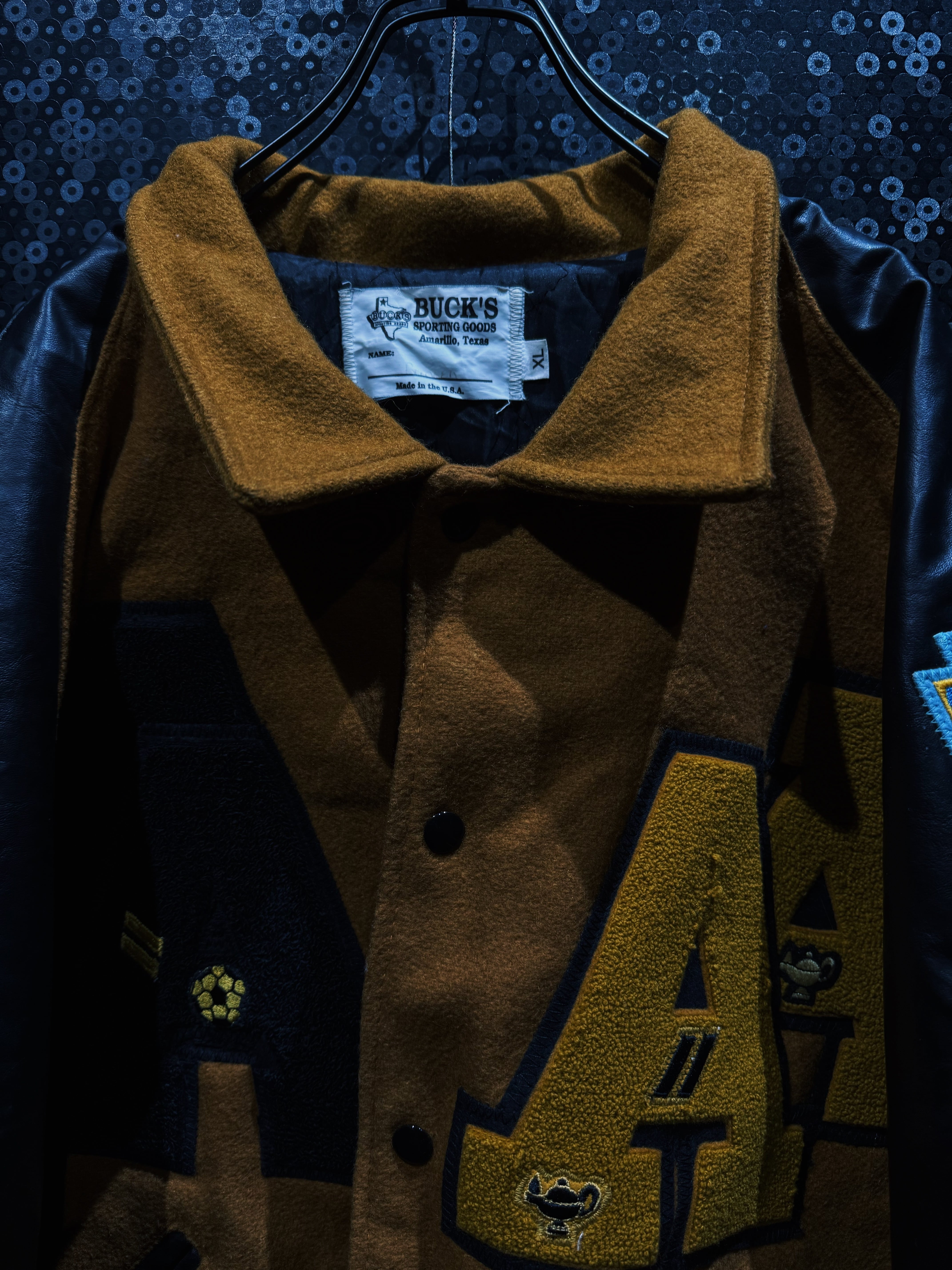 テキサス・アマリロ発、BUCK’S Sporting GoodsのUSA製スタジャン。ブラウン寄りのマスタードウールボディにブラックレザーアーム。この配色だけでまず格がある。派手じゃないのに一瞬で目に入る強さがある。