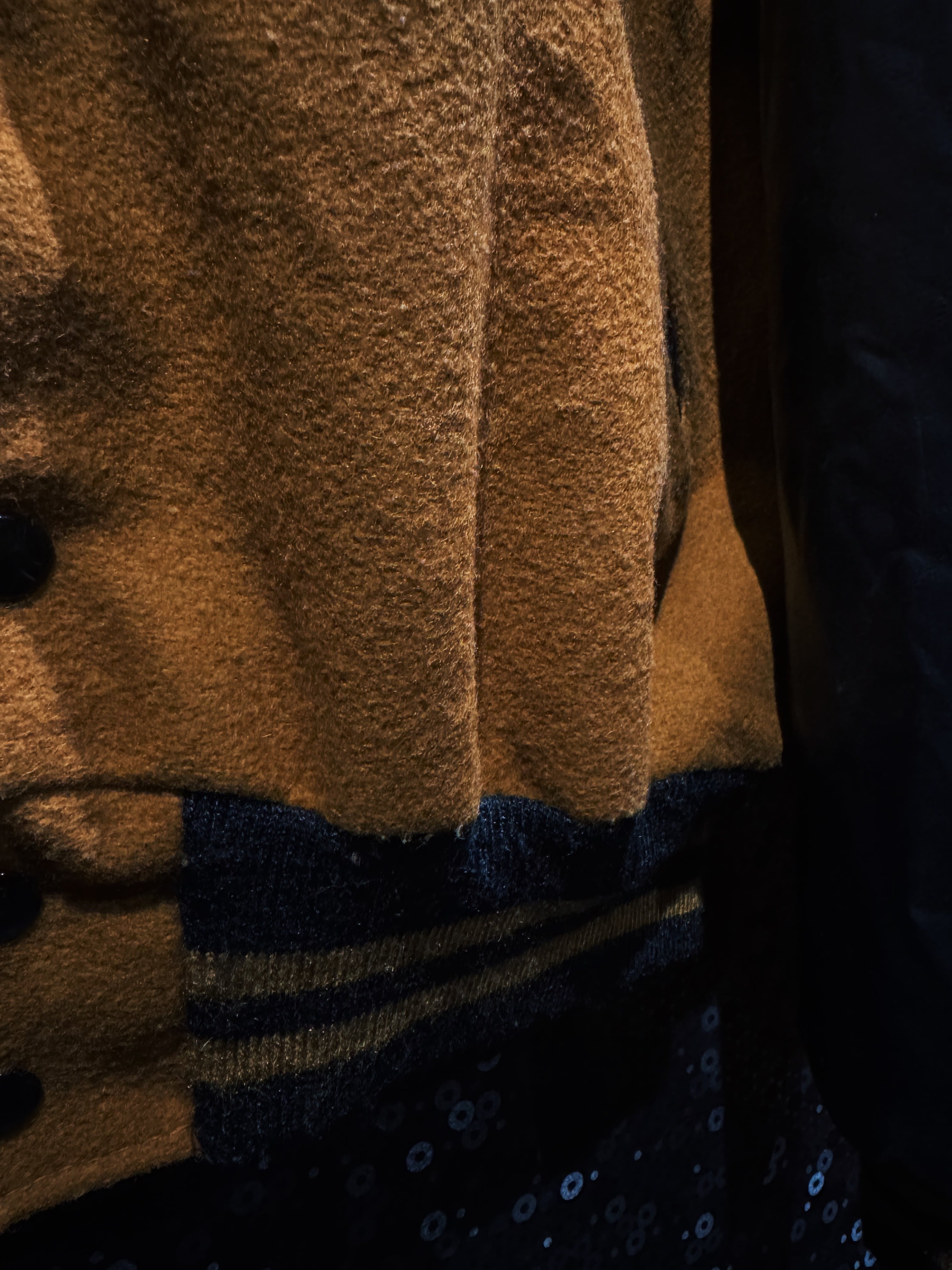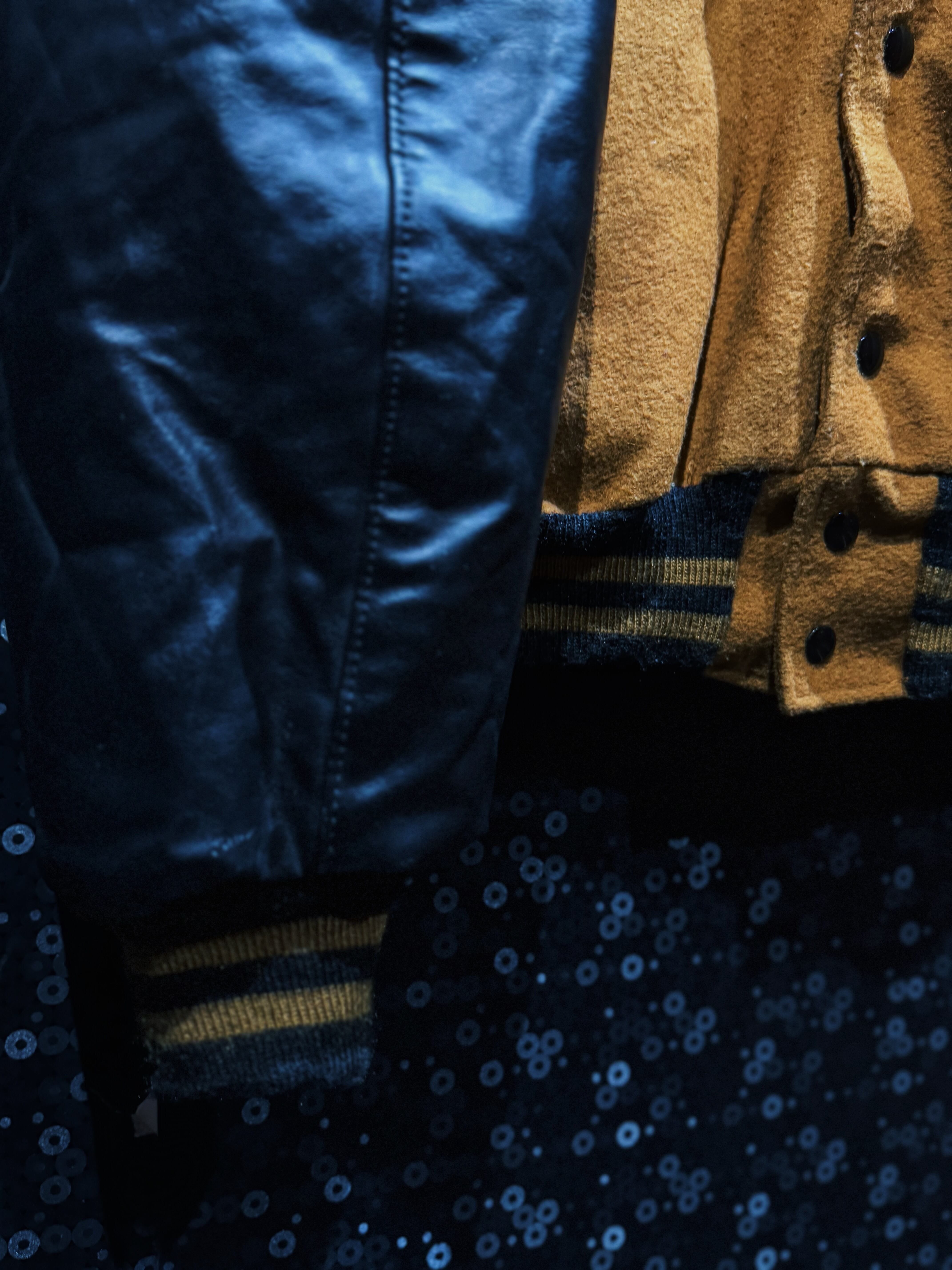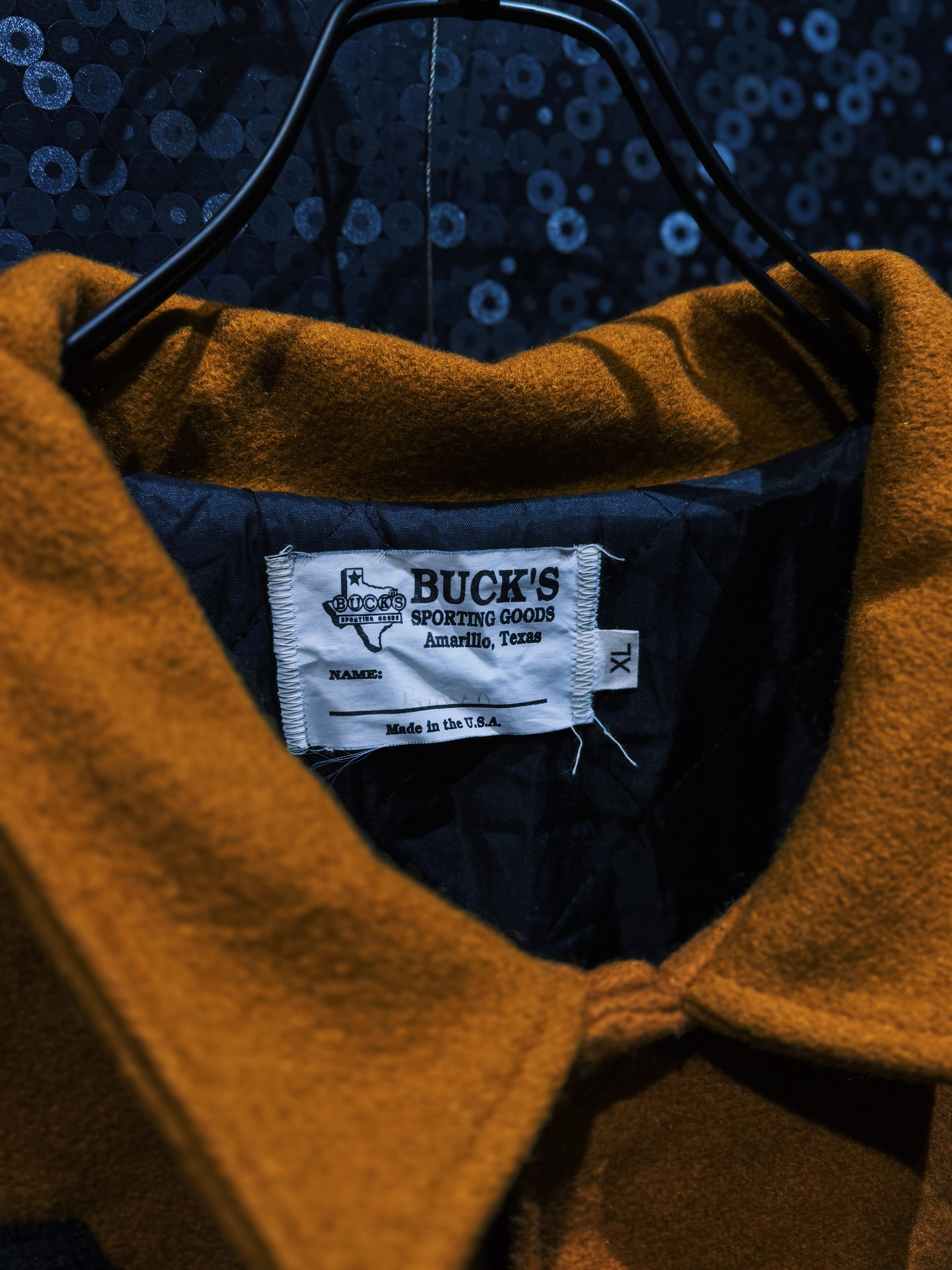 テキサス・アマリロ発、BUCK’S Sporting GoodsのUSA製スタジャン。ブラウン寄りのマスタードウールボディにブラックレザーアーム。この配色だけでまず格がある。派手じゃないのに一瞬で目に入る強さがある。