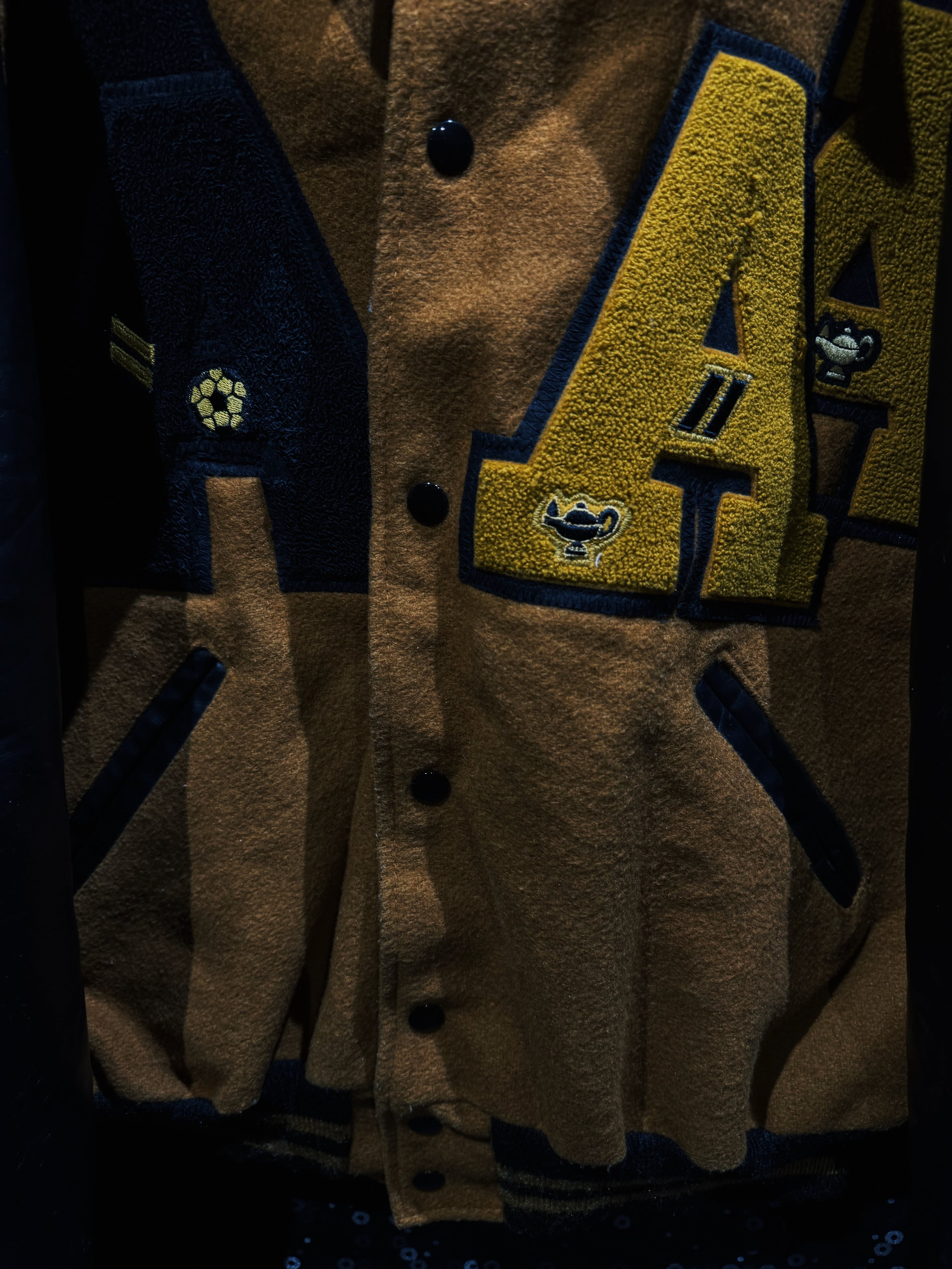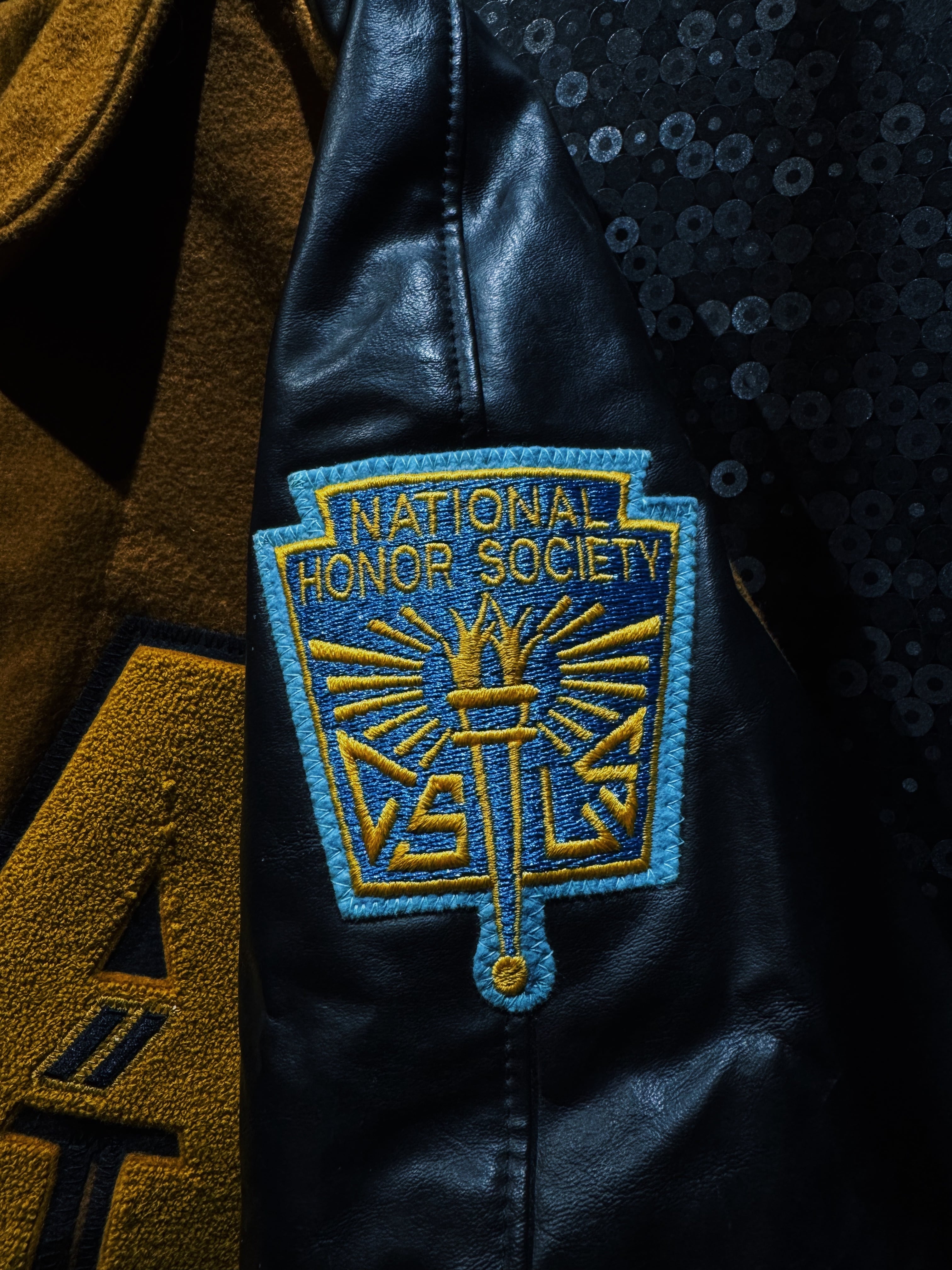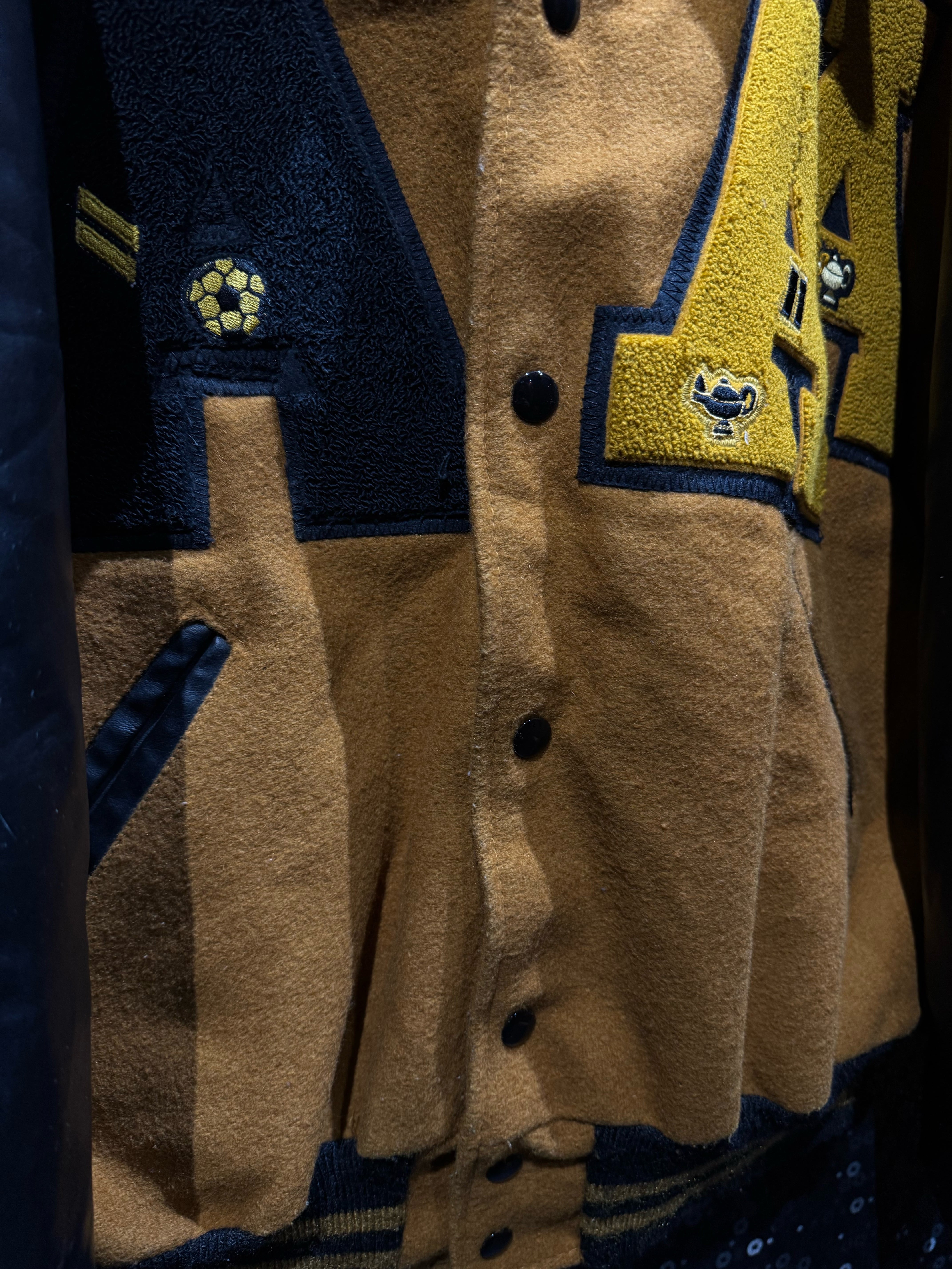 フロントには大胆なレターパッチ。袖には“1st Champs”のアワードワッペン、反対側にはNational Honor Societyの刺繍パッチ。単なるファッションピースではなく、実際のスクールカルチャーやアワード背景を感じさせるリアルな一着。ワッペンの立体感、フェルトの質感、レザーの経年シワ。全部がちゃんと“本物”。