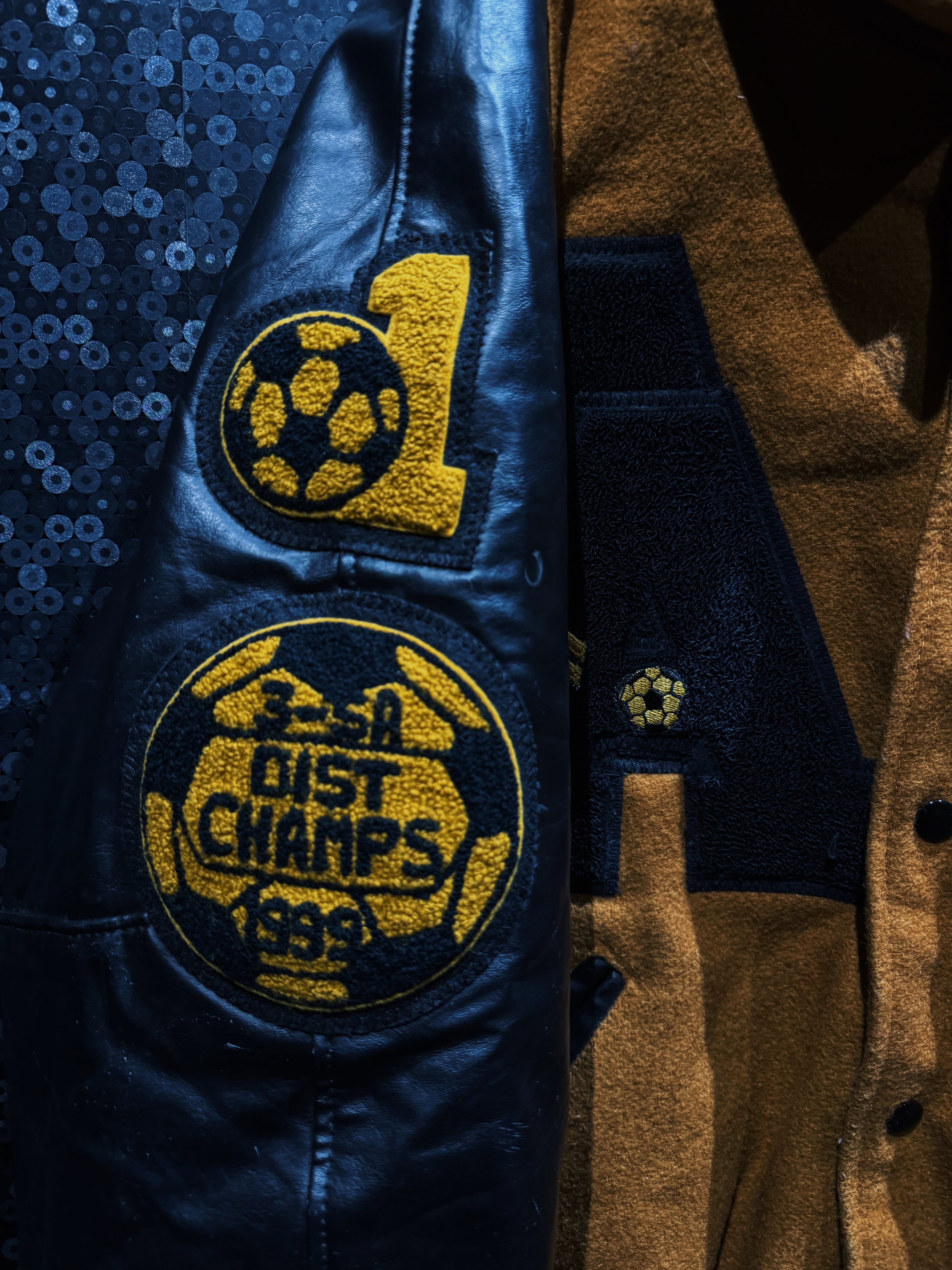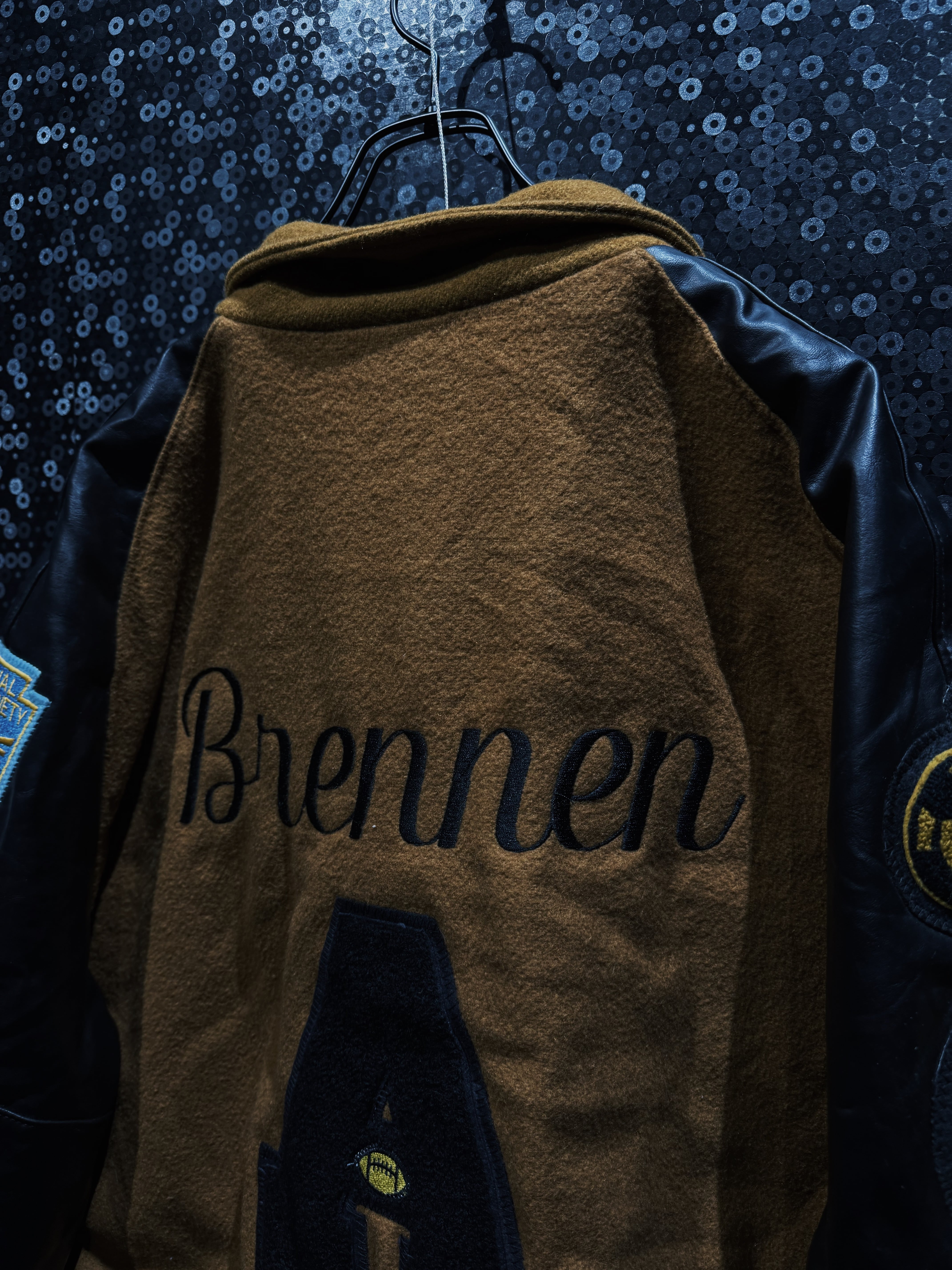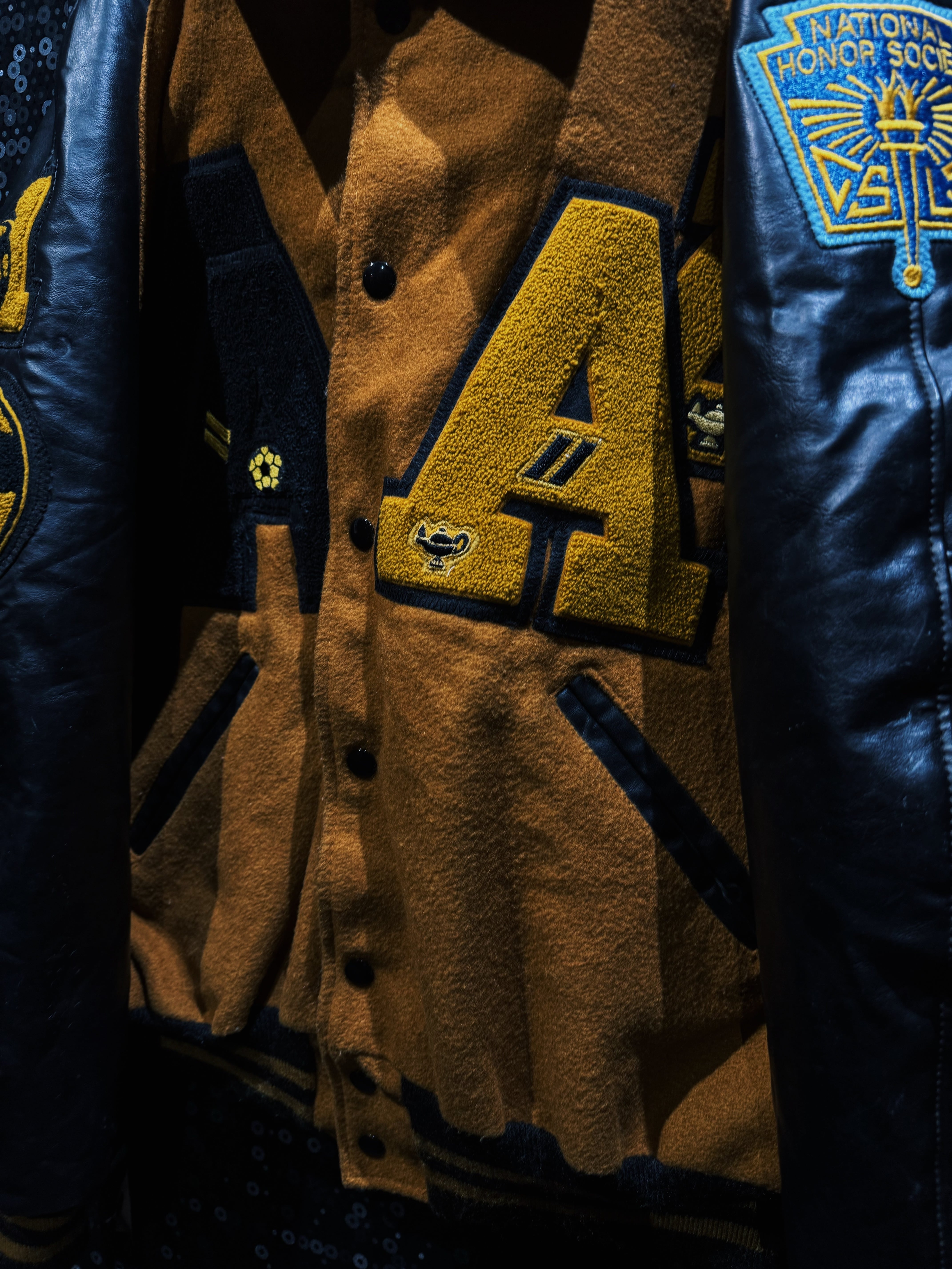 フロントには大胆なレターパッチ。袖には“1st Champs”のアワードワッペン、反対側にはNational Honor Societyの刺繍パッチ。単なるファッションピースではなく、実際のスクールカルチャーやアワード背景を感じさせるリアルな一着。ワッペンの立体感、フェルトの質感、レザーの経年シワ。全部がちゃんと“本物”。