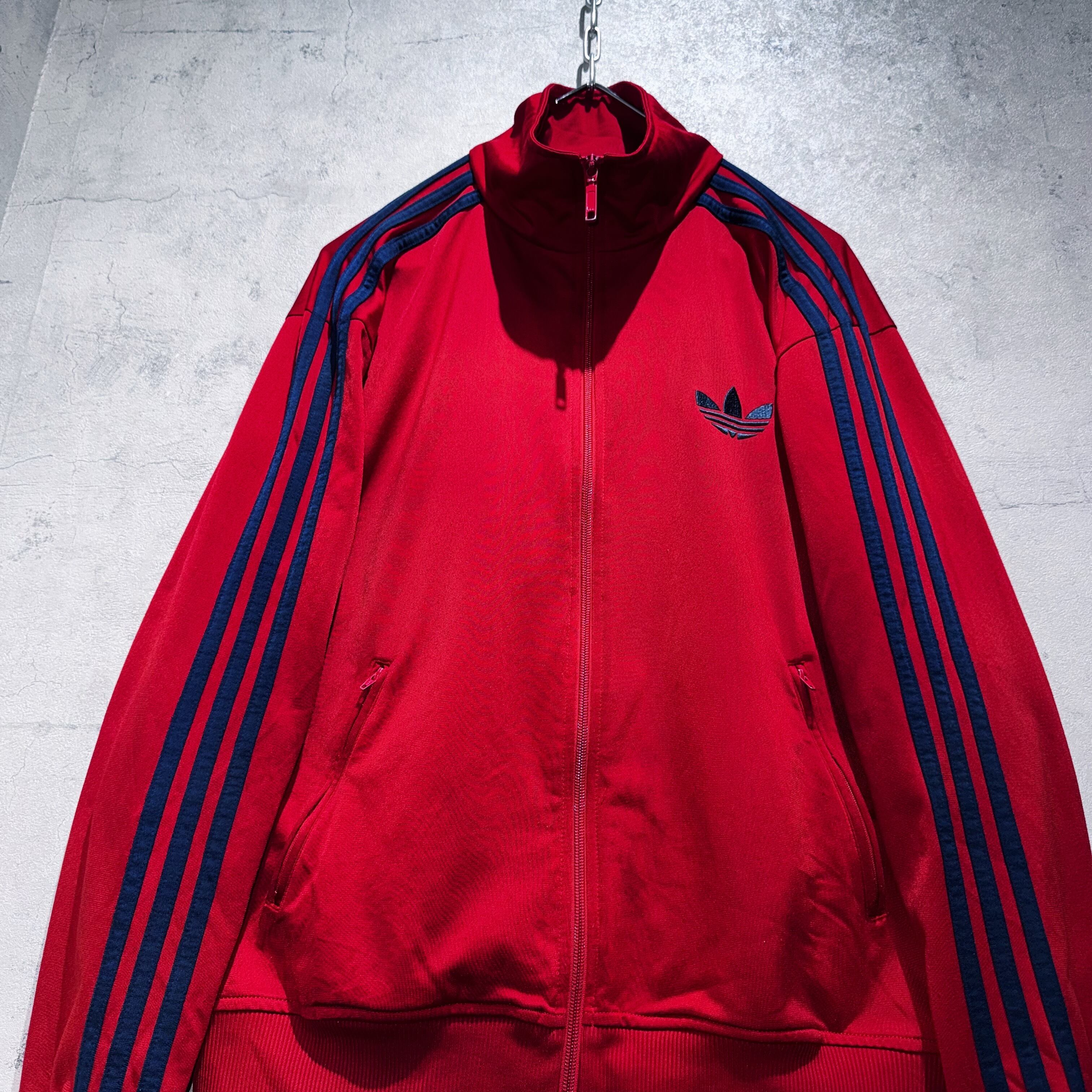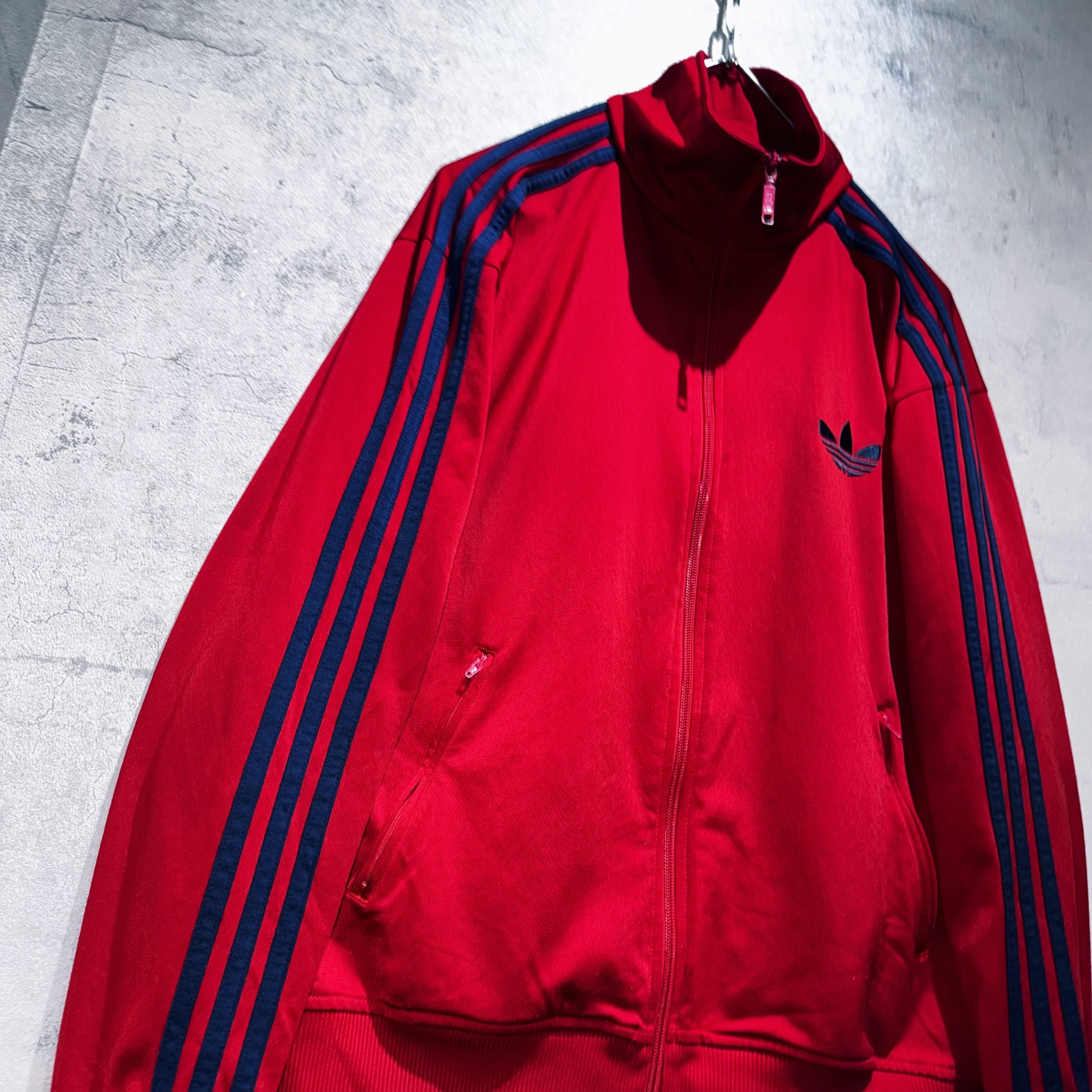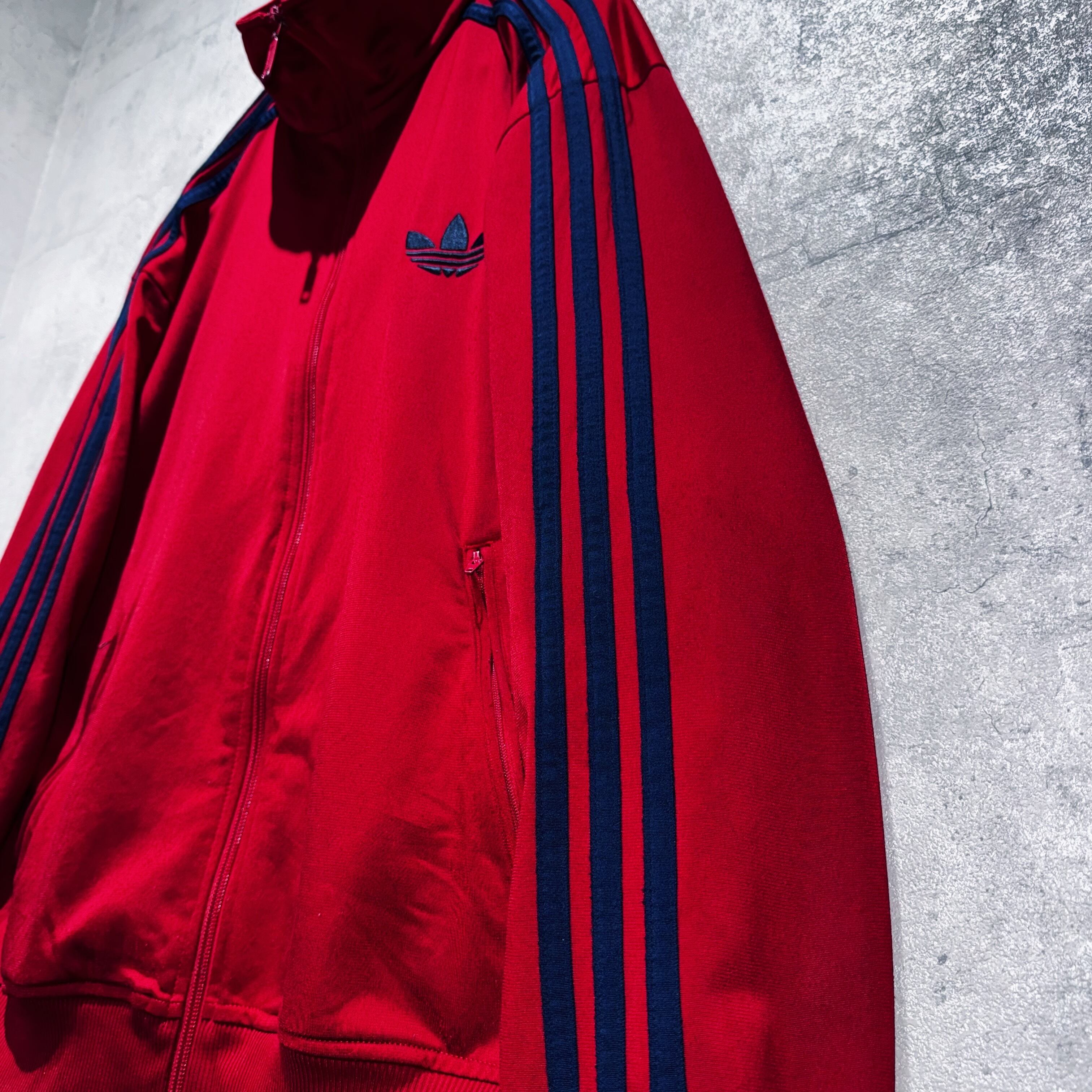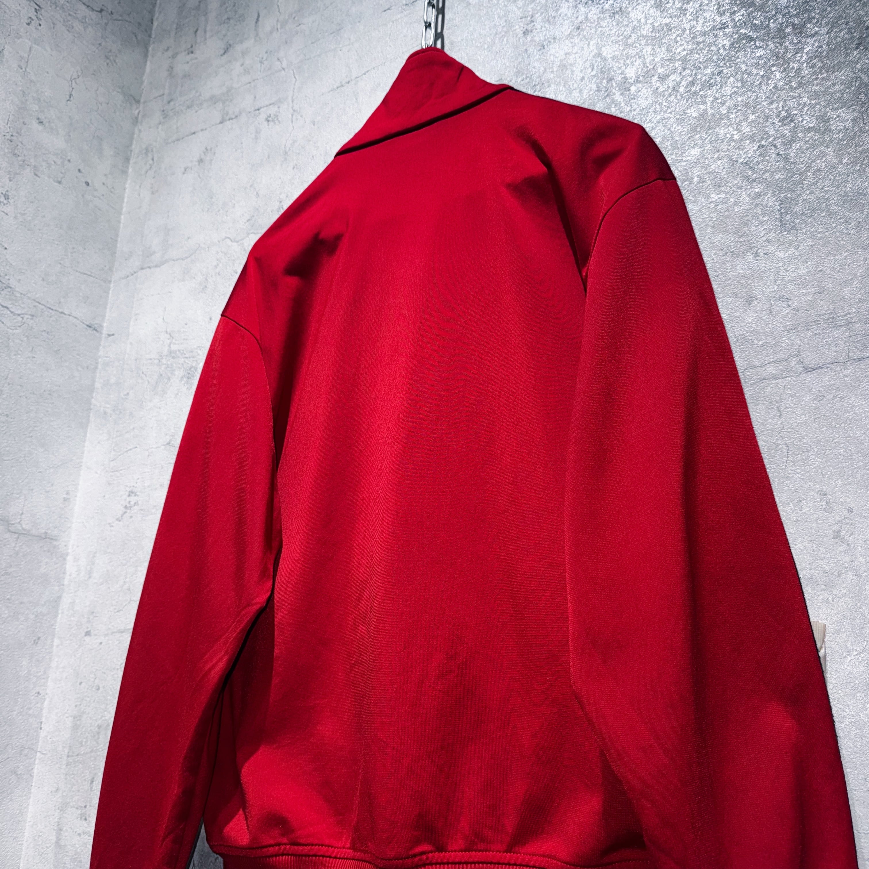 かなり力強いクリムゾンレッドカラーをボディとしたトラックジャケット。その上からはネイビーでトレフォイルと3ストライプスを載せたADIDASといえばの王道デザイン。