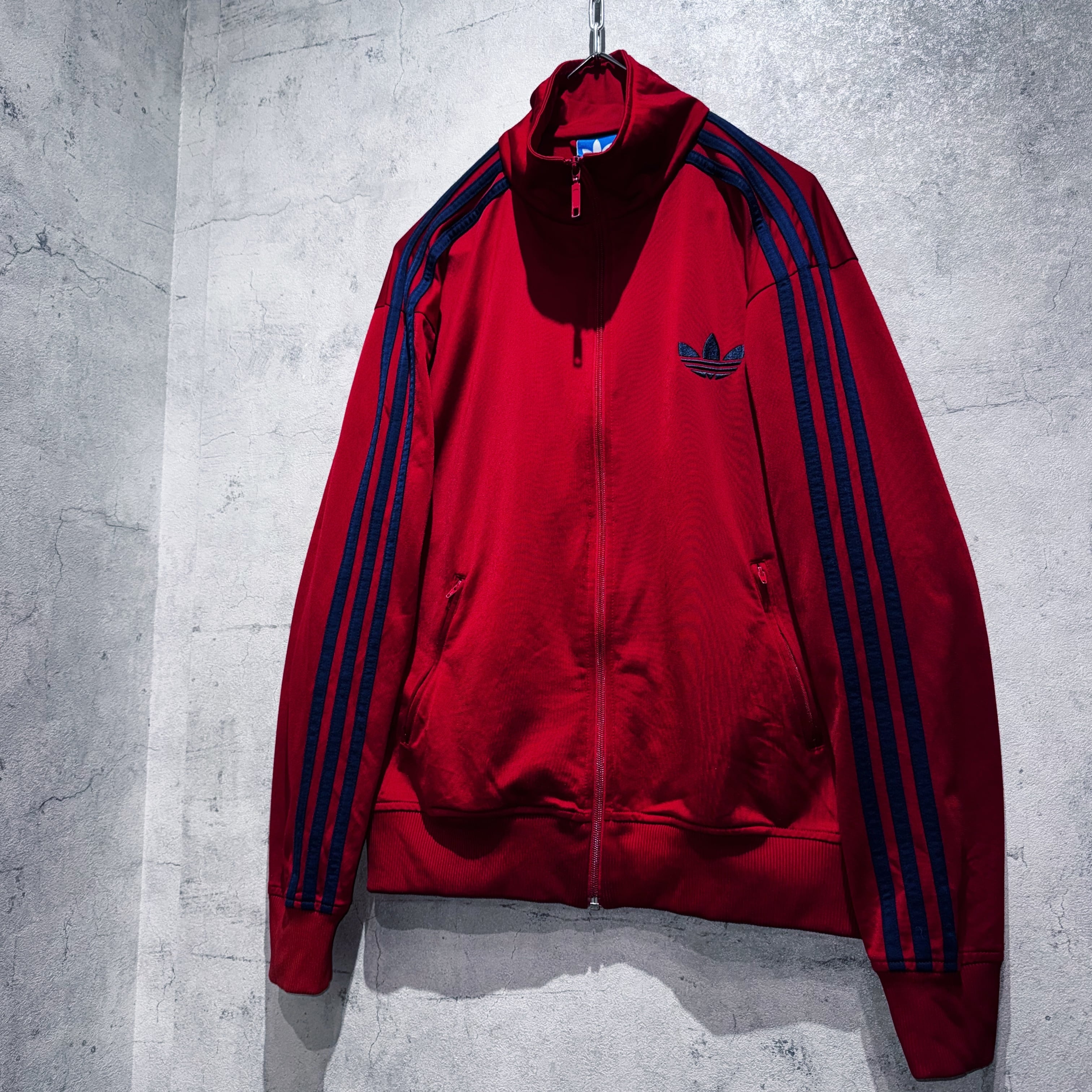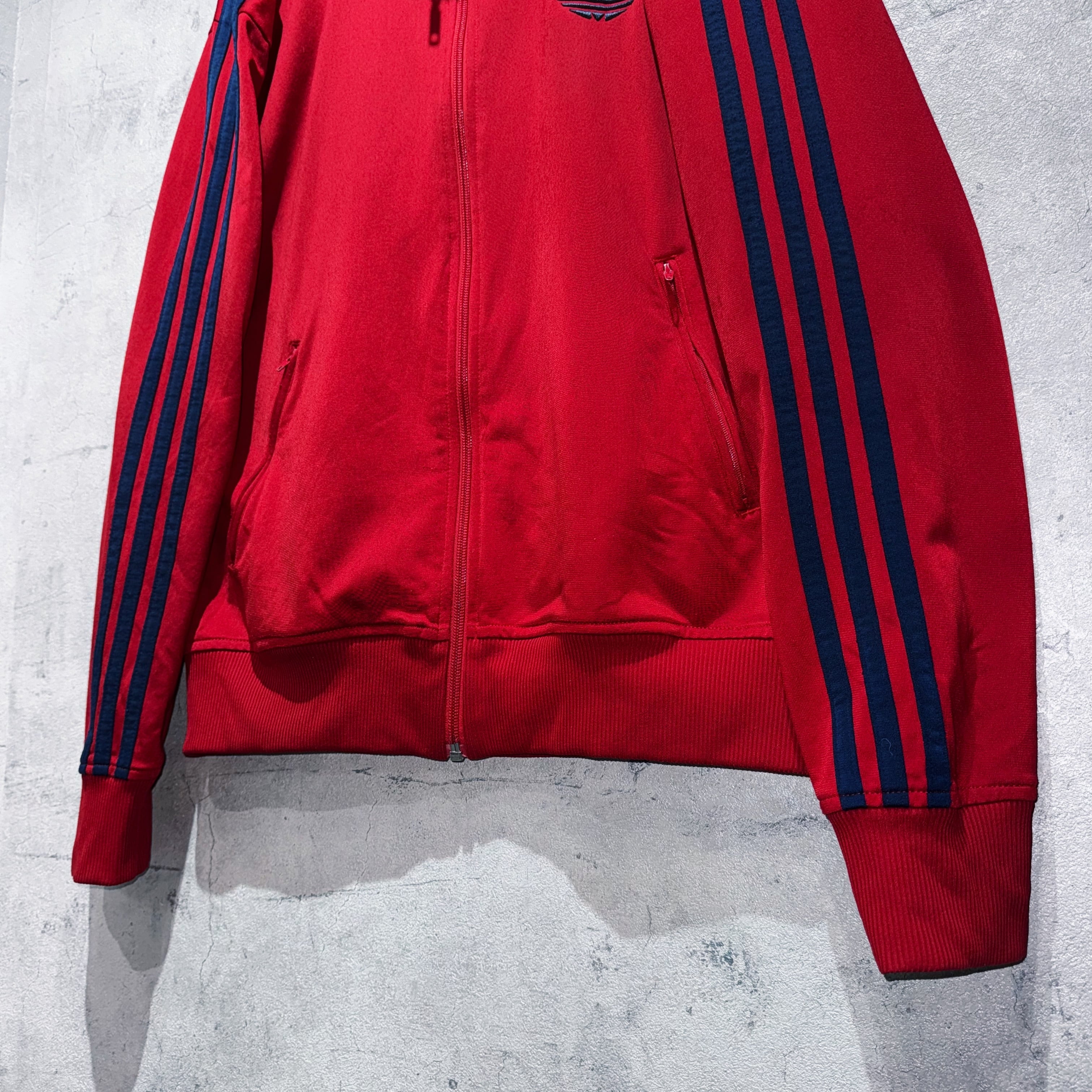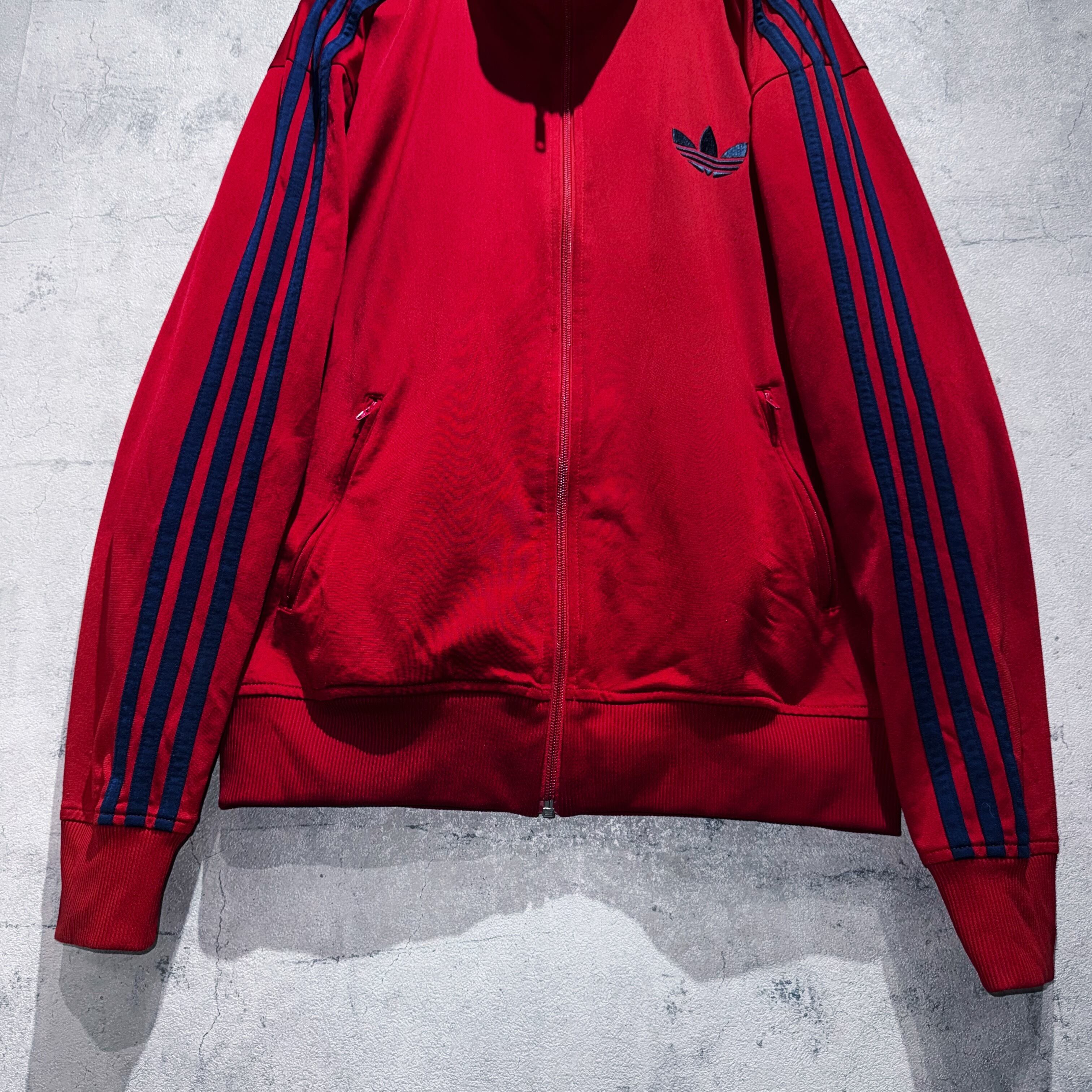 かなり力強いクリムゾンレッドカラーをボディとしたトラックジャケット。その上からはネイビーでトレフォイルと3ストライプスを載せたADIDASといえばの王道デザイン。
