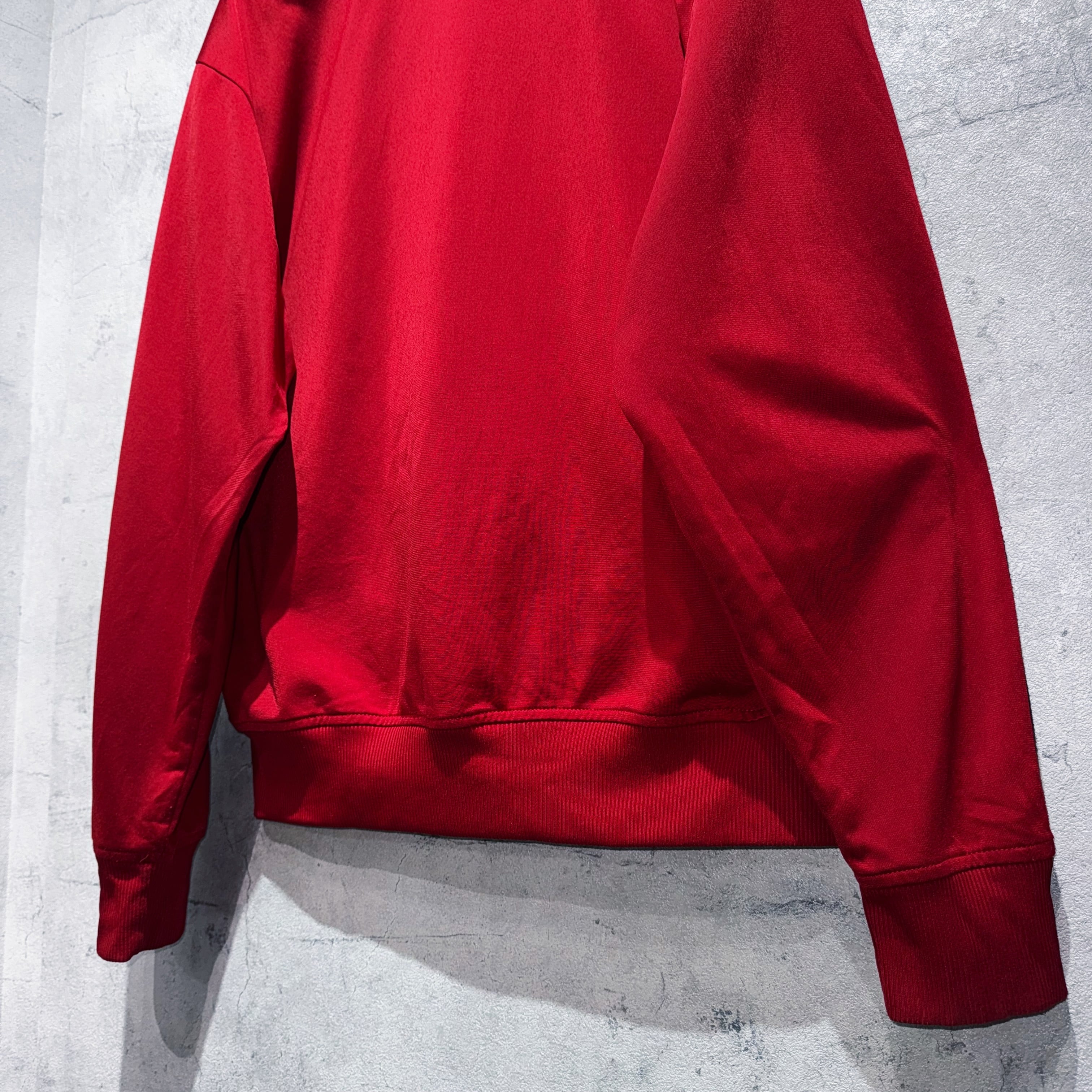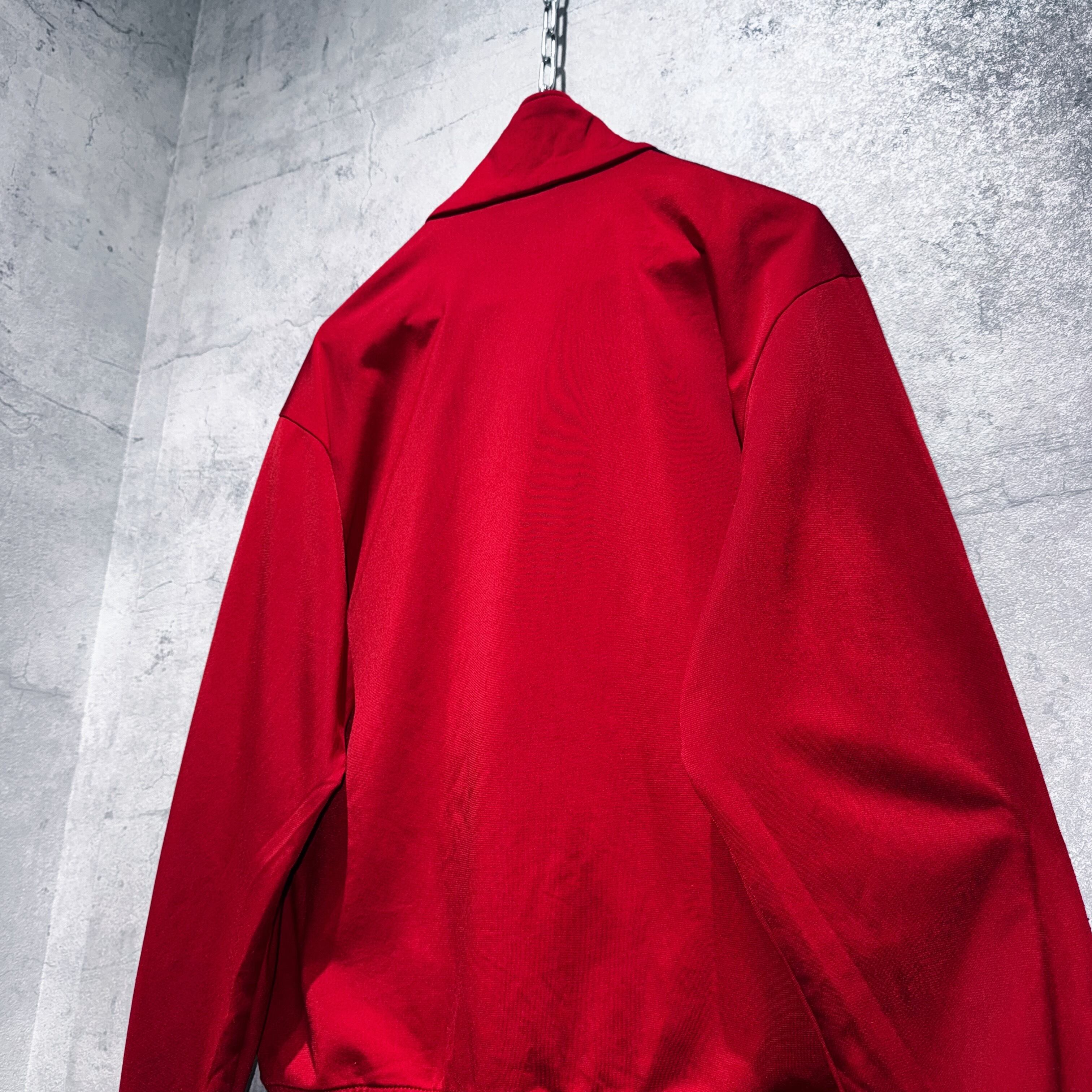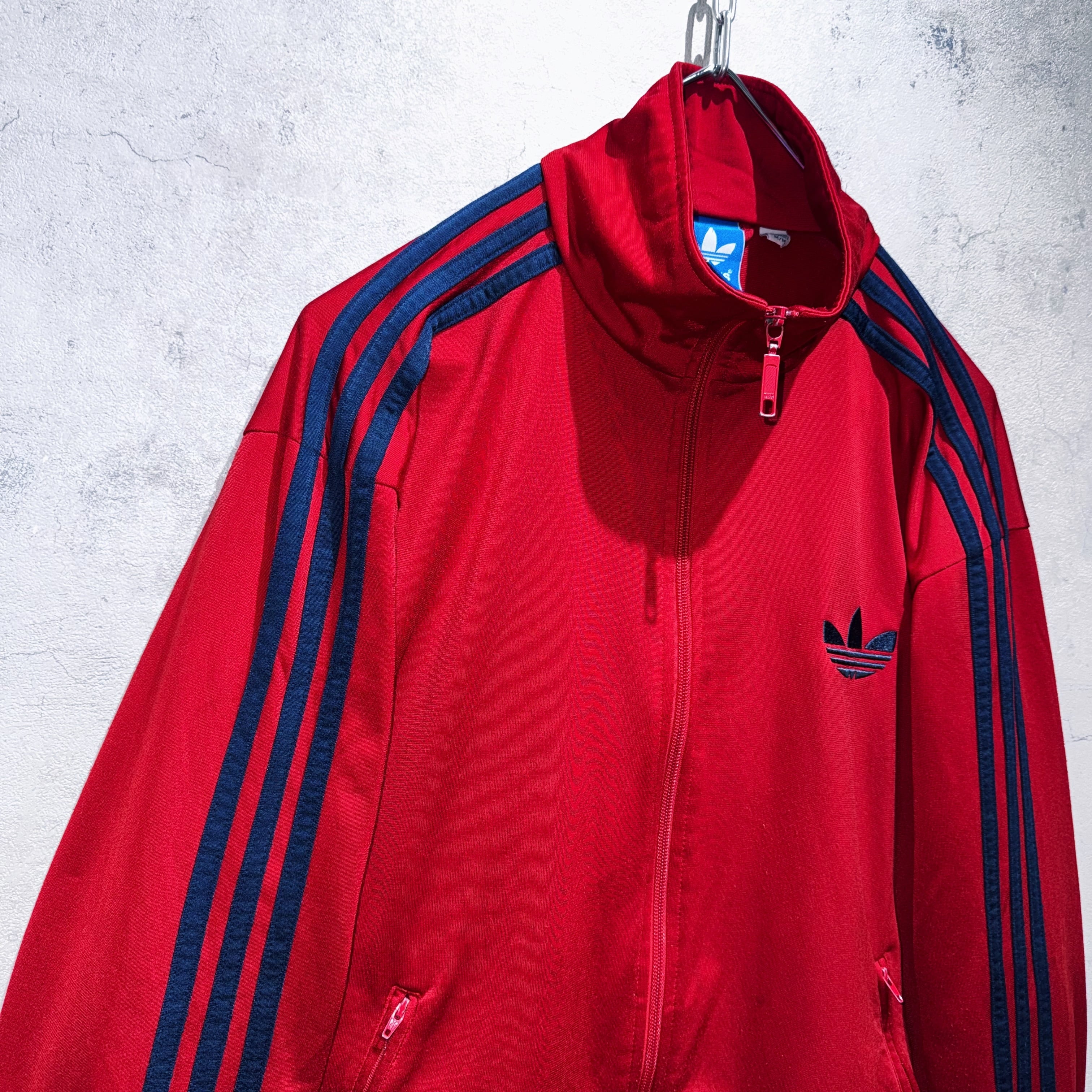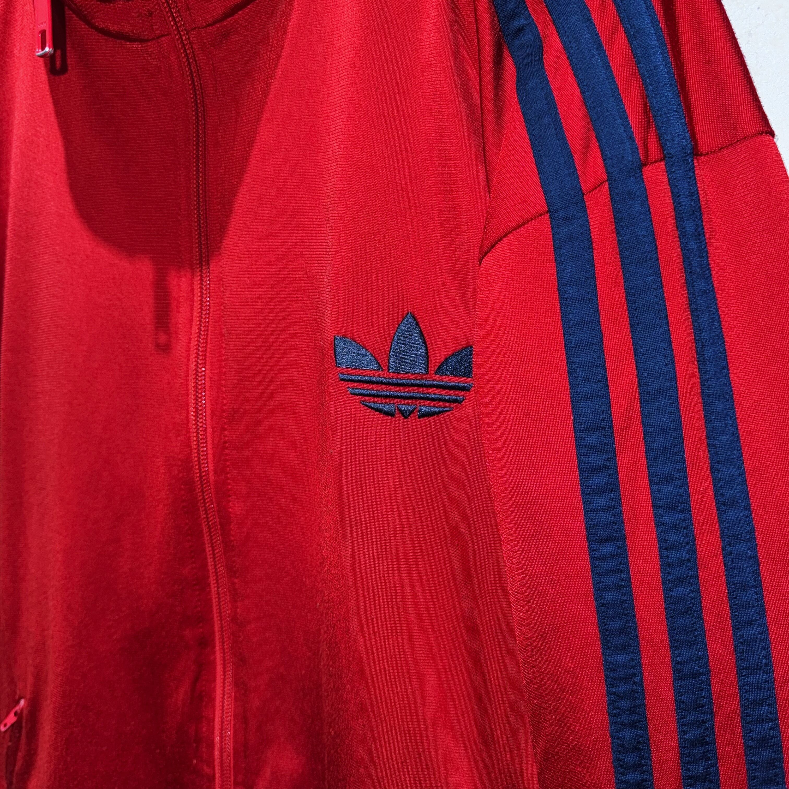 かなり力強いクリムゾンレッドカラーをボディとしたトラックジャケット。その上からはネイビーでトレフォイルと3ストライプスを載せたADIDASといえばの王道デザイン。