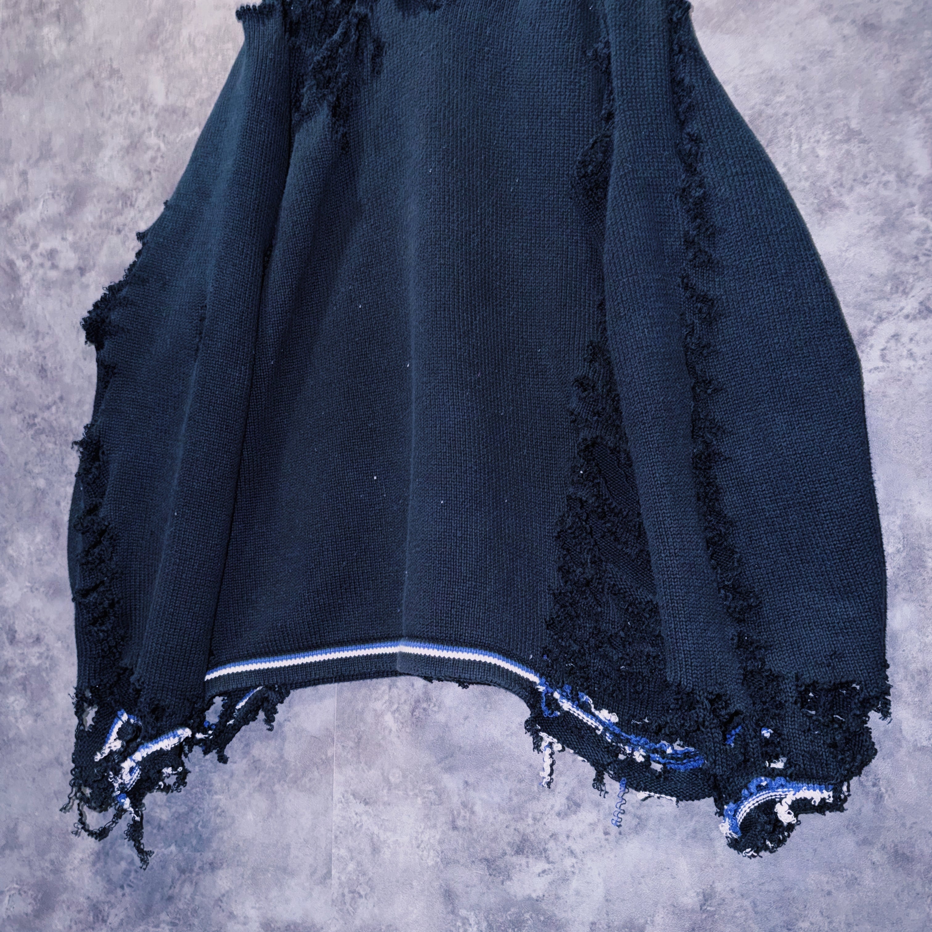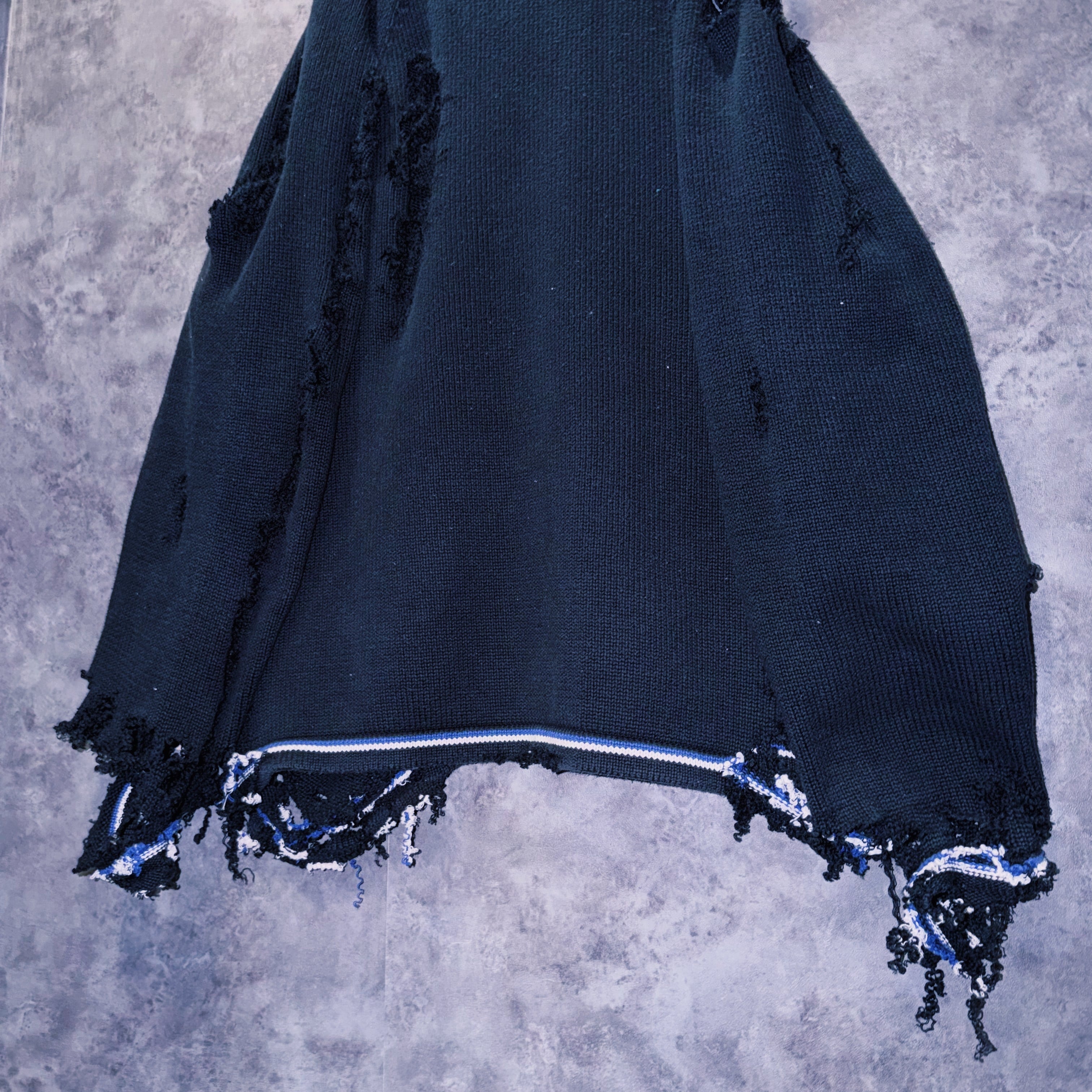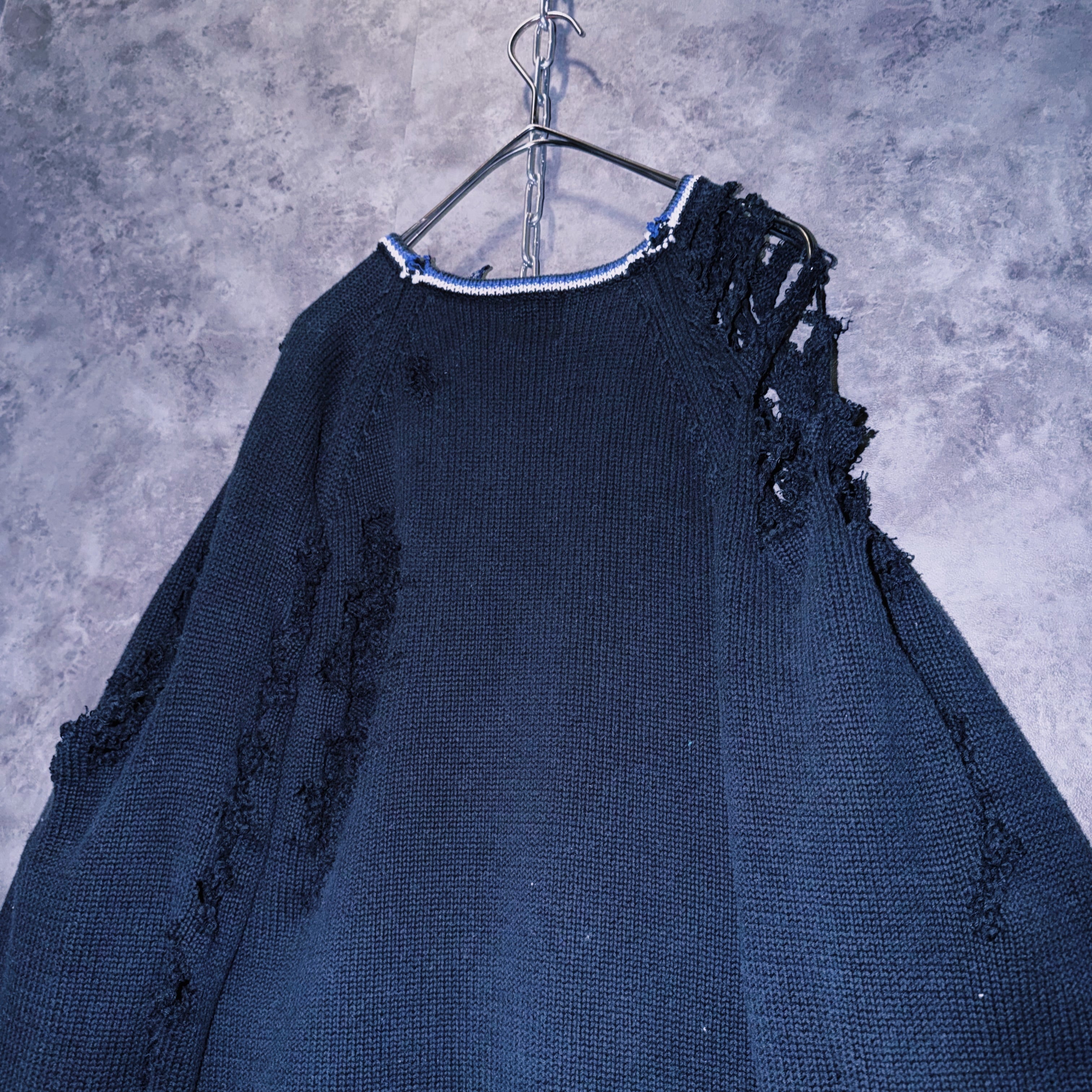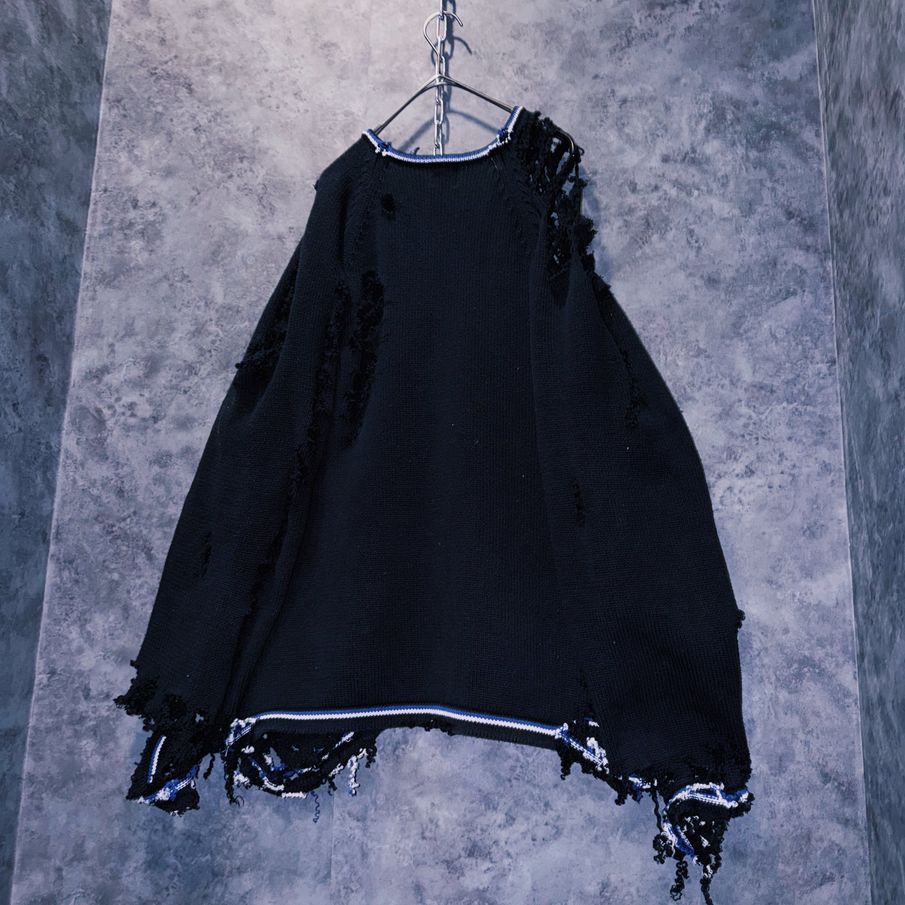 シンプルなブラックカラーにリブにラインを仕込んだ上、激しいグランジカスタムはアイテムのダーク感をより加速させ、一枚でコーデの雰囲気をレベルアップしてくれます。