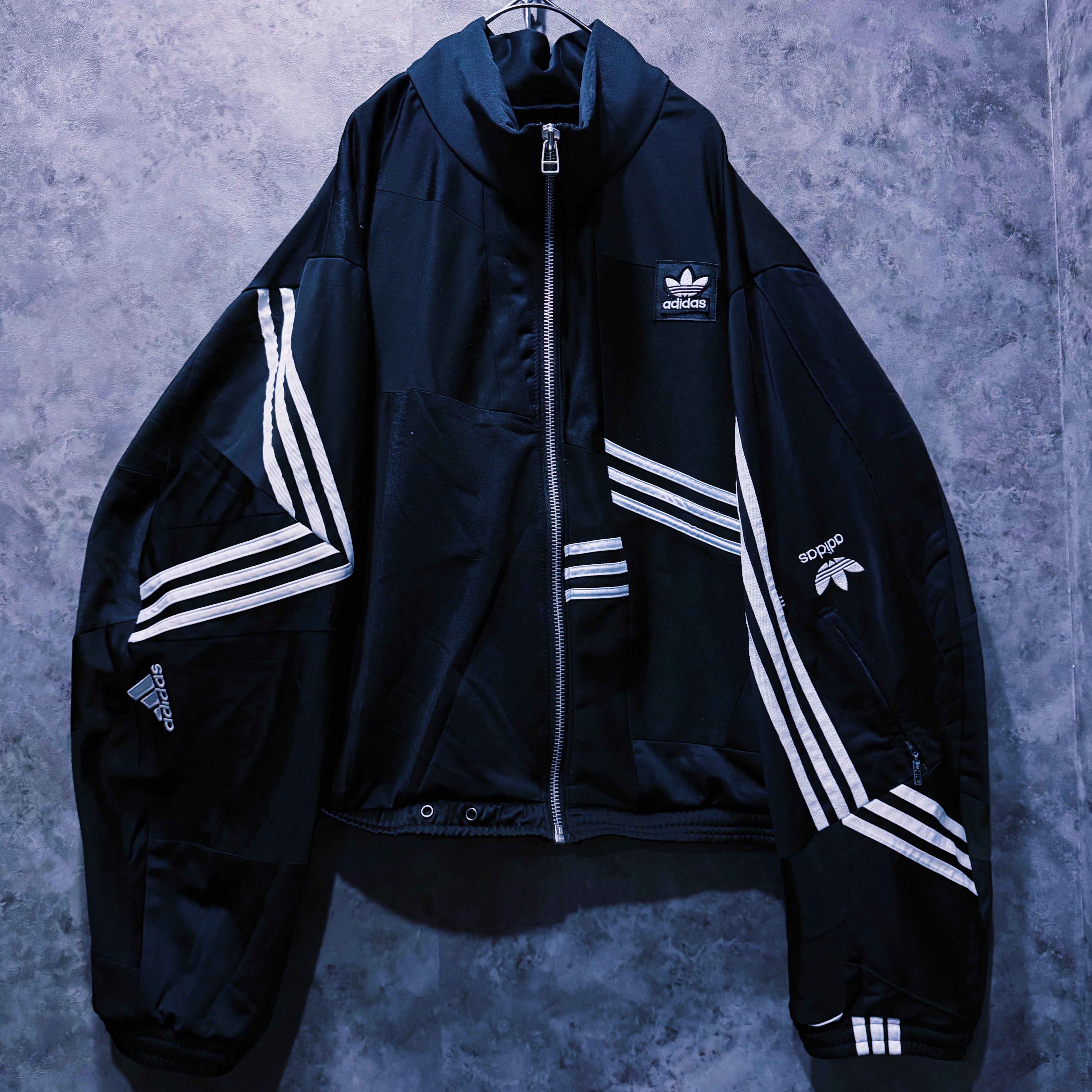 他数のトラックジャケットをパッチワークでデザインを施しており、全てバラバラで圧巻の存在感。無数のトラックジャケットで中には名チームや企業などのチームウェアも存在している個体もあります。