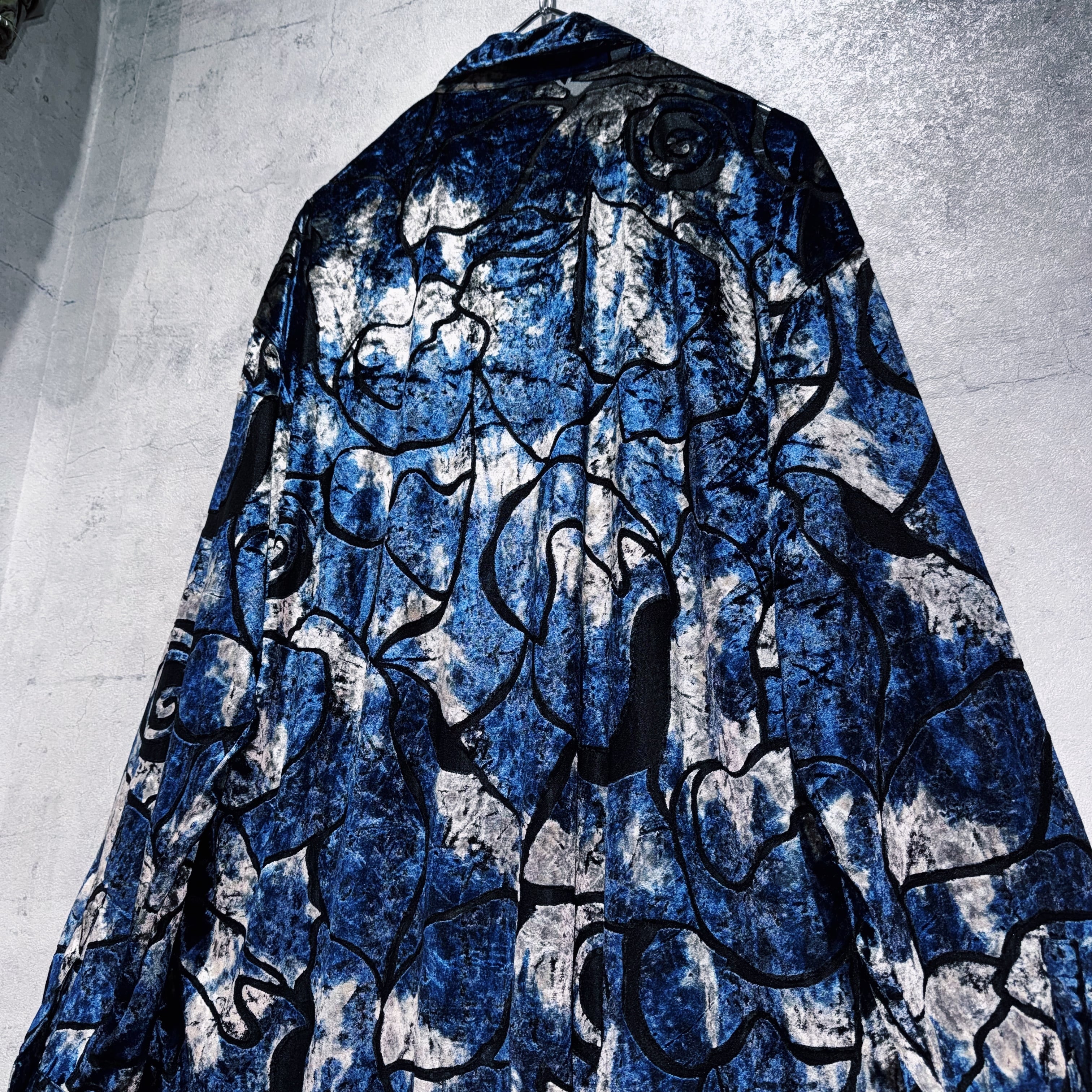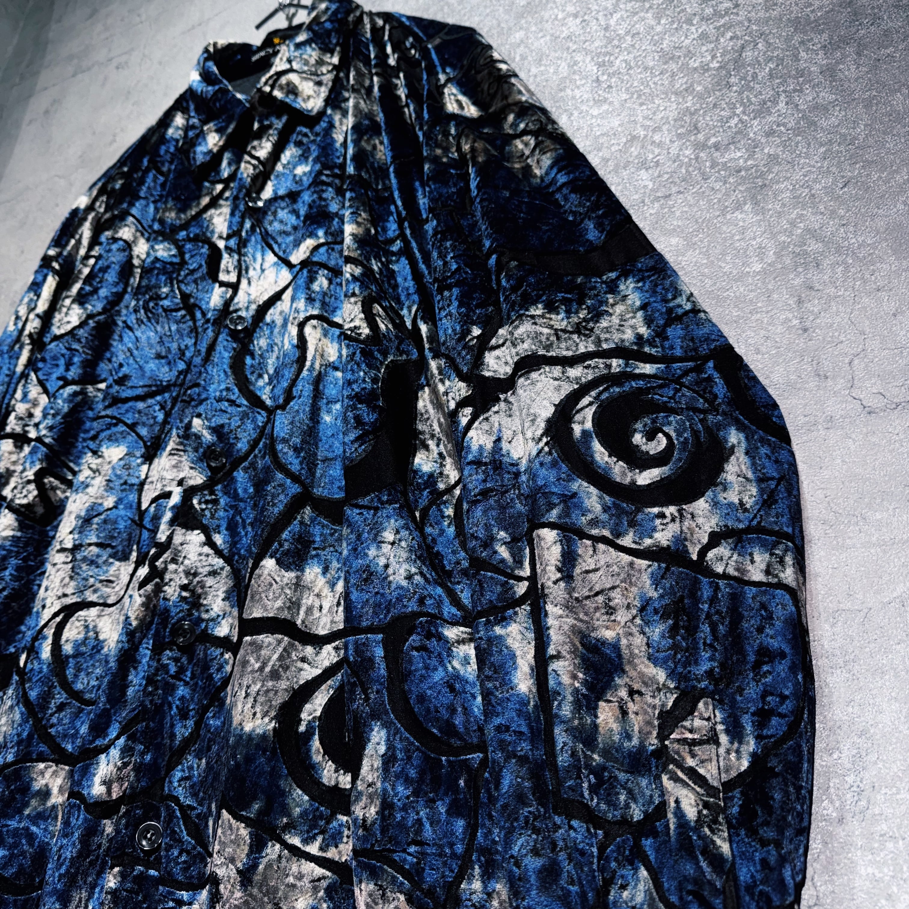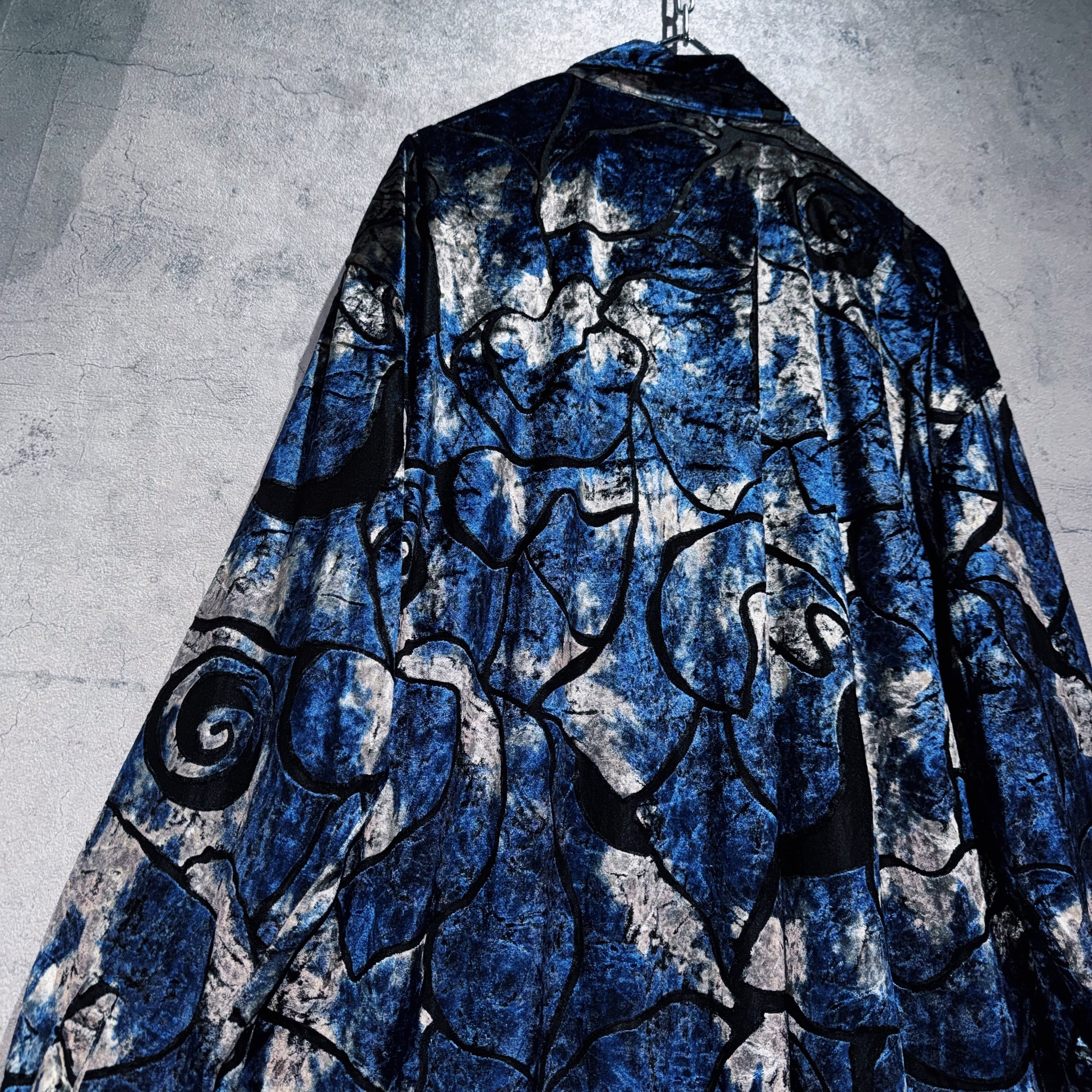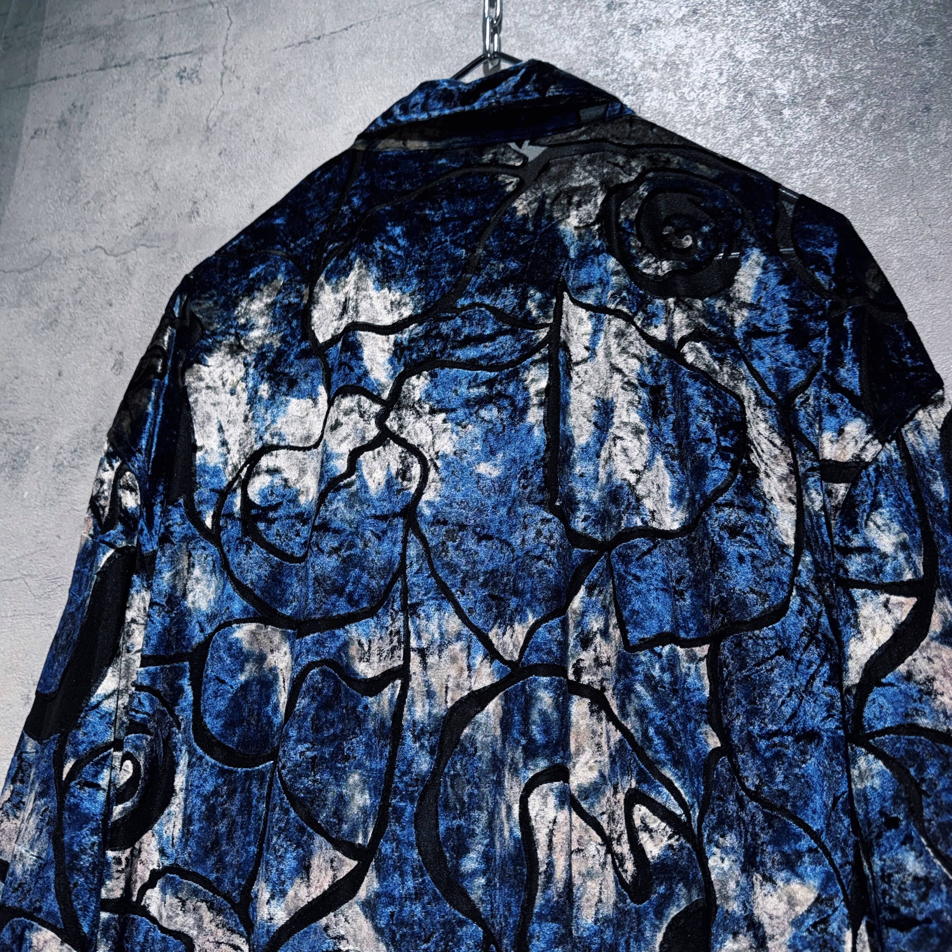 異素材の中でも人気が高く高級感を演出してくれるベロア素材を採用したデザインシャツ。その素材でアート柄を表現し、特有の光沢も相まってラグジュアリーな仕上がりに。
