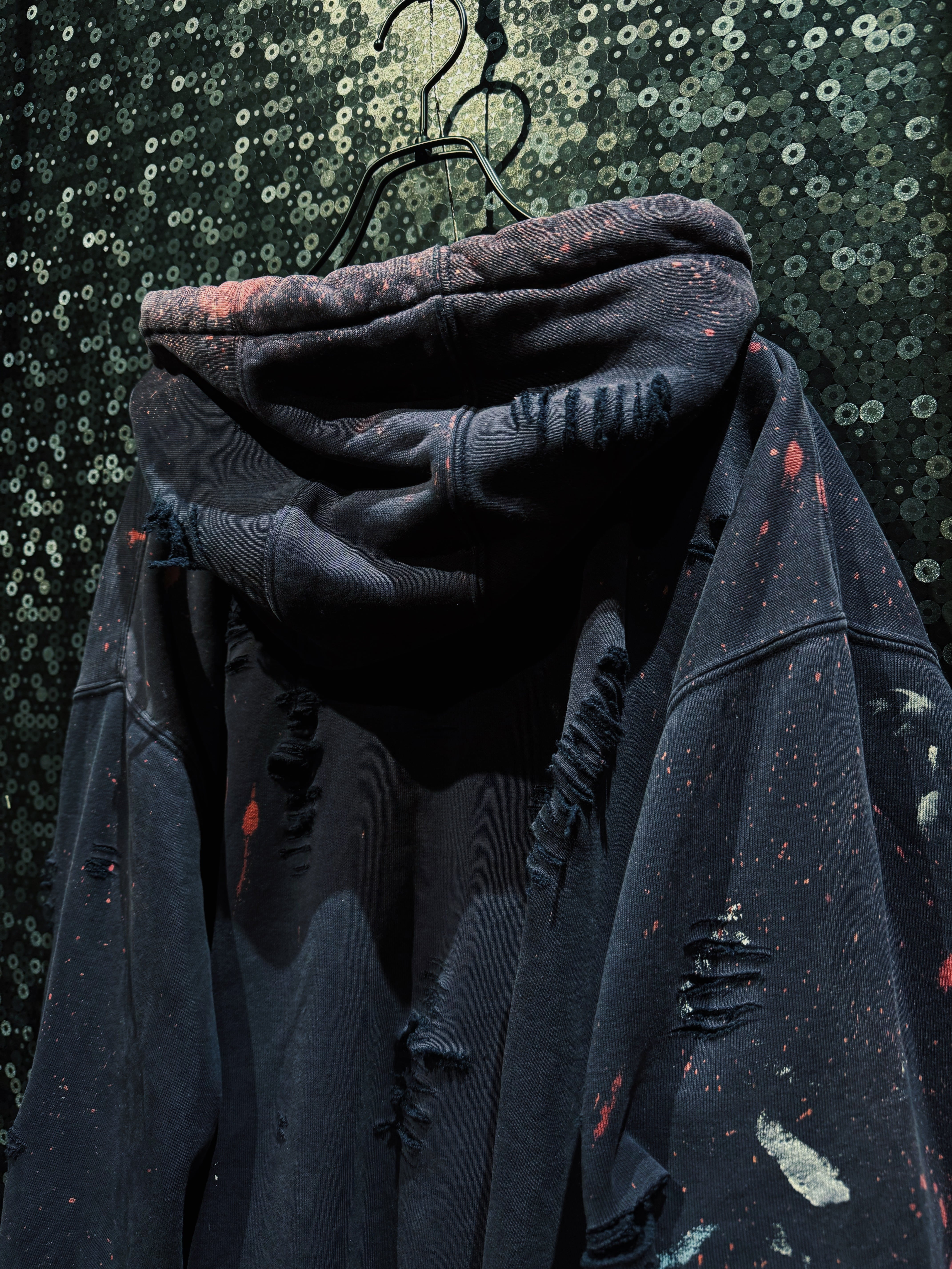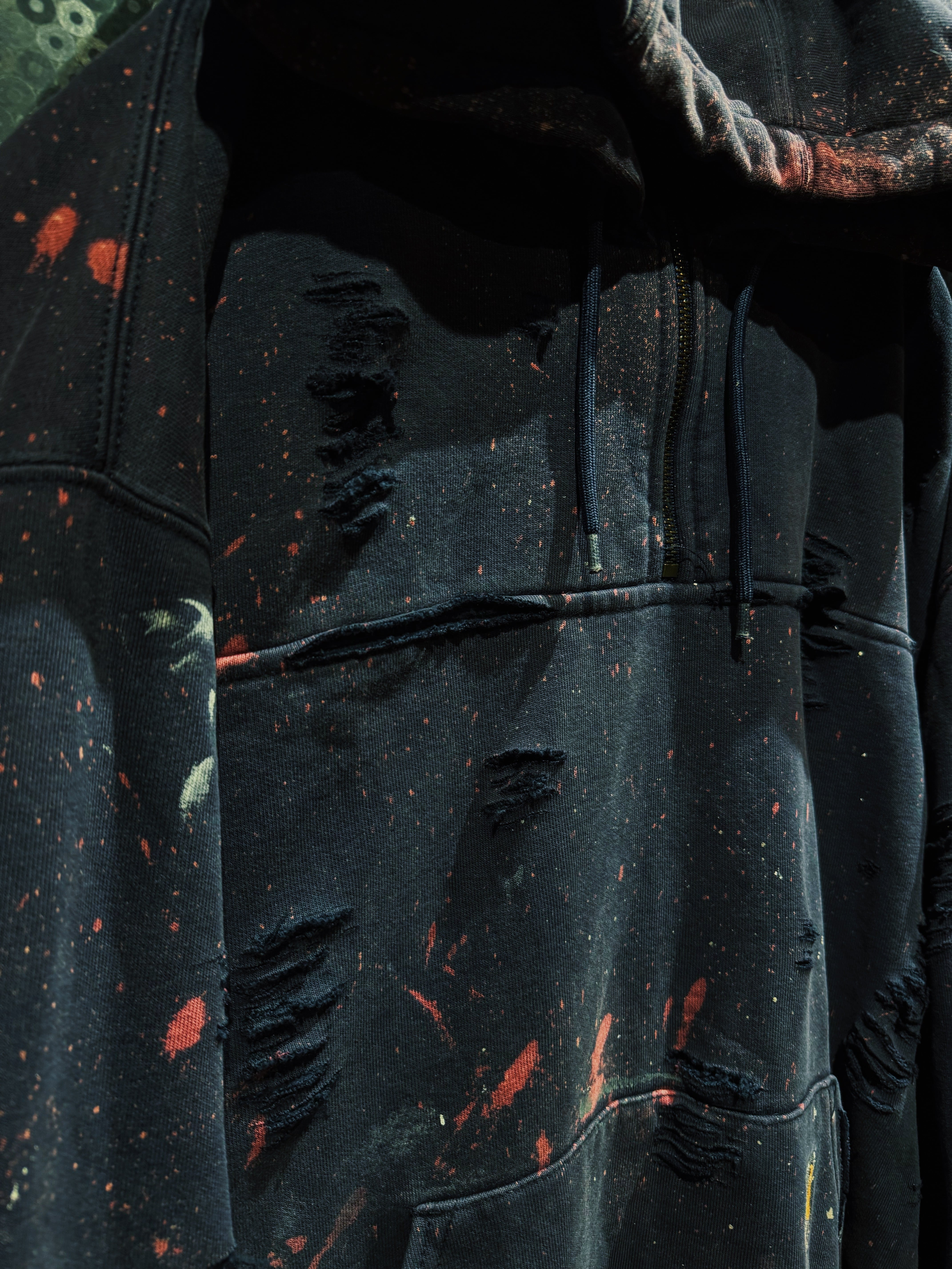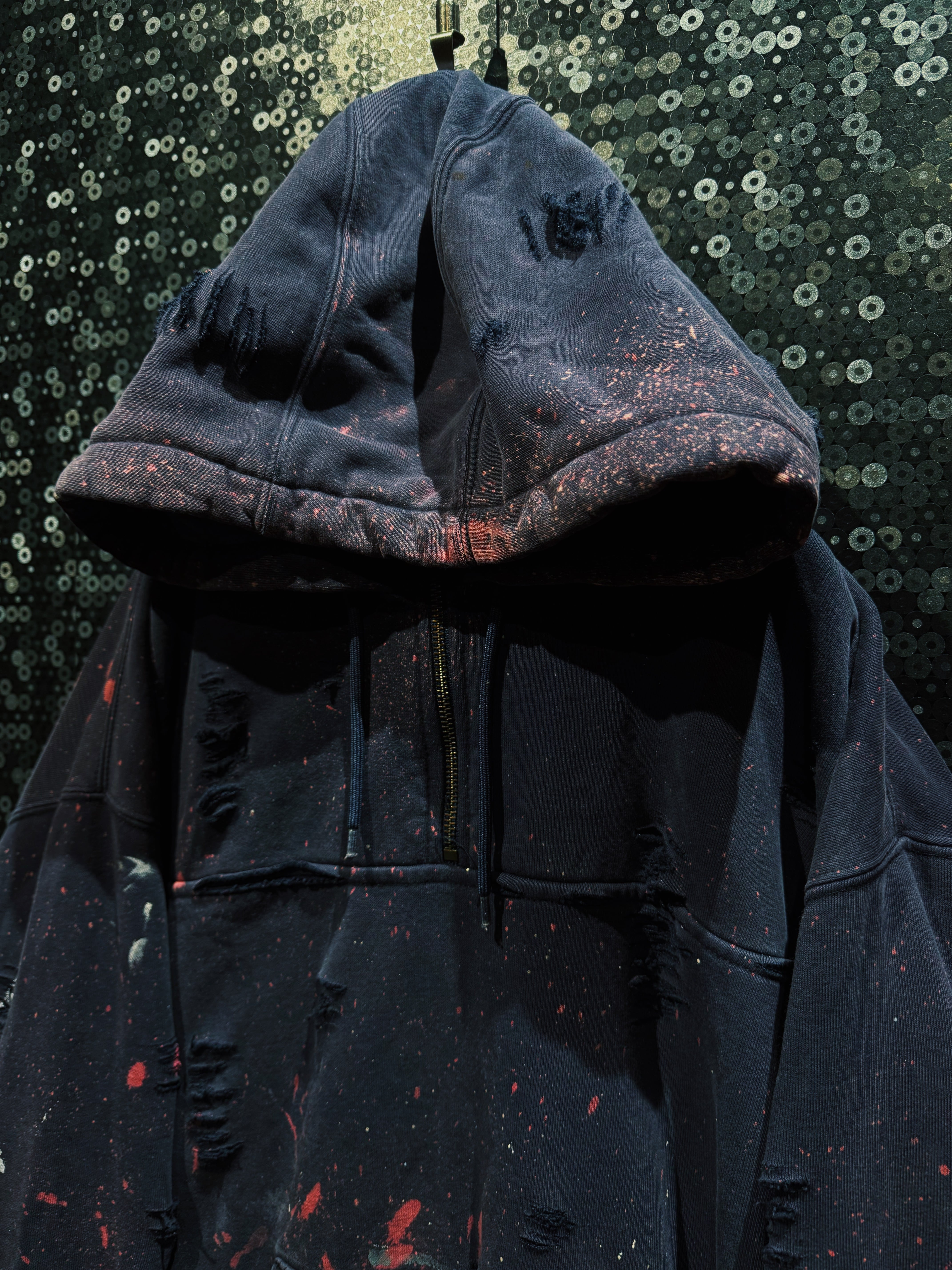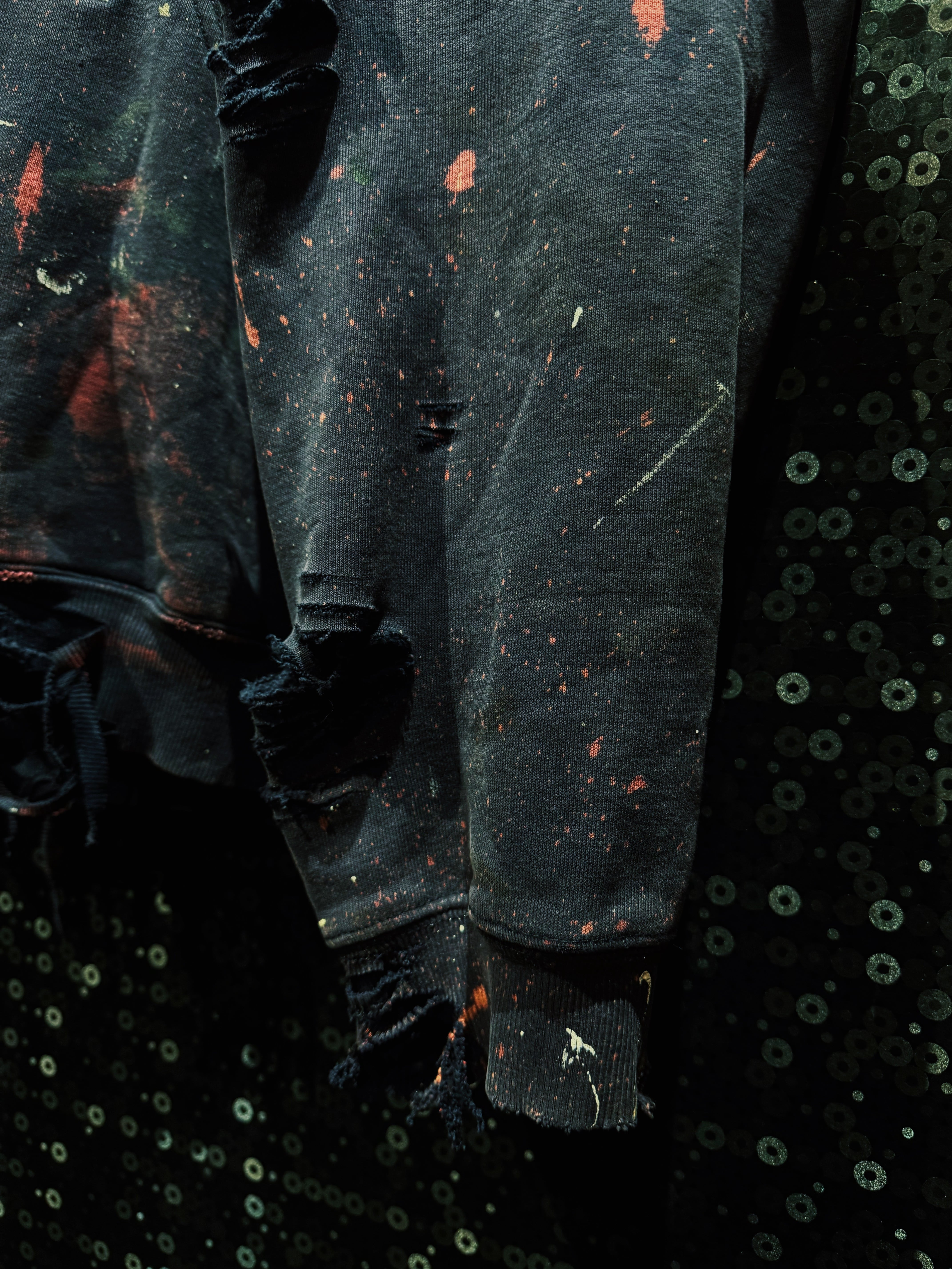 ボディはフェードしたブラック。厚みのある裏毛スウェットに、全体へ無数のクラッシュ加工。袖・身頃・フードに至るまでランダムに入るダメージは、均一ではなく“削られた痕”のような荒々しさを持つ。さらに赤や生成りのペイントが飛び散り、まるで作業現場か、あるいは戦場を経たような空気を纏う。