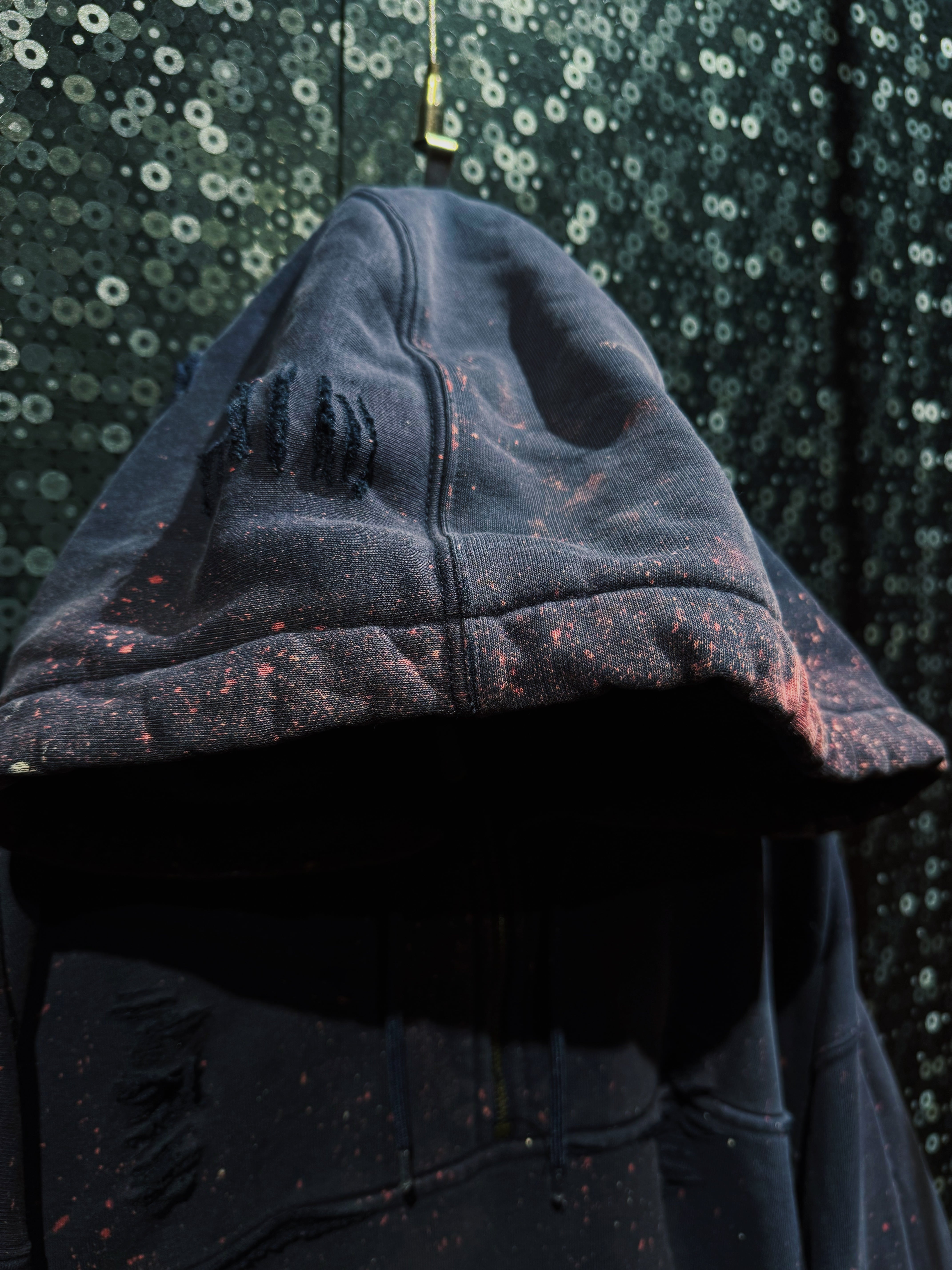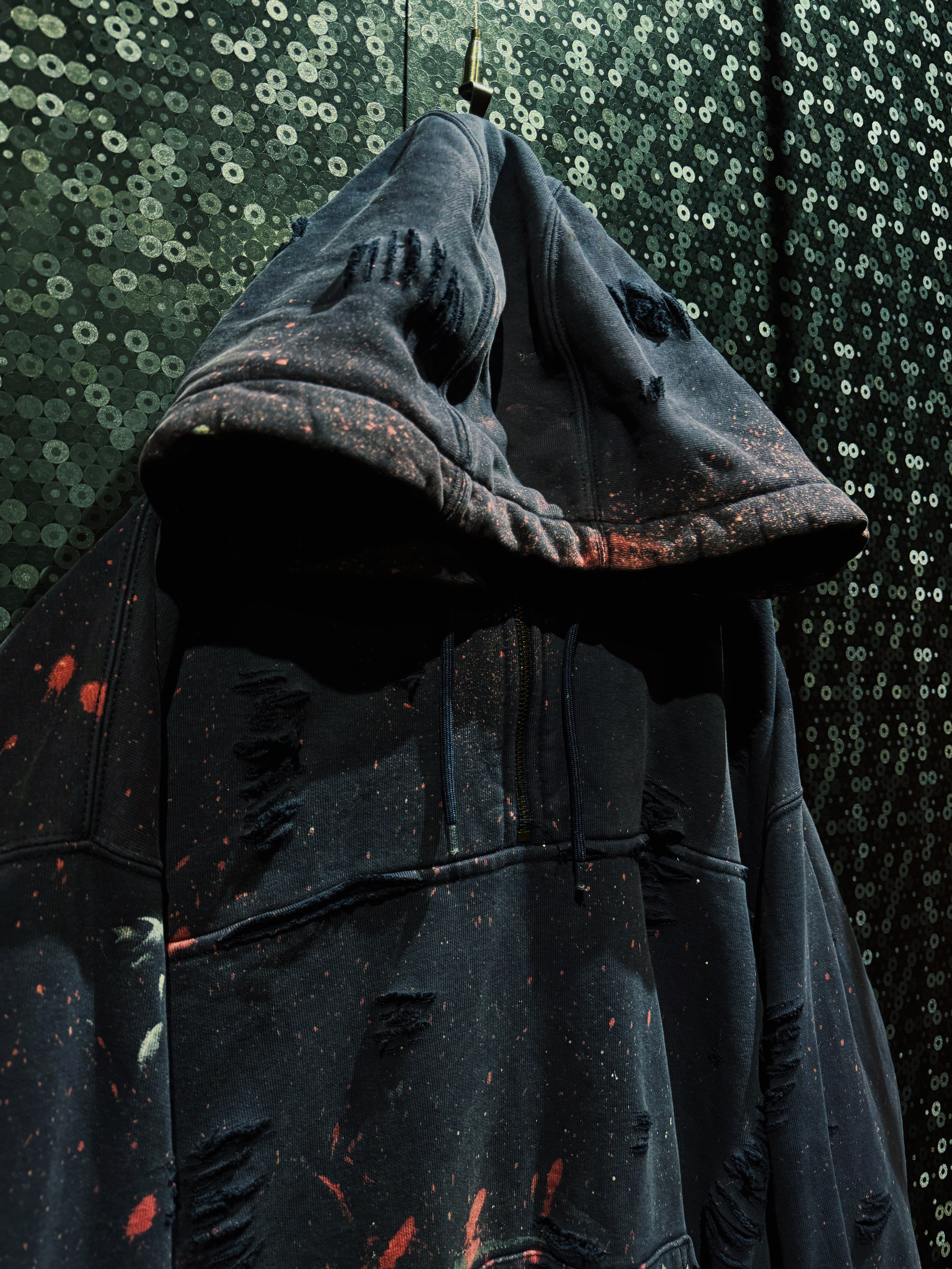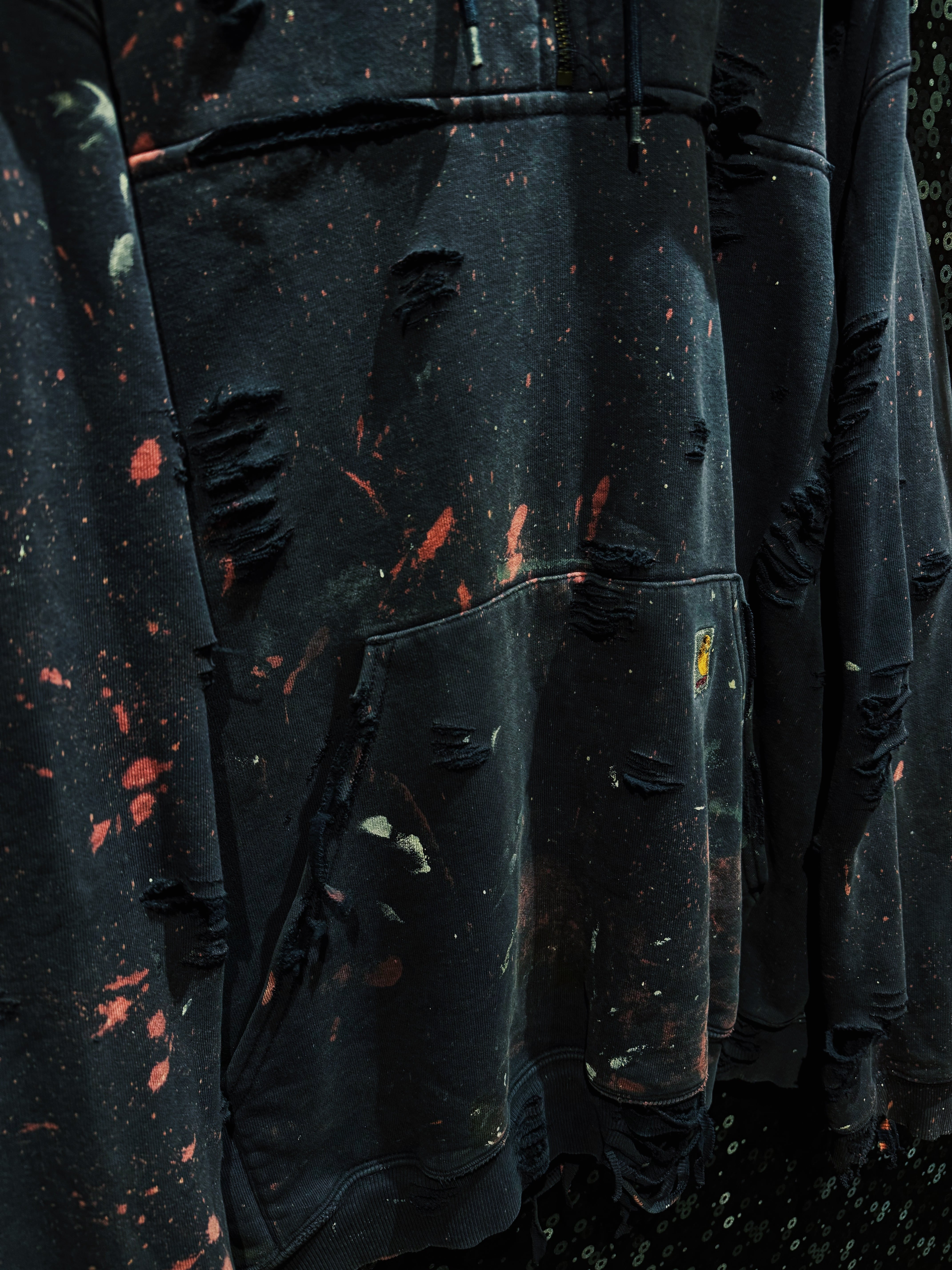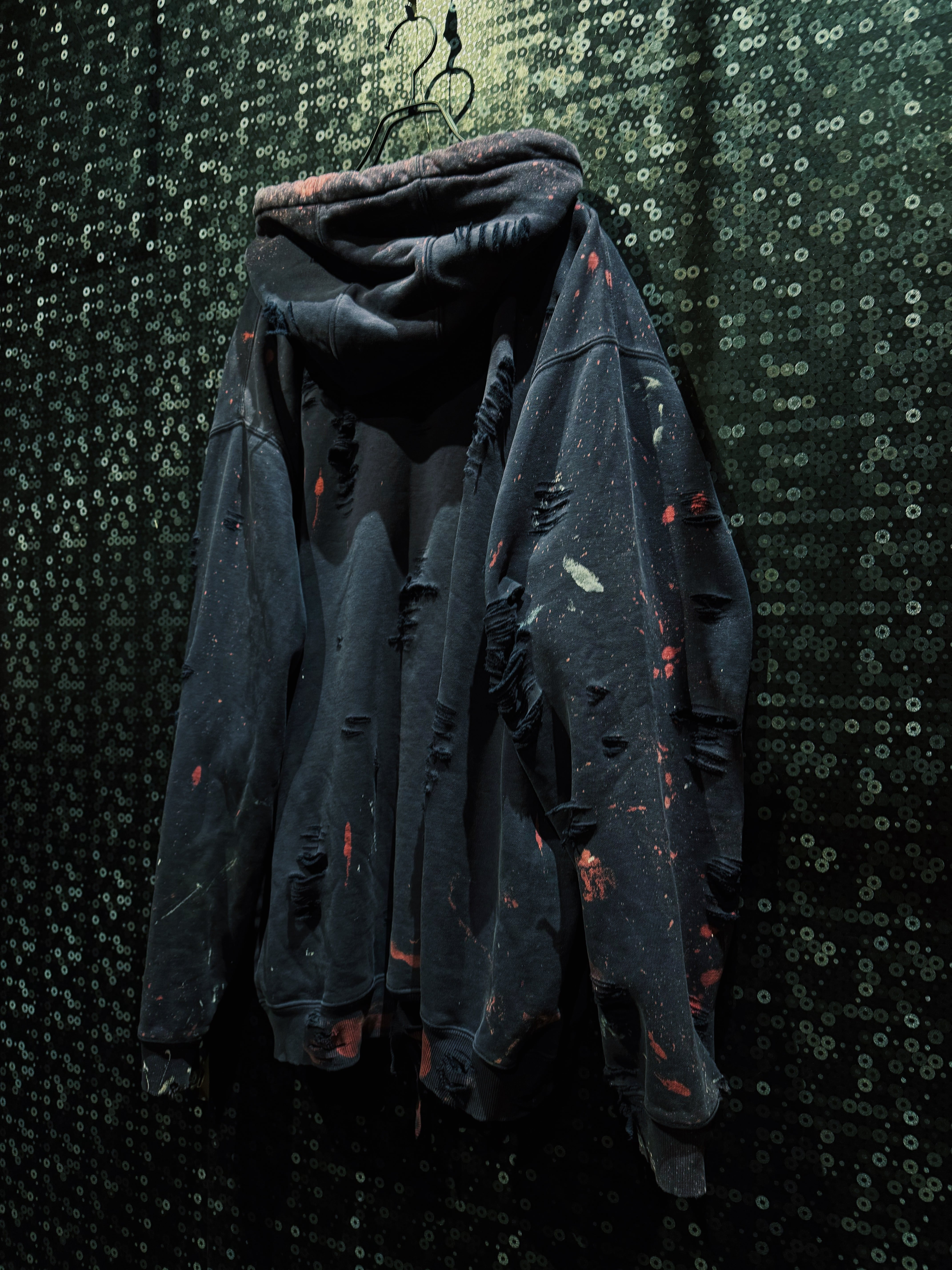 ボディはフェードしたブラック。厚みのある裏毛スウェットに、全体へ無数のクラッシュ加工。袖・身頃・フードに至るまでランダムに入るダメージは、均一ではなく“削られた痕”のような荒々しさを持つ。さらに赤や生成りのペイントが飛び散り、まるで作業現場か、あるいは戦場を経たような空気を纏う。