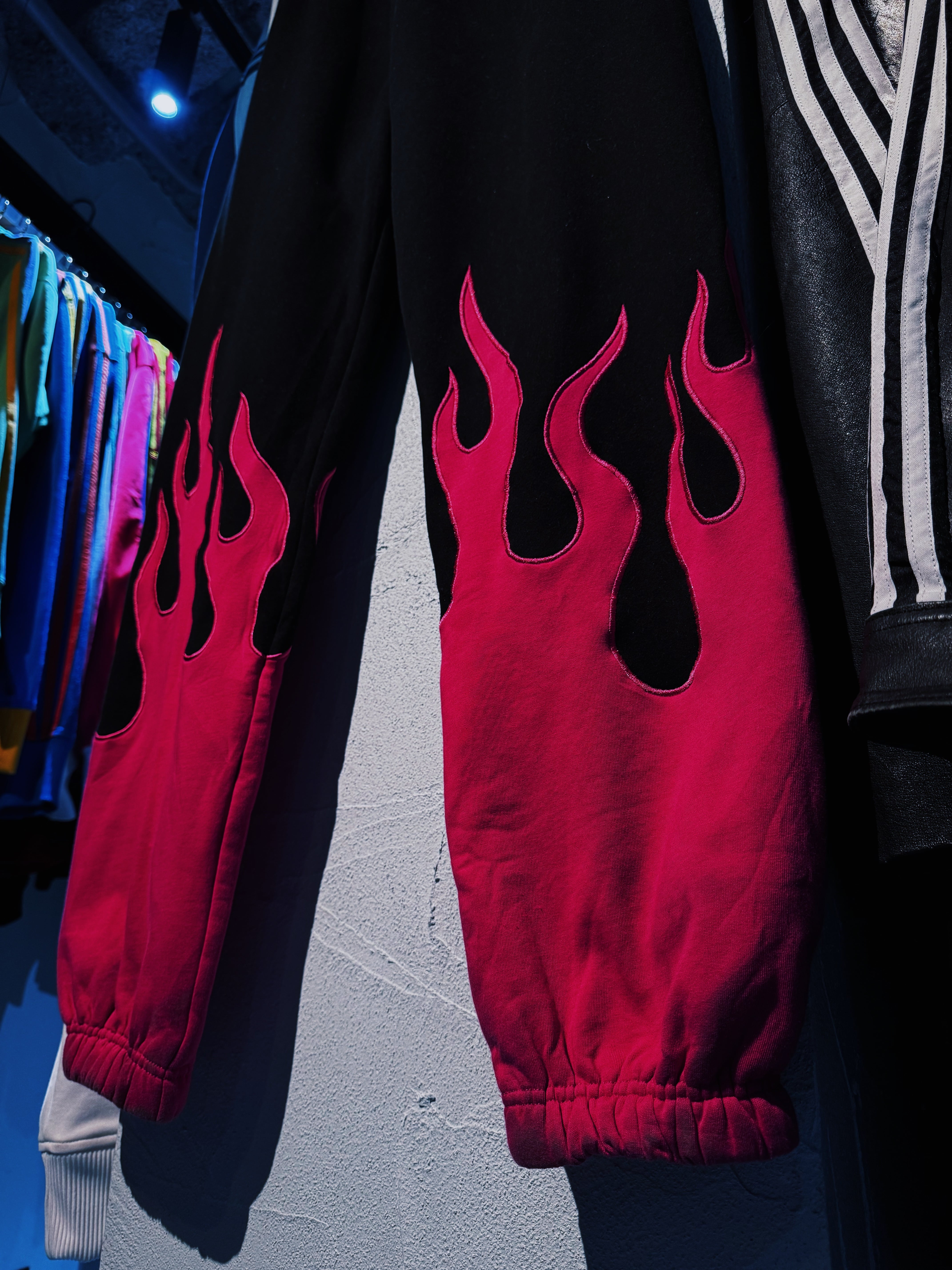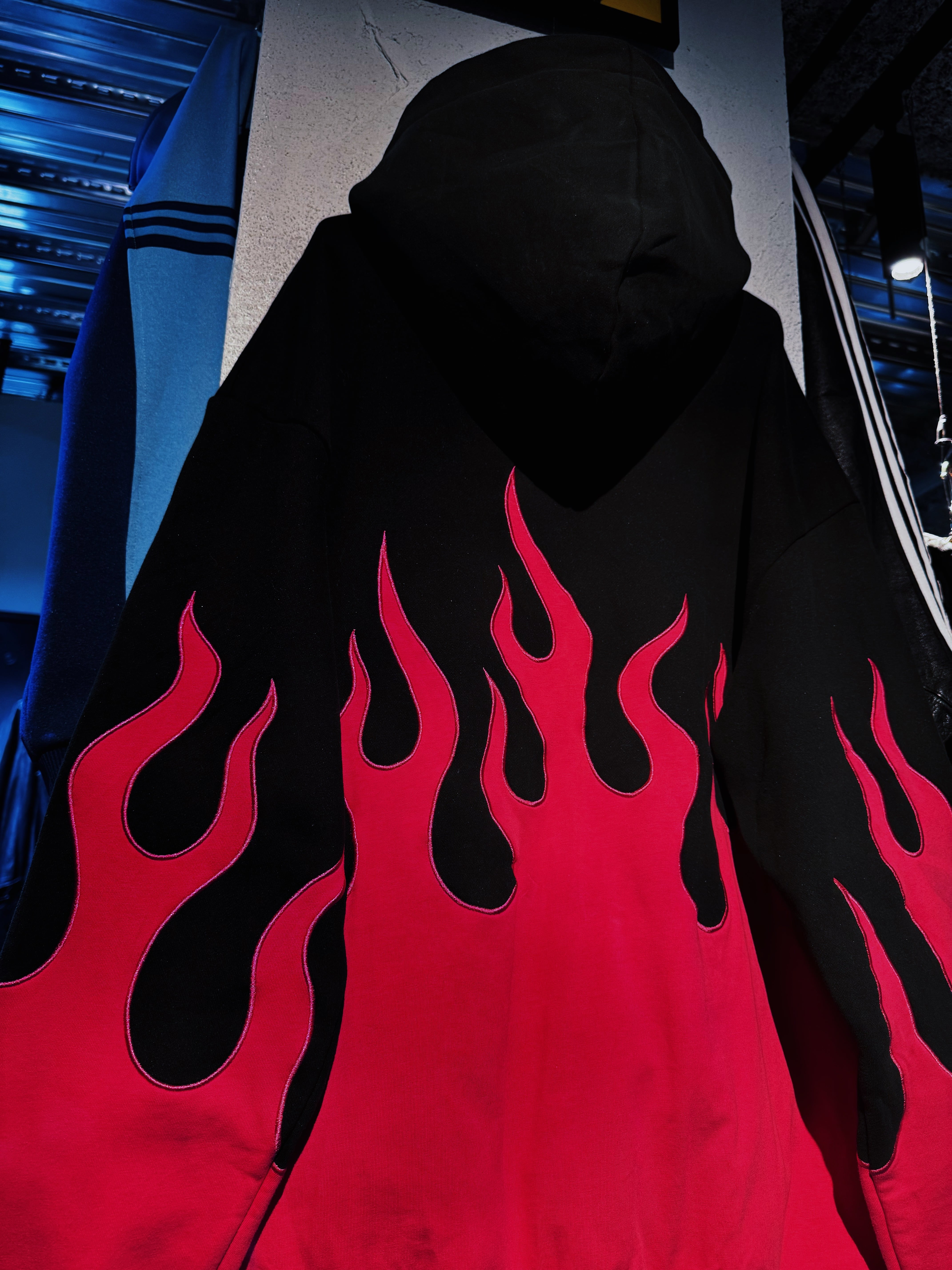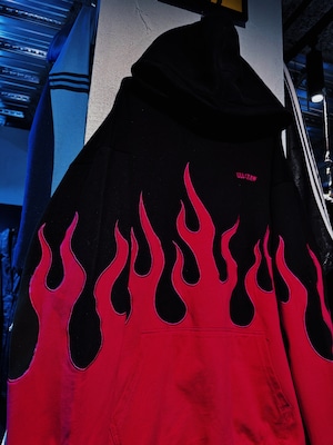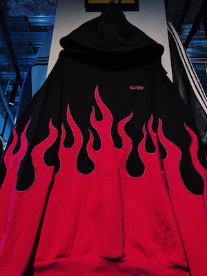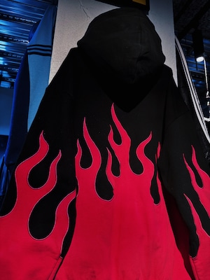 真っ黒なボディにフーディー、パンツ共にローズピンクカラーでファイヤーパターンがあしらわれたストリートとアバンギャルドさが融合したセットアップ。