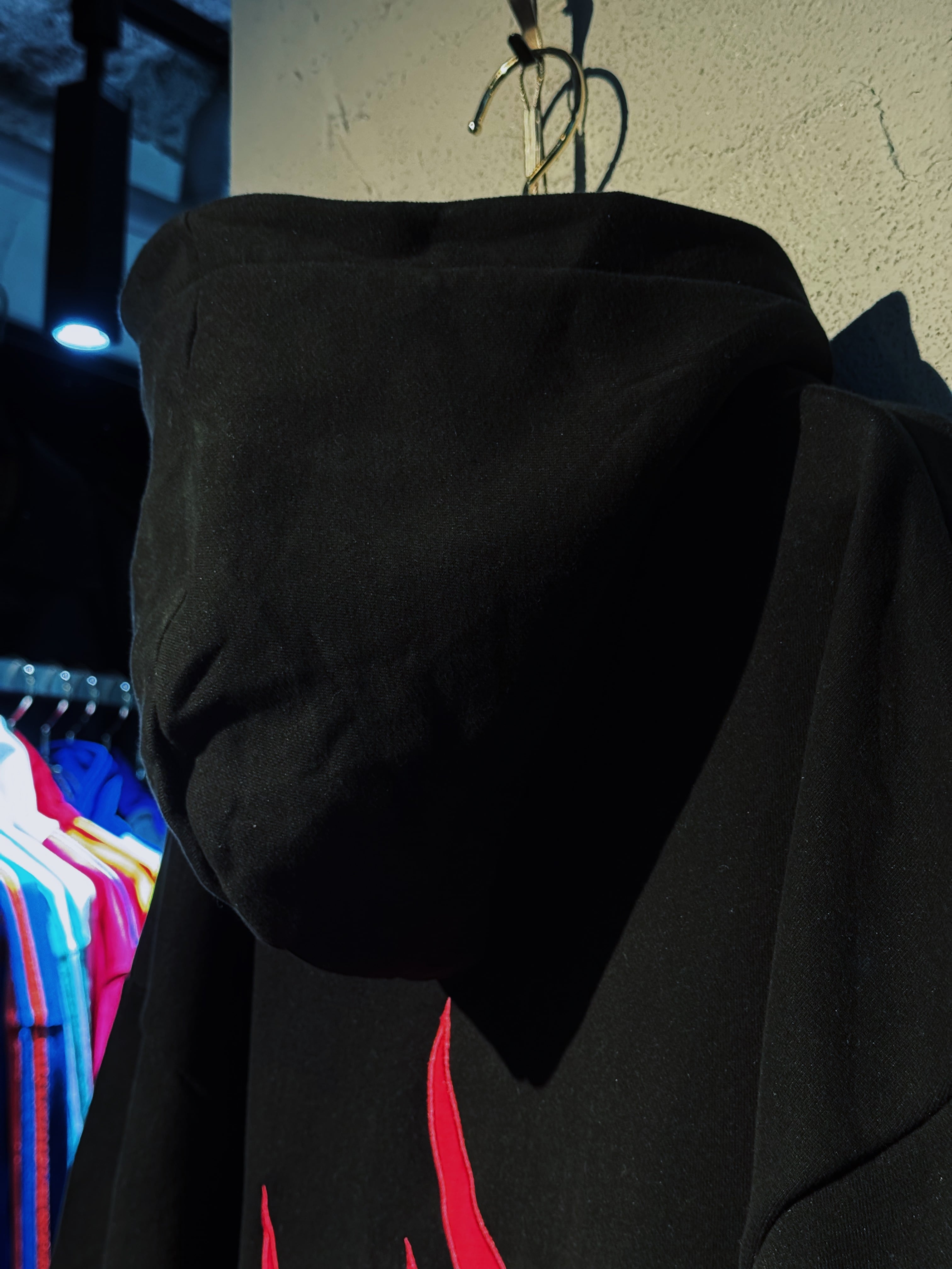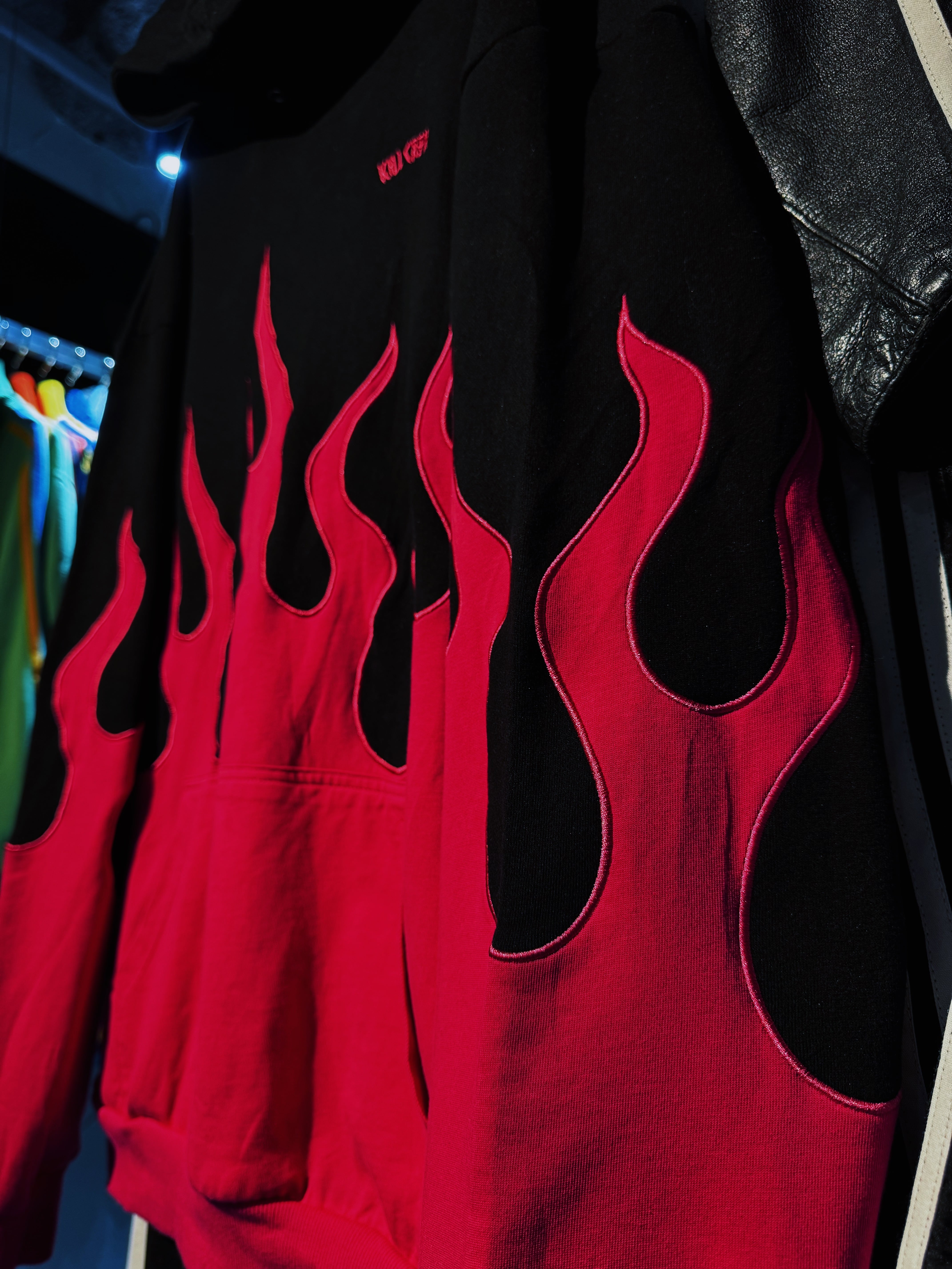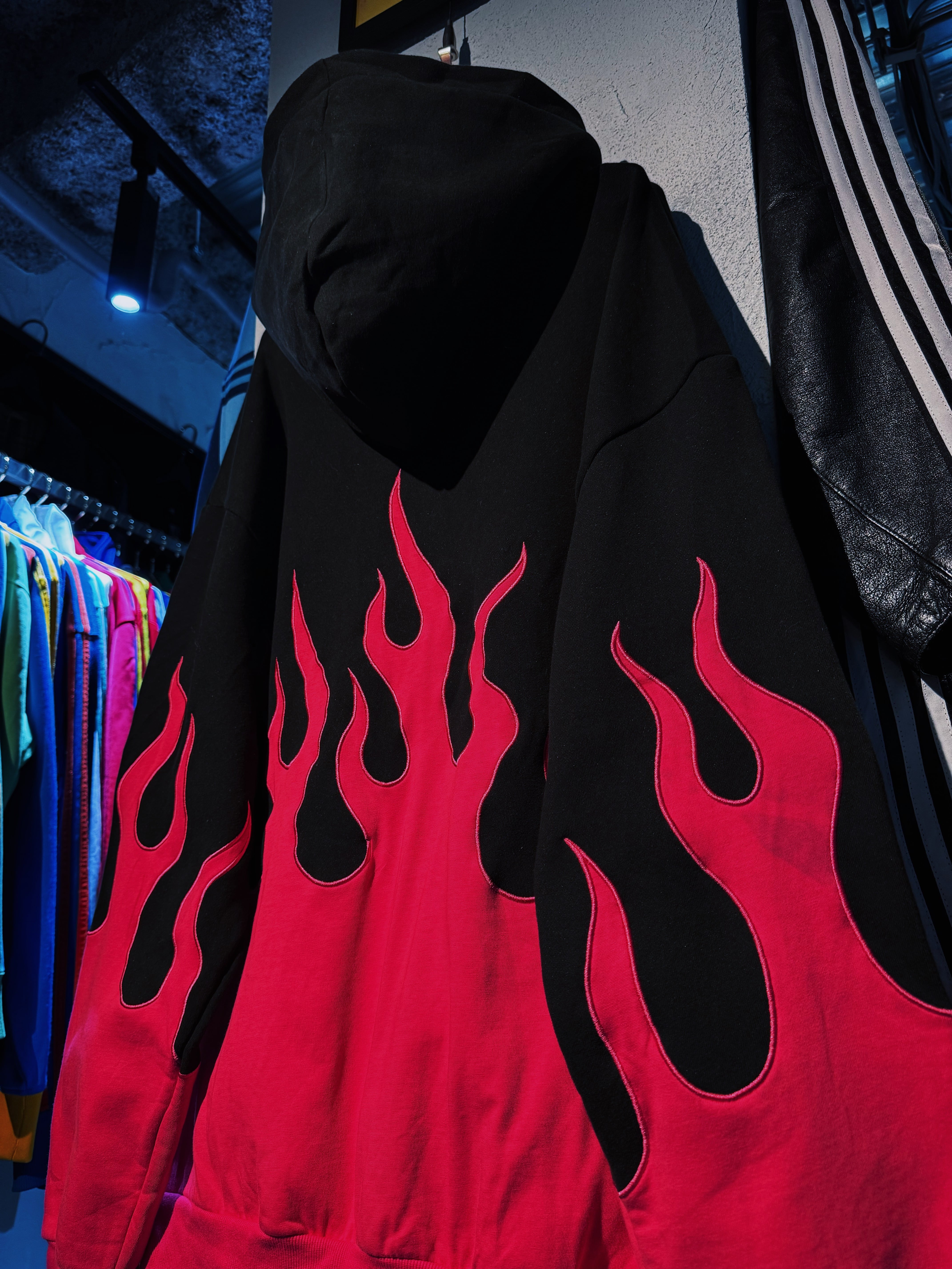 真っ黒なボディにフーディー、パンツ共にローズピンクカラーでファイヤーパターンがあしらわれたストリートとアバンギャルドさが融合したセットアップ。