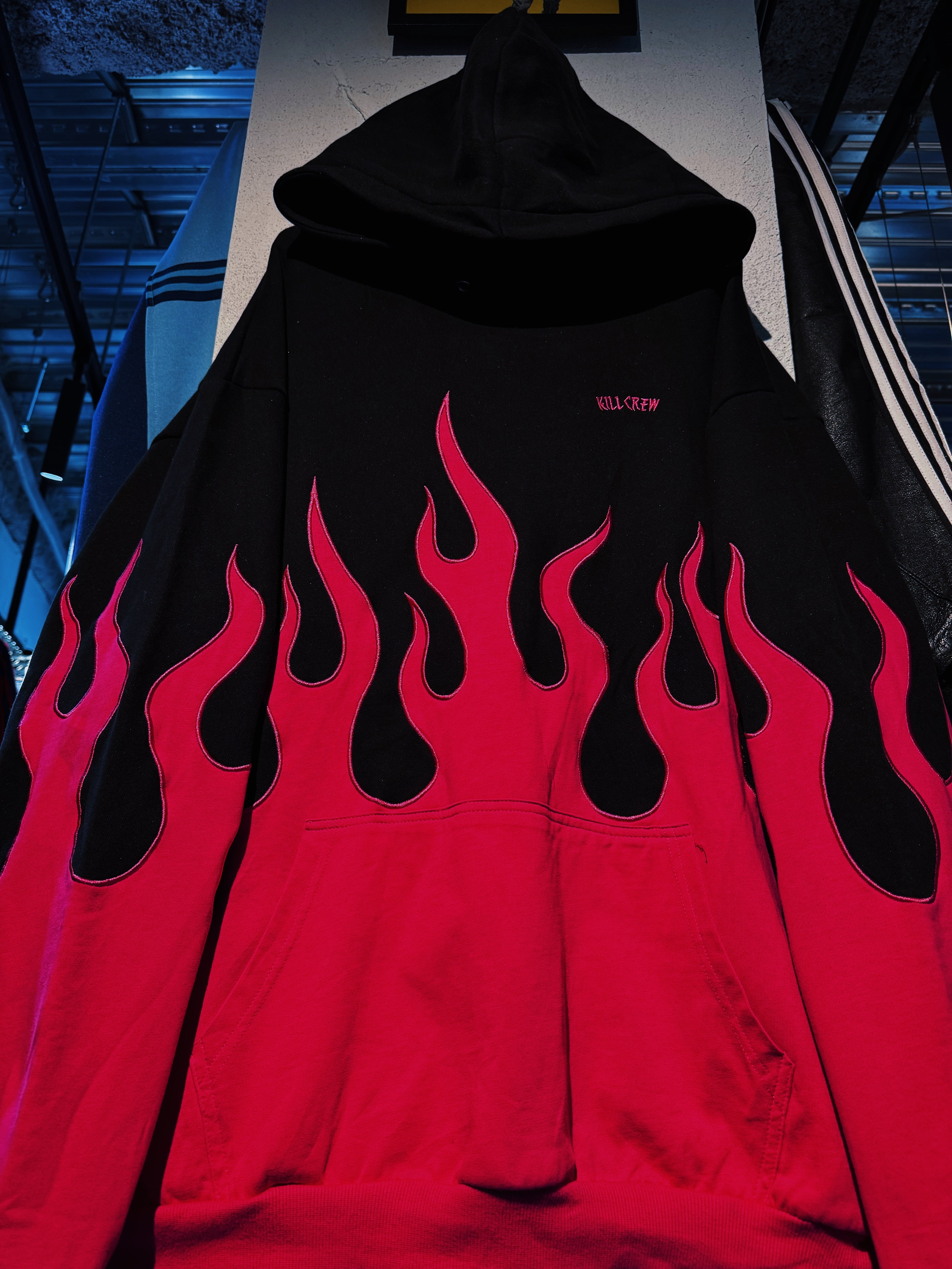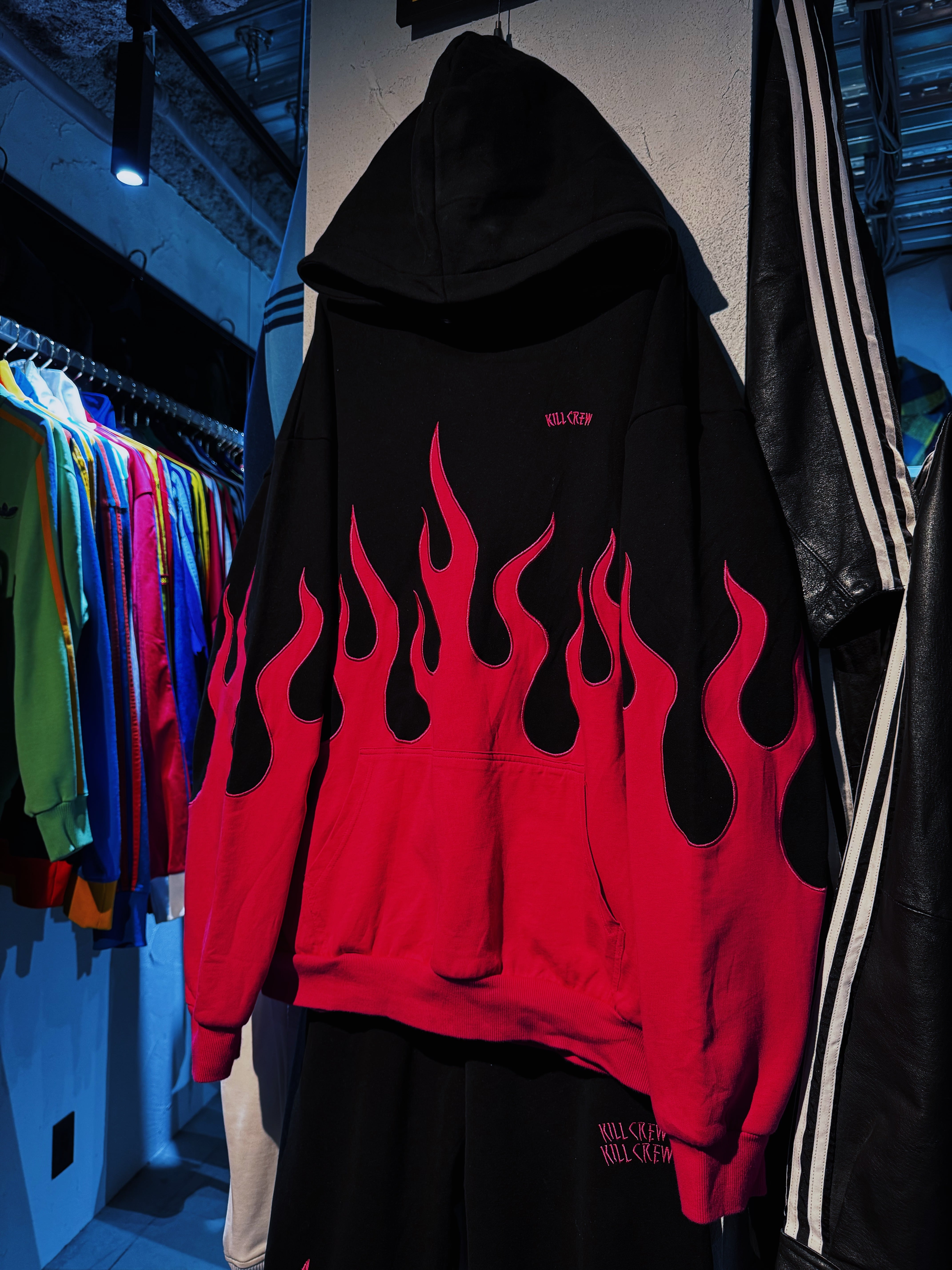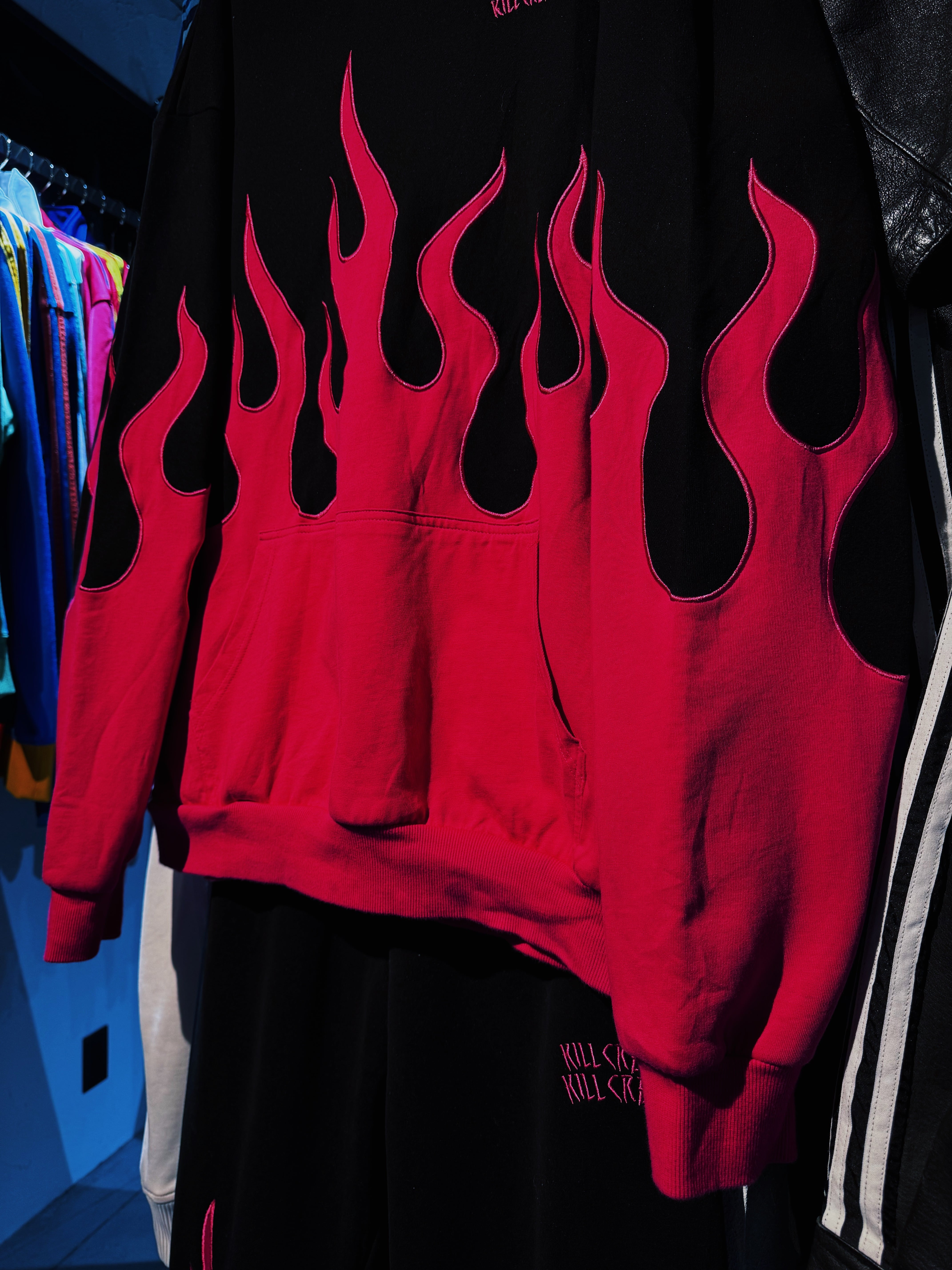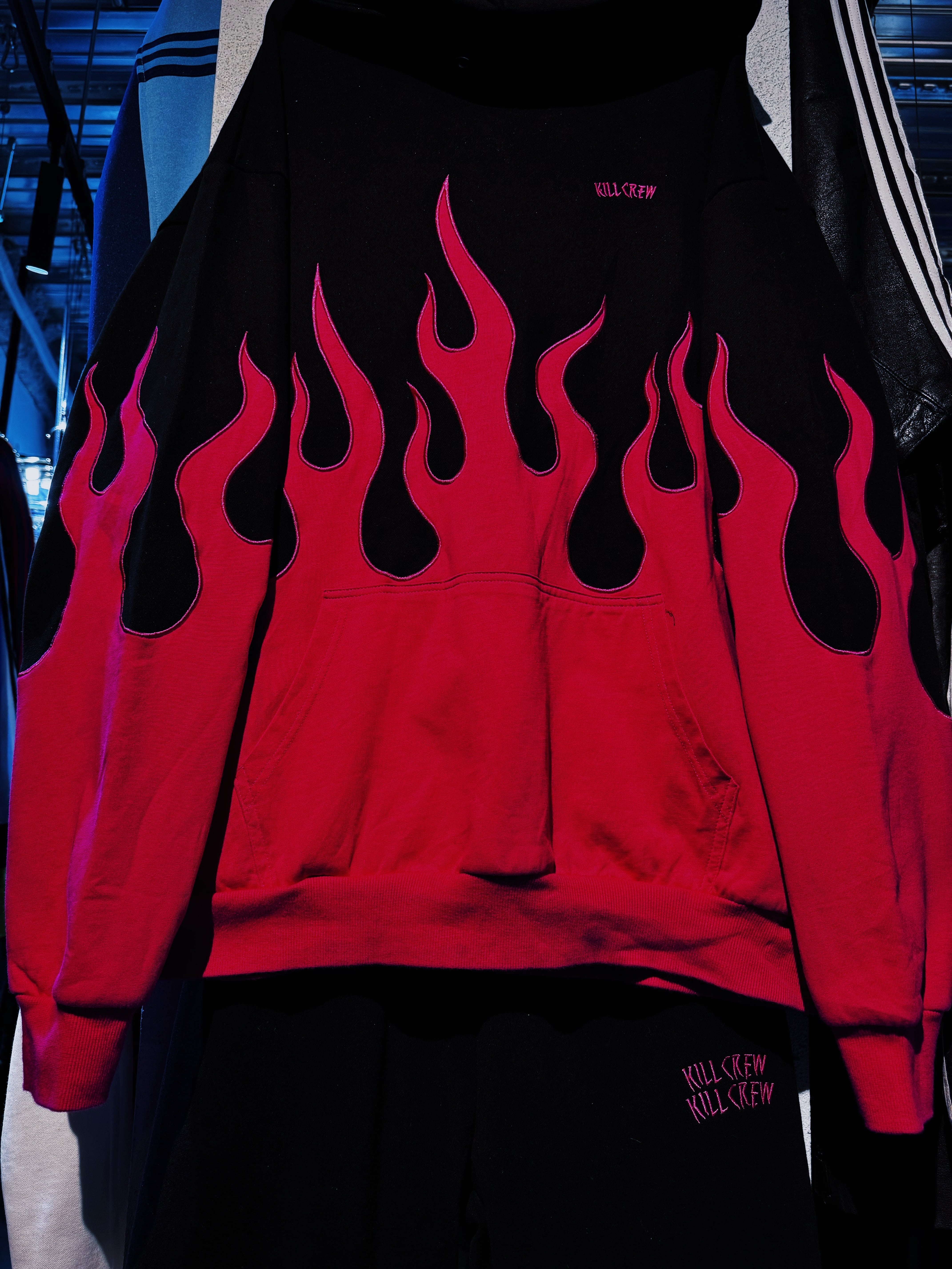 "KILL CREW"rose pink color fire pattern embroidery hoodie set up