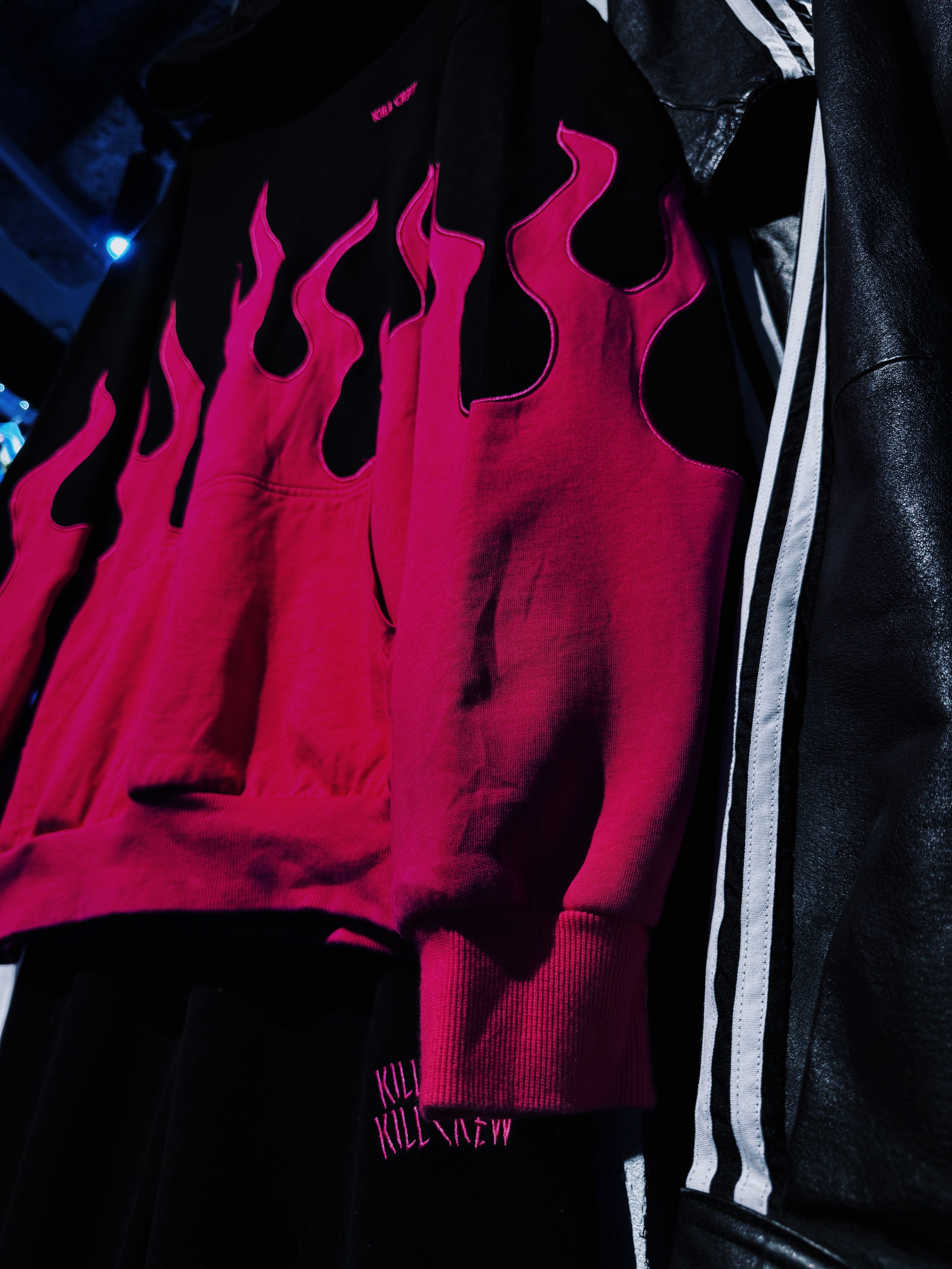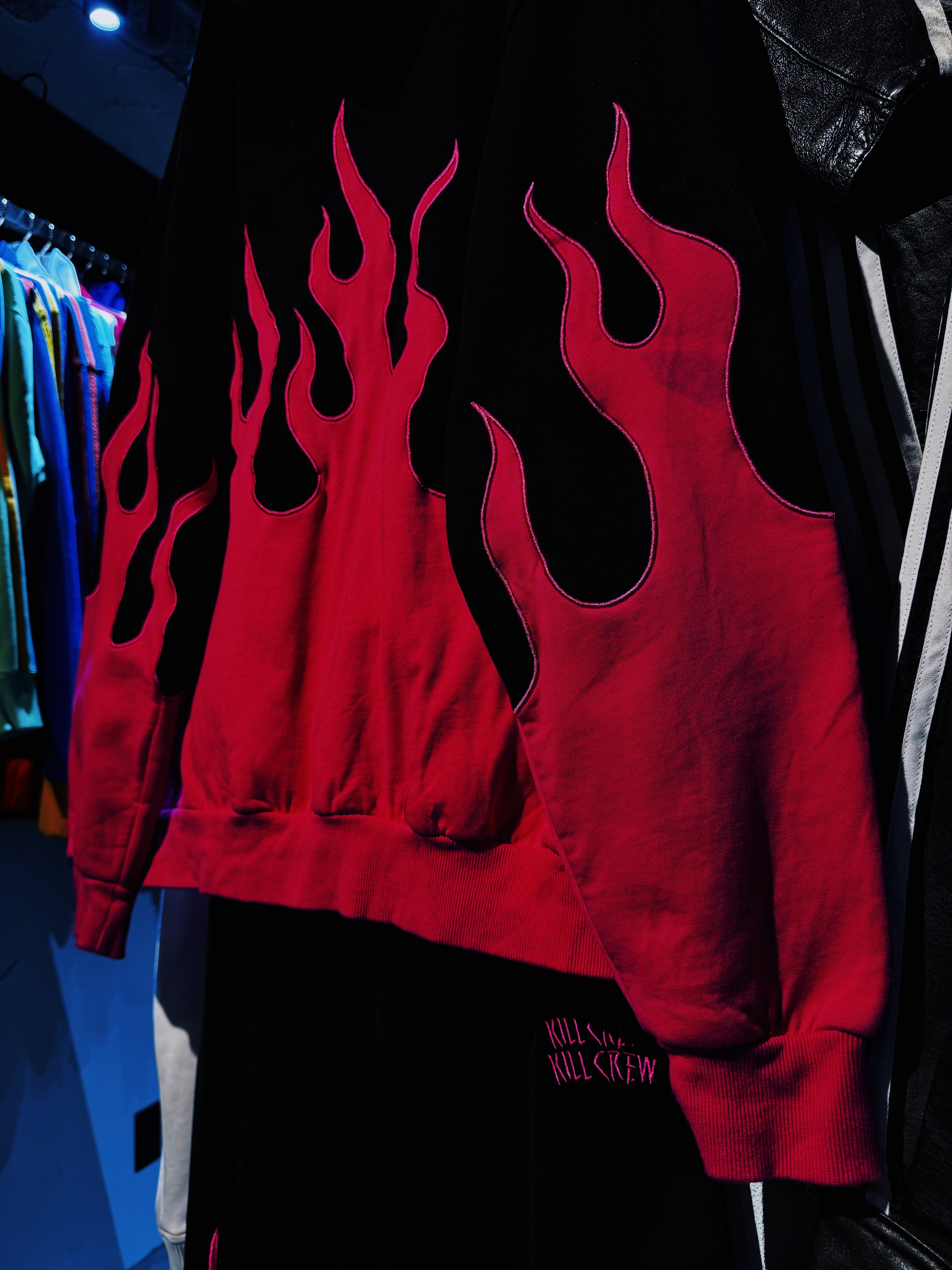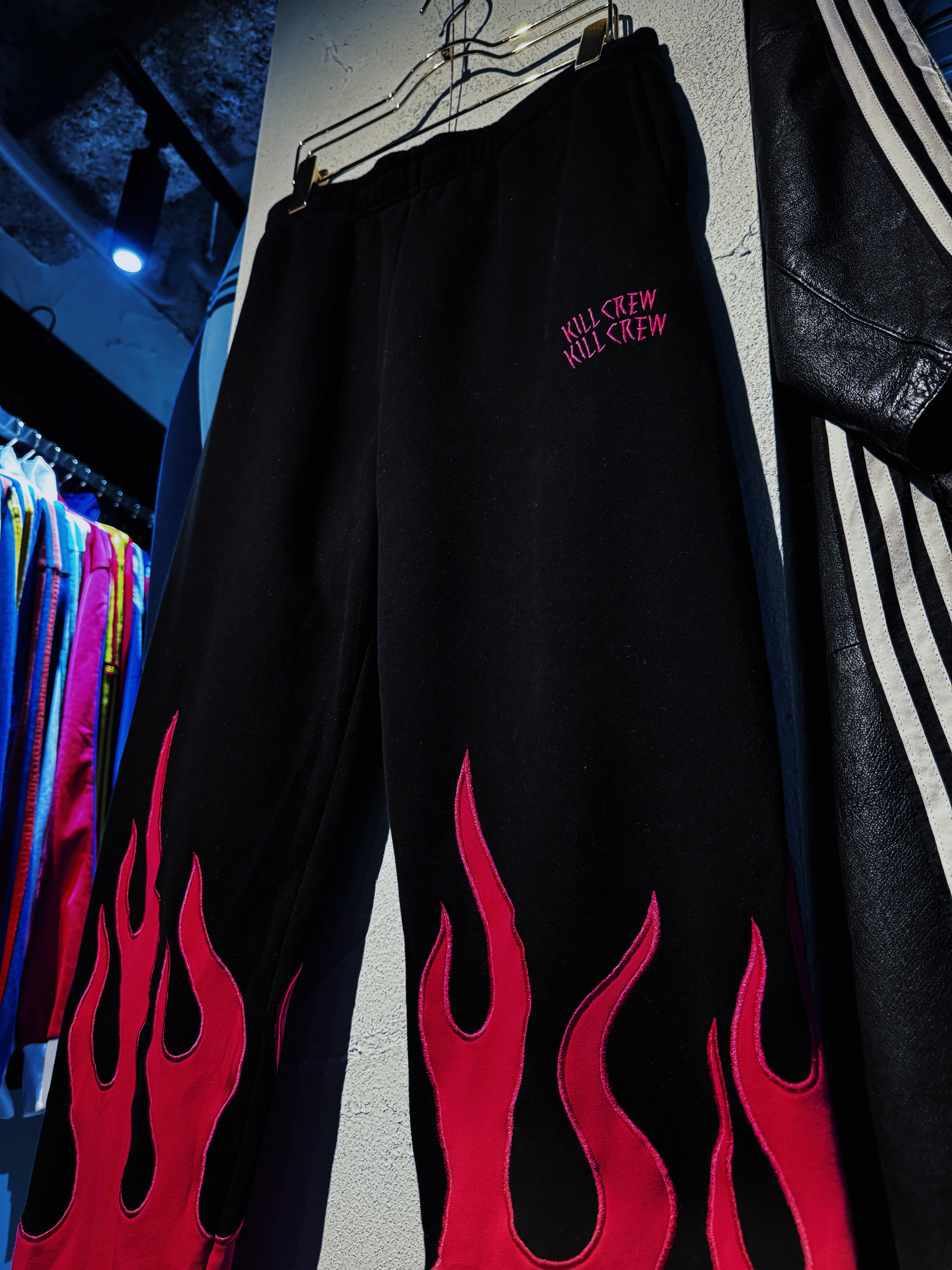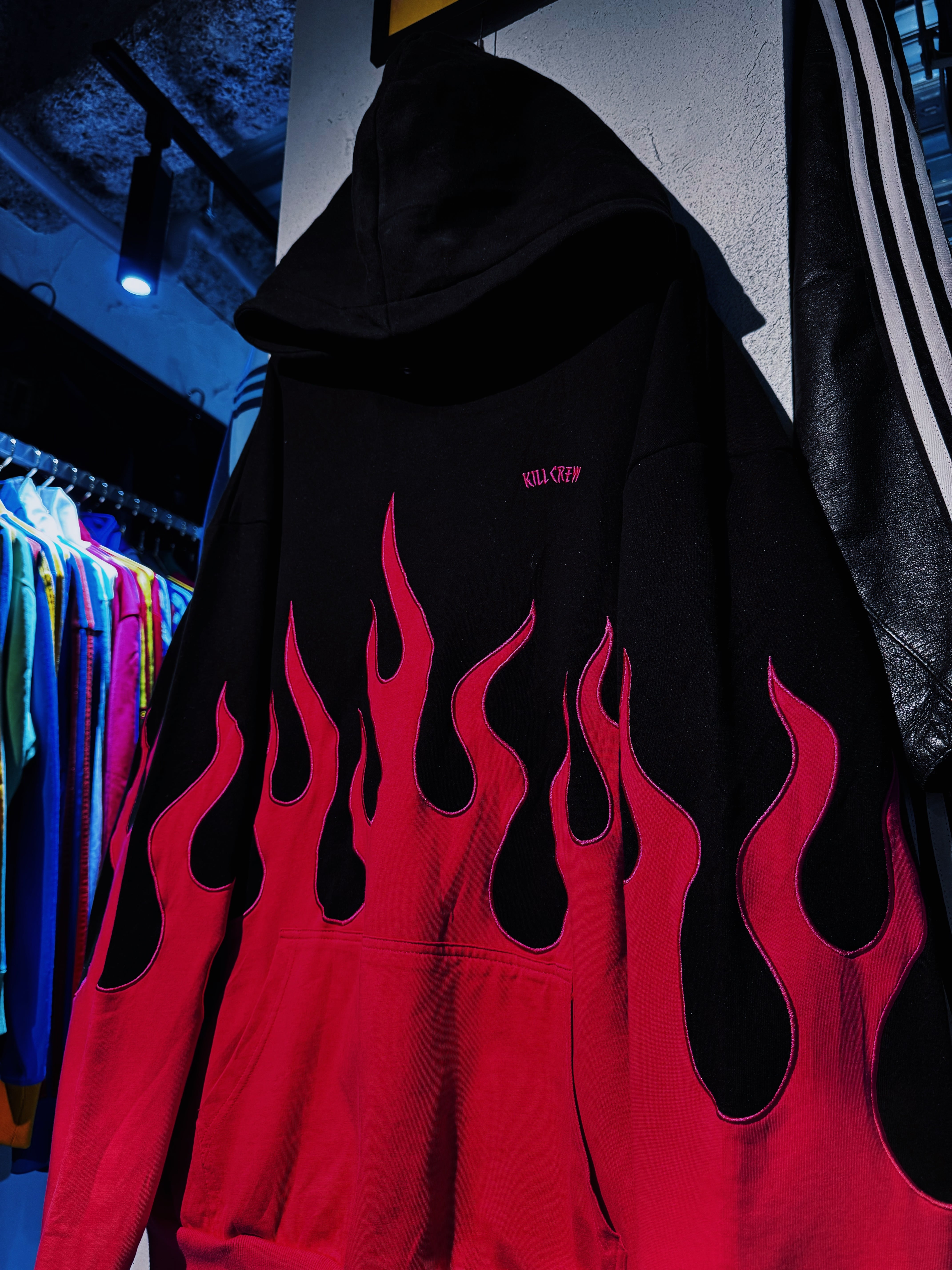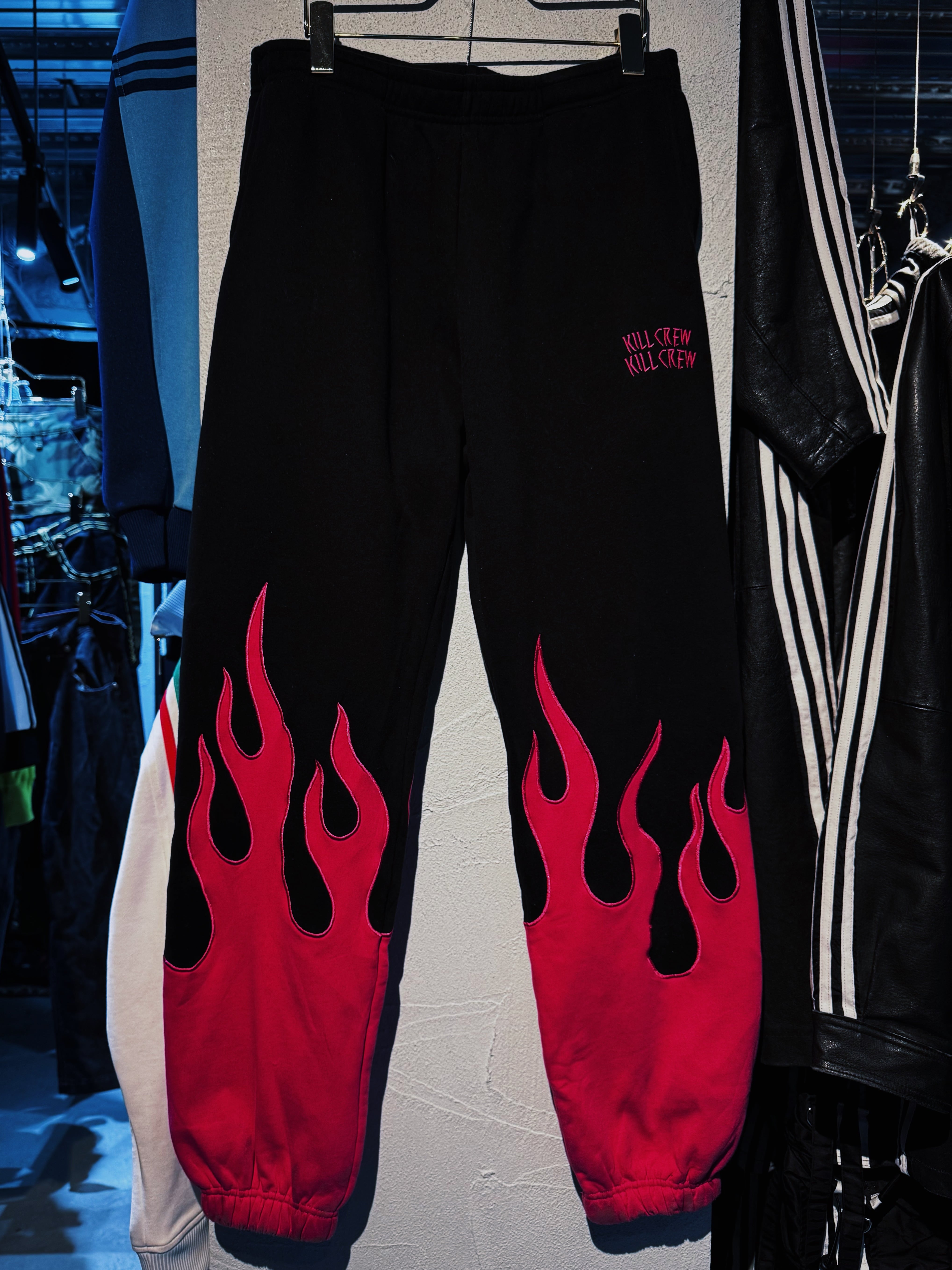 "KILL CREW"rose pink color fire pattern embroidery hoodie set up