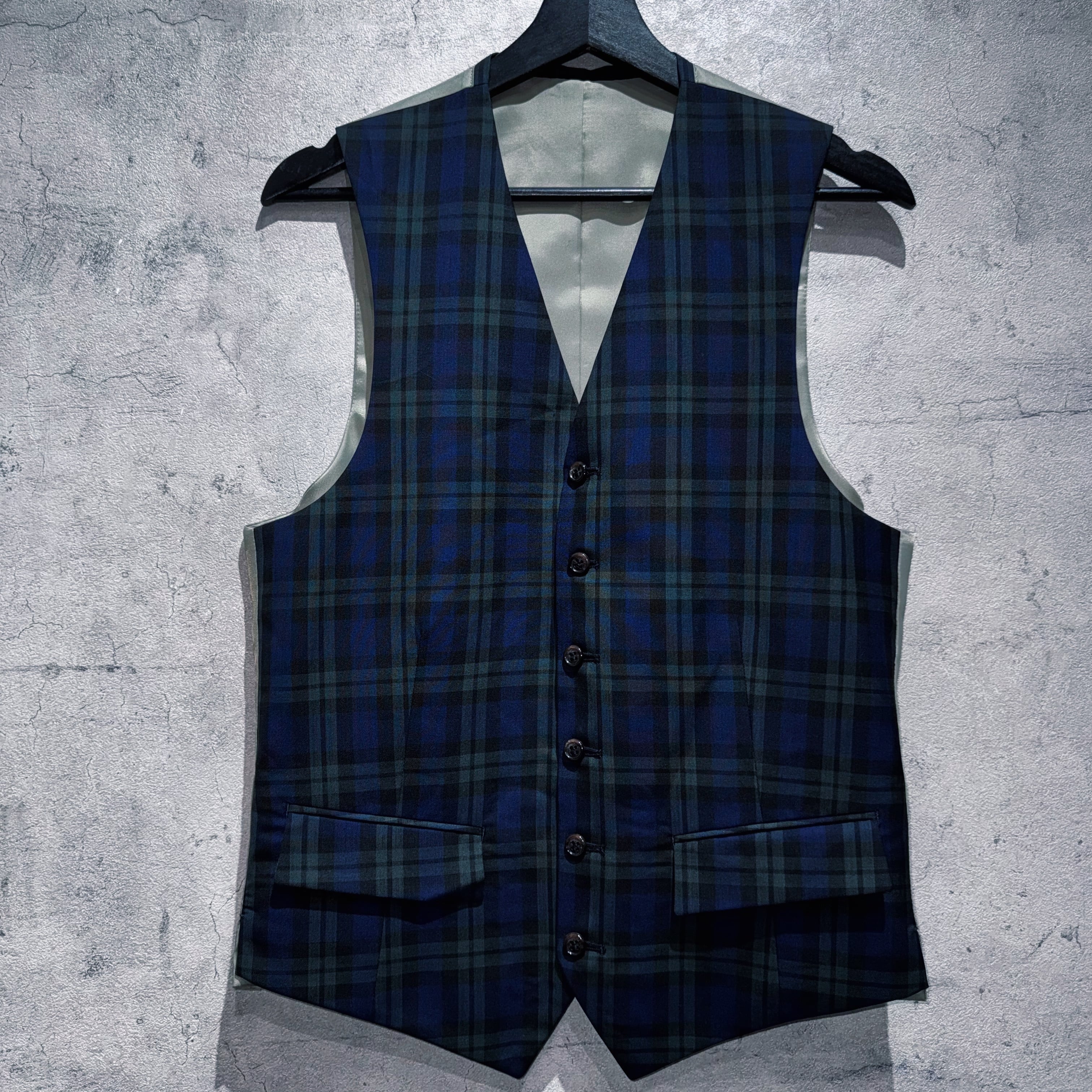 紳士的なチェックパターンを全面に載せたセットアップ。今回は3ピースでご用意。古着で3ピースは中々揃わないです…