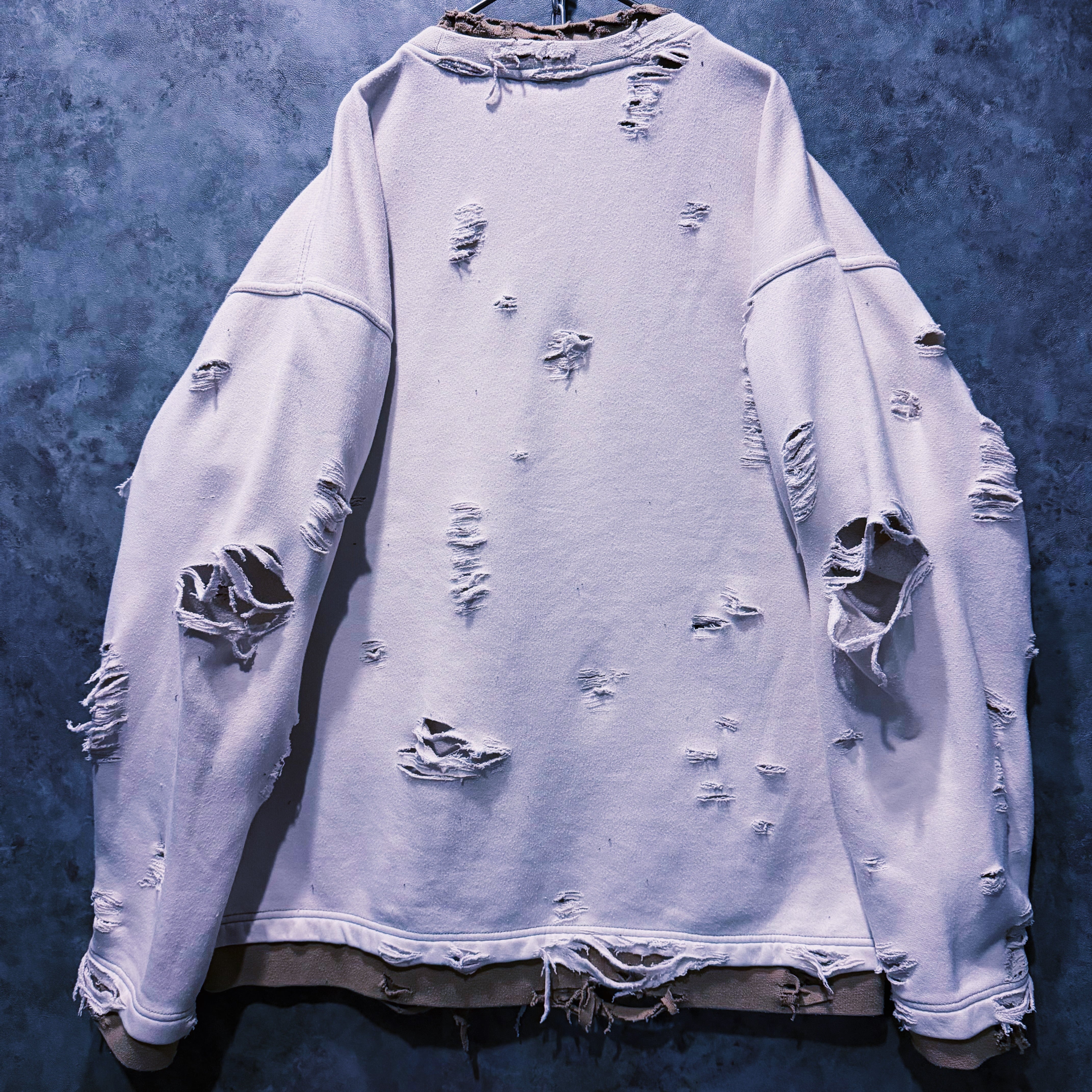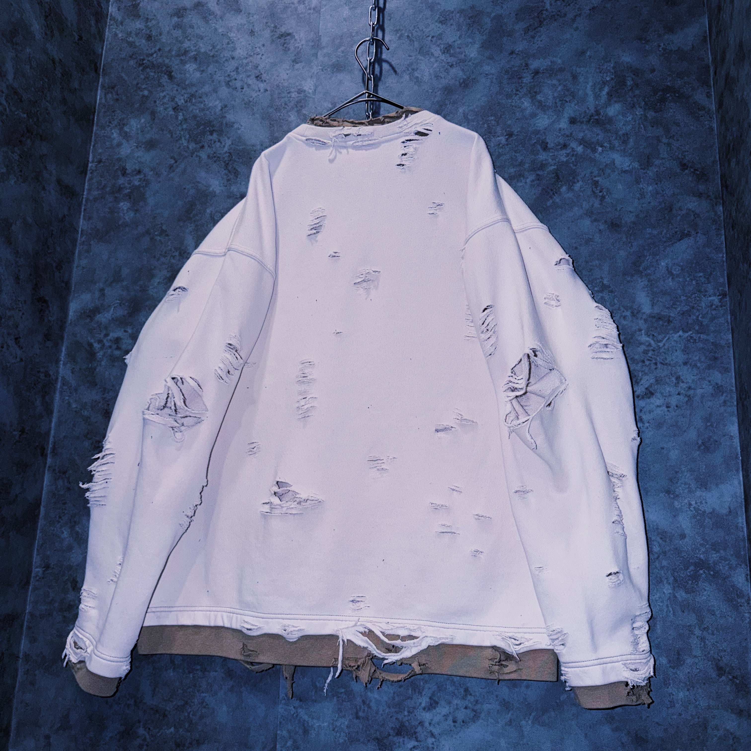柔らかなホワイトカラーは質感もかなりカジュアルで可愛らしい雰囲気。カーキがのぞかせるアースカラーがアクセントとしてうまく主張してくれており、ダメージと相待ってラフに着れる一枚です。