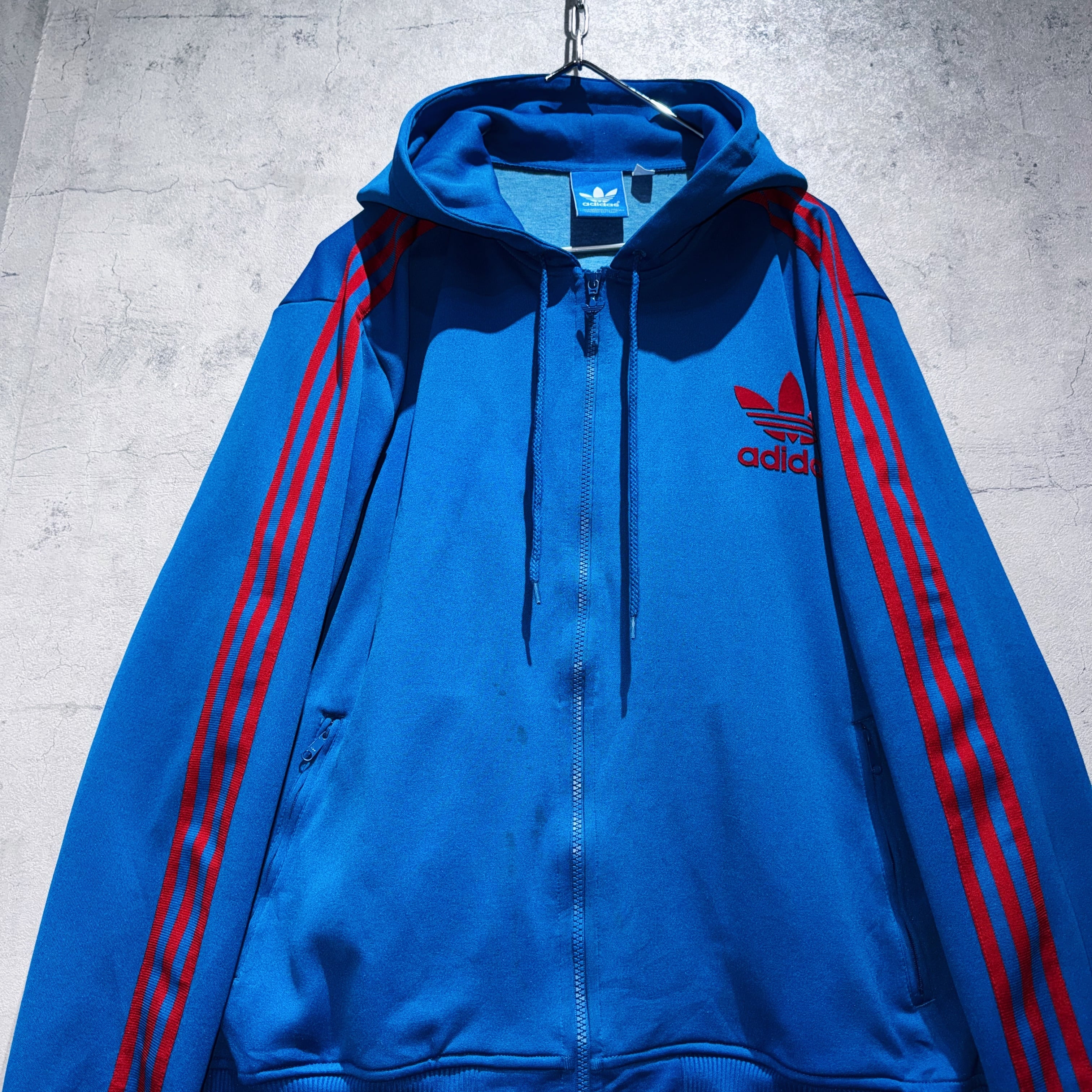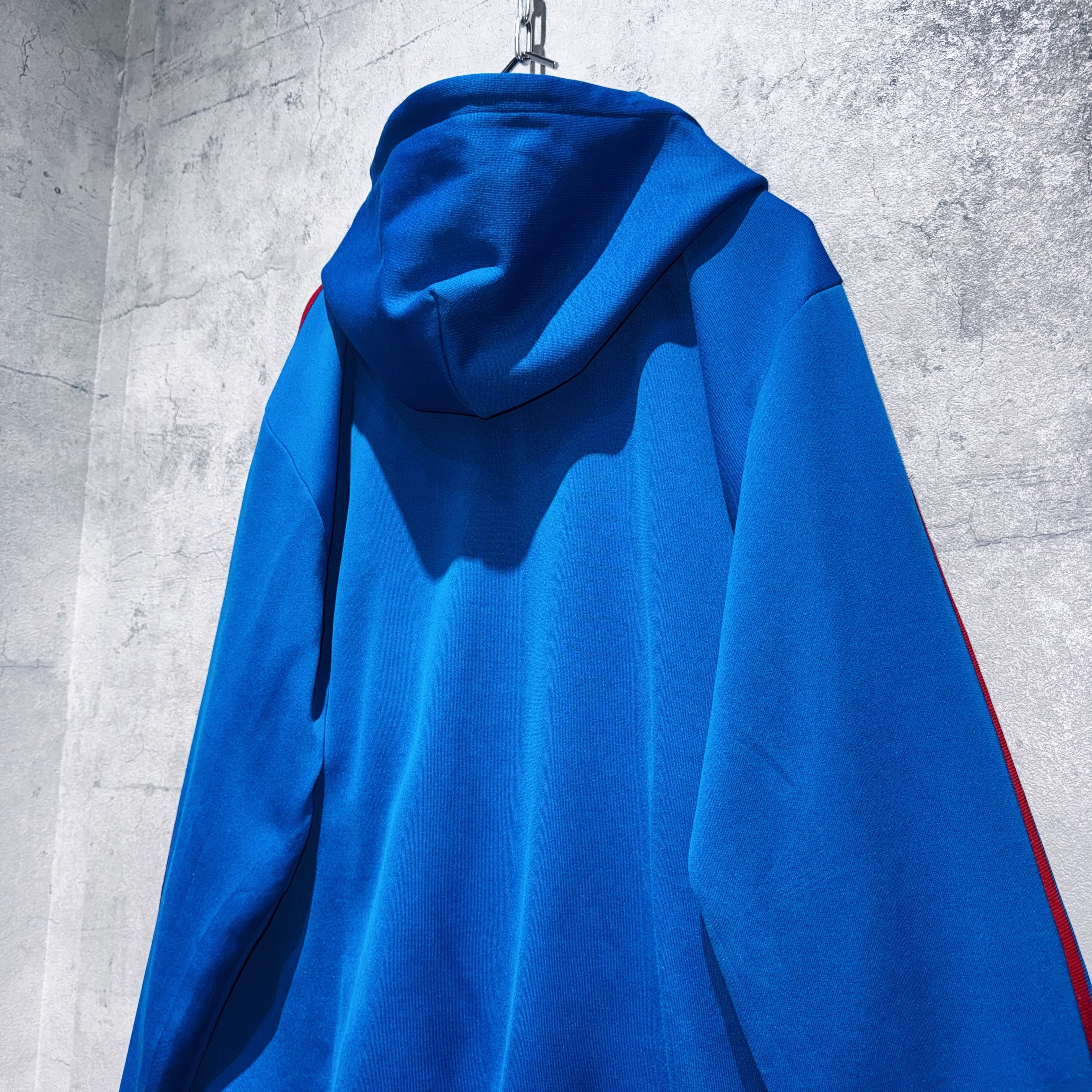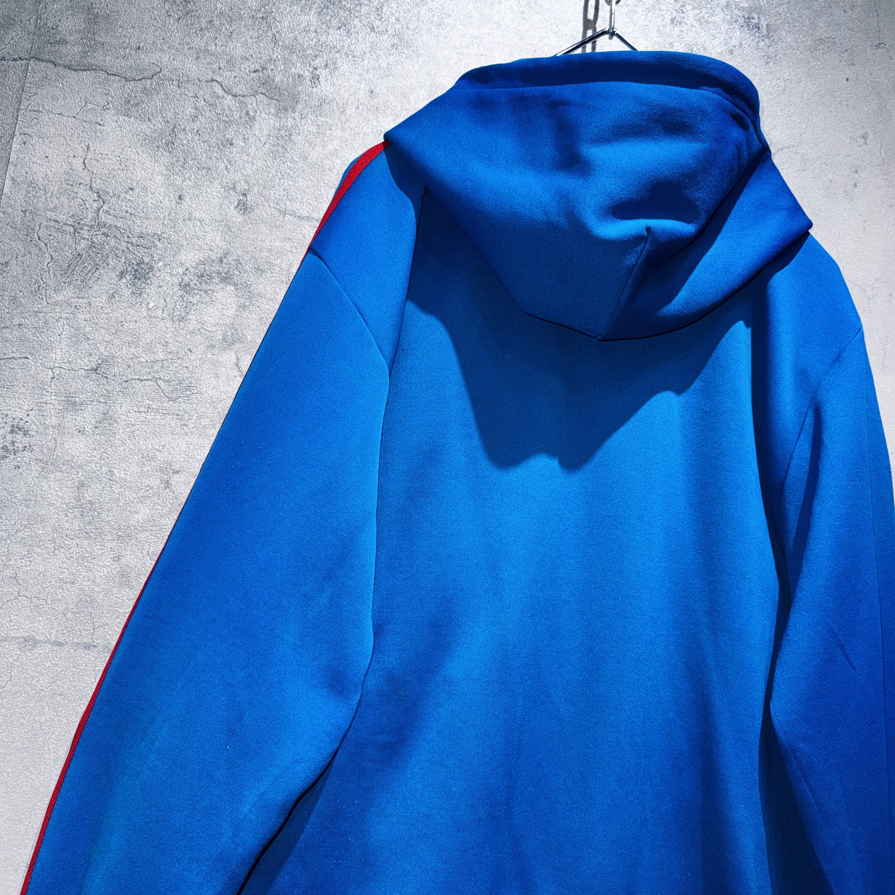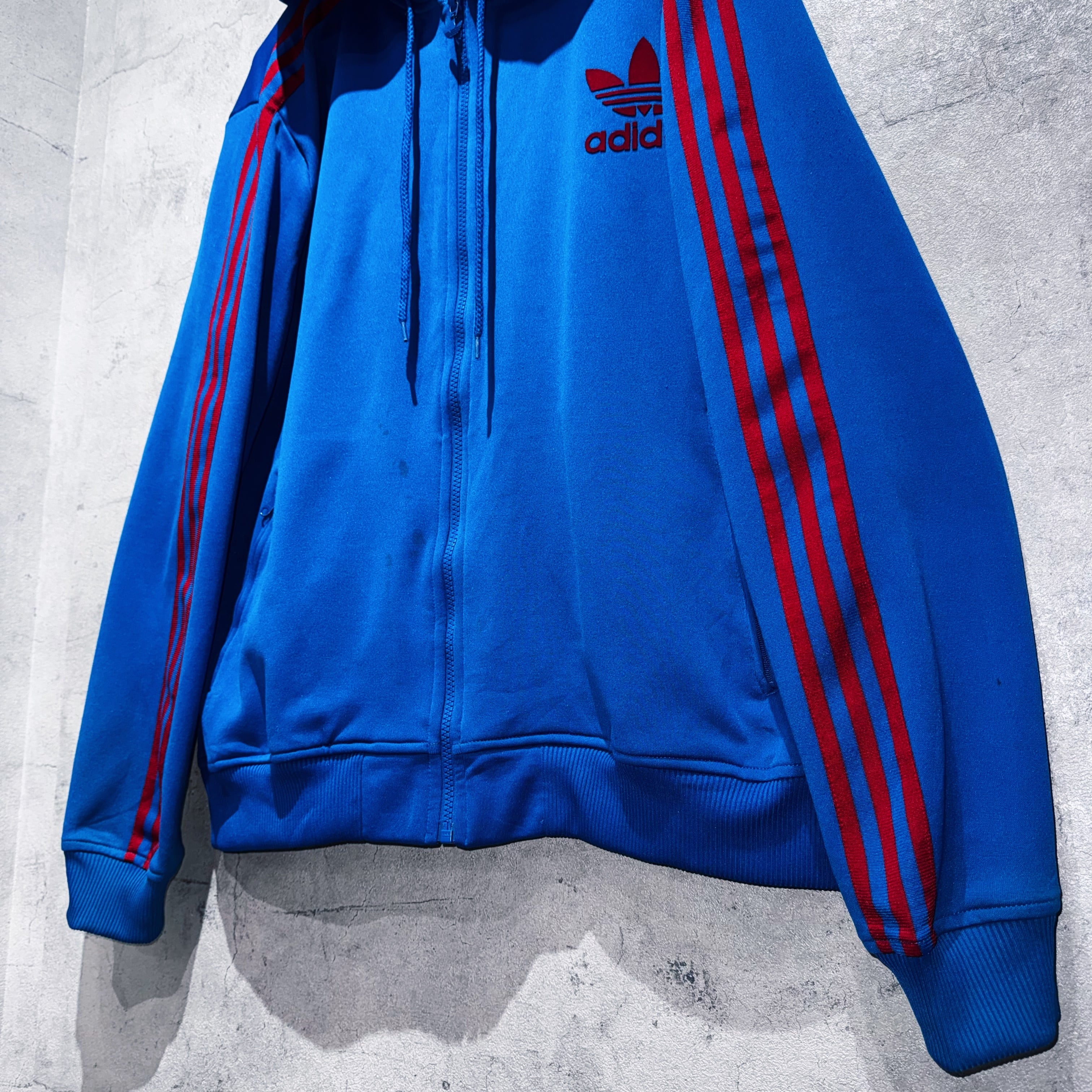"ADIDAS"のジャージでは珍しいフードタイプのトラックジャケット。ブルーのボディに3ストライプスとトレフォイルロゴをあしらった無駄のないベーシックデザイン。