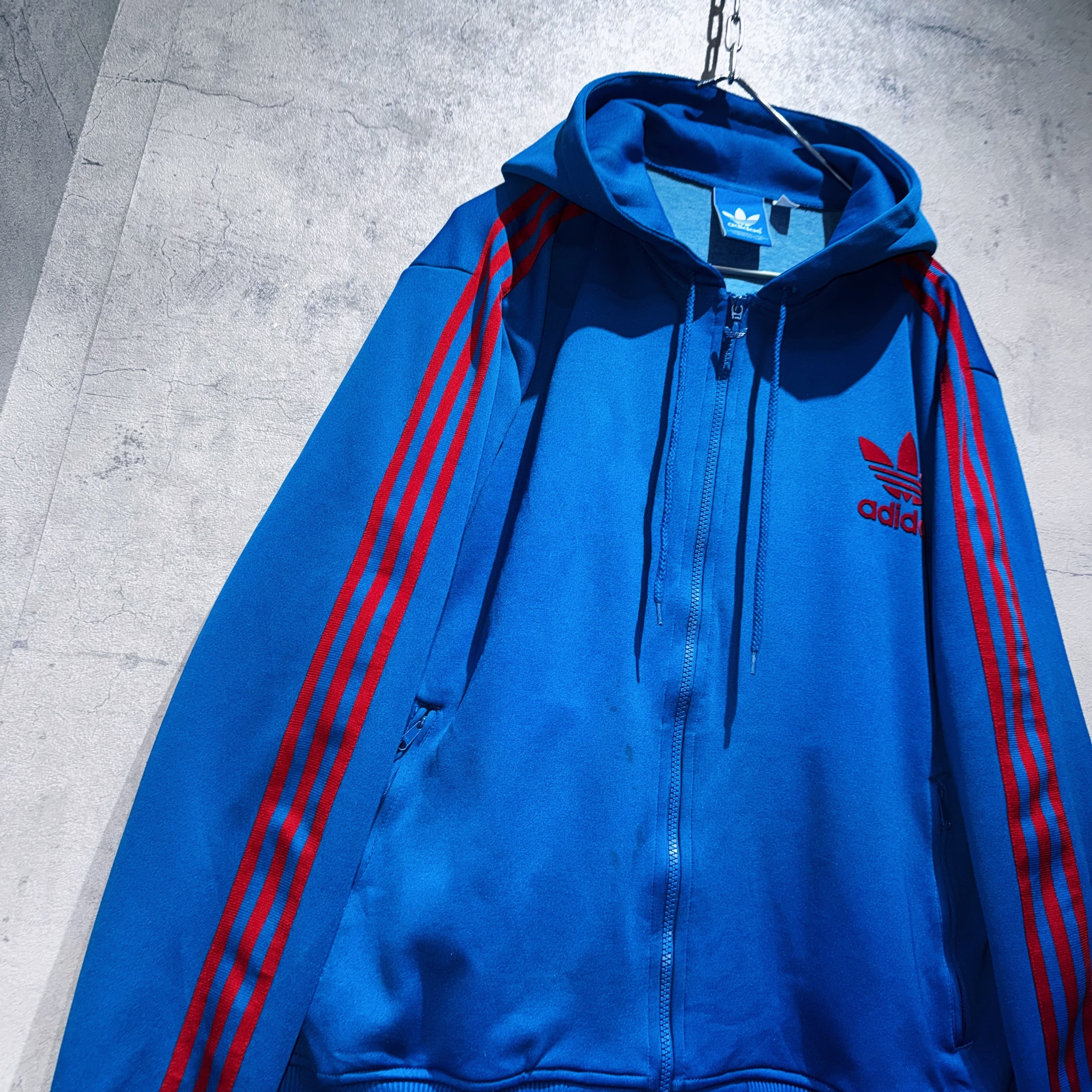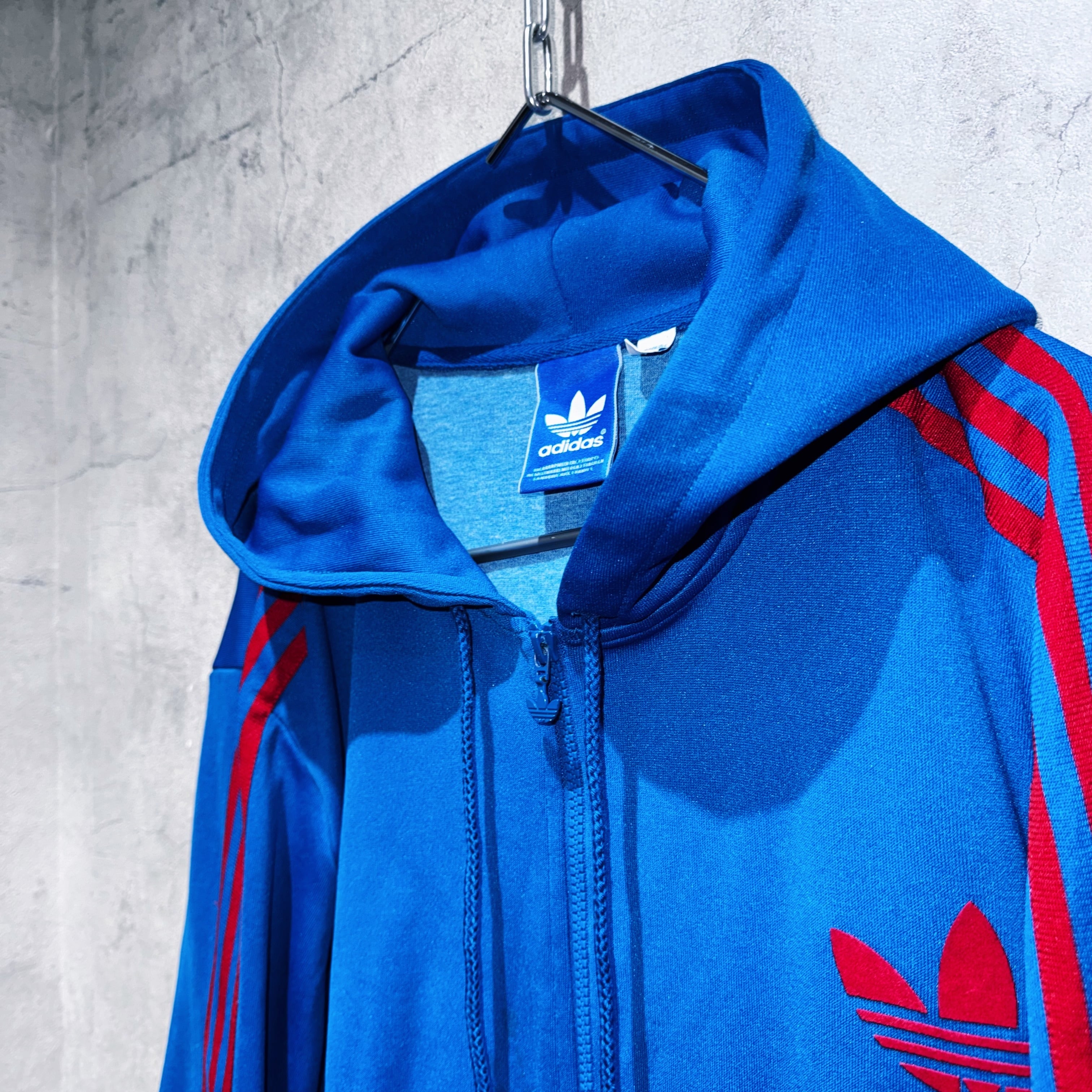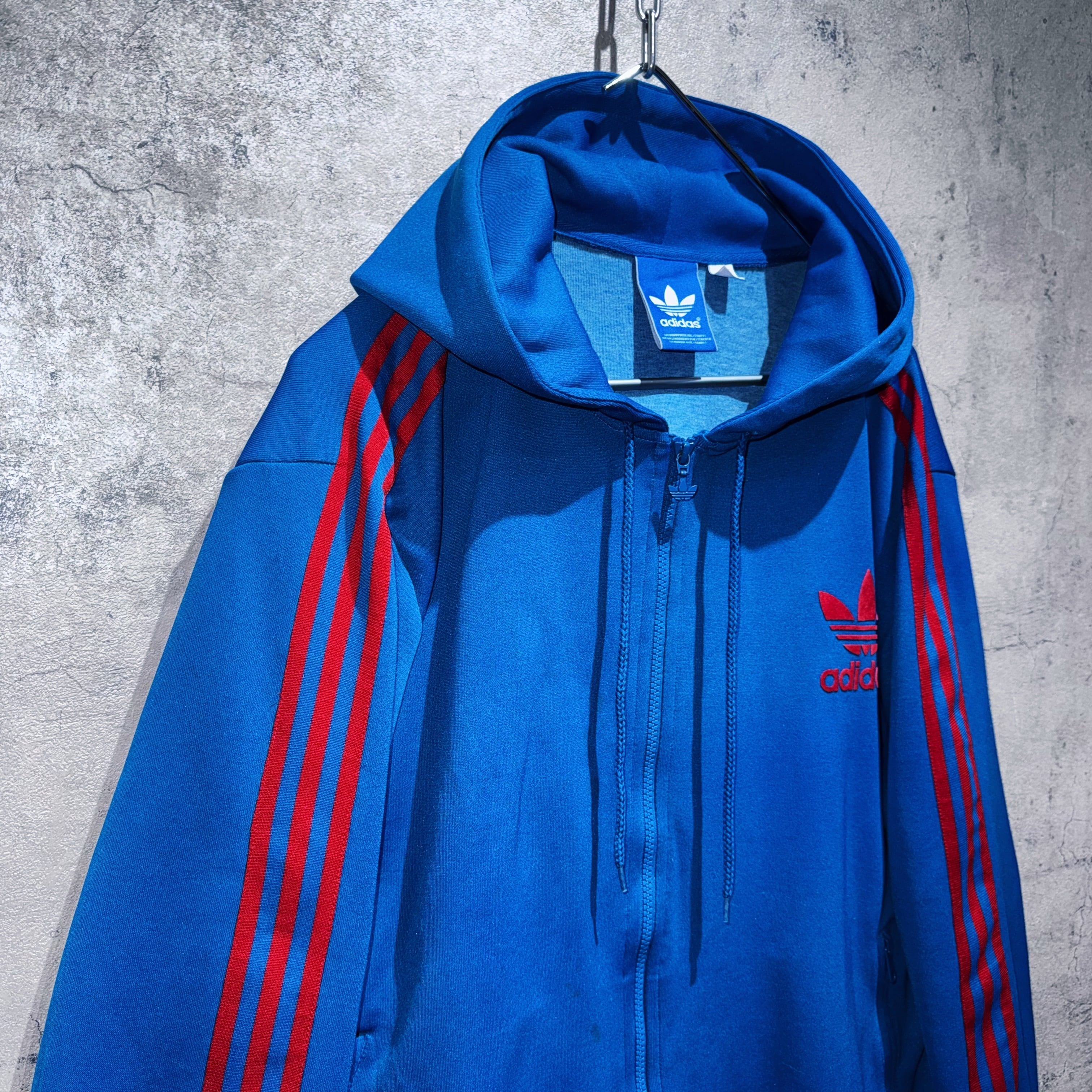 "ADIDAS"のジャージでは珍しいフードタイプのトラックジャケット。ブルーのボディに3ストライプスとトレフォイルロゴをあしらった無駄のないベーシックデザイン。