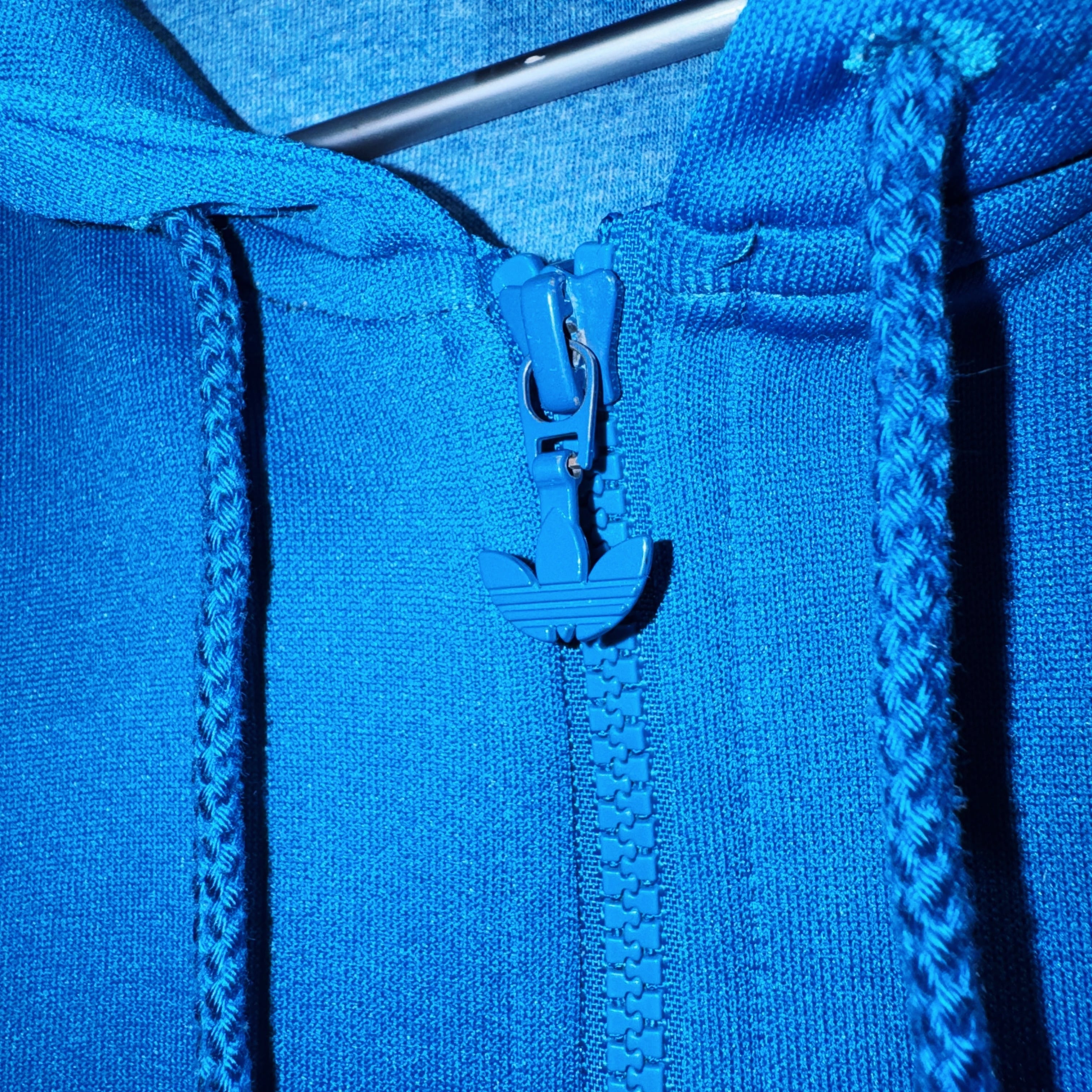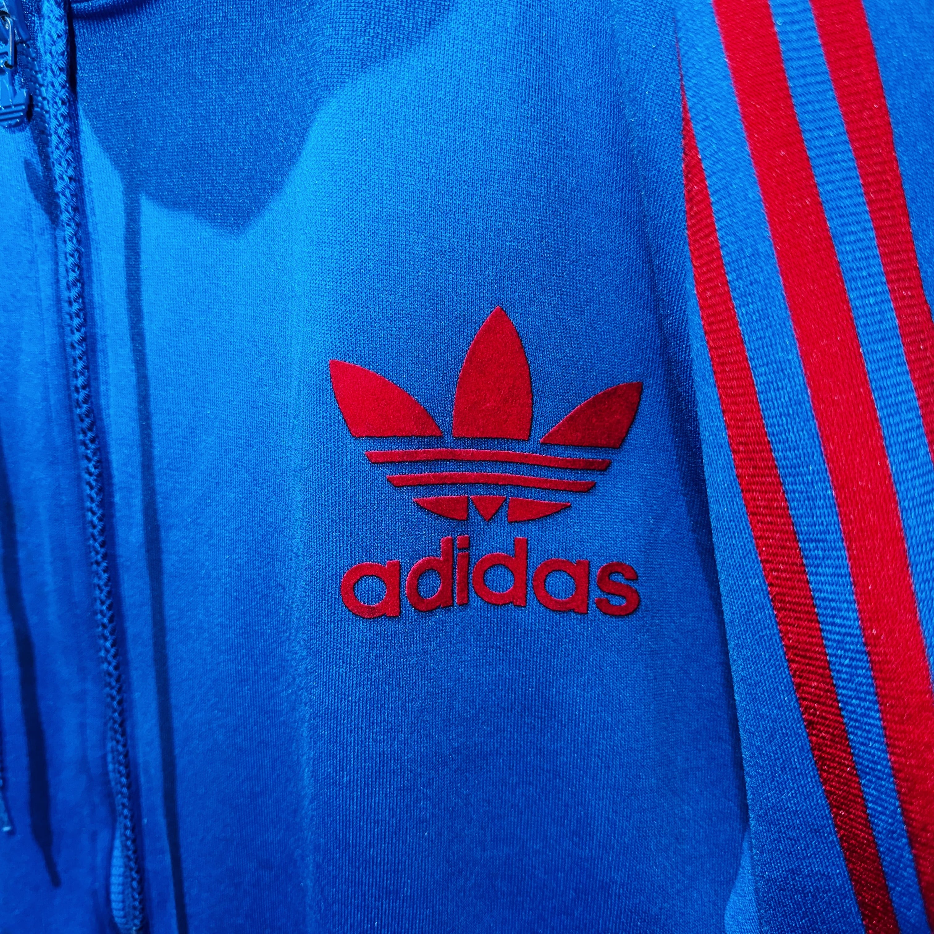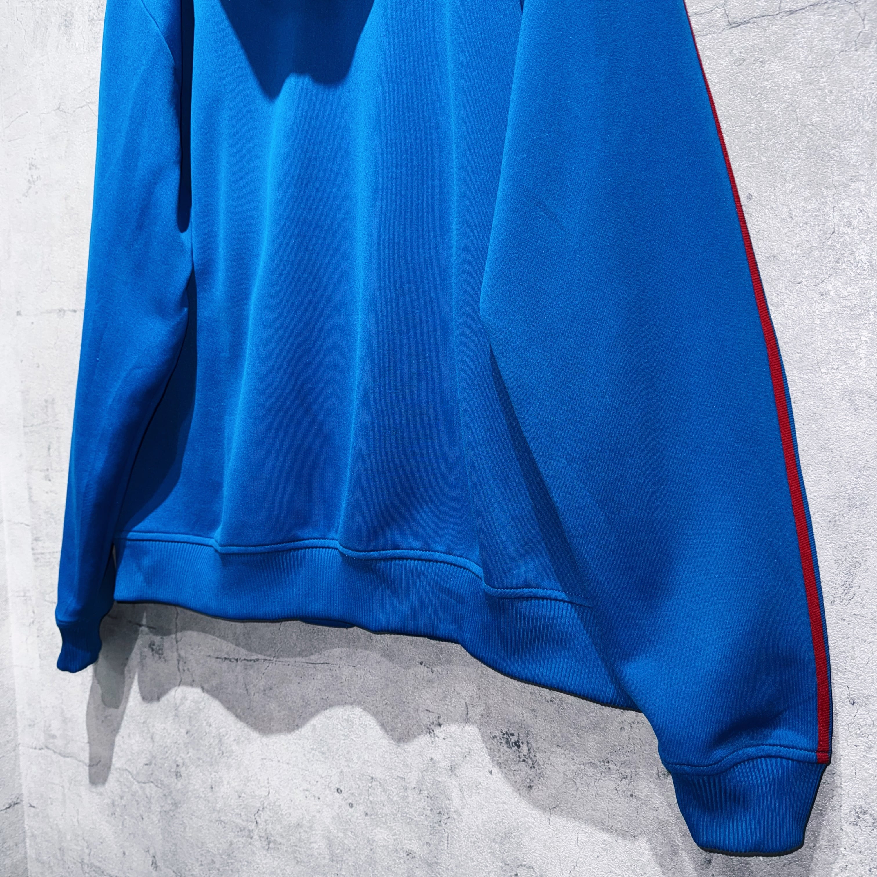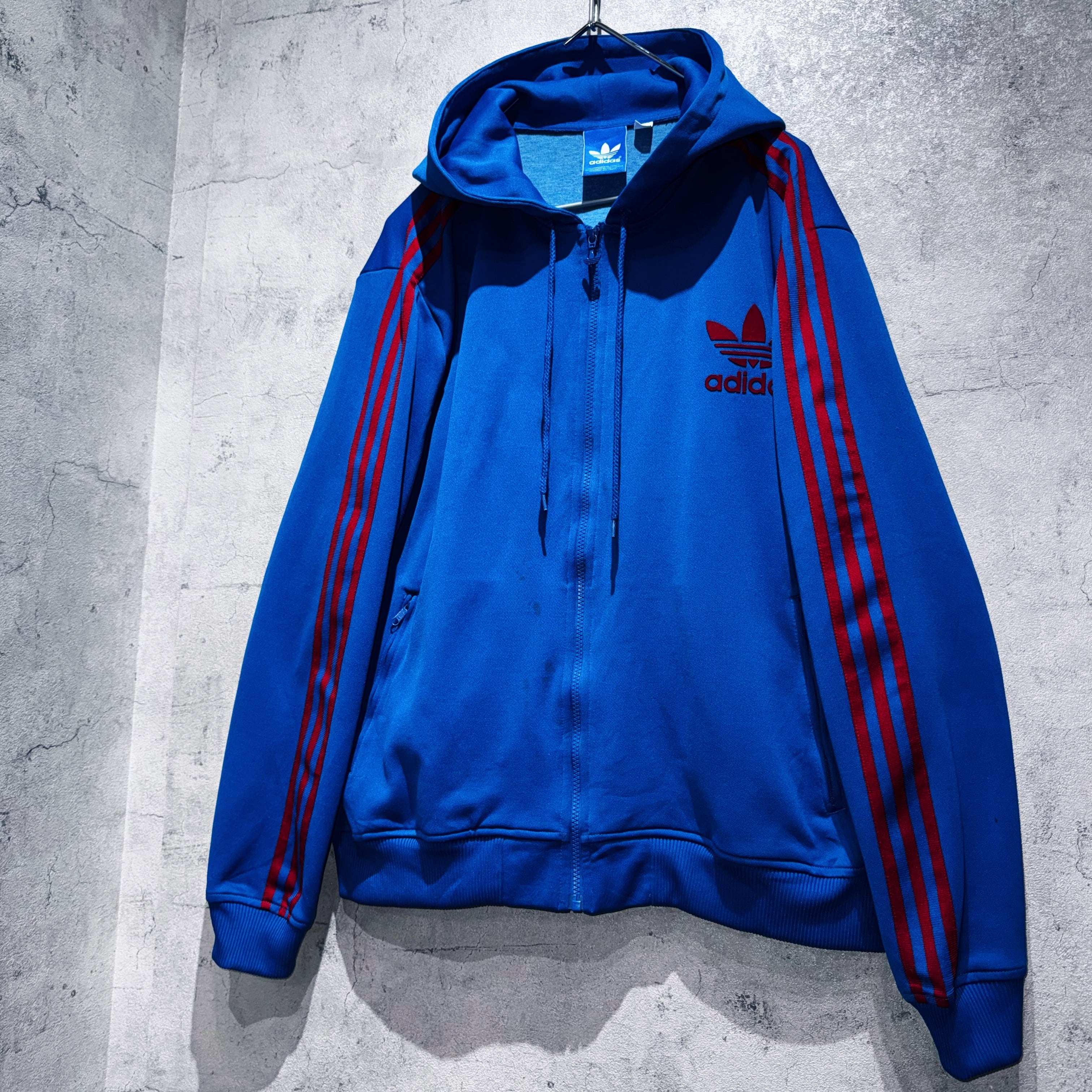 "ADIDAS"のジャージでは珍しいフードタイプのトラックジャケット。ブルーのボディに3ストライプスとトレフォイルロゴをあしらった無駄のないベーシックデザイン。