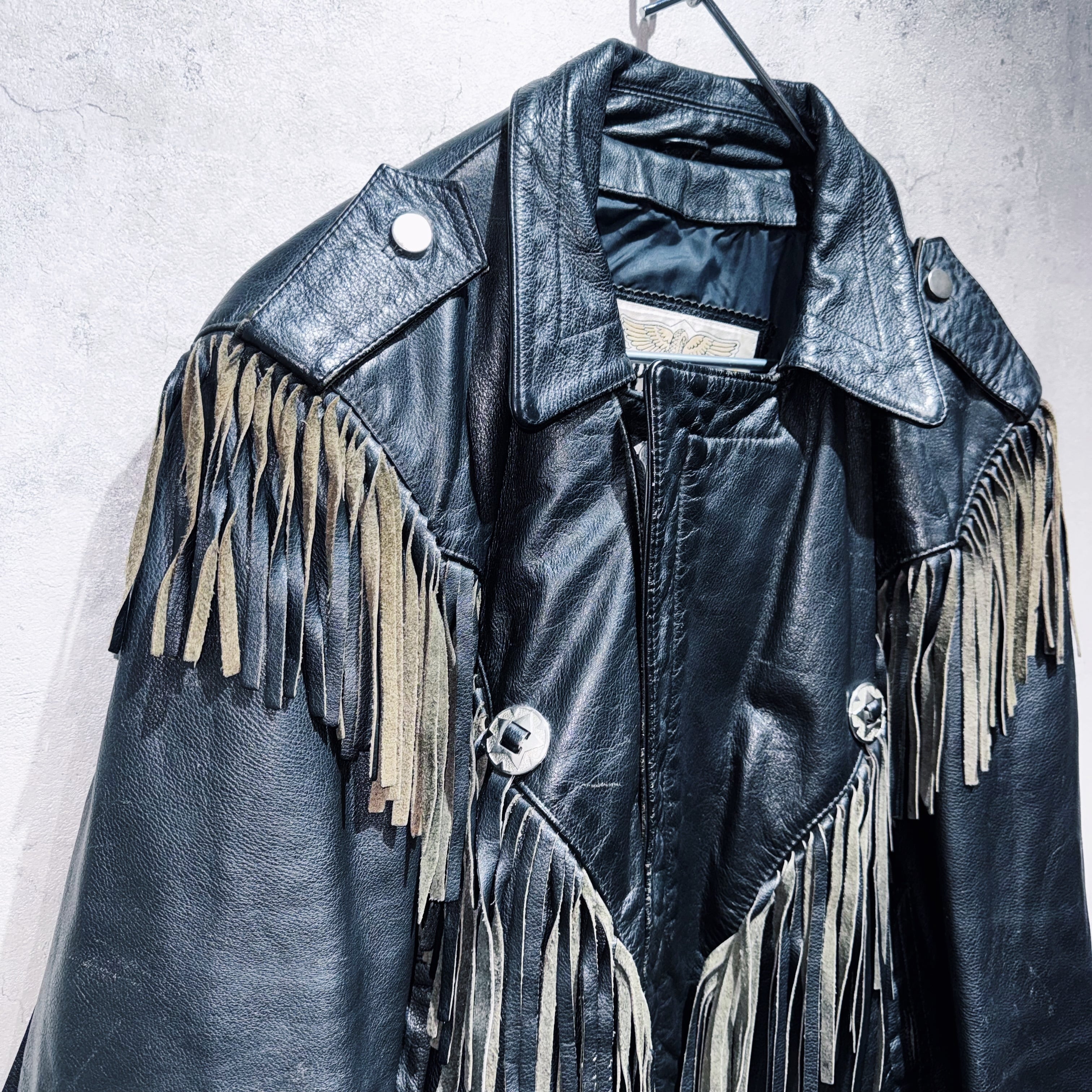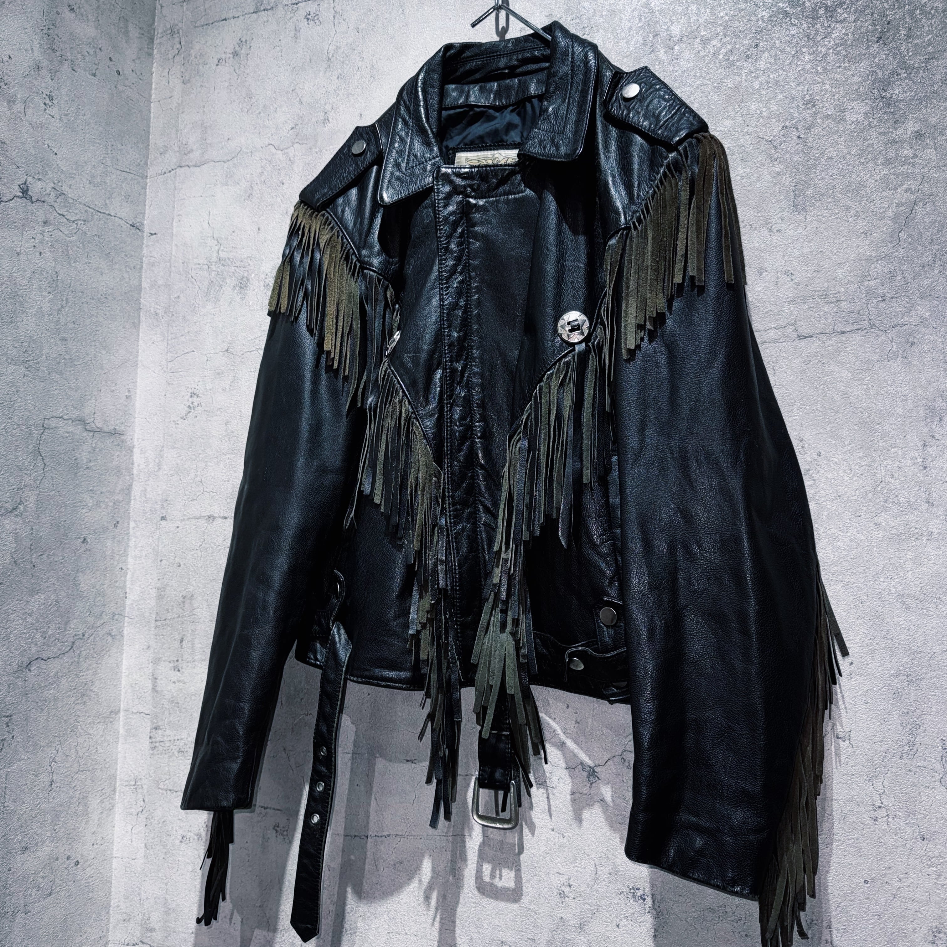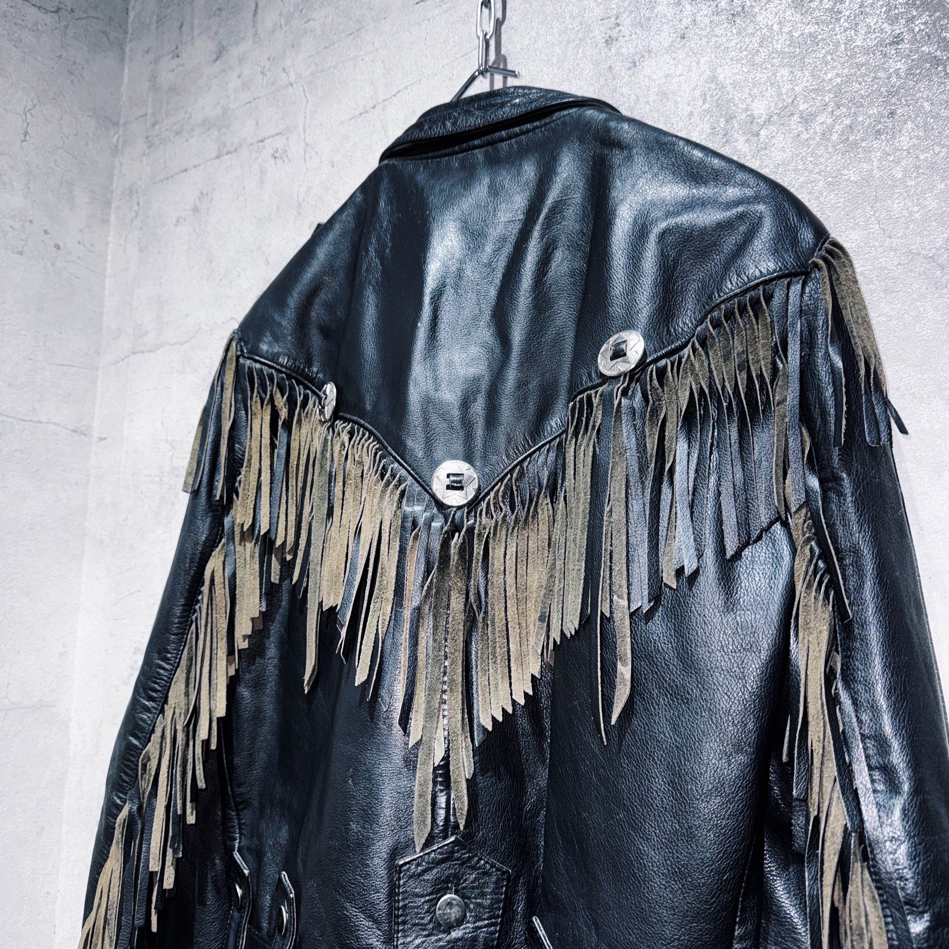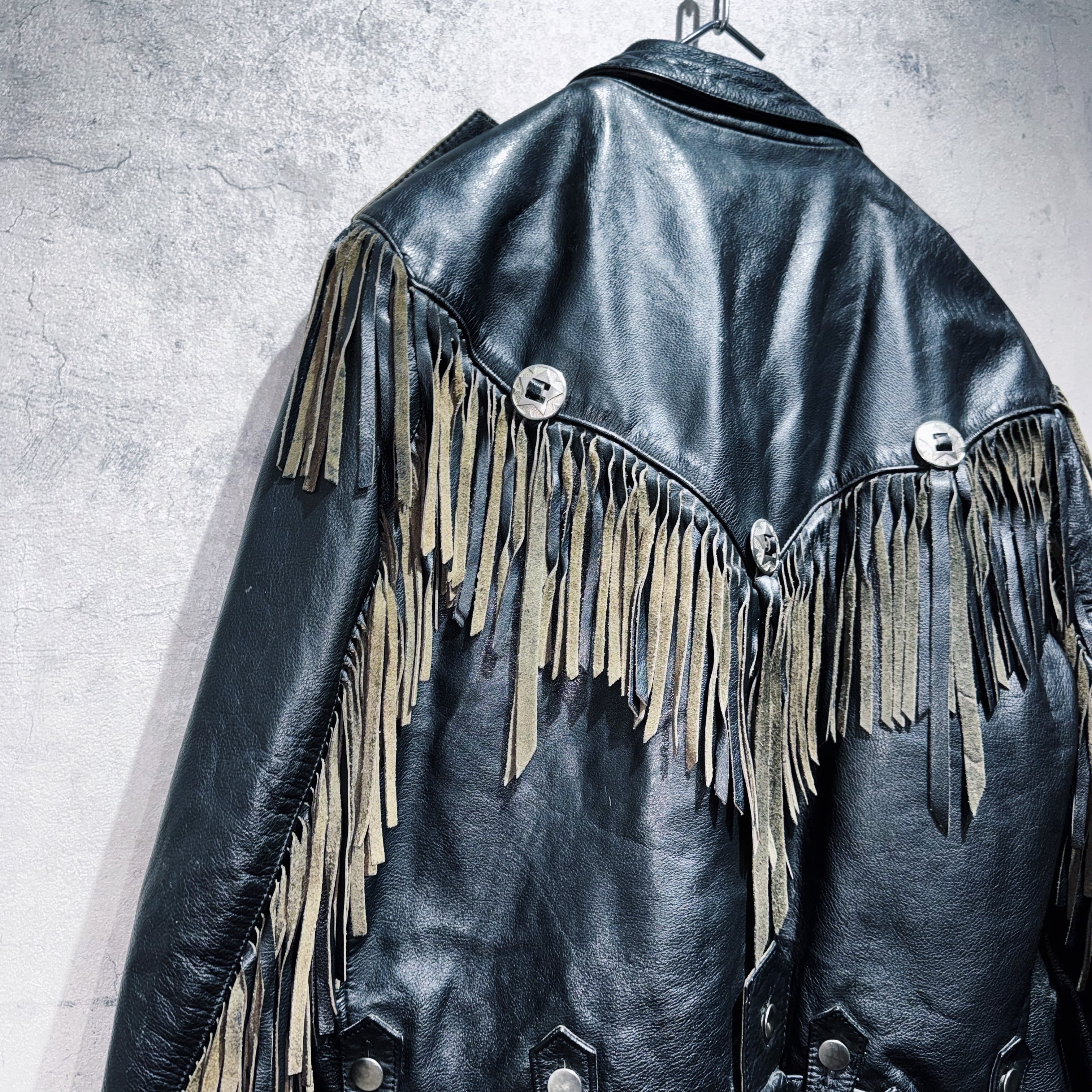 重厚なブラックレザーをベースに、肩から胸元にかけて大胆に施されたフリンジデザインが目を惹く一着。動きに合わせて揺れるフリンジが立体感を生み、ウエスタンならではの迫力ある表情を演出しています。