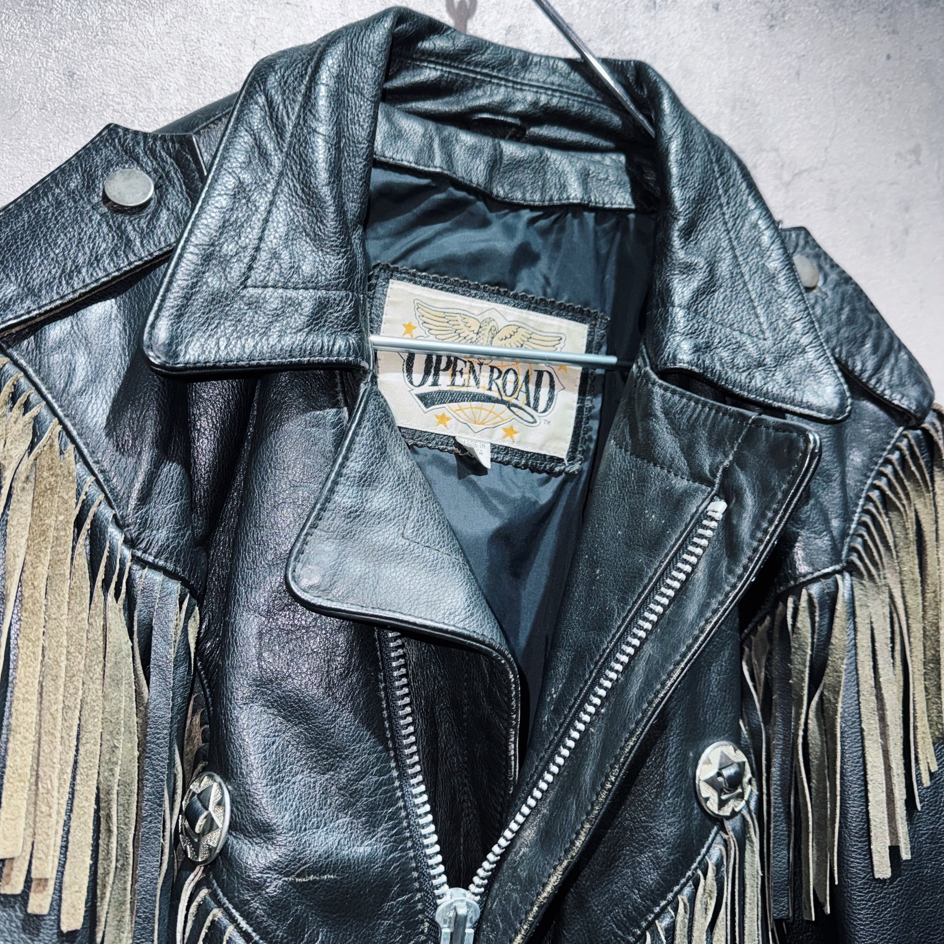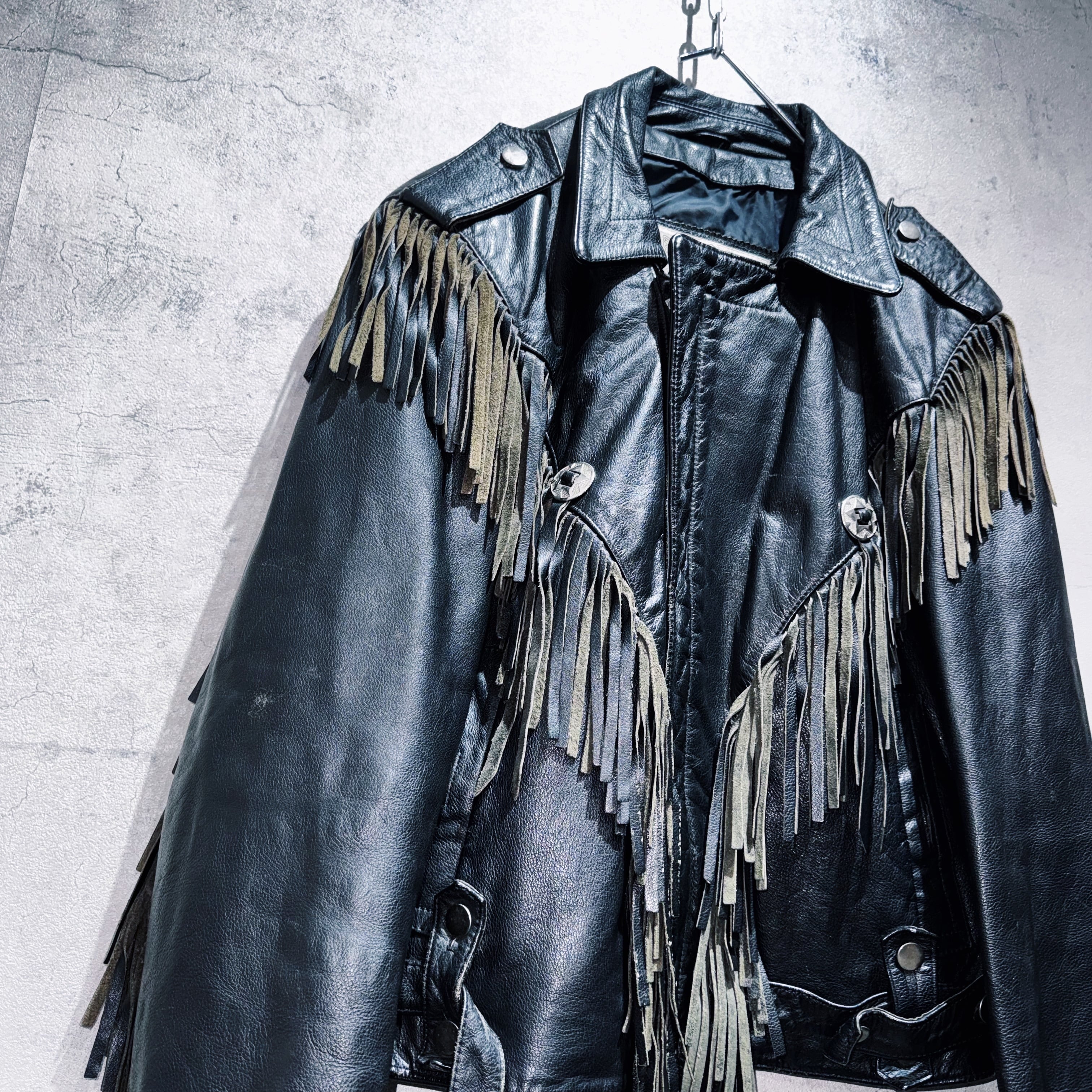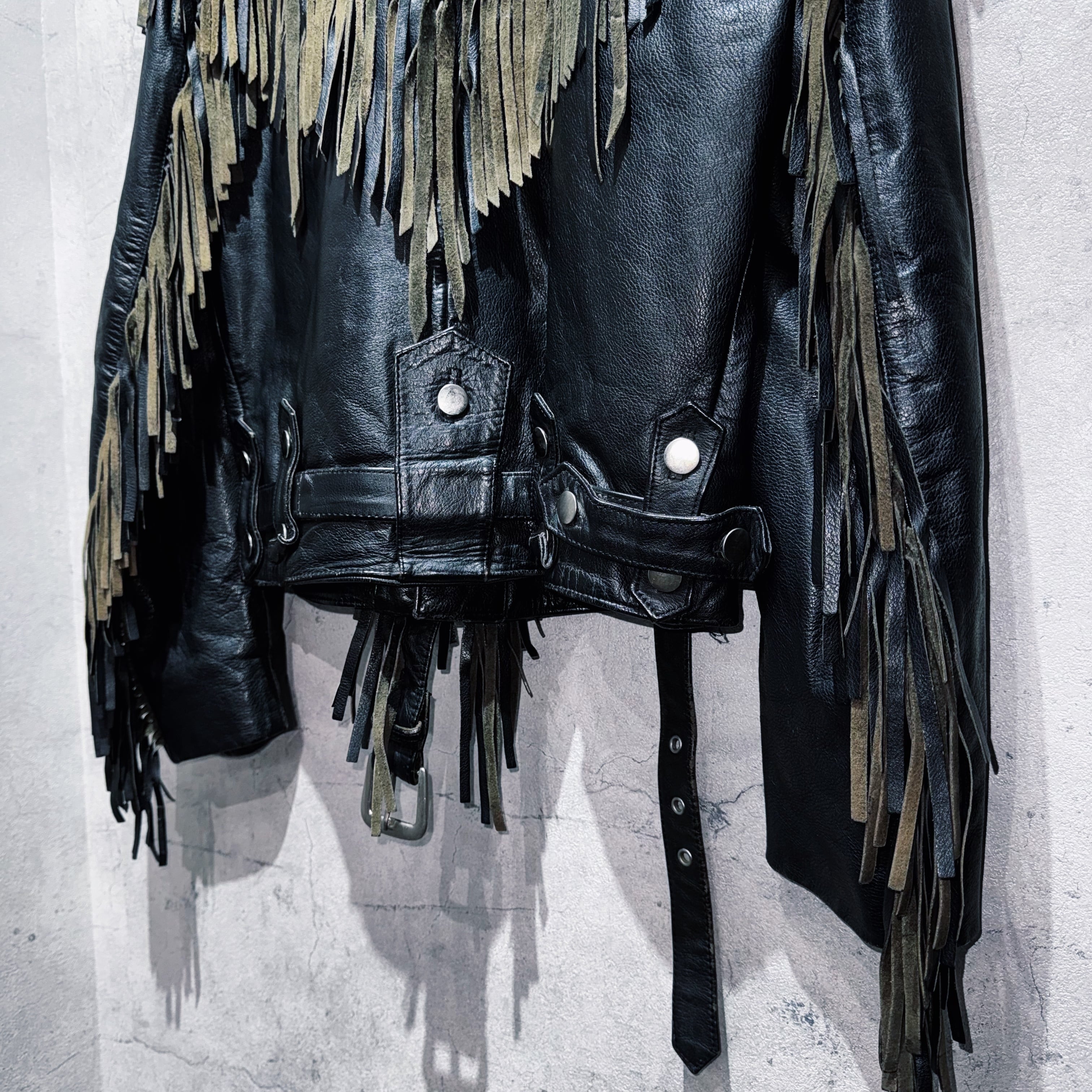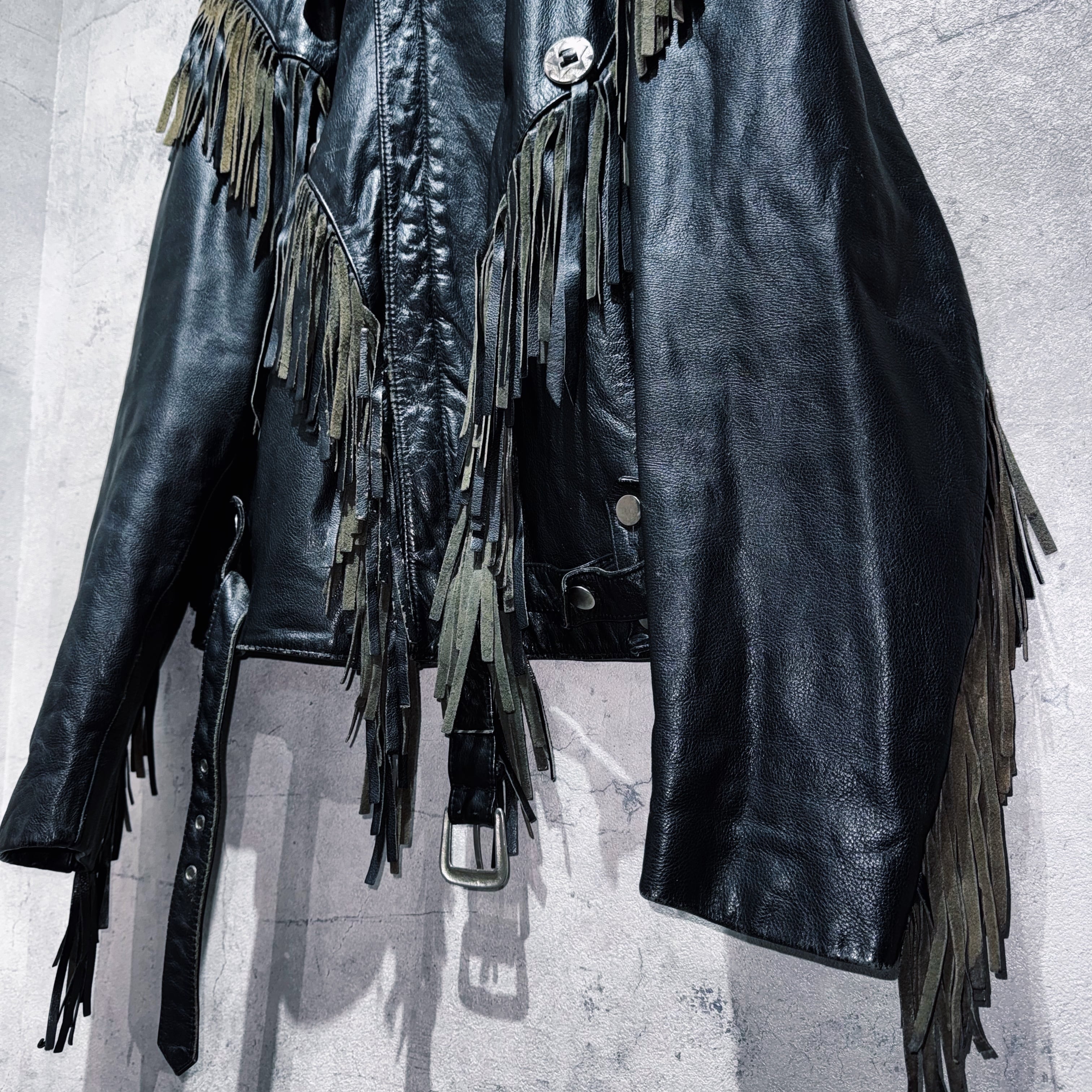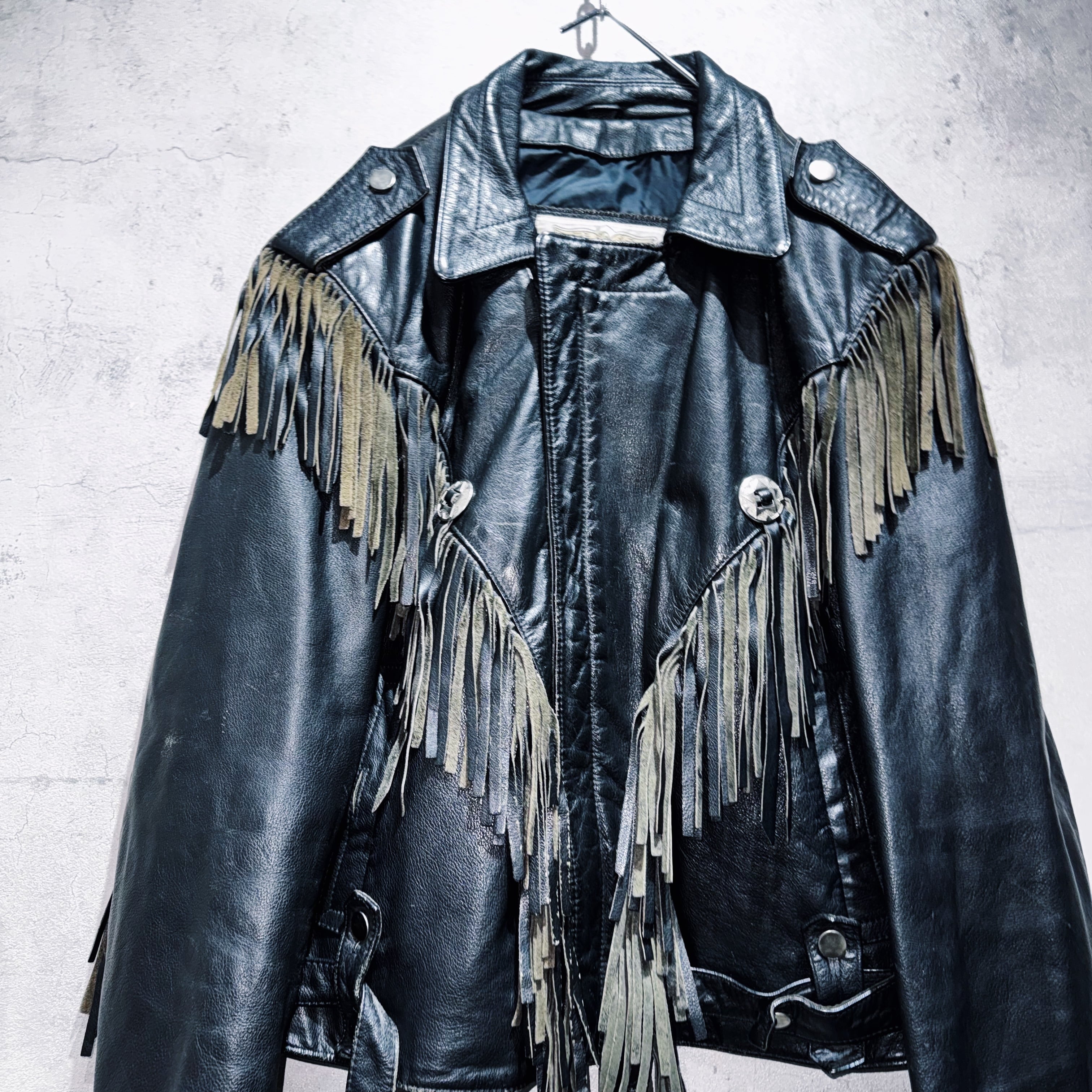 重厚なブラックレザーをベースに、肩から胸元にかけて大胆に施されたフリンジデザインが目を惹く一着。動きに合わせて揺れるフリンジが立体感を生み、ウエスタンならではの迫力ある表情を演出しています。