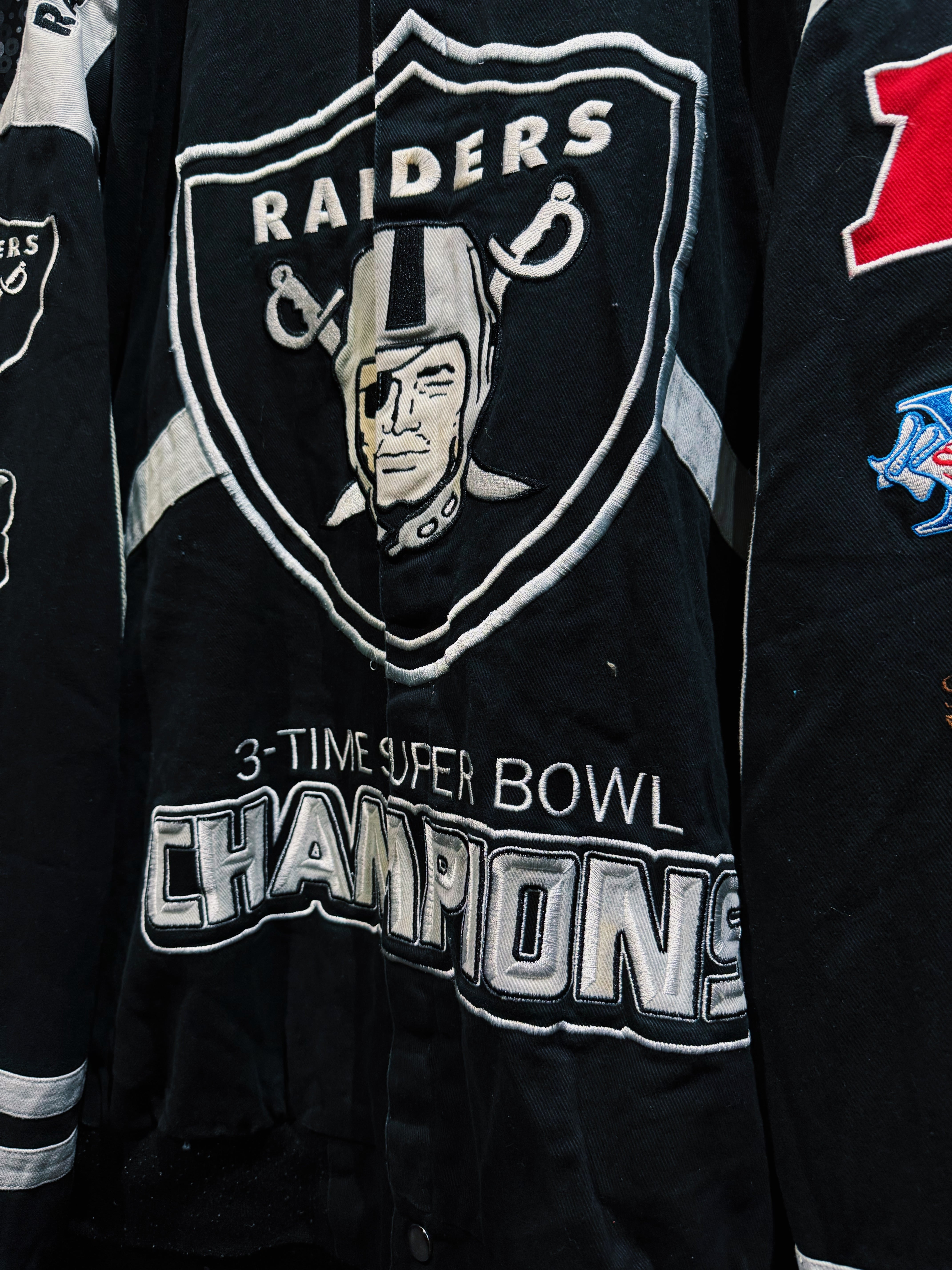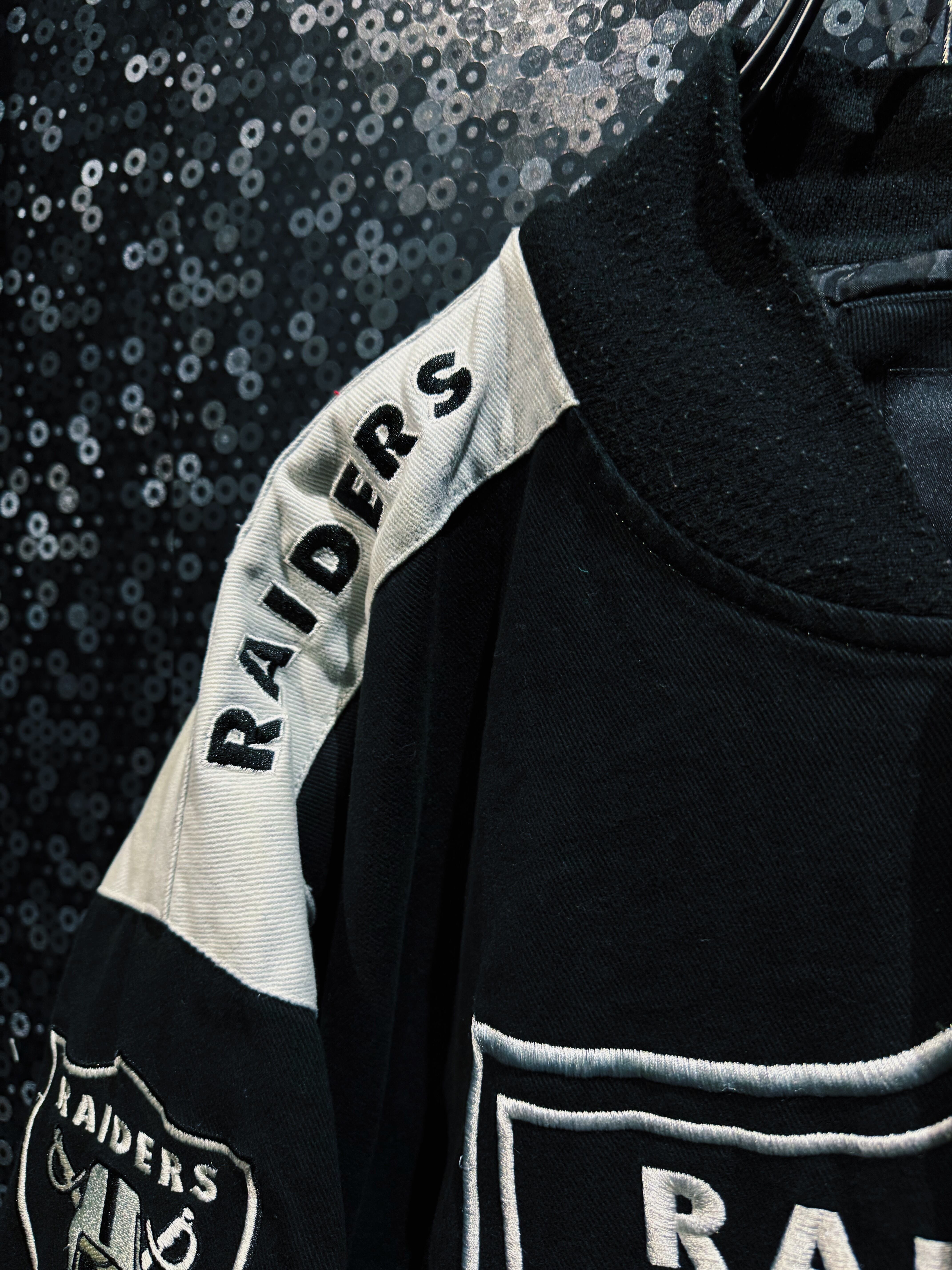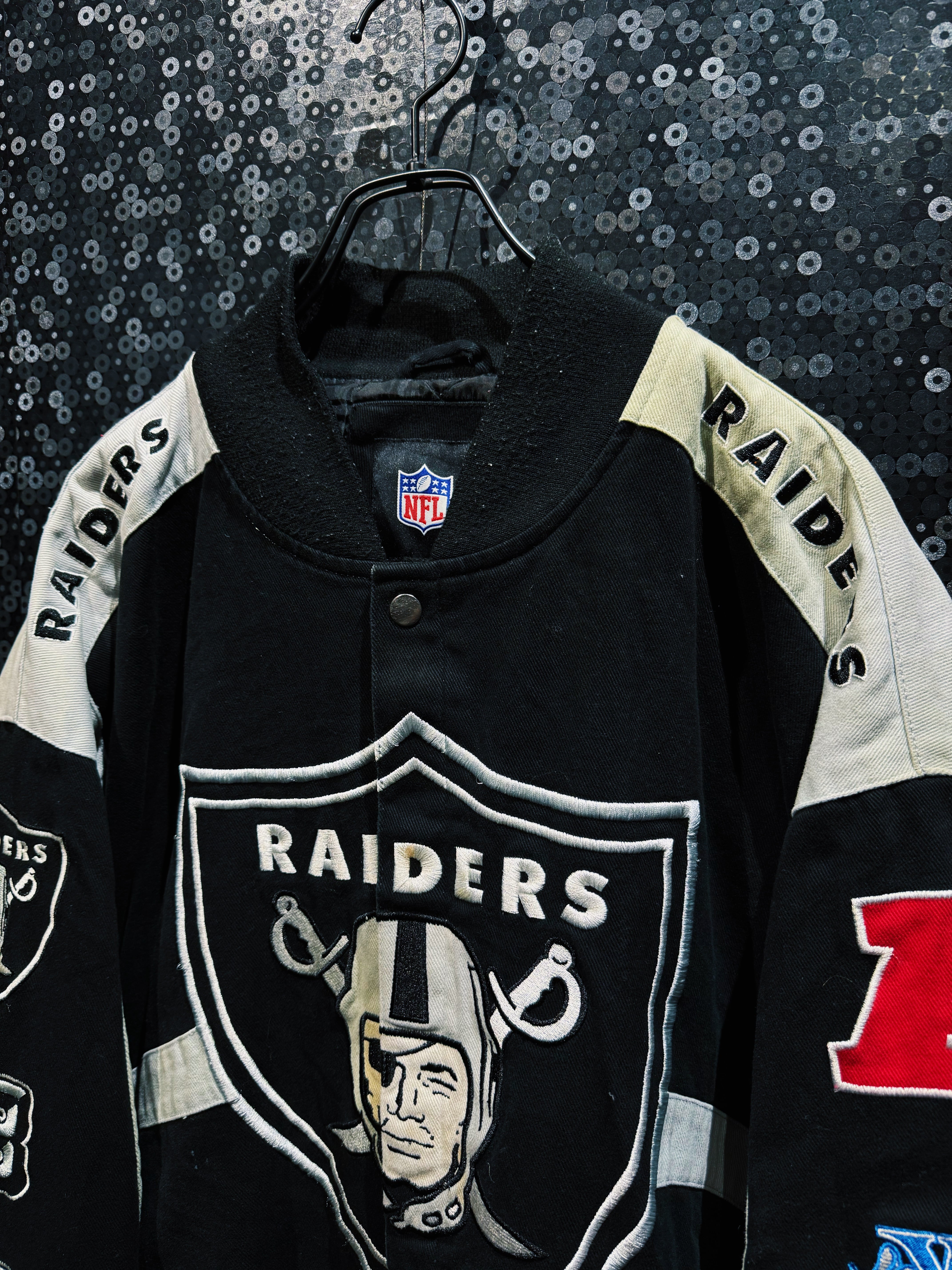 肩や袖にはヘルメットモチーフのワッペンや“NFC”パッチが施され、さらに袖部分には大きく“SAINTS”の刺繍が走るなど、全方向からチームアイデンティティを感じられる作り。NFL公式タグが付くオフィシャル系アイテムらしく、スポーツジャケットとしての完成度も高い。