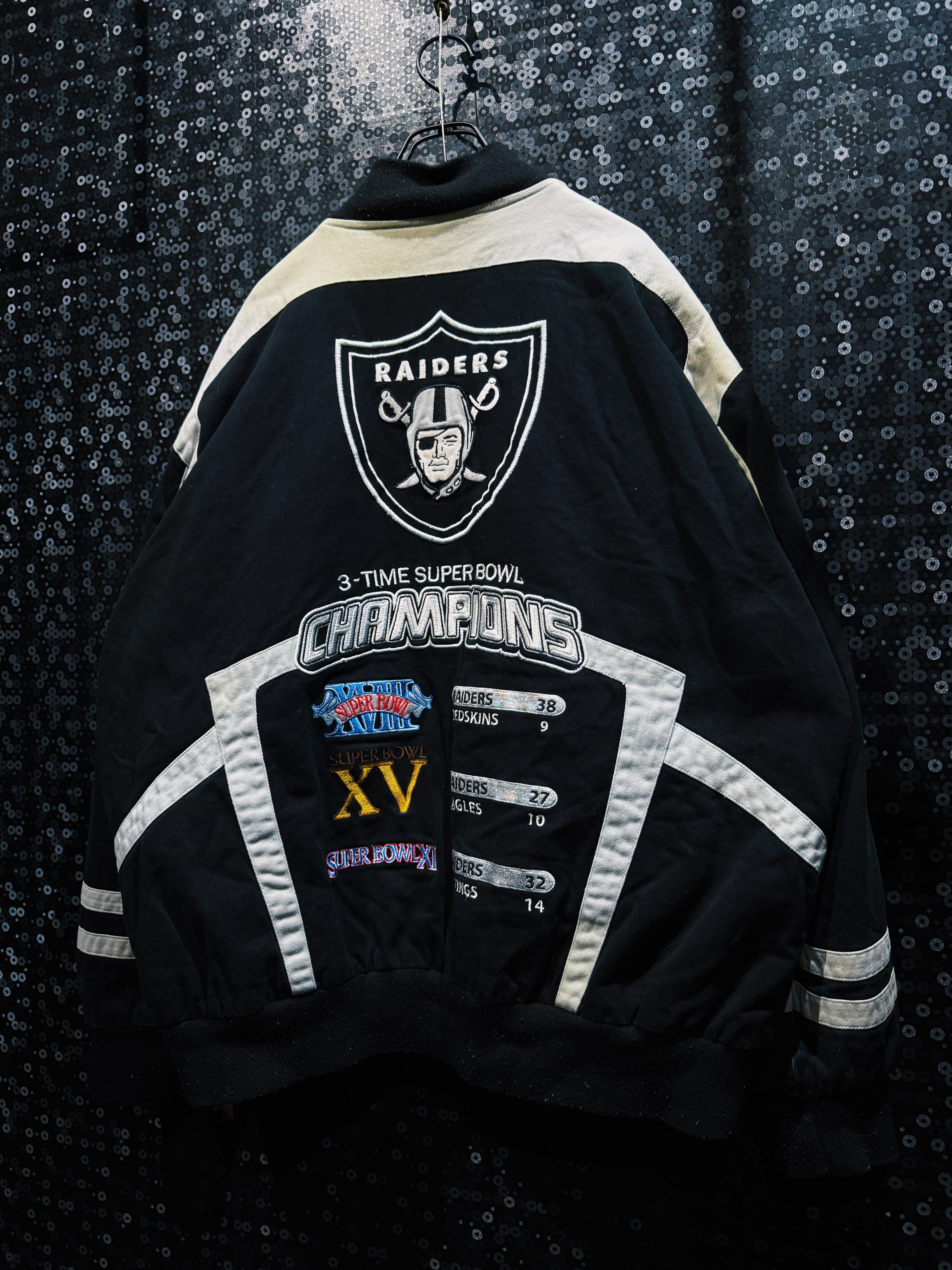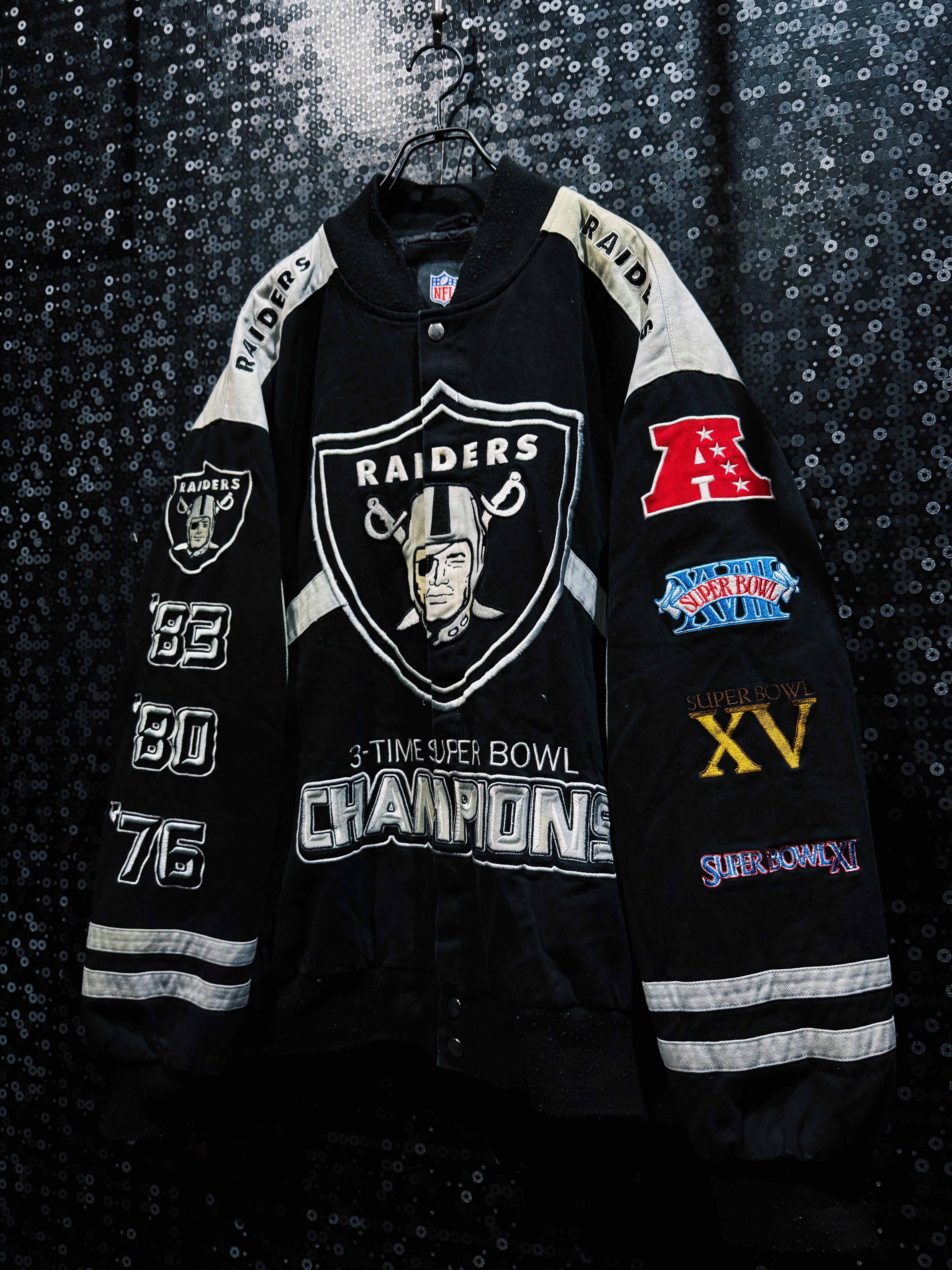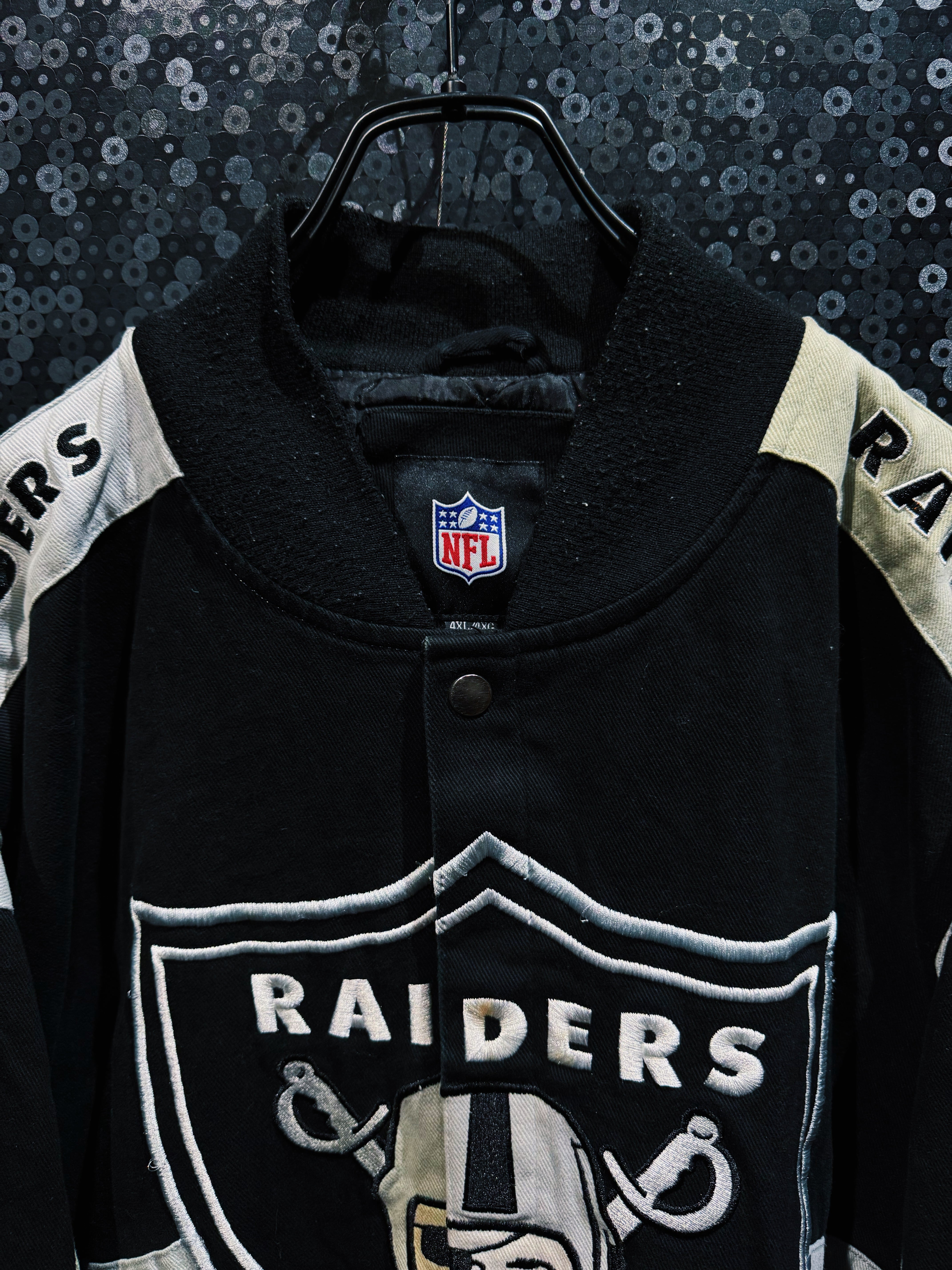 アメリカンフットボールカルチャーを背景に持つNFLアイテムの中でも、圧倒的なロゴインパクトを持つSAINTSデザイン。スポーツウェアとストリートファッションの境界を象徴する、存在感のあるヴィンテージスタジアムジャケット。
