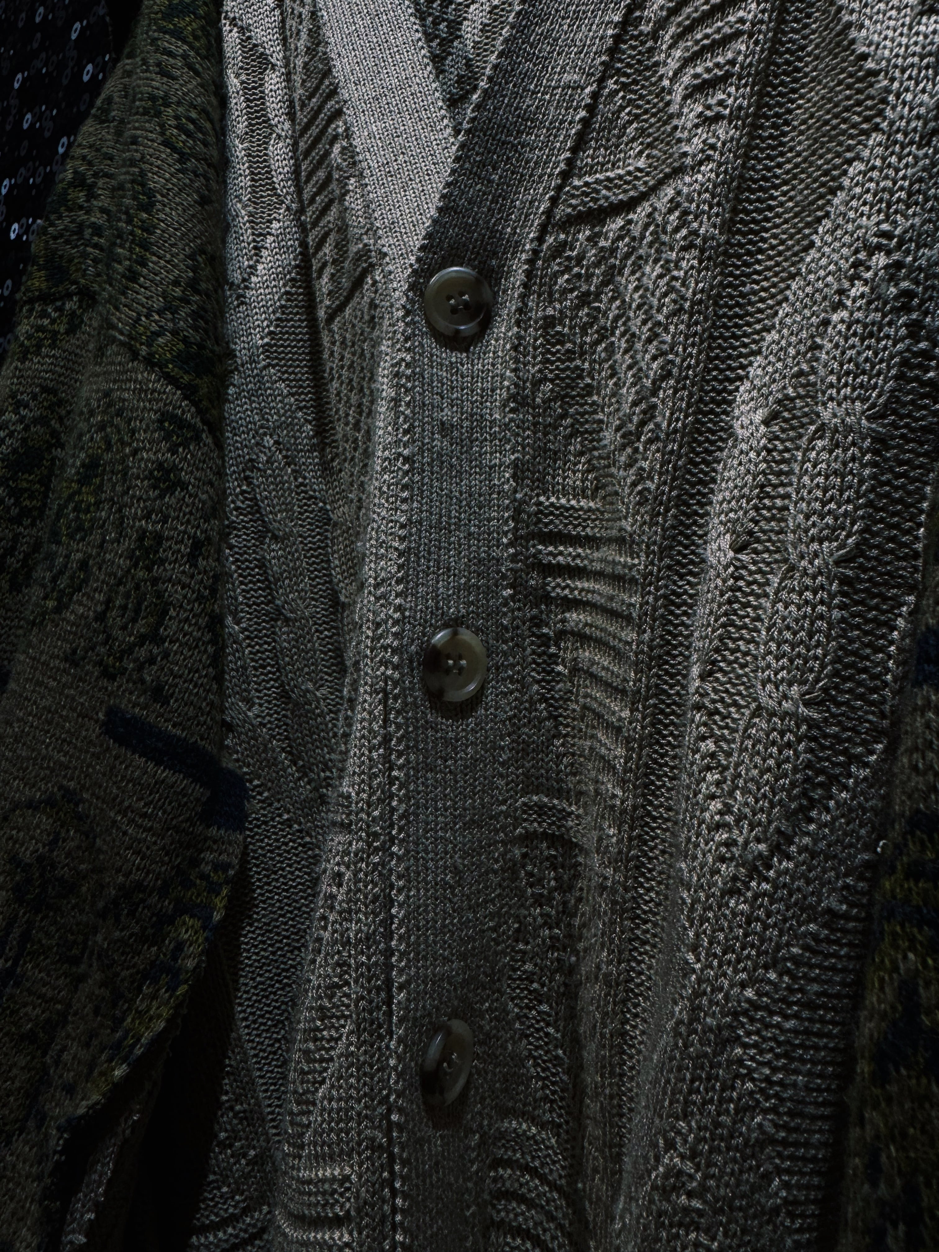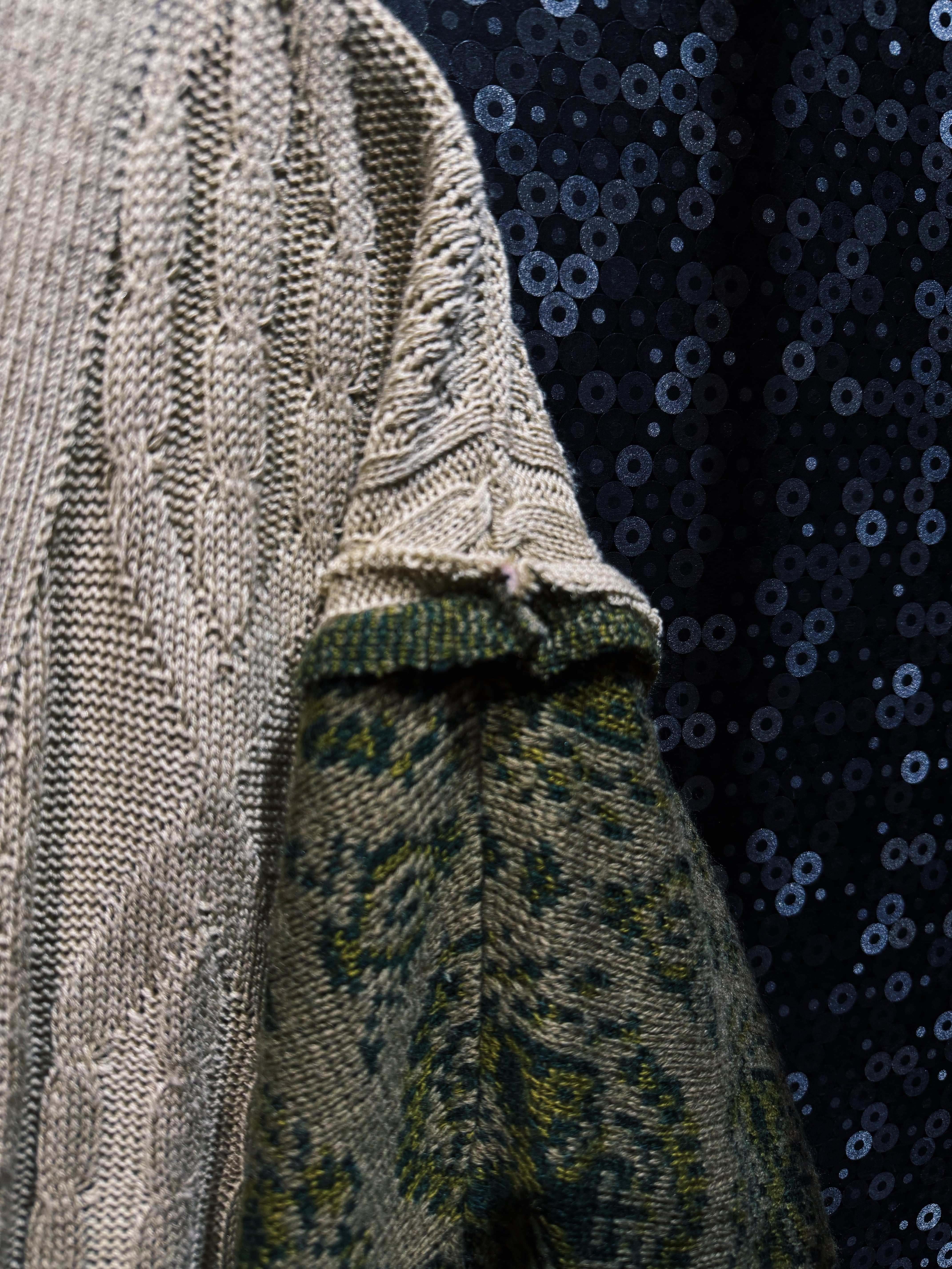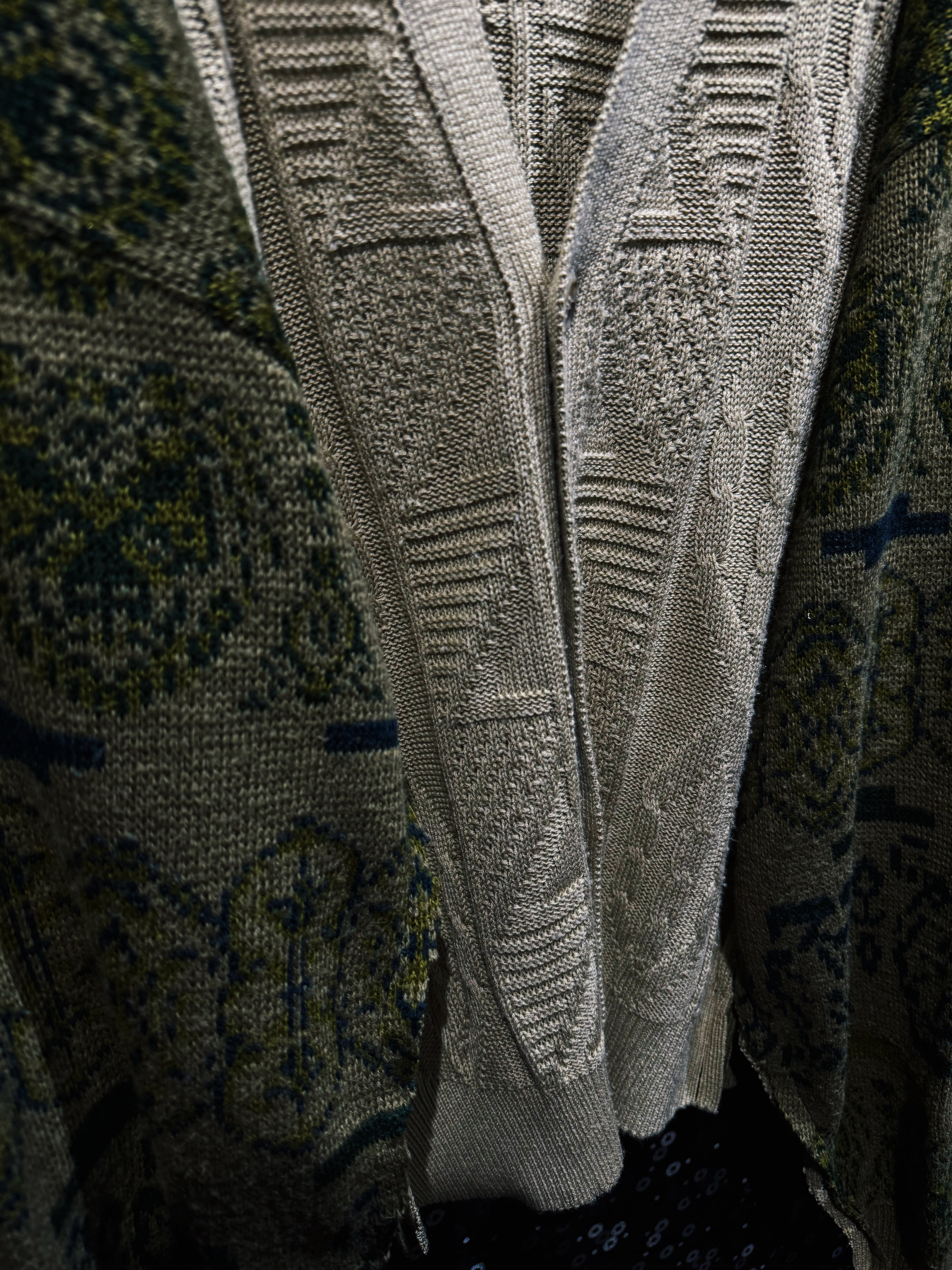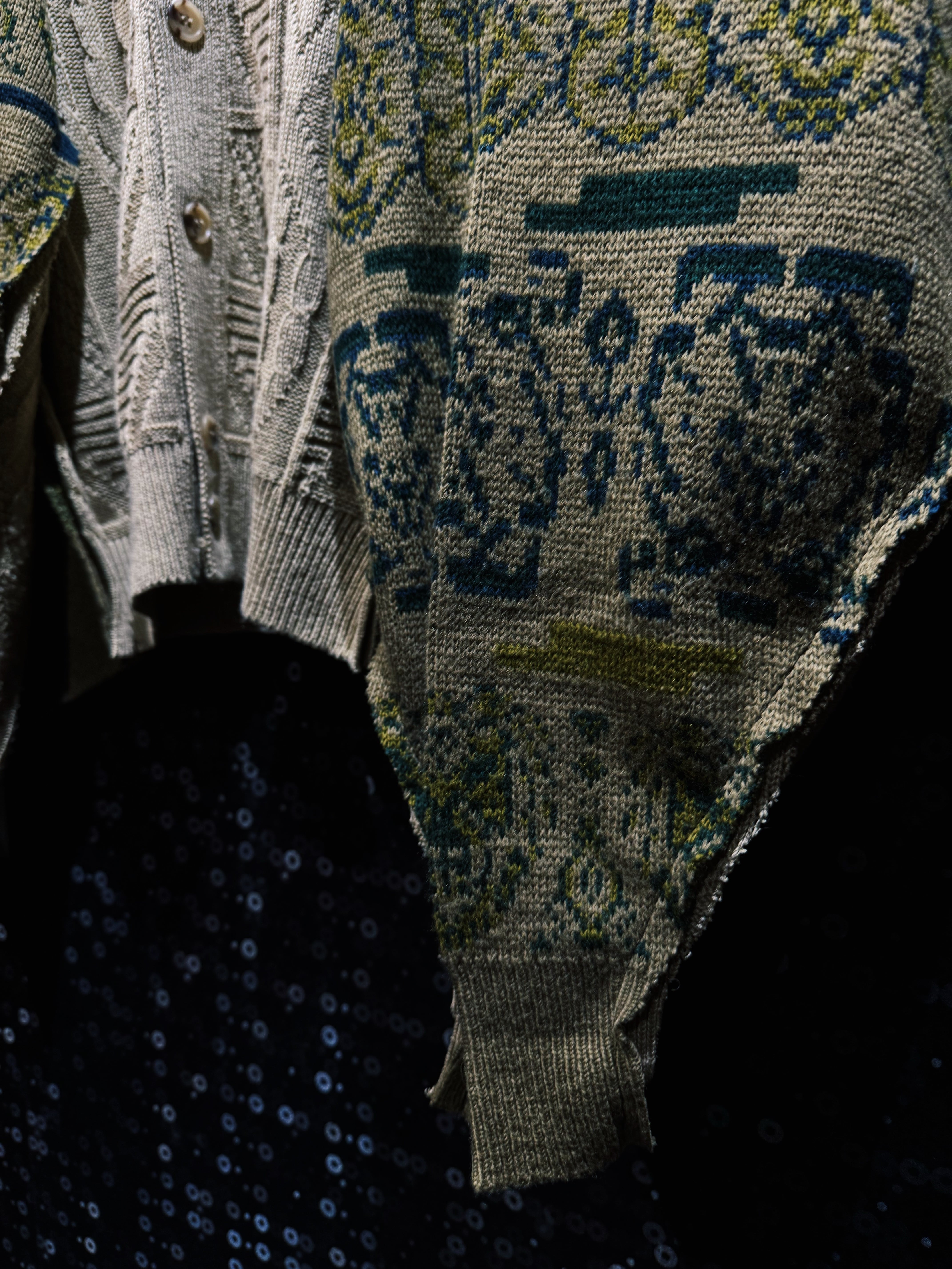 身頃には複数のケーブル編みや立体的な編み模様を配置したフィッシャーマン系ニットを採用。そこに全く異なるテイストの総柄ニットスリーブを解体・再配置することで、既製品では生まれないアートピースのようなシルエットへと昇華されている。さらに袖部分は大きくボリュームを持たせた構造になっており、着用した際にはポンチョのような広がりを生む独特のドレープが生まれるのも特徴。