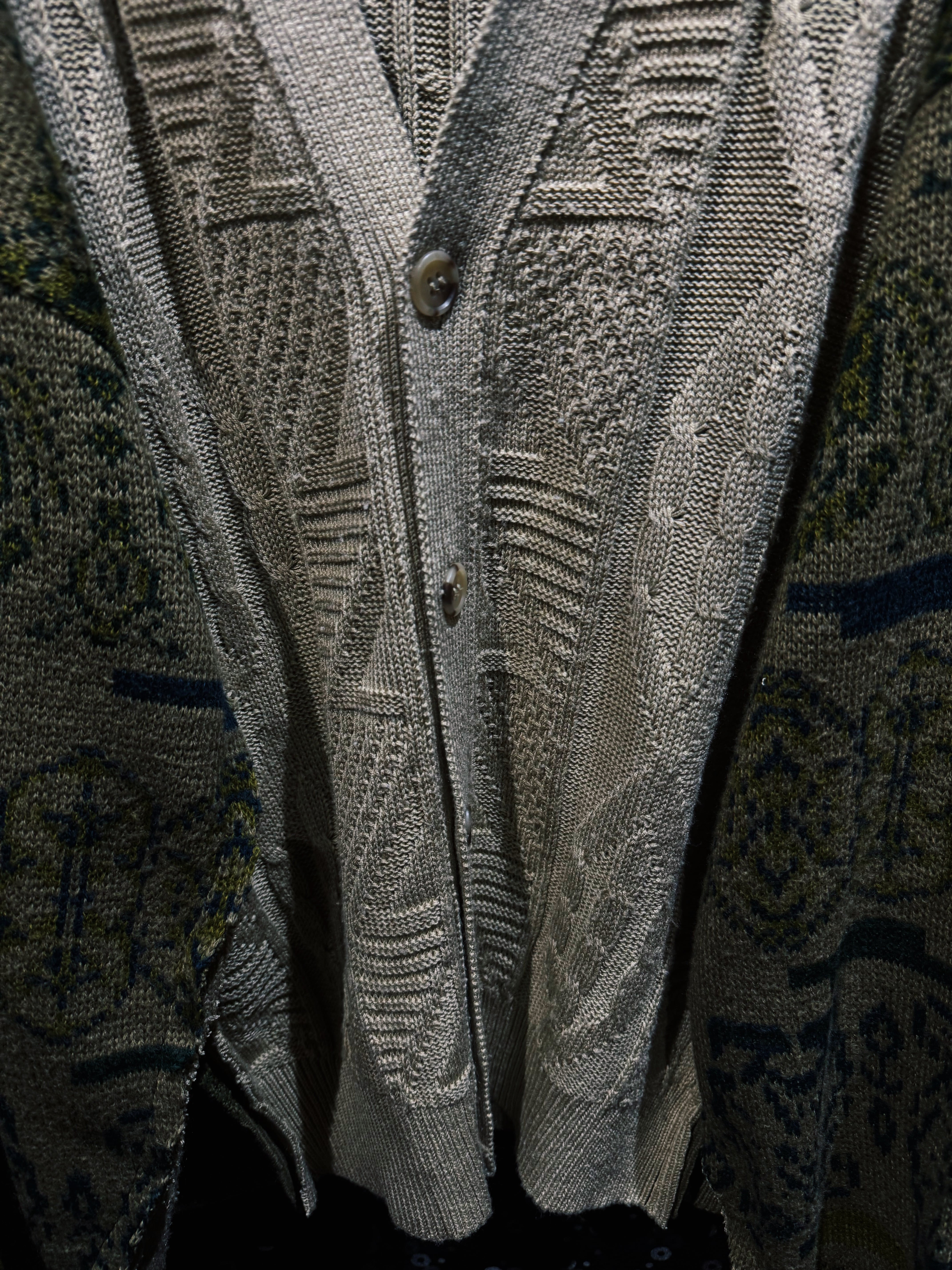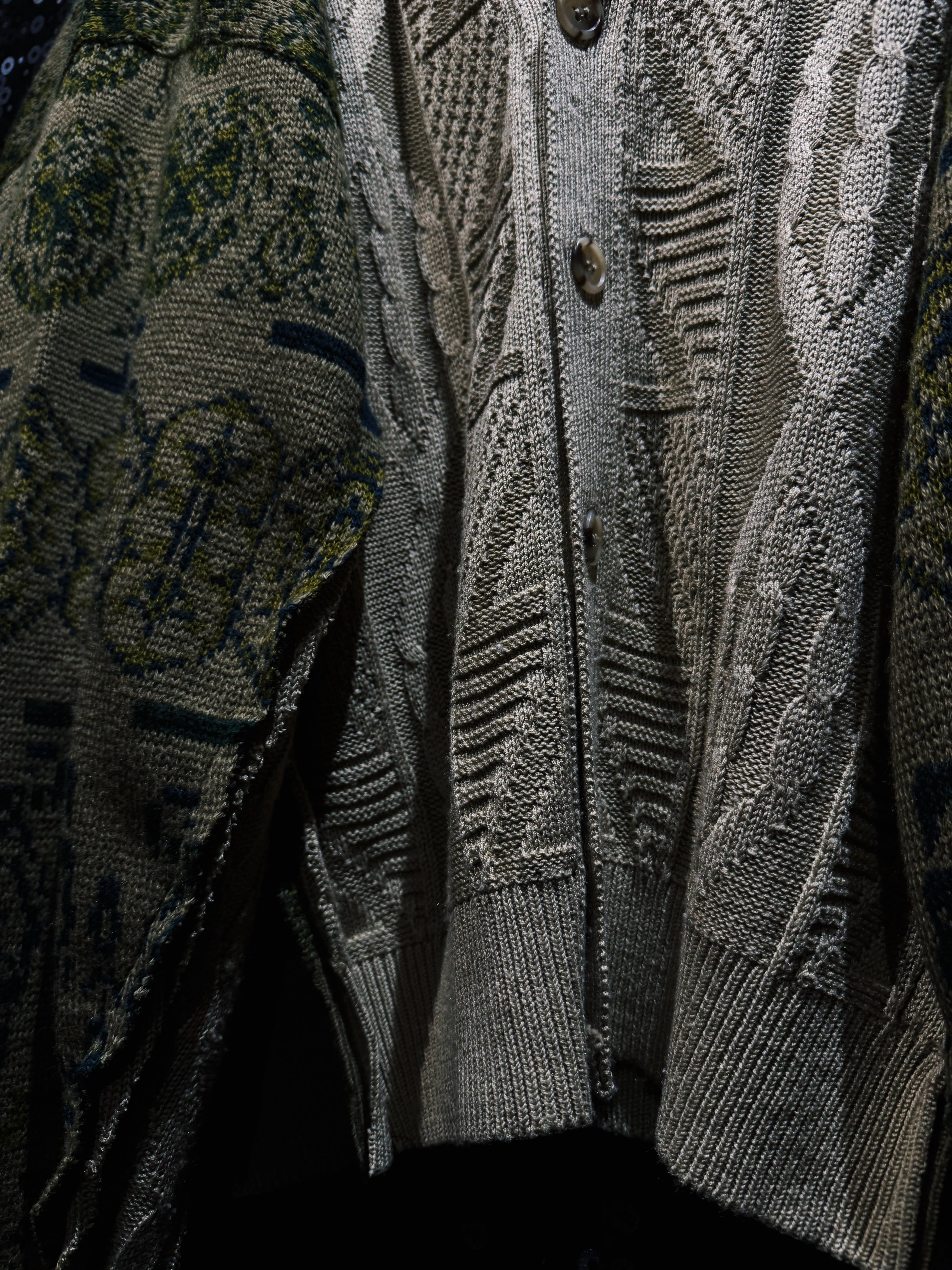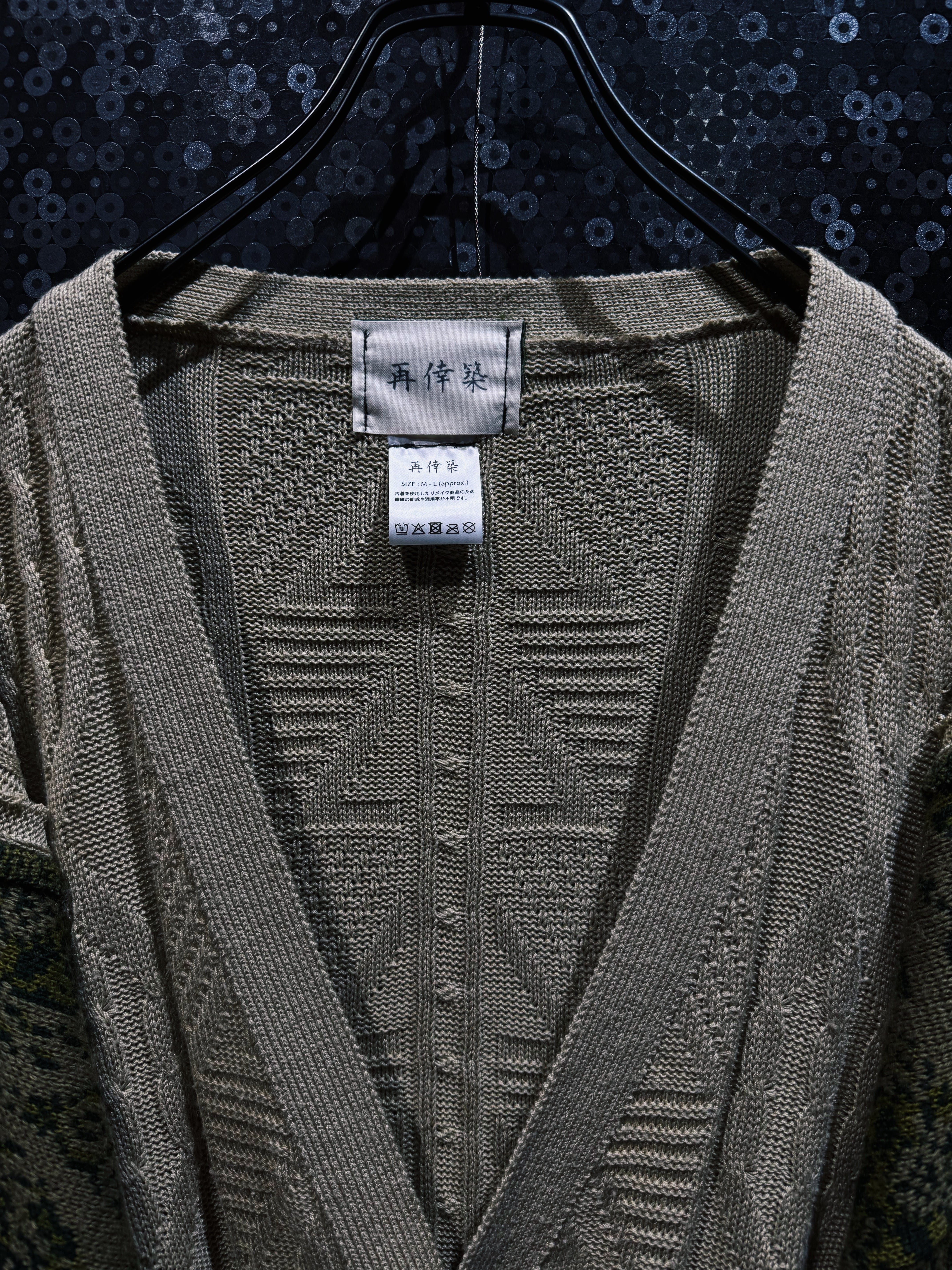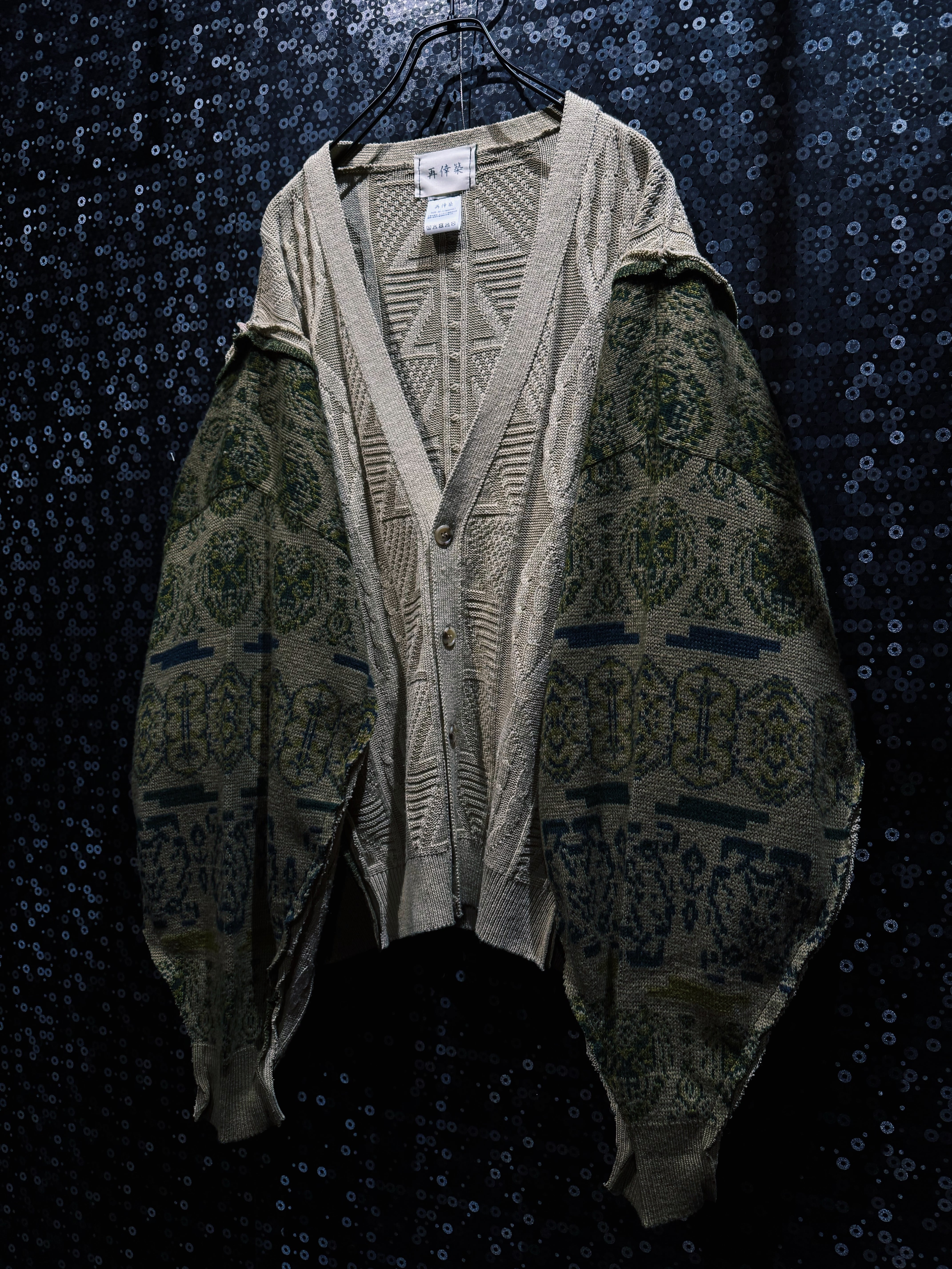 クラシックなケーブルニットカーディガンをベースに、民族調パターンのニットスリーブを大胆にドッキングして再構築した「再倖築」ラインのオリジナルリメイクニットカーディガン。落ち着いたベージュのケーブルニットに対して、袖にはグリーン系の民族柄ニットを組み合わせることで、クラシックとエスニックが混ざり合う再倖築らしい独特の表情を生み出している。