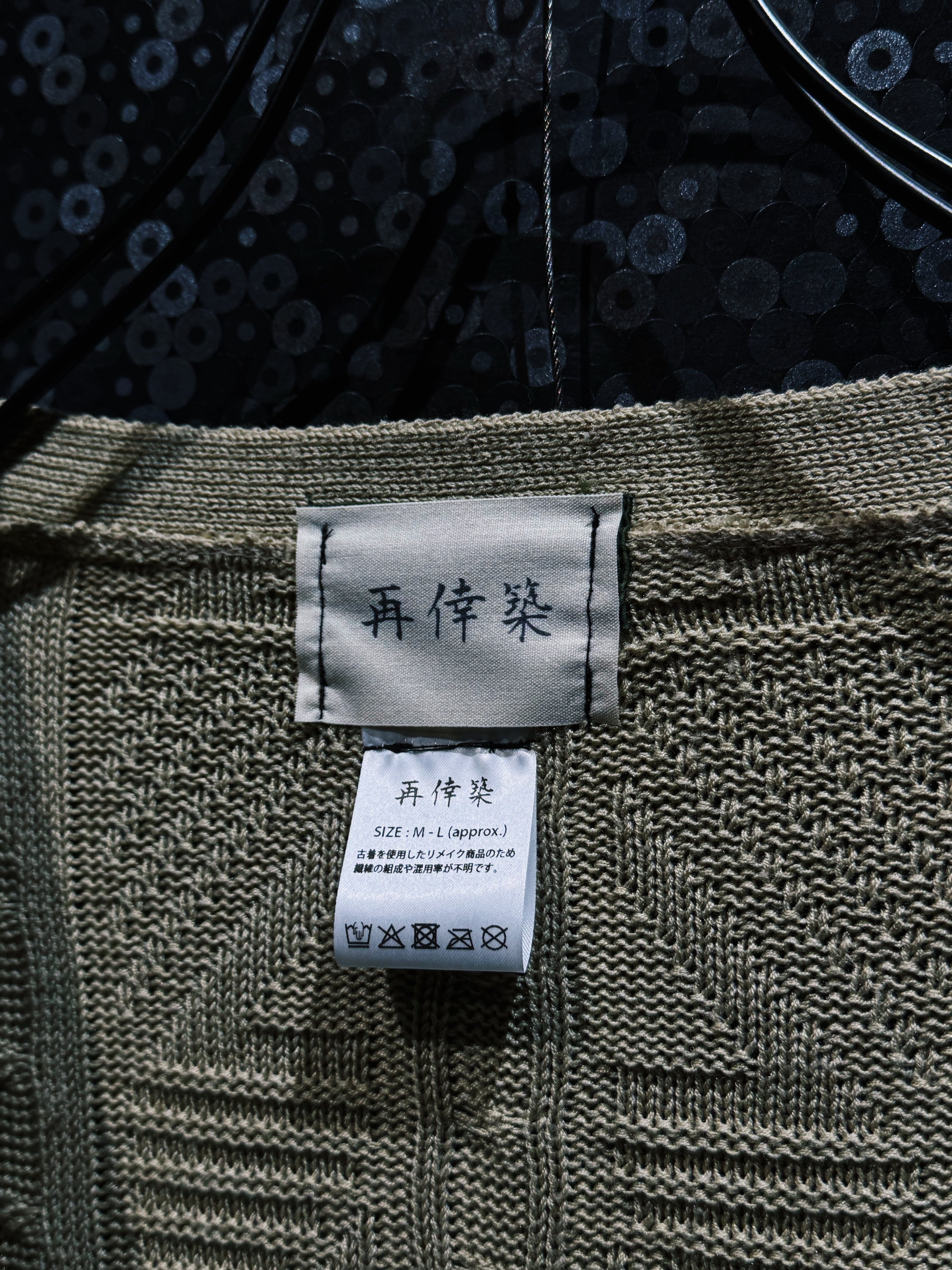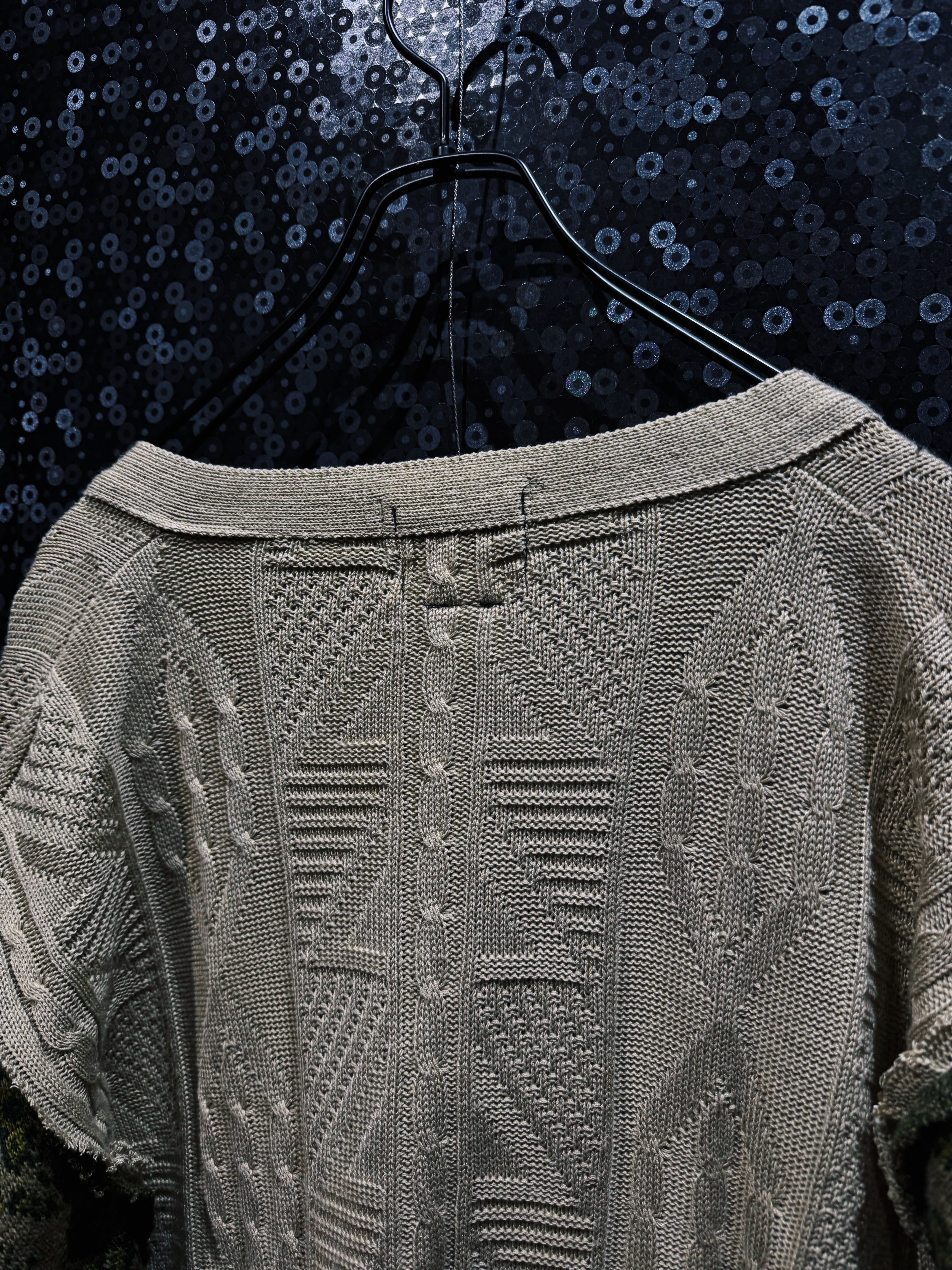 背面にはフィッシャーマンニット特有の立体的な編み柄が大胆に配置され、フロントとはまた違う表情を見せる構造になっている。古着のニットを素材として再解体し、全く新しいシルエットへと再構築する再倖築ならではの手法によって生まれた完全一点物。