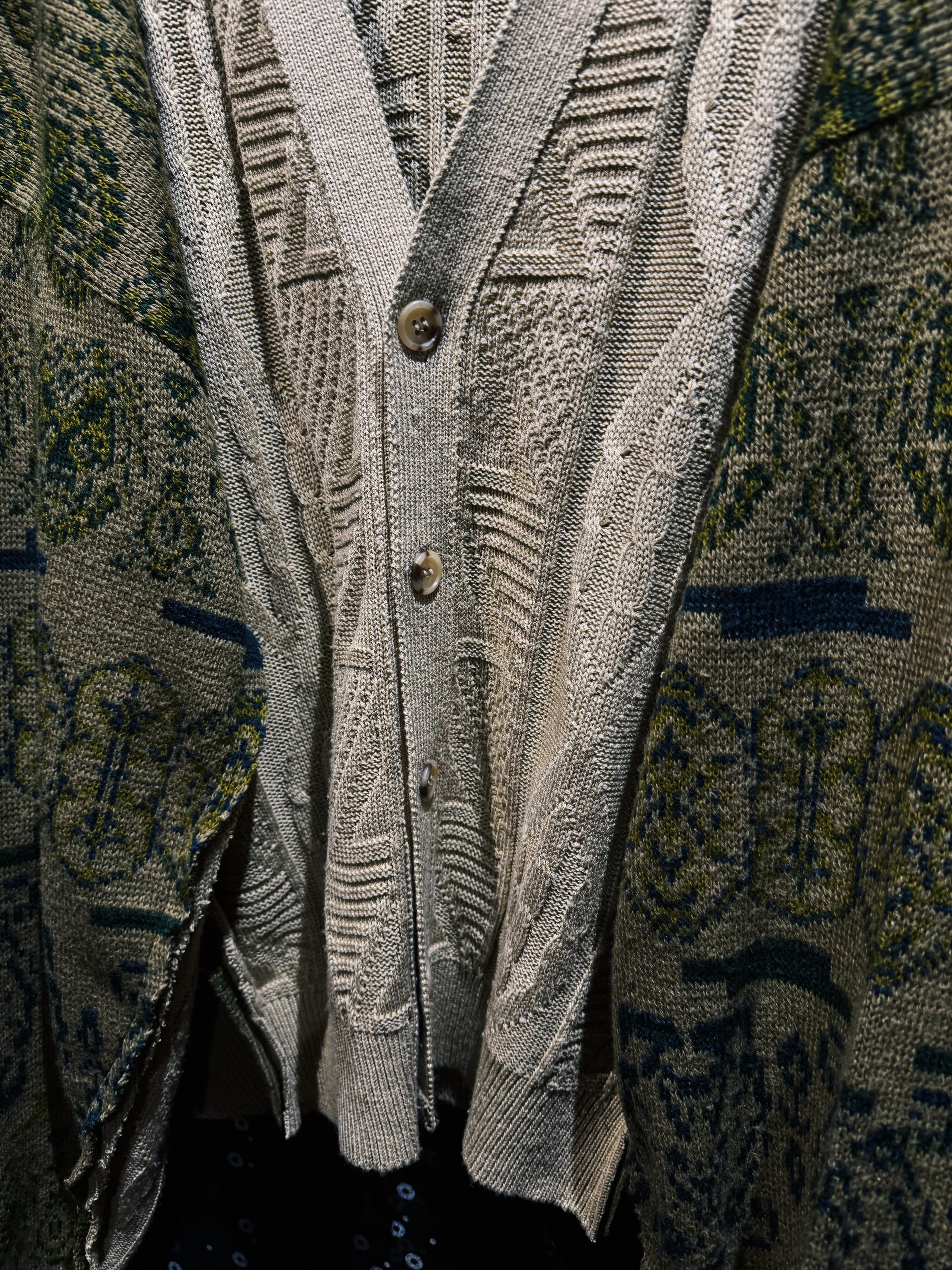 【ÆIEM】“再倖築” original re:constructed ethnic pattern sleeve docking fisherman knit cardigan