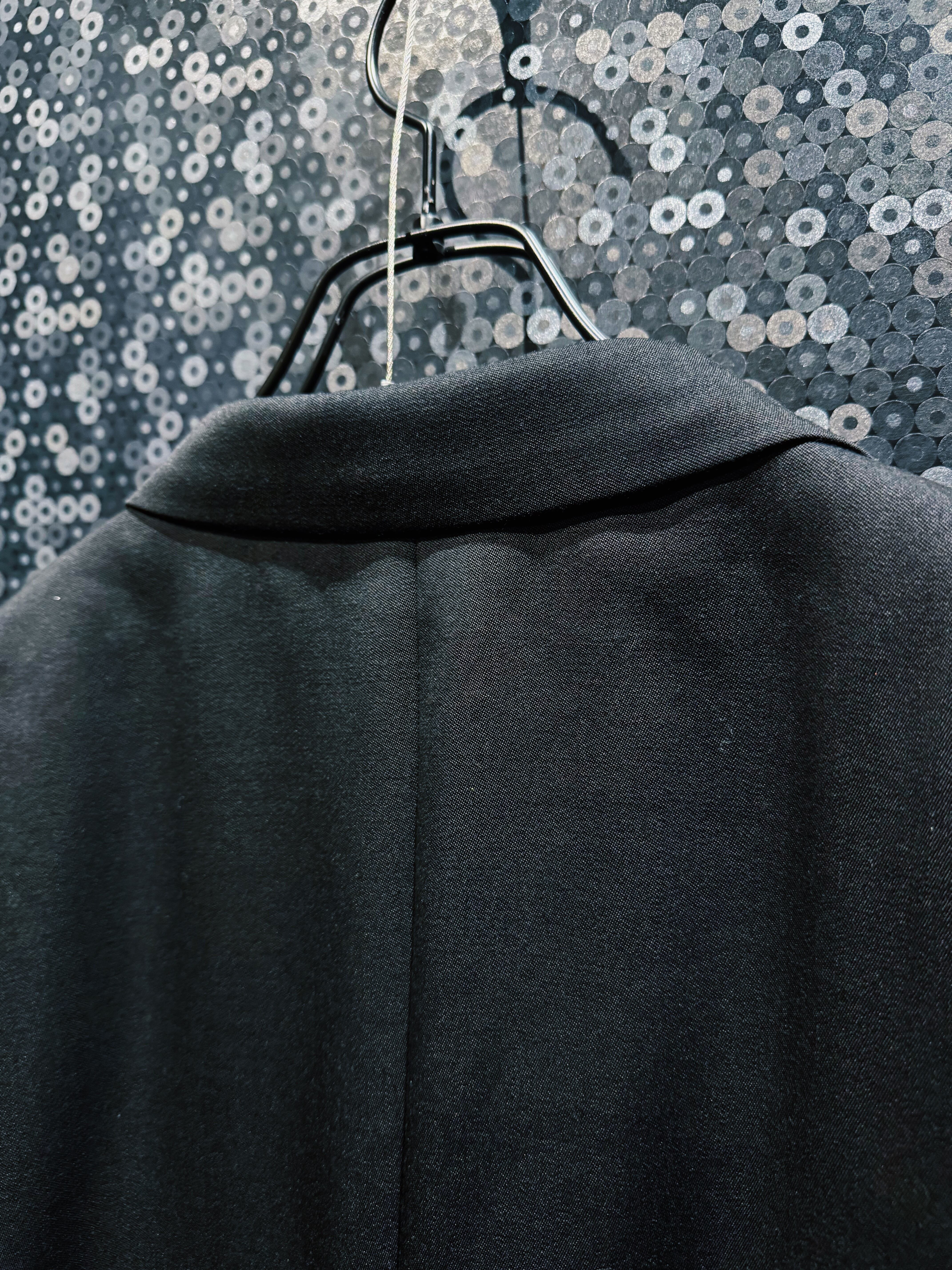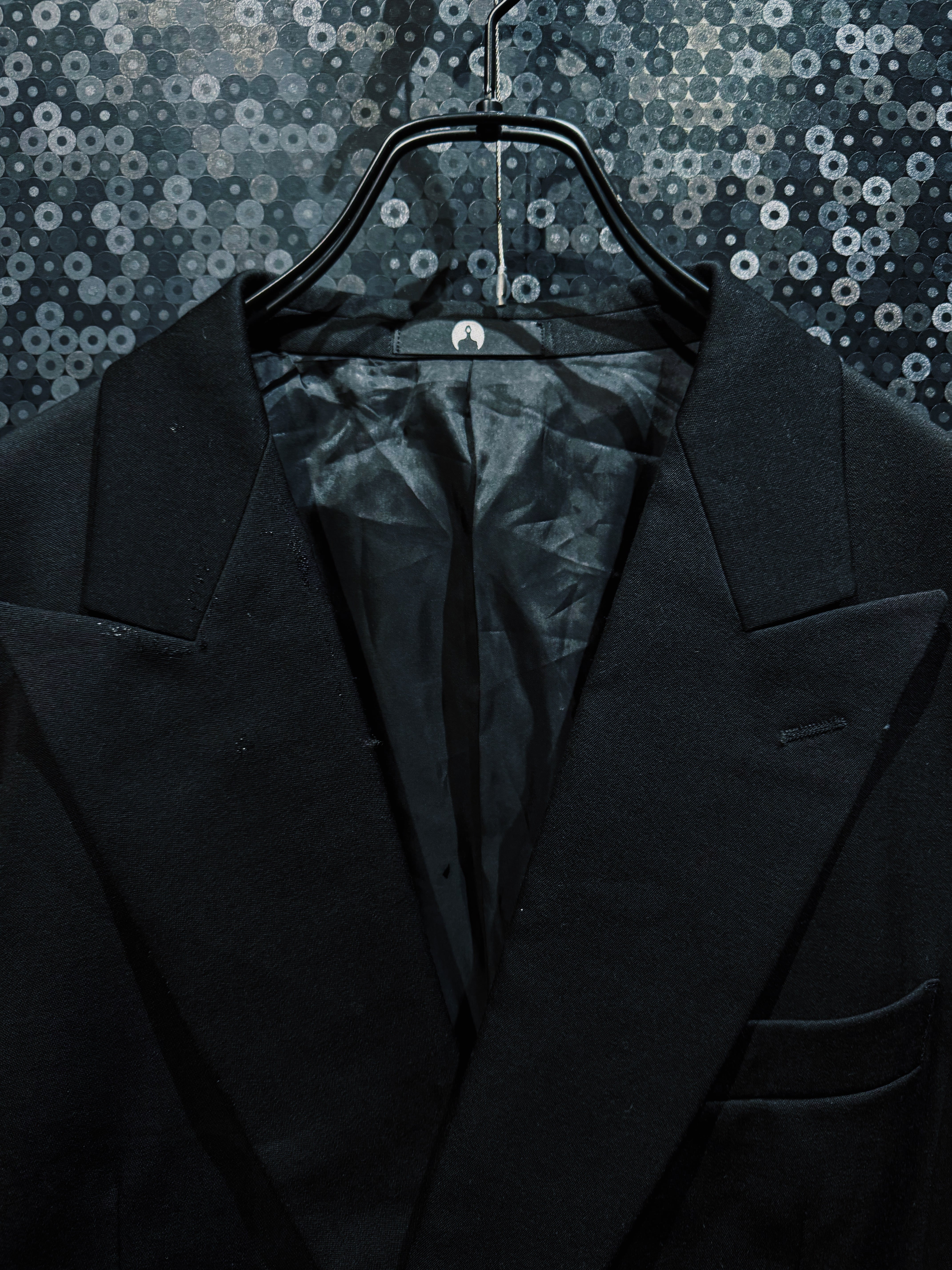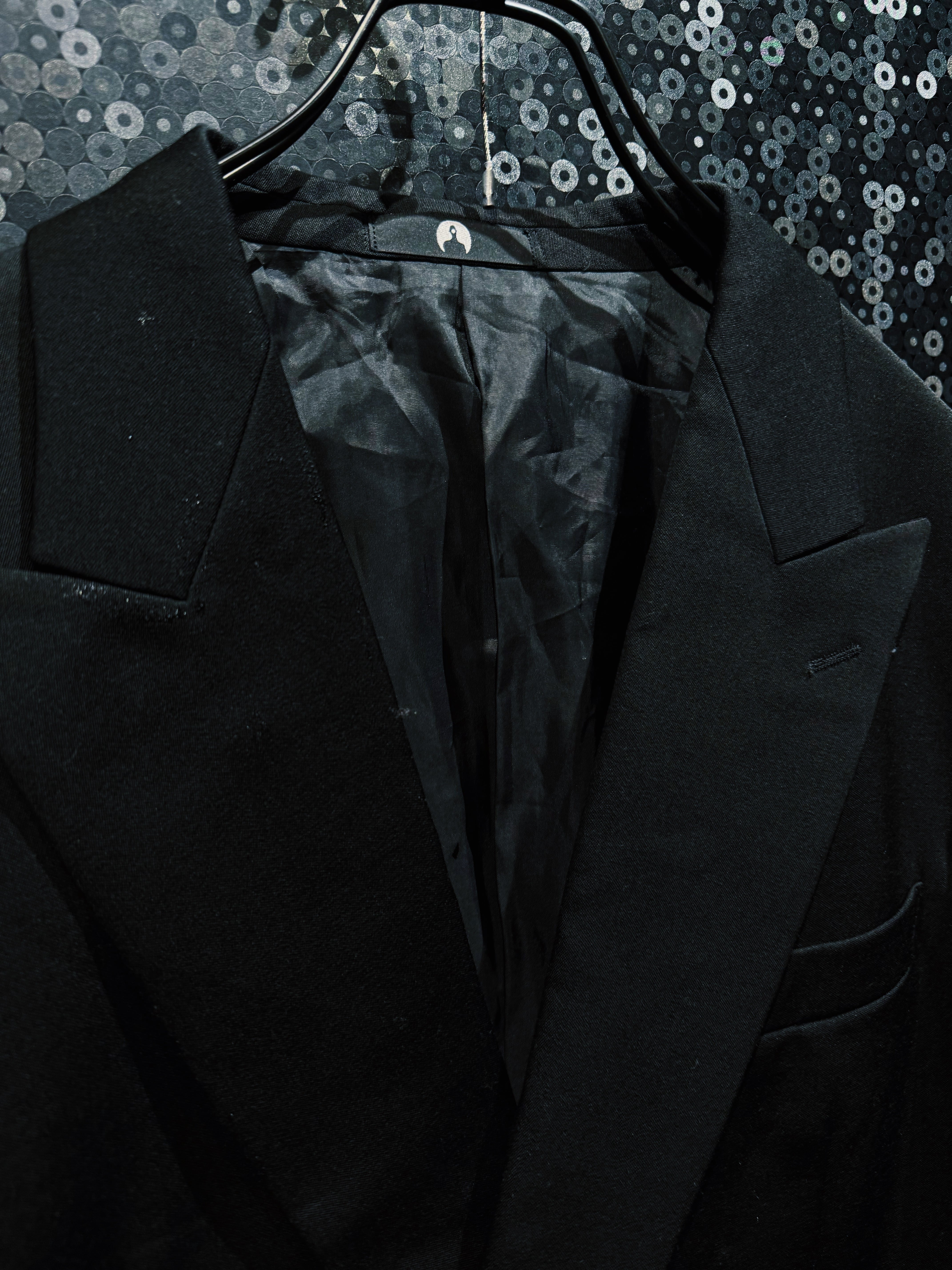 シルエットはクラシックなテーラードをベースにしながら、ラペルを深く鋭く設計することでモードな雰囲気を強調。BLANK ICONらしい静かな迫力を持つフォルムに仕上げられている。前作モデルに見られるチャイナループなどの装飾的ディテールを排除することで、より純粋に“黒の形”そのものを楽しめるデザインとなっているのもこの個体の大きな特徴。
