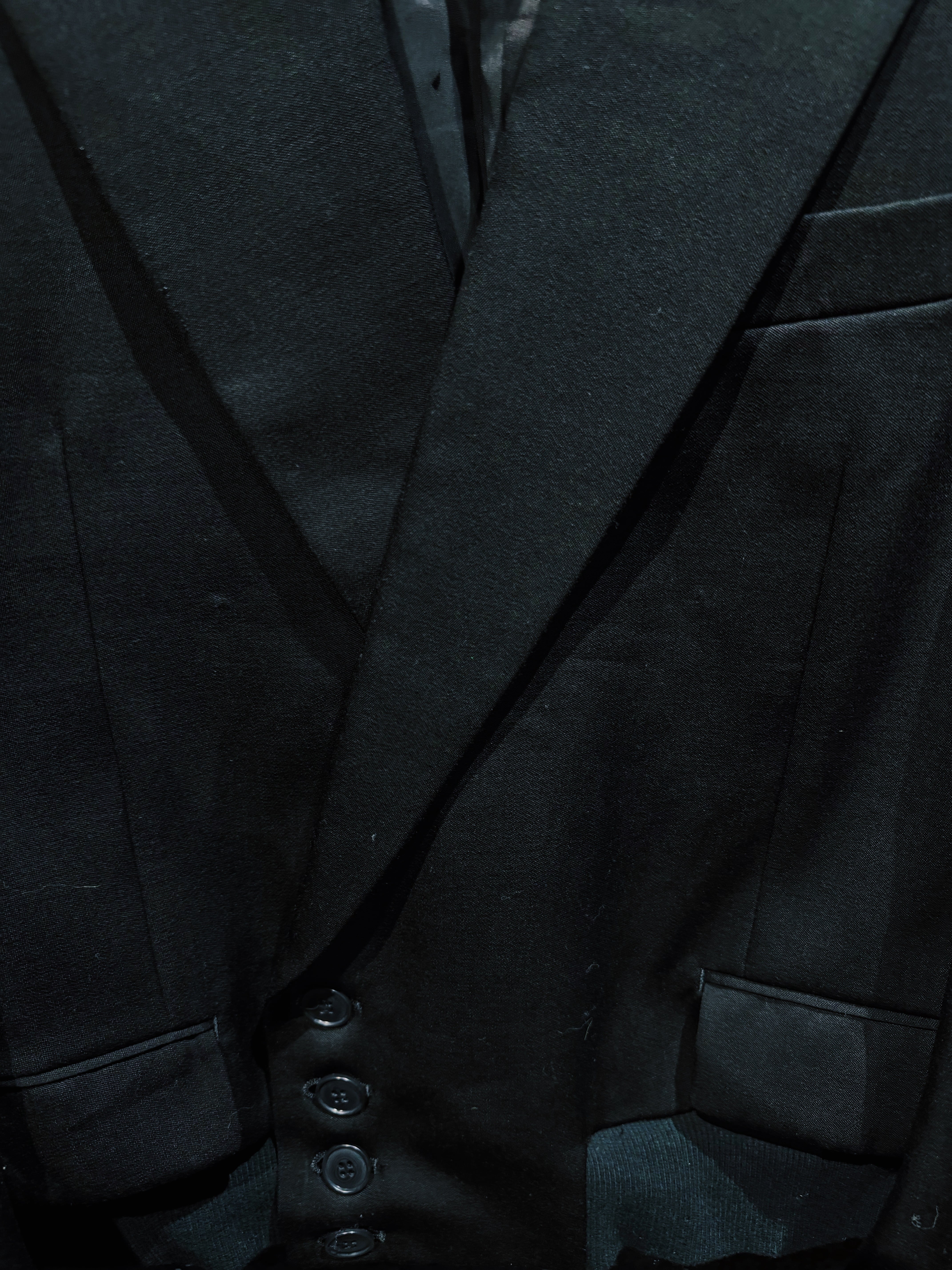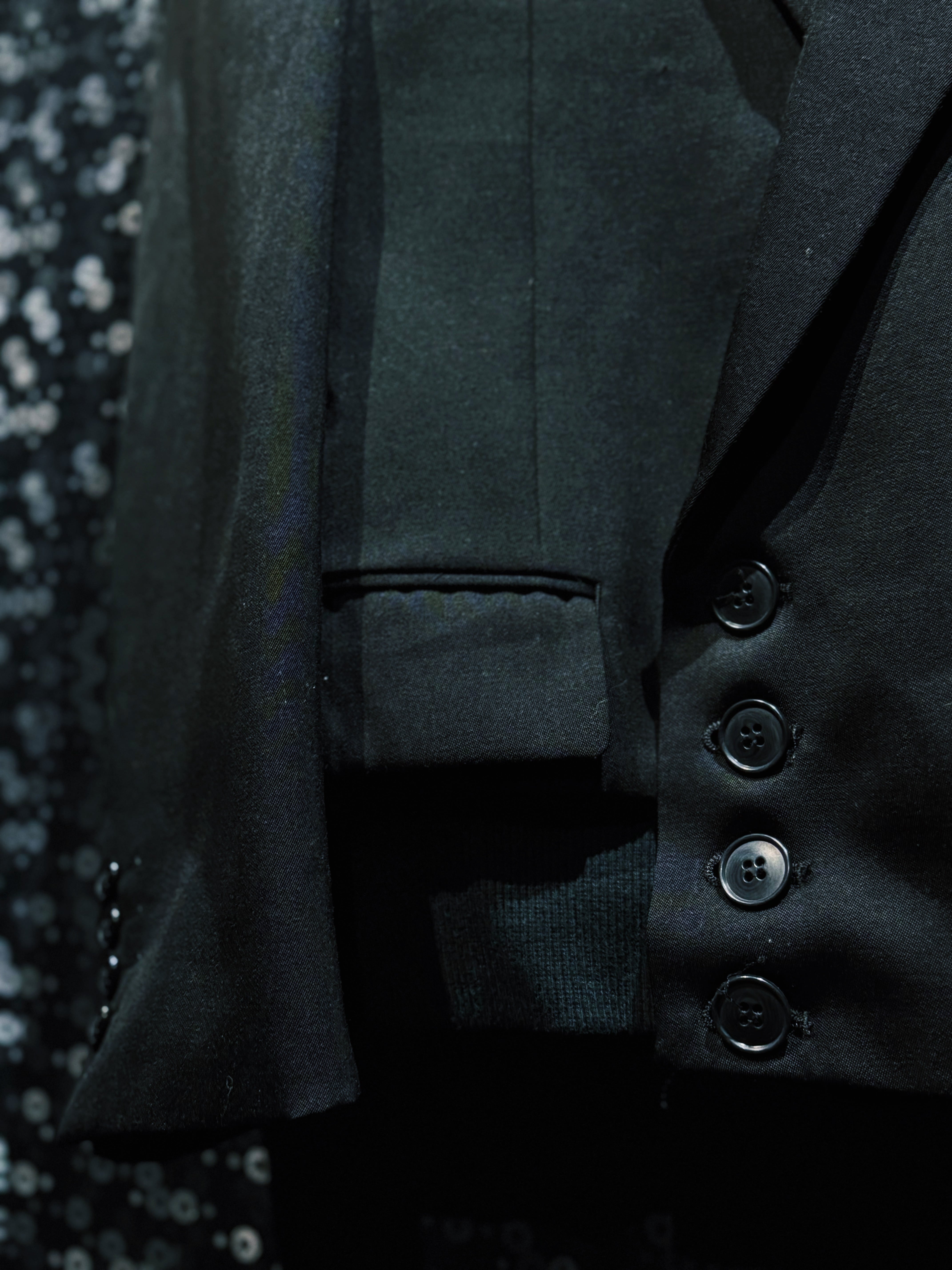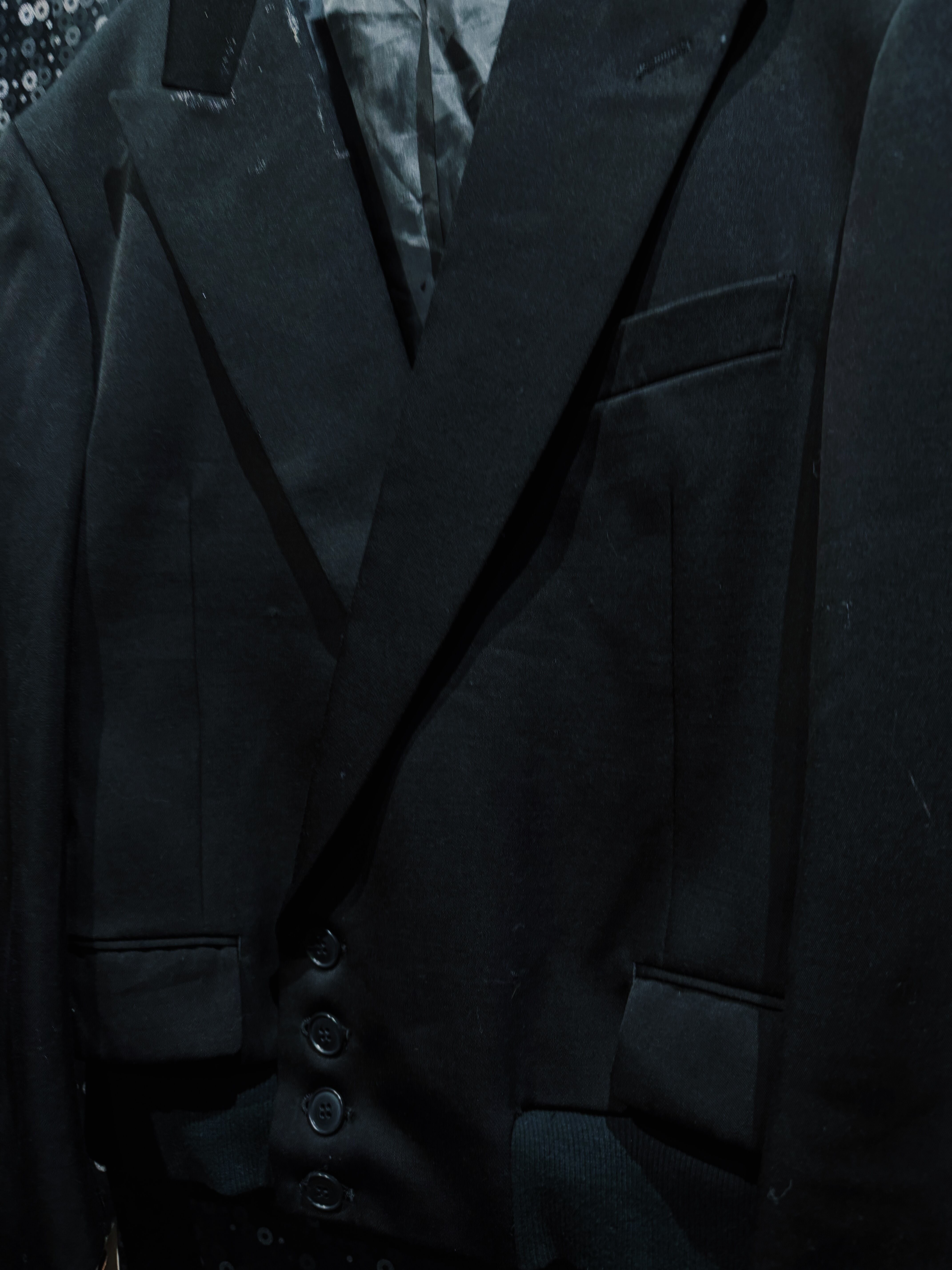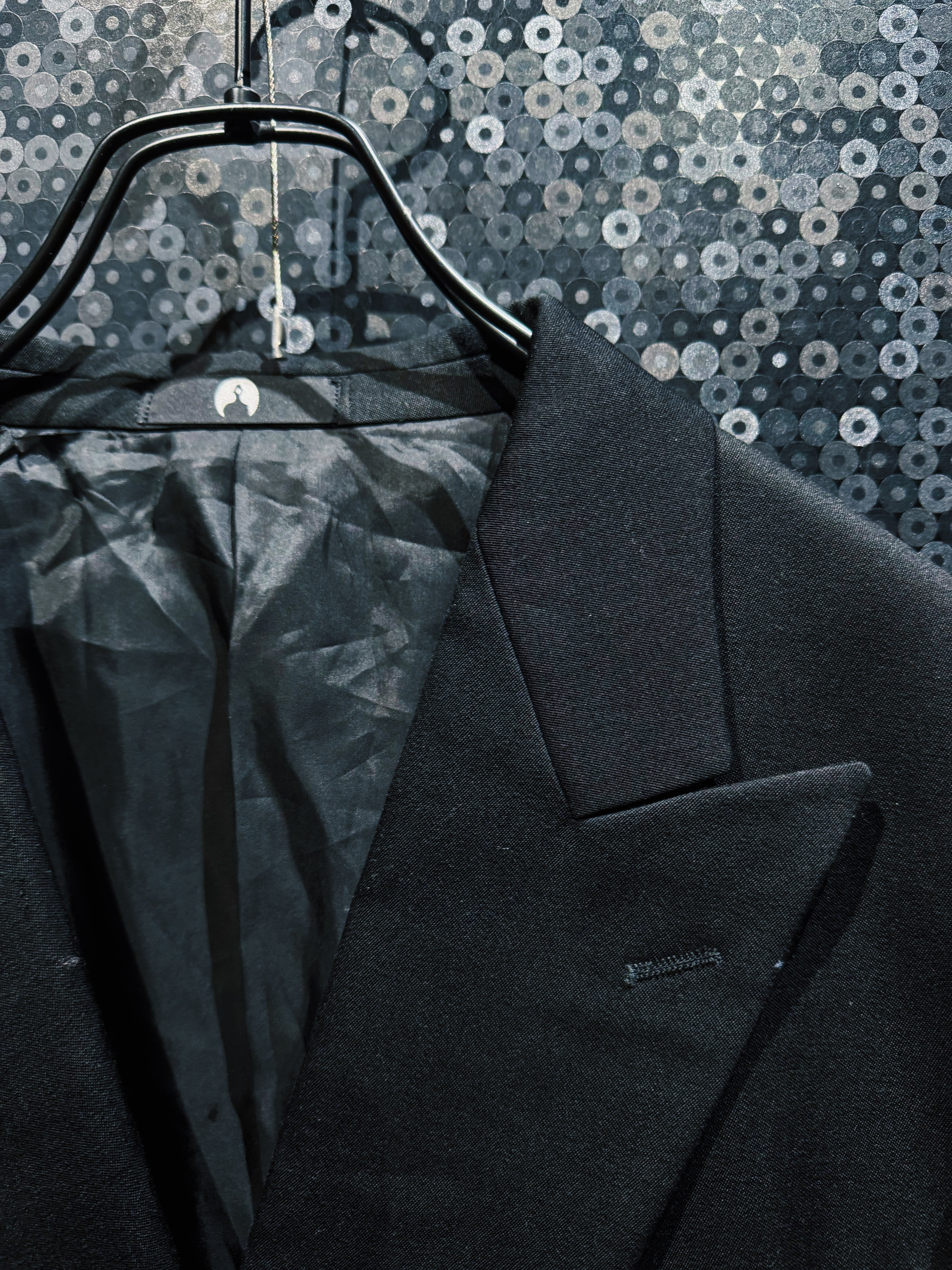 シルエットはクラシックなテーラードをベースにしながら、ラペルを深く鋭く設計することでモードな雰囲気を強調。BLANK ICONらしい静かな迫力を持つフォルムに仕上げられている。前作モデルに見られるチャイナループなどの装飾的ディテールを排除することで、より純粋に“黒の形”そのものを楽しめるデザインとなっているのもこの個体の大きな特徴。