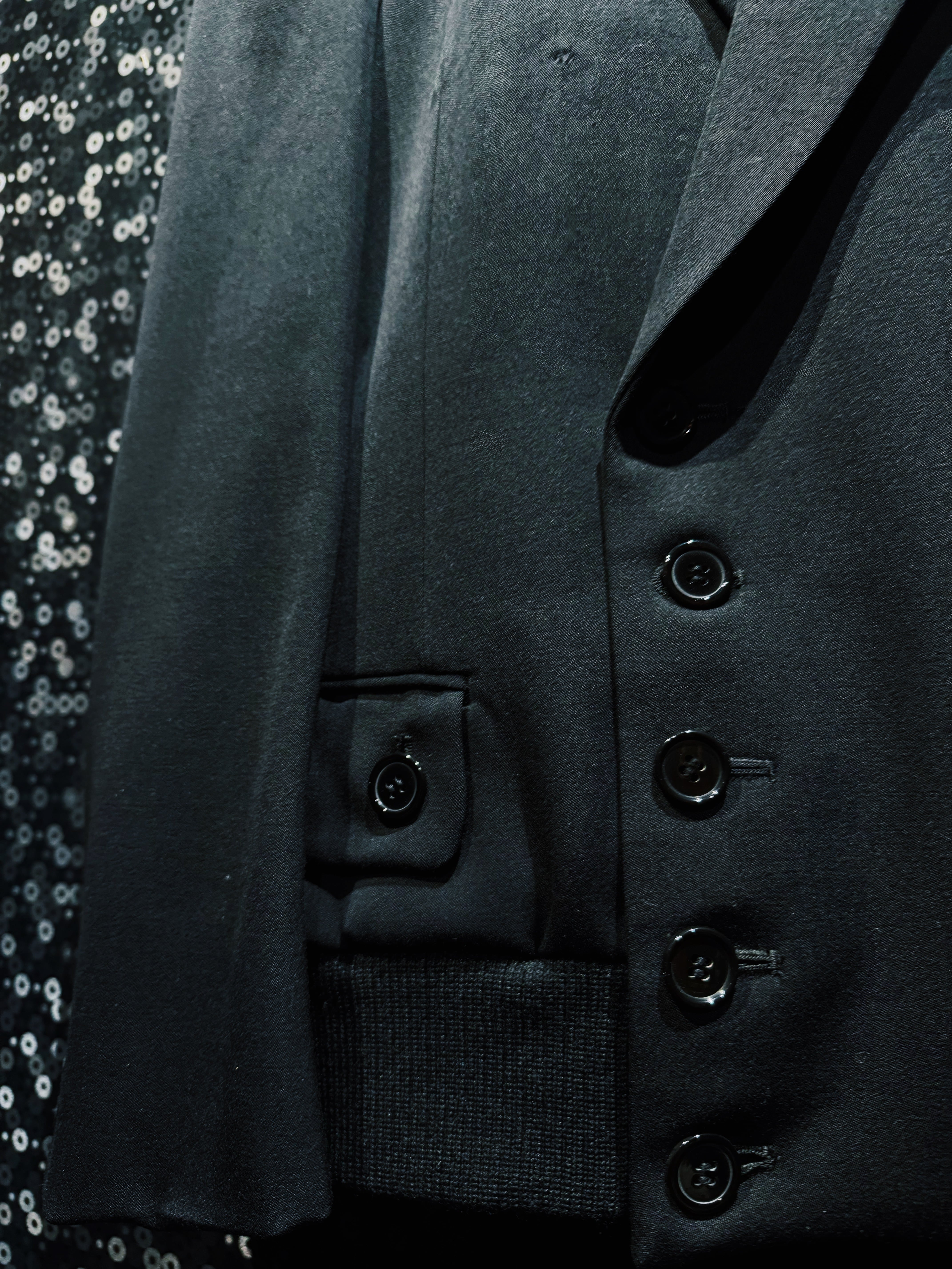 フロントには重厚感のあるボタンを縦に配置し、クラシックなフォーマルジャケットの雰囲気を持ちながらも、裾部分にはリブをドッキング。テーラードジャケットとブルゾンを融合させたような設計になっており、モードとストリートの境界を曖昧にするBLANK ICONらしい構造が完成している。