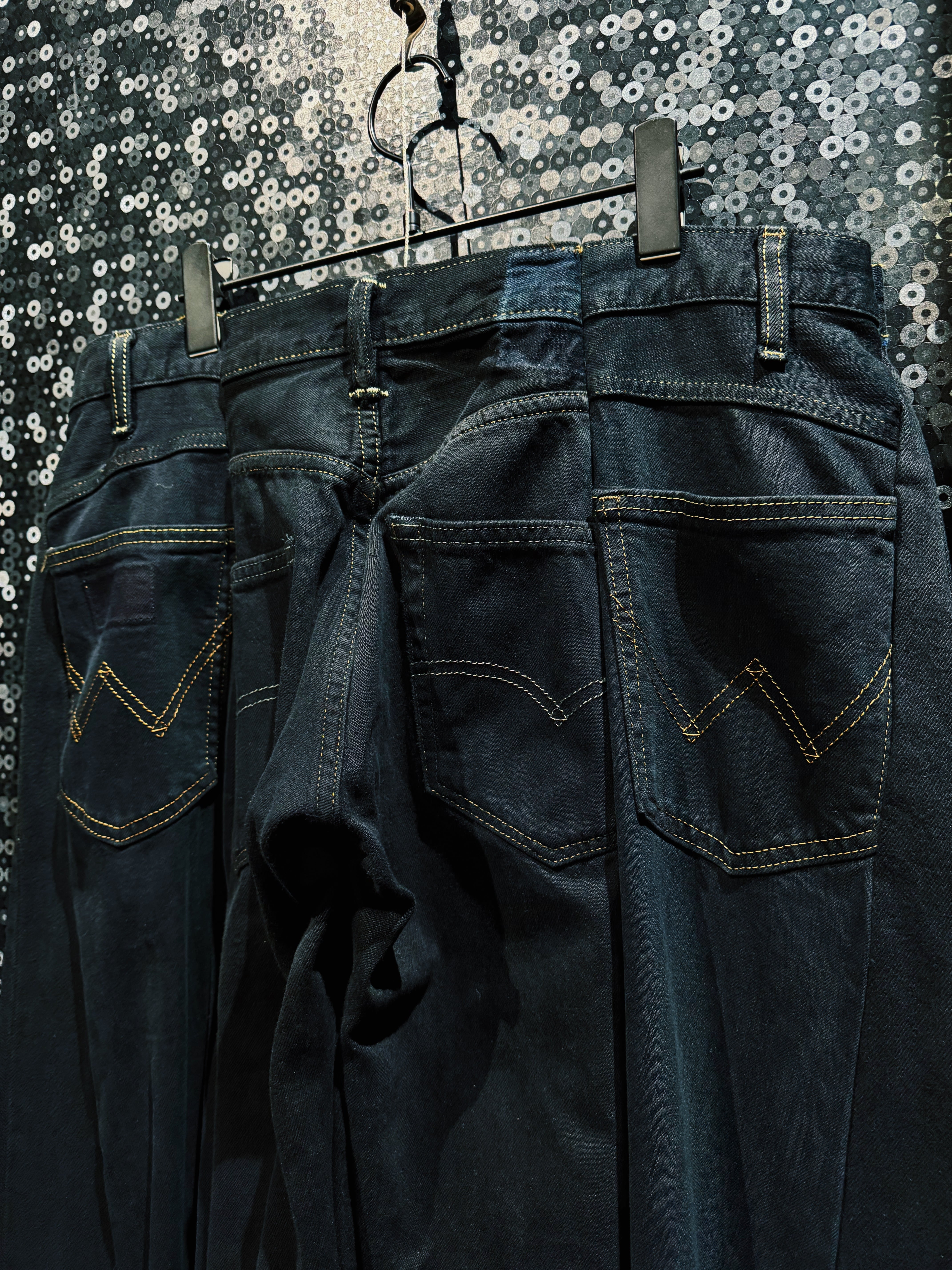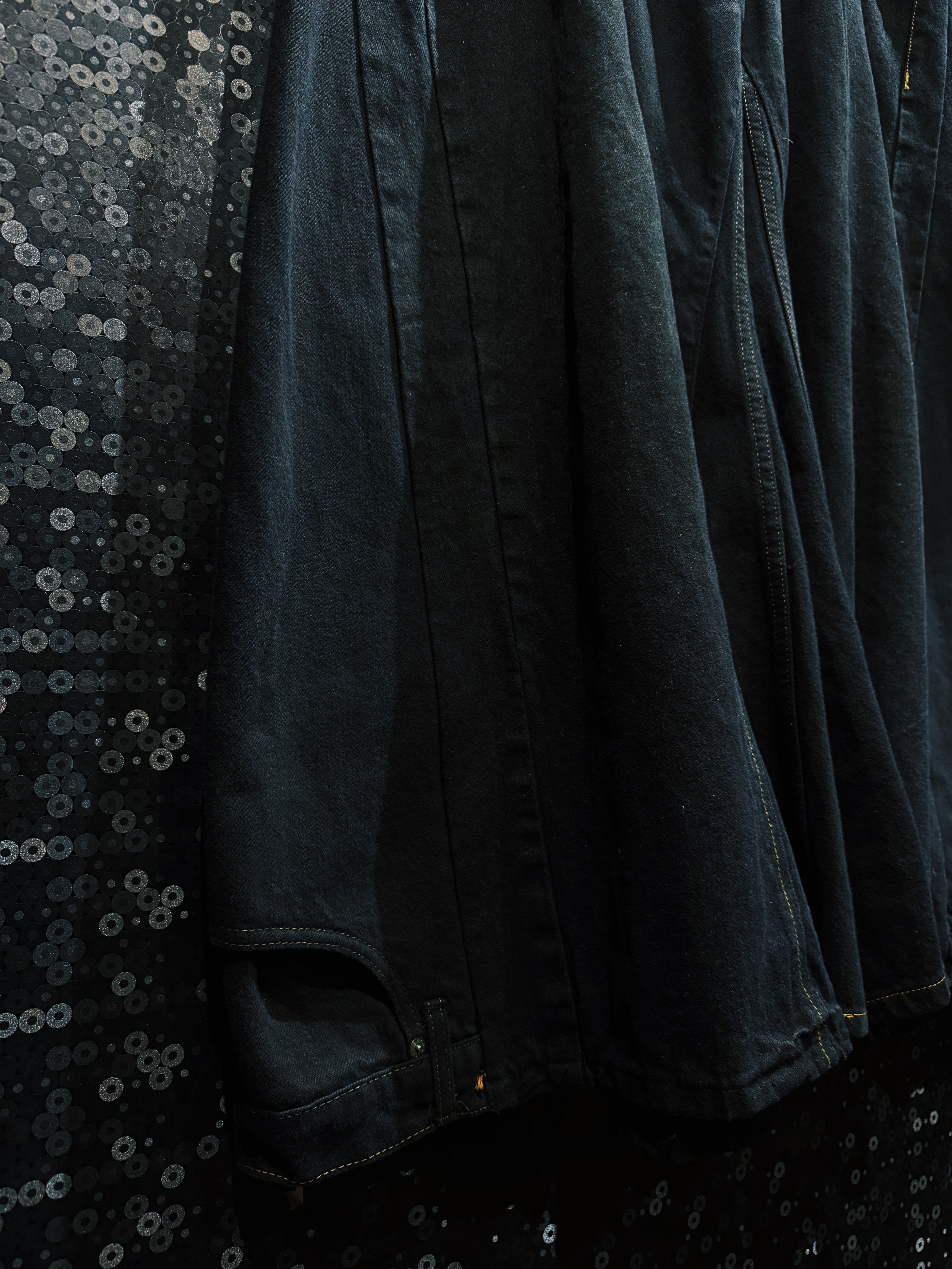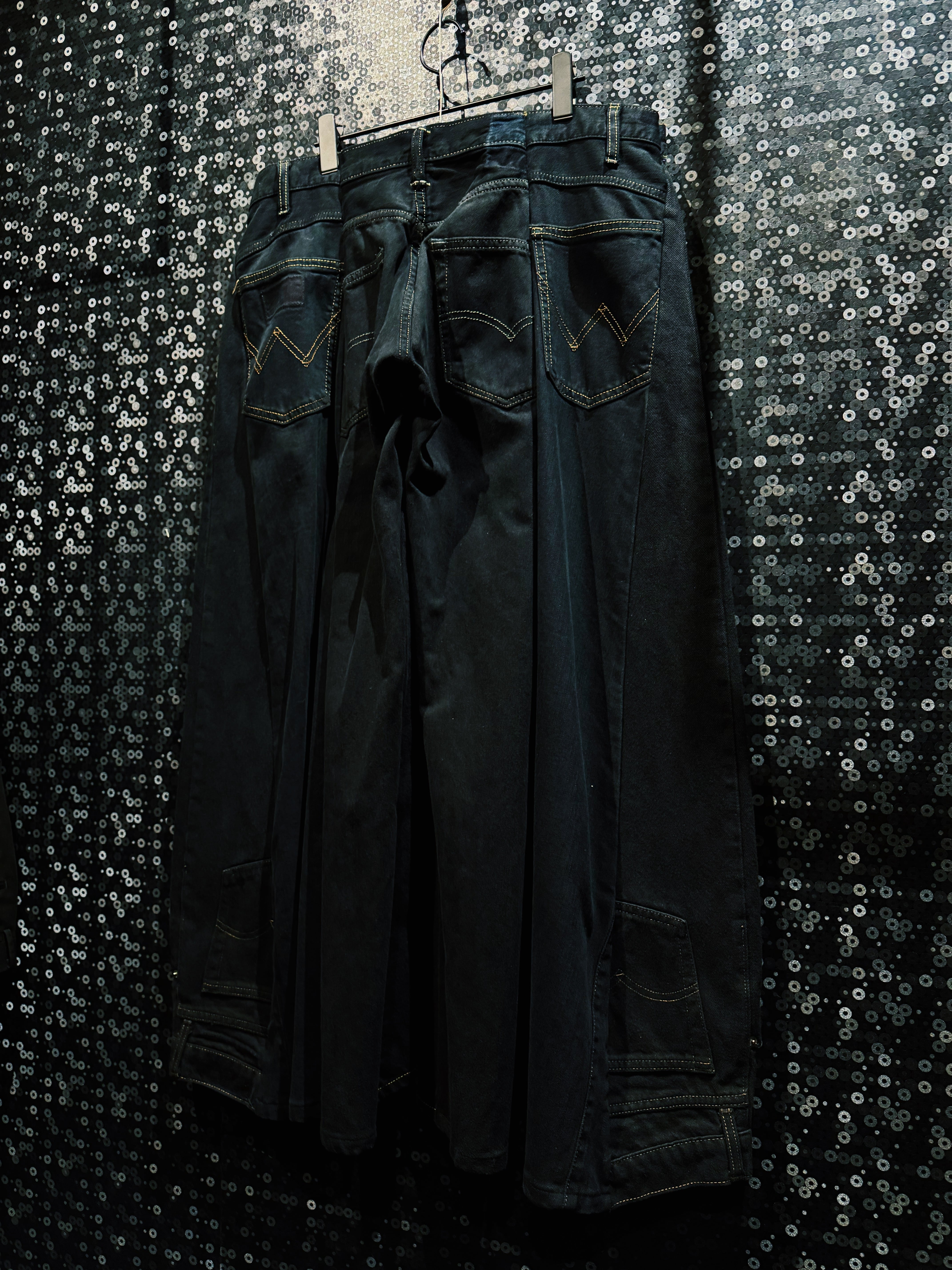 漆黒をブランドの核とする BLANK ICON が生み出した、圧倒的なボリュームを誇る スーパーマッシブワイドデニムパンツ。ベースにはクラシックなブラックデニムの5ポケット構造を採用しながら、フロントから裾にかけて大胆なタックとパネル構造を加えることで、通常のデニムとはまったく異なる異様なシルエットを作り上げている。