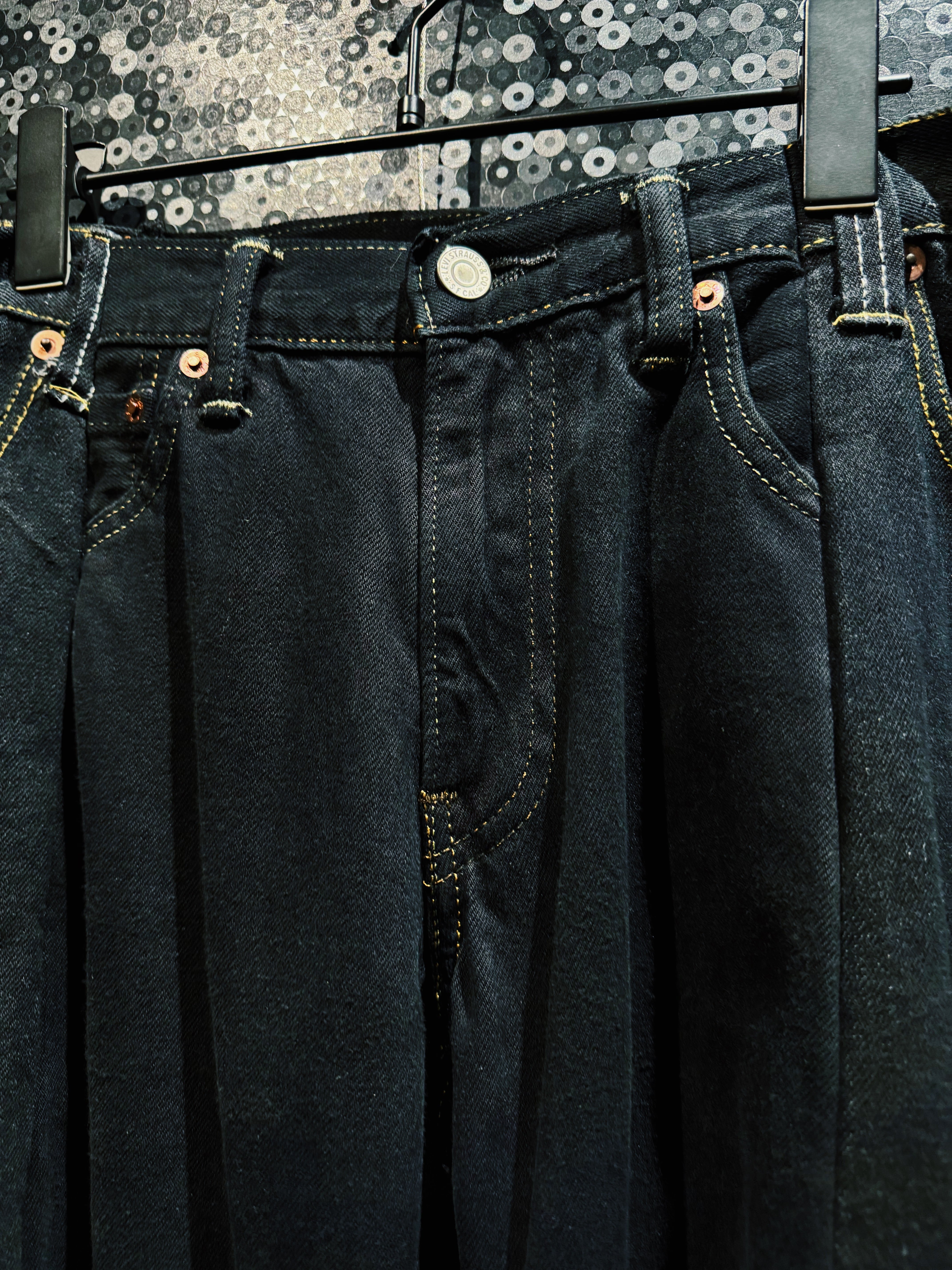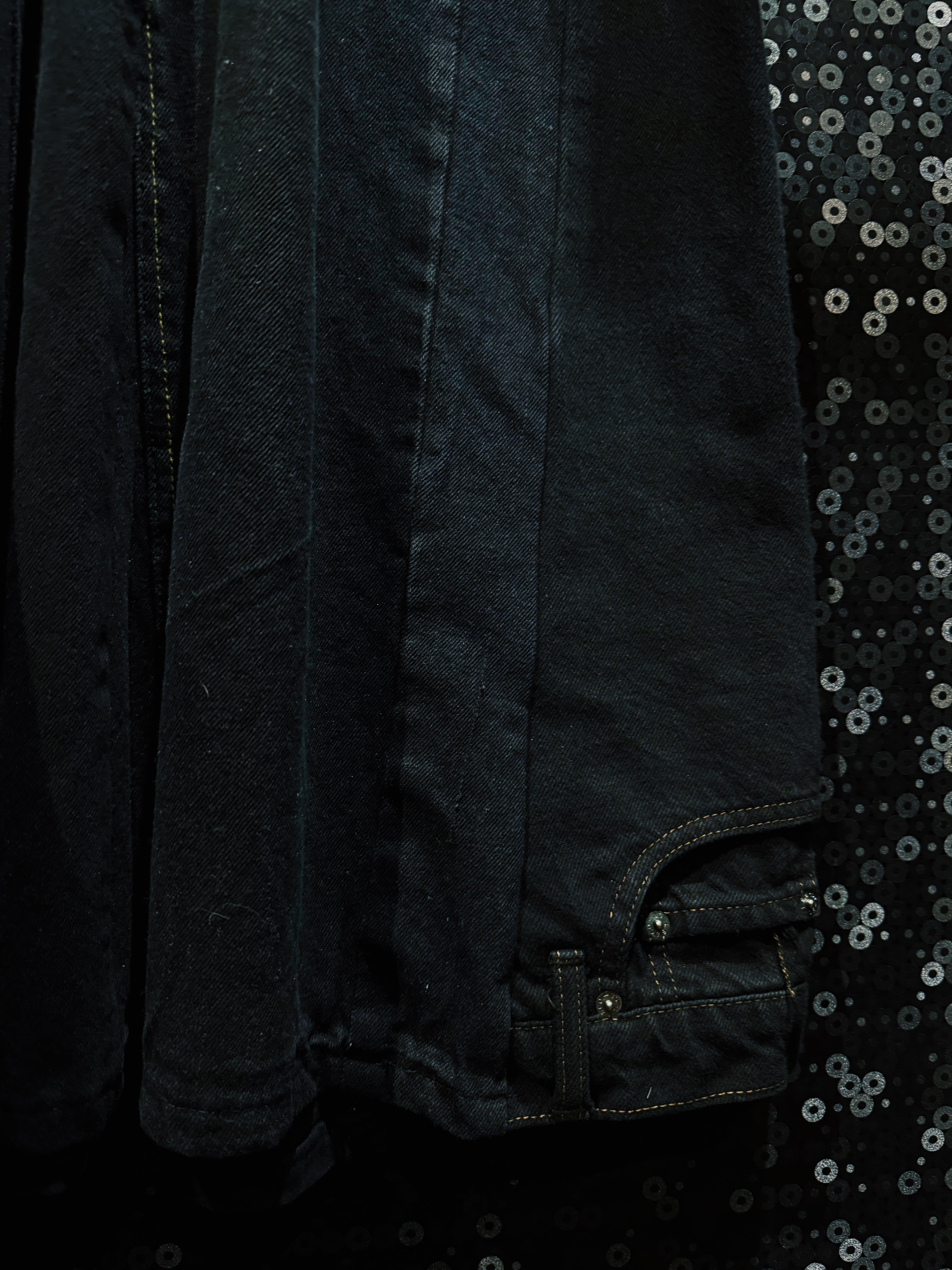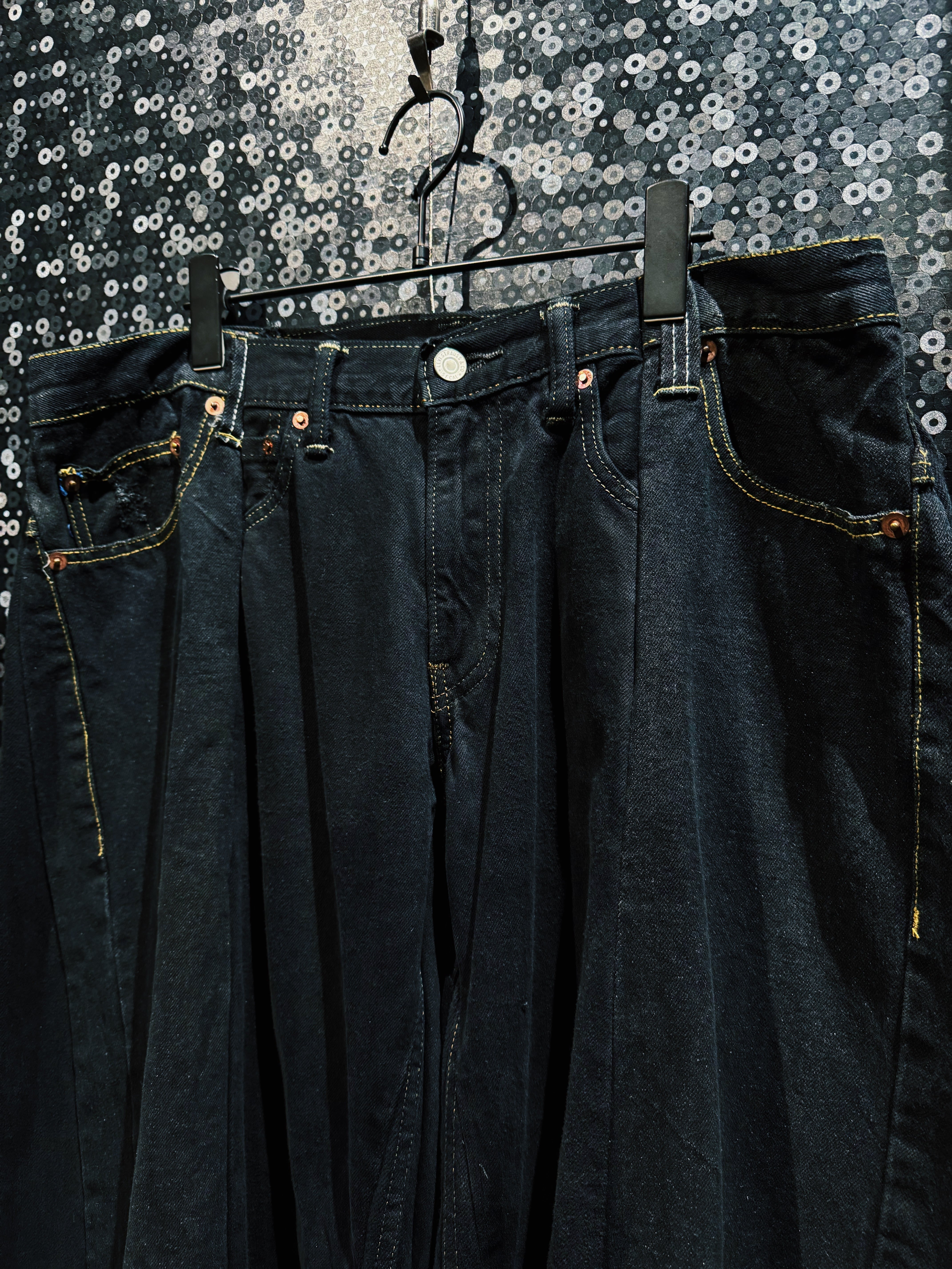 漆黒をブランドの核とする BLANK ICON が生み出した、圧倒的なボリュームを誇る スーパーマッシブワイドデニムパンツ。ベースにはクラシックなブラックデニムの5ポケット構造を採用しながら、フロントから裾にかけて大胆なタックとパネル構造を加えることで、通常のデニムとはまったく異なる異様なシルエットを作り上げている。